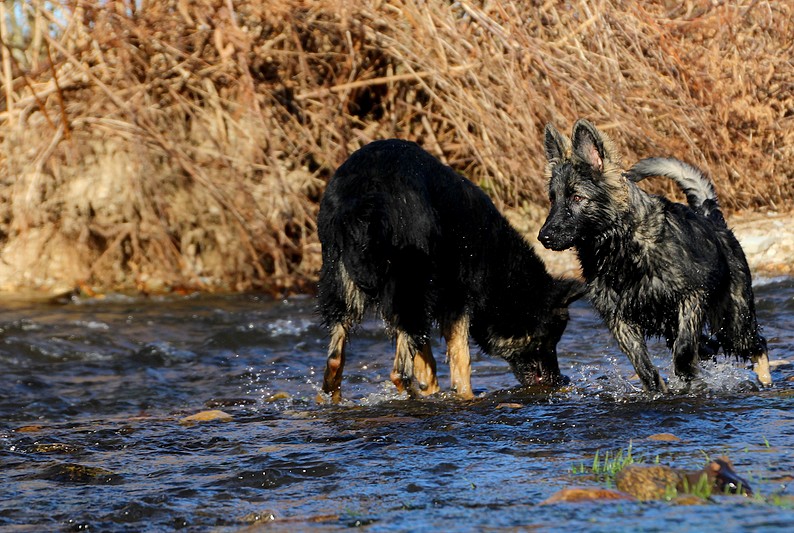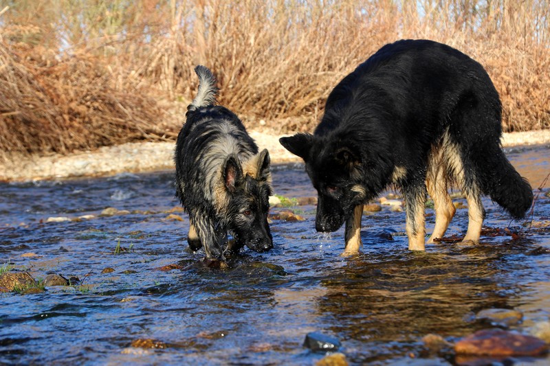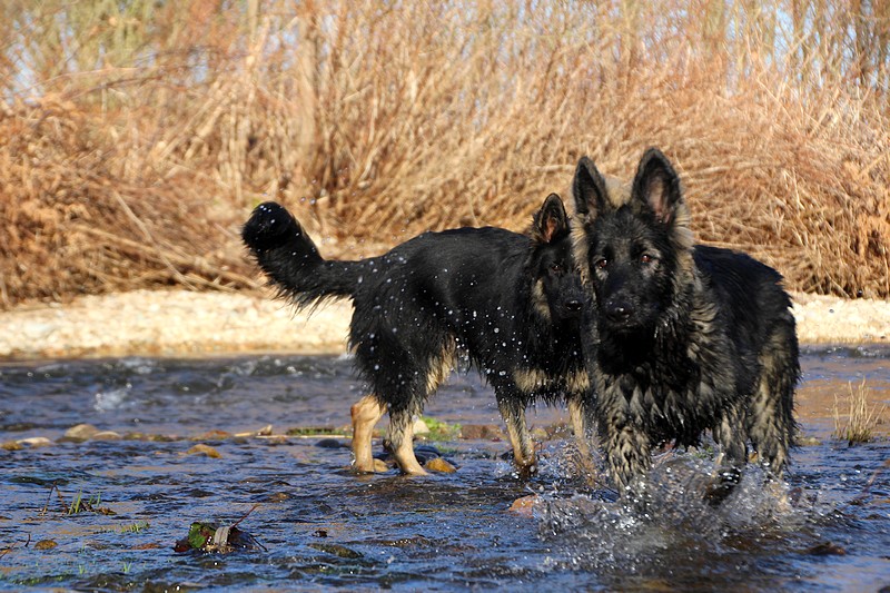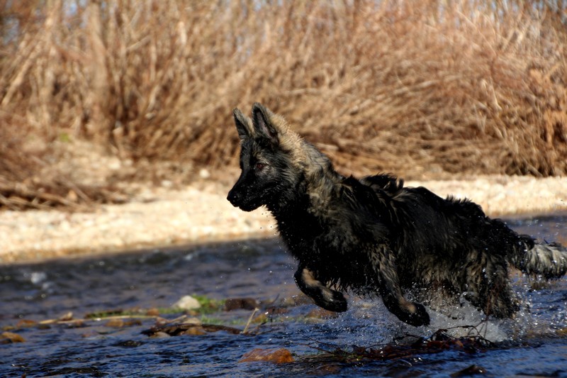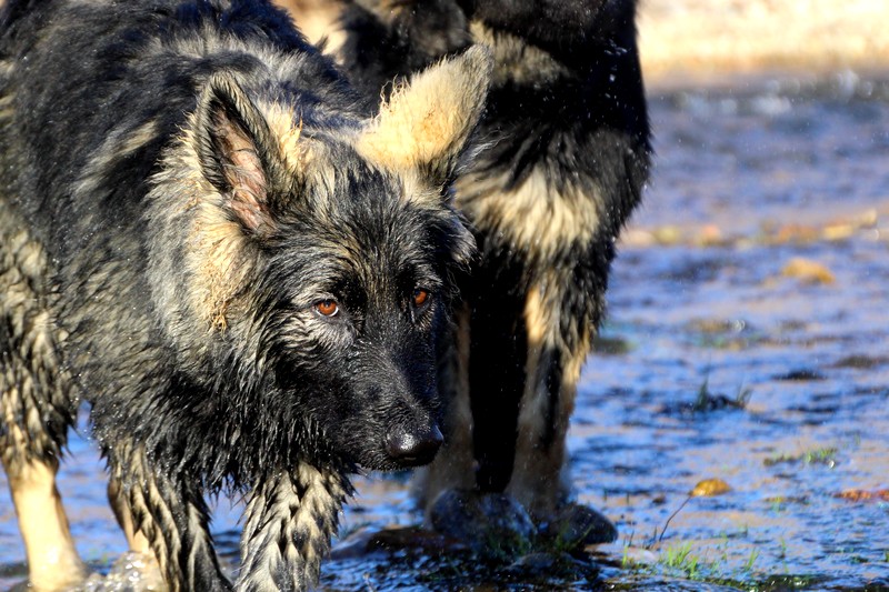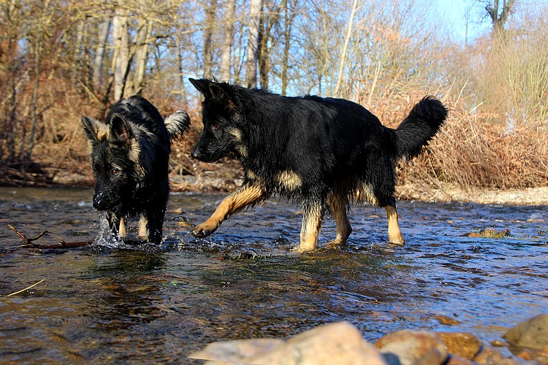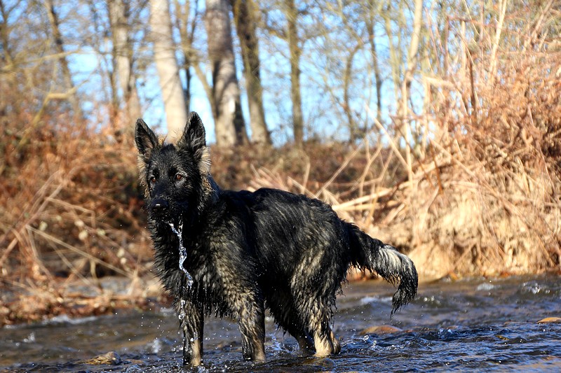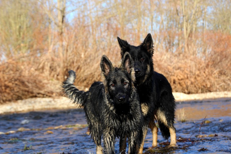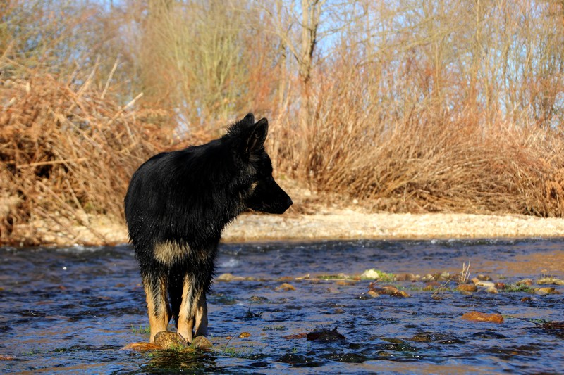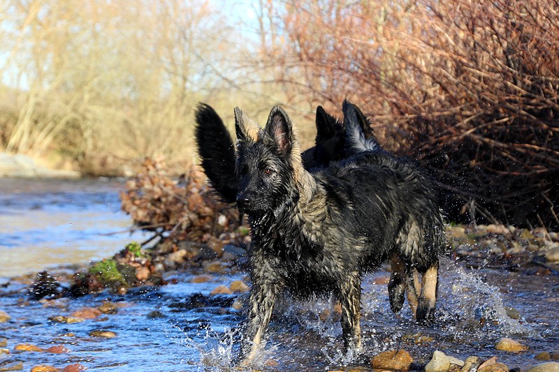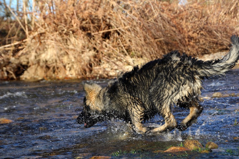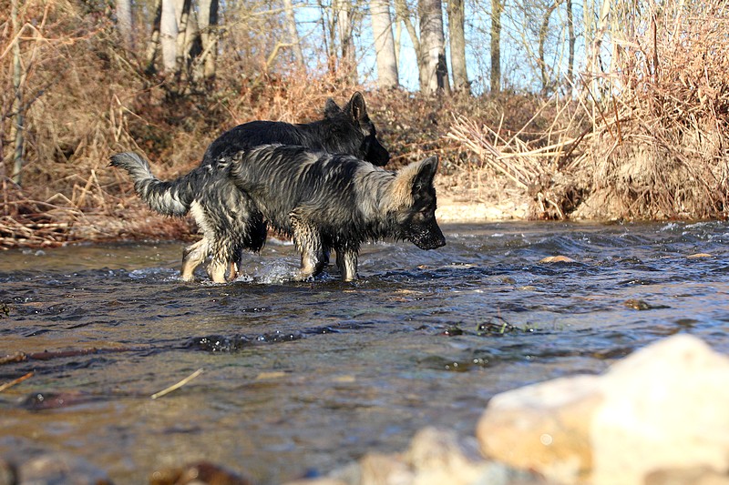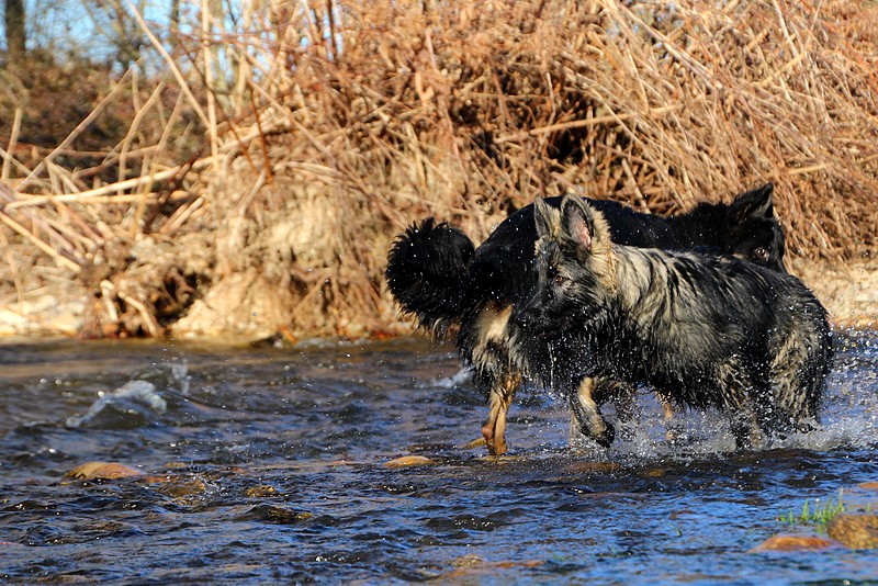 Avec un tel soleil, il était impossible de rester enfermé à l’intérieur ! J’ai pris les deux petites dernières de la meute, et nous sommes parties toutes les trois faire une jolie balade dans les bois, et comme ici chaque balade passe immanquablement par la rivière, nous avons fait une pause photo … Une petite Perle qui adore attraper les vaguelettes de la rivière, et une Sioux qui attrape ce que Perle attrape, mais sans comprendre ce qu’il faut attraper ! Cela donne une jolie série.