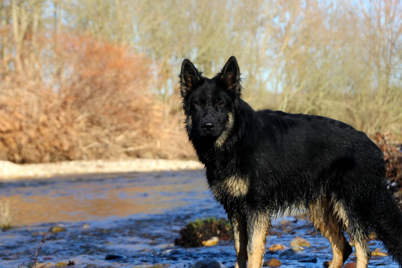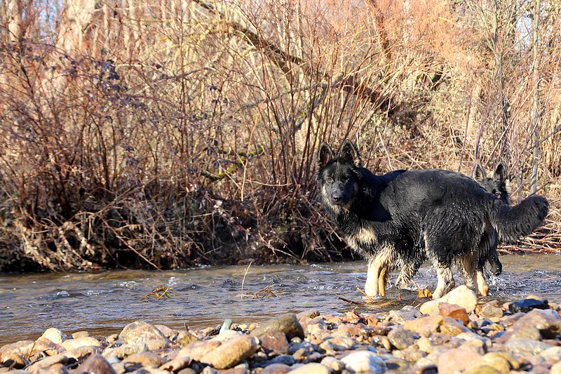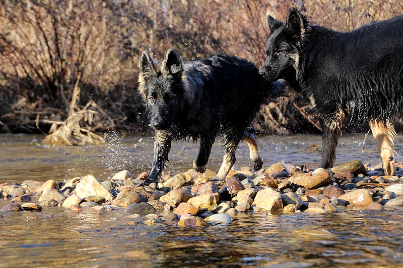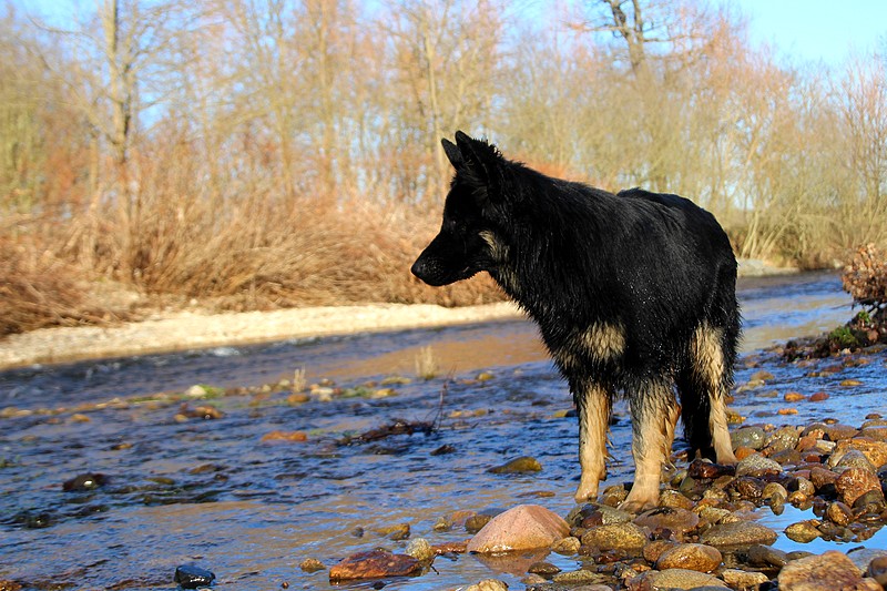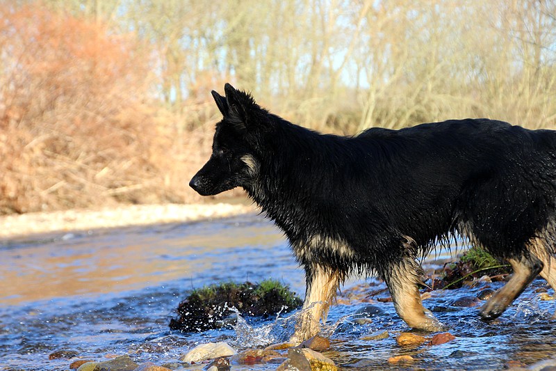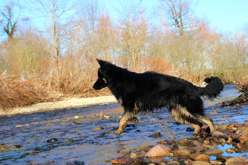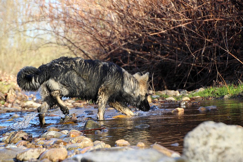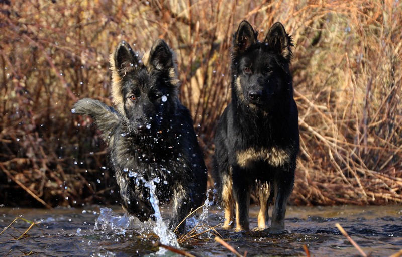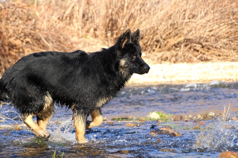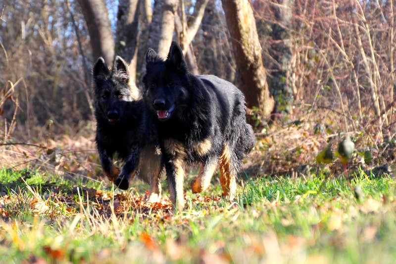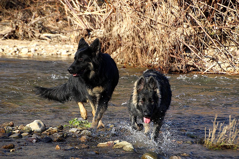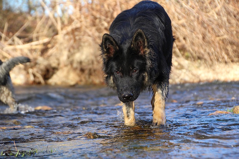Avec un tel soleil, il était impossible de rester enfermé à l’intérieur ! J’ai pris les deux petites dernières de la meute, et nous sommes parties toutes les trois faire une jolie balade dans les bois, et comme ici chaque balade passe immanquablement par la rivière, nous avons fait une pause photo … Une petite Perle qui adore attraper les vaguelettes de la rivière, et une Sioux qui attrape ce que Perle attrape, mais sans comprendre ce qu’il faut attraper ! Cela donne une jolie série.