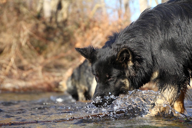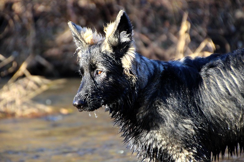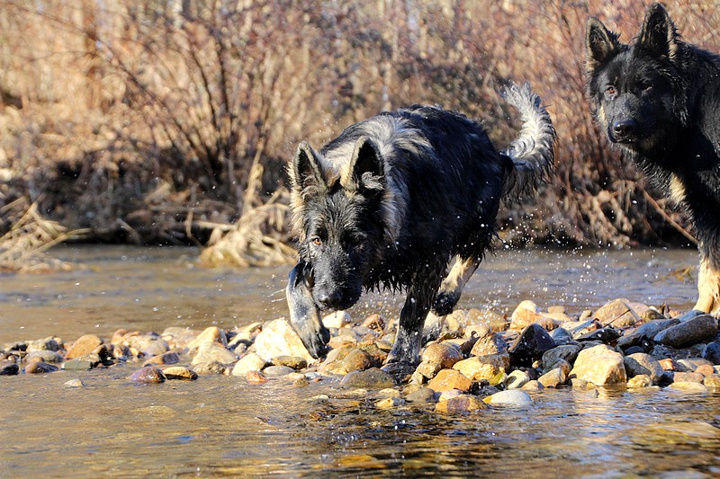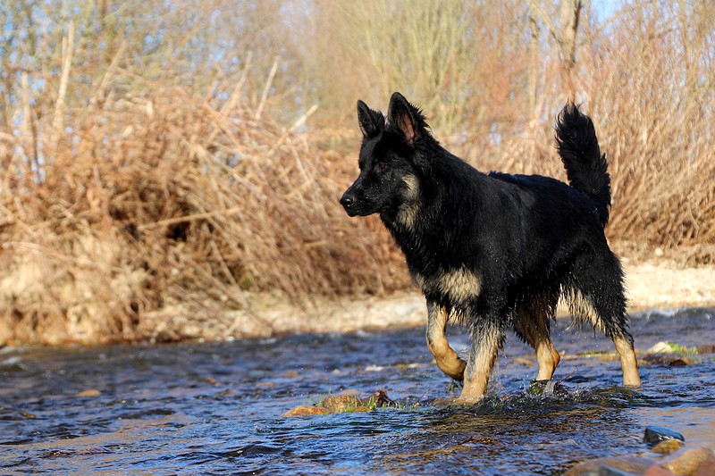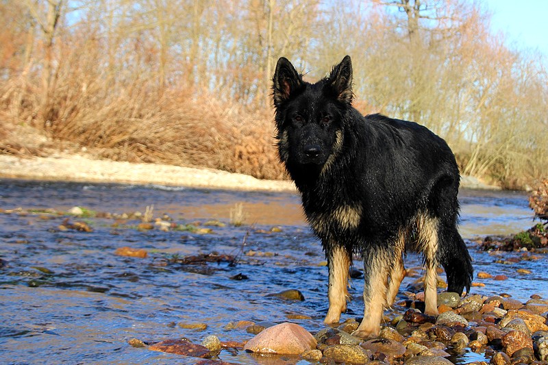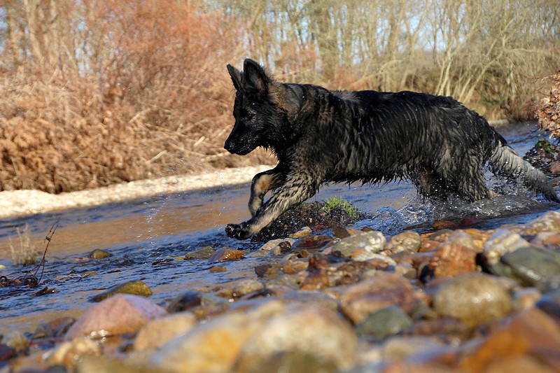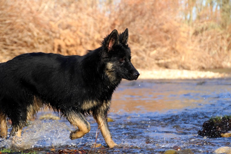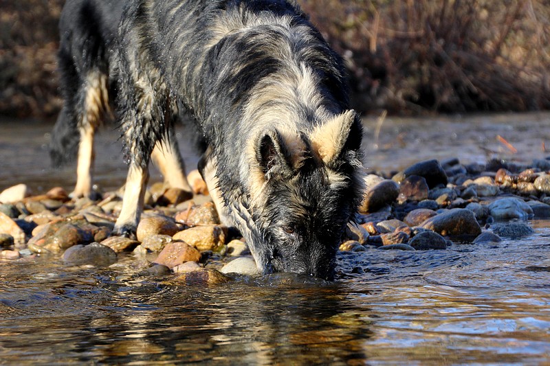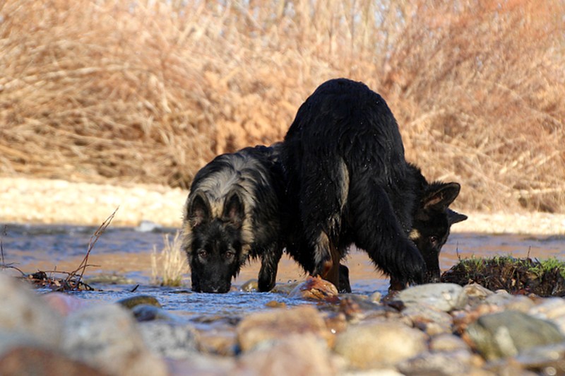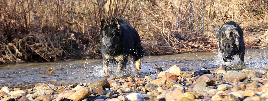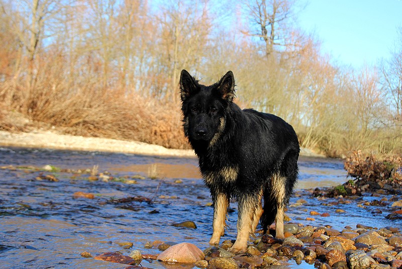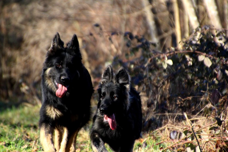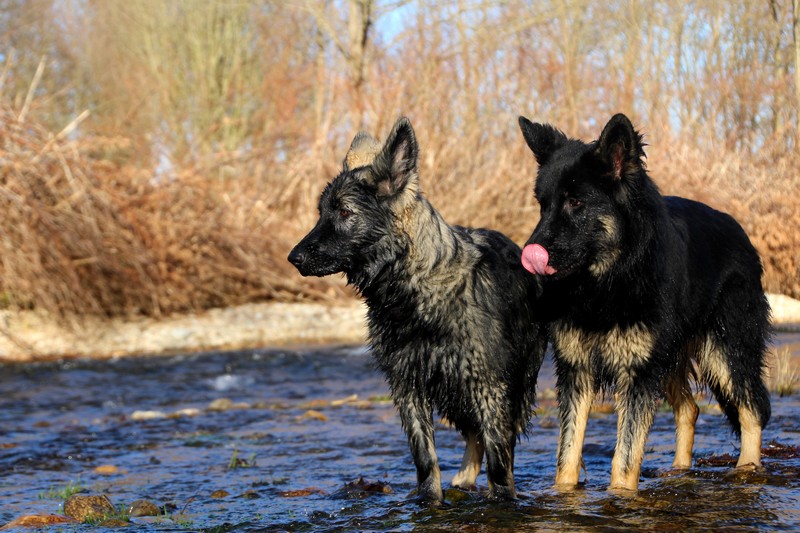 Avec un tel soleil, il était impossible de rester enfermé à l’intérieur ! J’ai pris les deux petites dernières de la meute, et nous sommes parties toutes les trois faire une jolie balade dans les bois, et comme ici chaque balade passe immanquablement par la rivière, nous avons fait une pause photo … Une petite Perle qui adore attraper les vaguelettes de la rivière, et une Sioux qui attrape ce que Perle attrape, mais sans comprendre ce qu’il faut attraper ! Cela donne une jolie série.