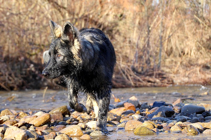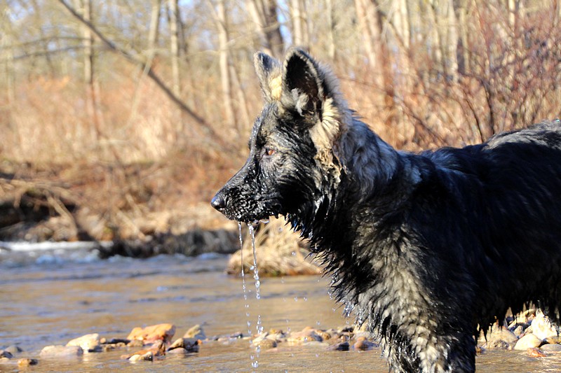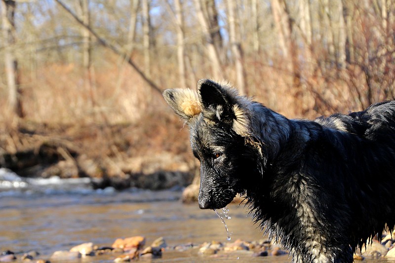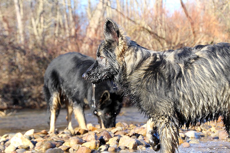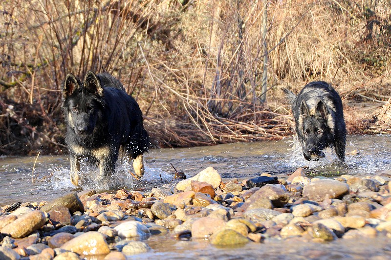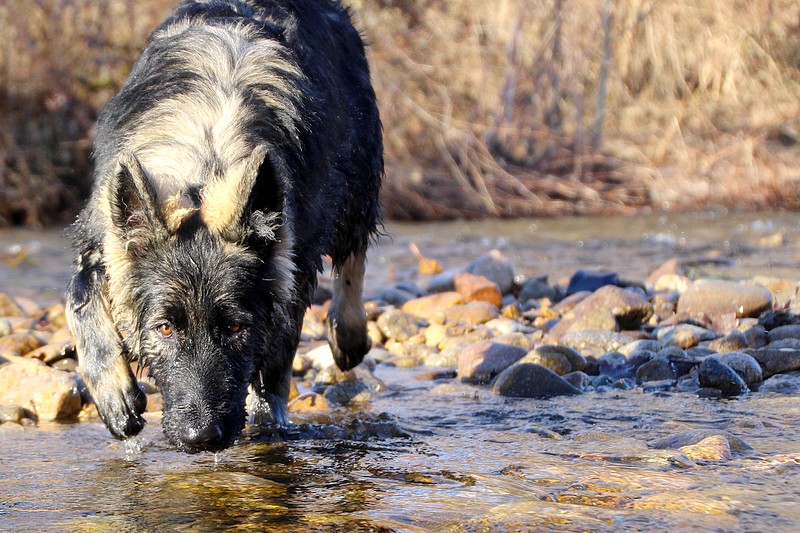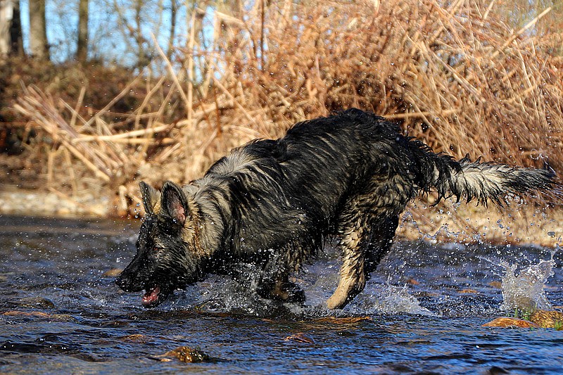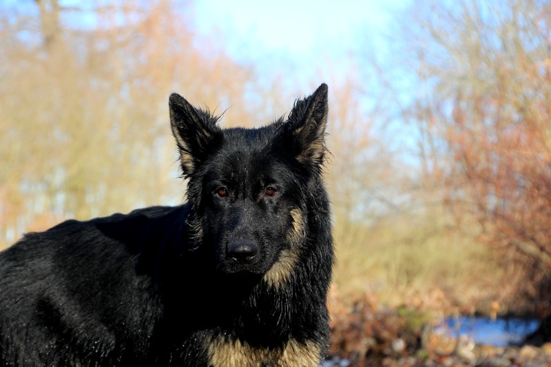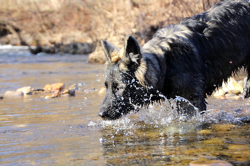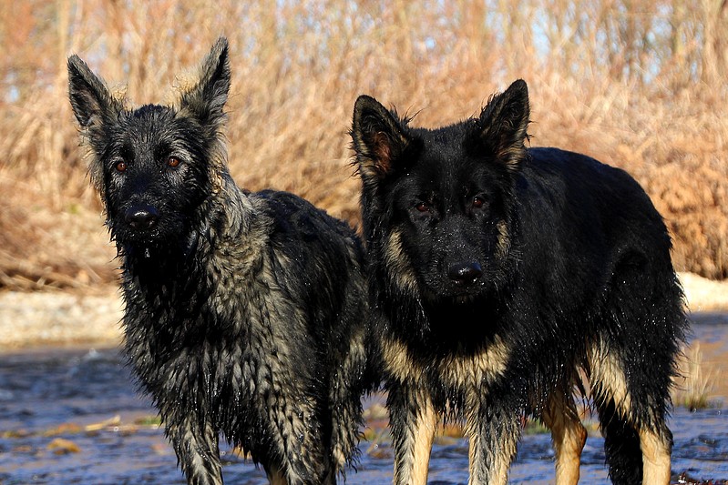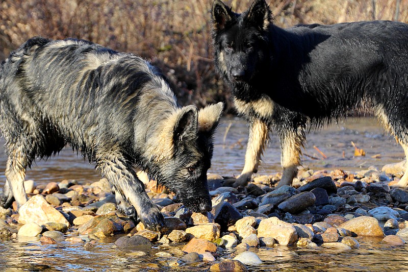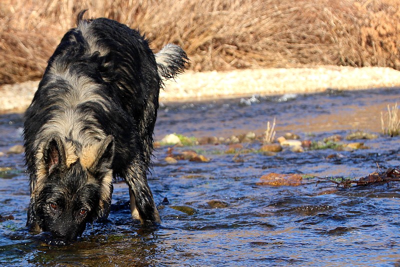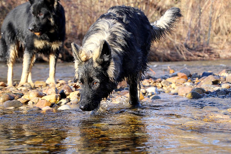 Avec un tel soleil, il était impossible de rester enfermé à l’intérieur ! J’ai pris les deux petites dernières de la meute, et nous sommes parties toutes les trois faire une jolie balade dans les bois, et comme ici chaque balade passe immanquablement par la rivière, nous avons fait une pause photo … Une petite Perle qui adore attraper les vaguelettes de la rivière, et une Sioux qui attrape ce que Perle attrape, mais sans comprendre ce qu’il faut attraper ! Cela donne une jolie série.