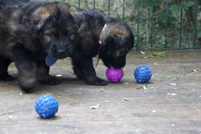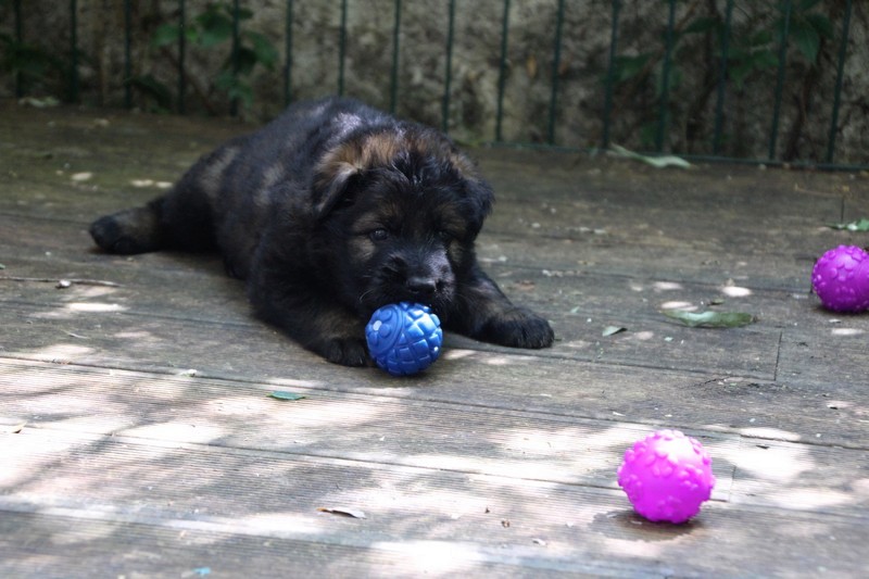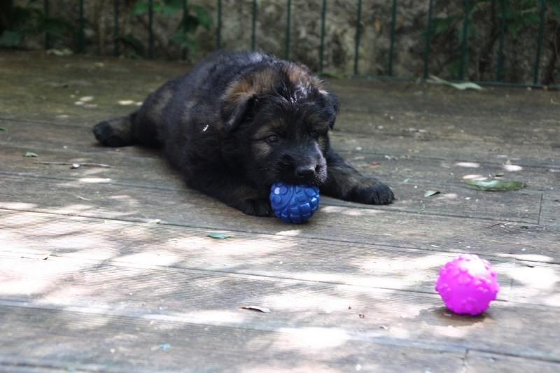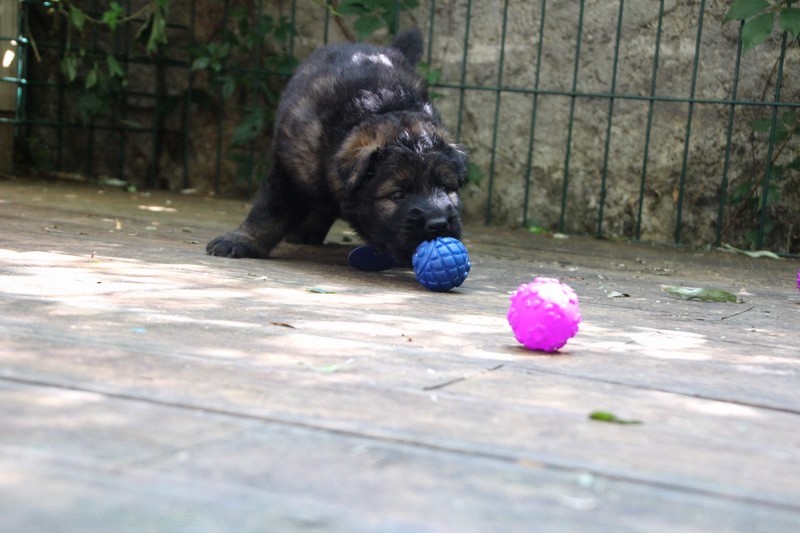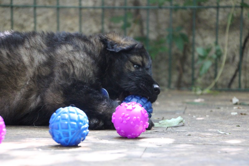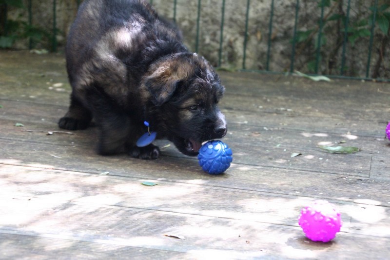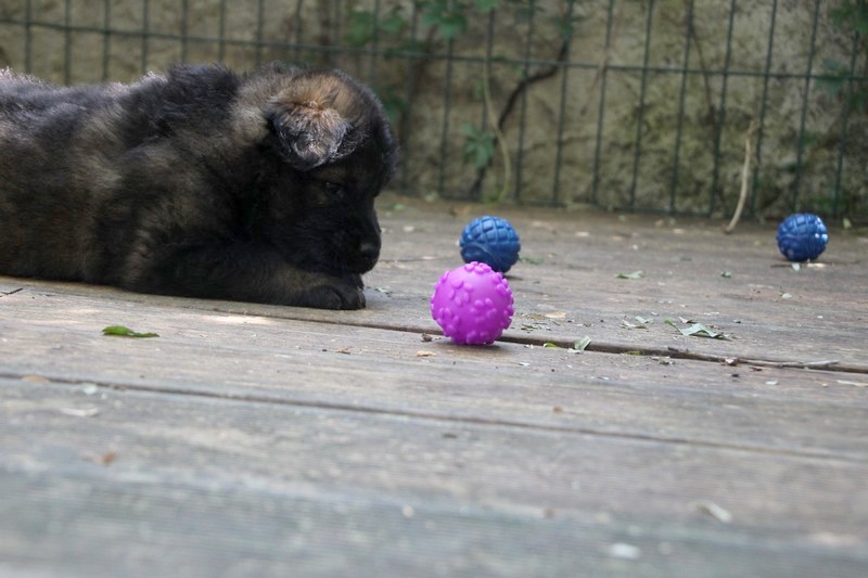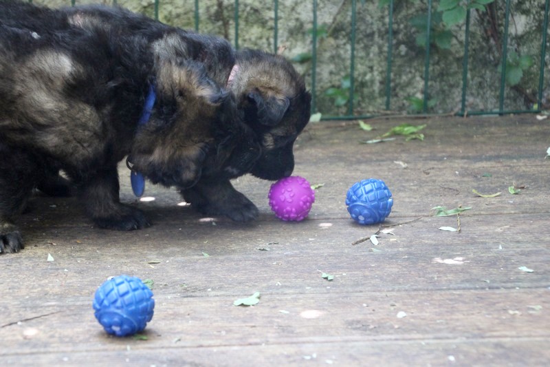 Alors comme promis de nouveaux jeux sont arrivés. De drôles de petites balles colorées en bleu, rose et violet ornées de petits picots de différente forme, sont tombées du ciel dans le parc à chiots. Les picots, il parait que c’est agréable à mâchouiller, mais nous sommes encore petits pour le faire, alors nous nous sommes contentés de les transporter et les faire rouler. Encore une fois approuvée par tous, la taille est bien adaptée pour des tout petits comme nous, si vous aussi vous en voulez, on les trouve chez Croq.fr