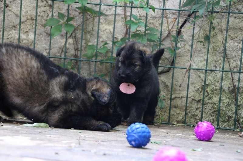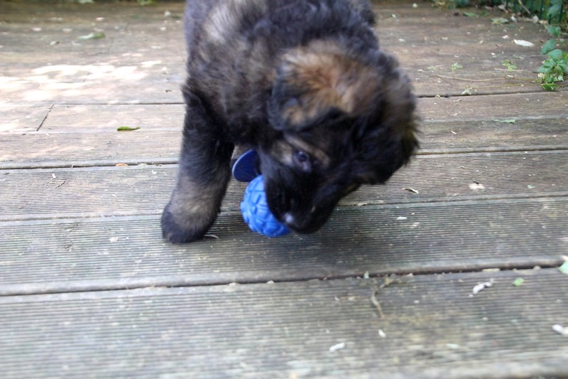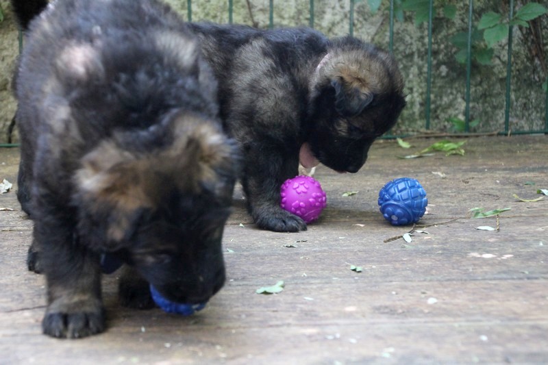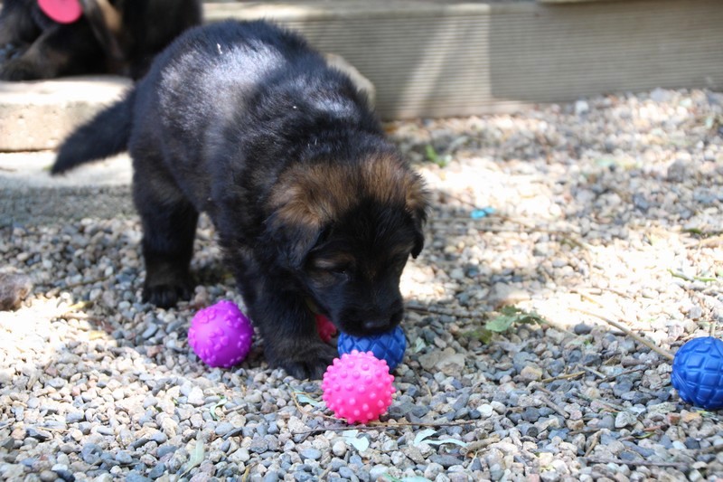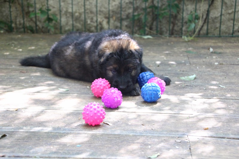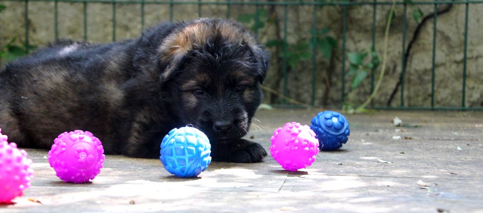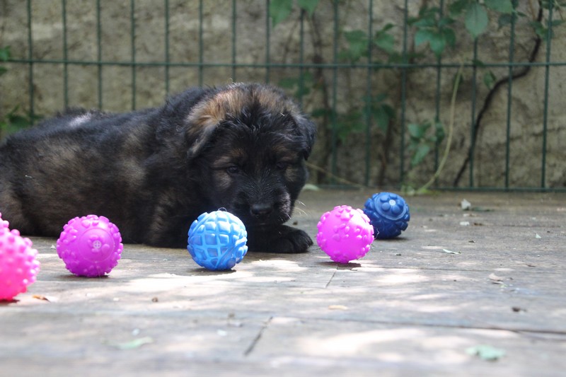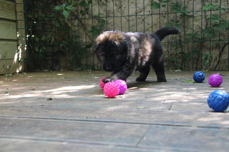 Alors comme promis de nouveaux jeux sont arrivés. De drôles de petites balles colorées en bleu, rose et violet ornées de petits picots de différente forme, sont tombées du ciel dans le parc à chiots. Les picots, il parait que c’est agréable à mâchouiller, mais nous sommes encore petits pour le faire, alors nous nous sommes contentés de les transporter et les faire rouler. Encore une fois approuvée par tous, la taille est bien adaptée pour des tout petits comme nous, si vous aussi vous en voulez, on les trouve chez Croq.fr