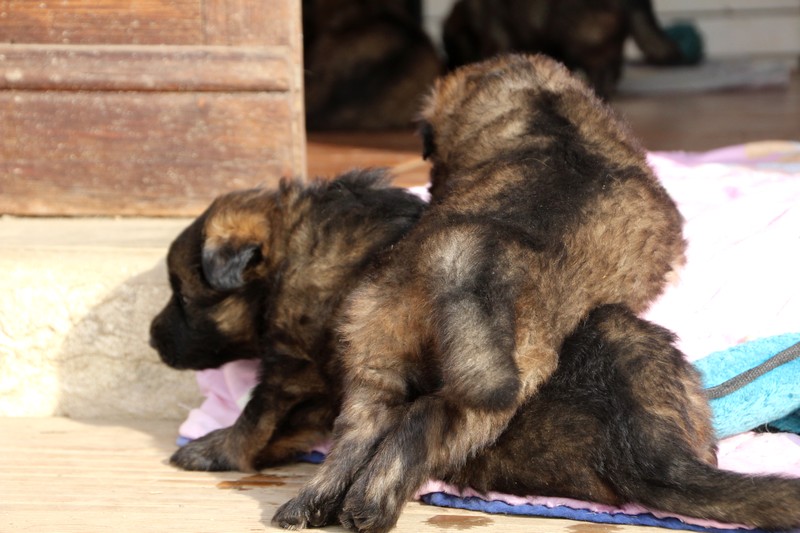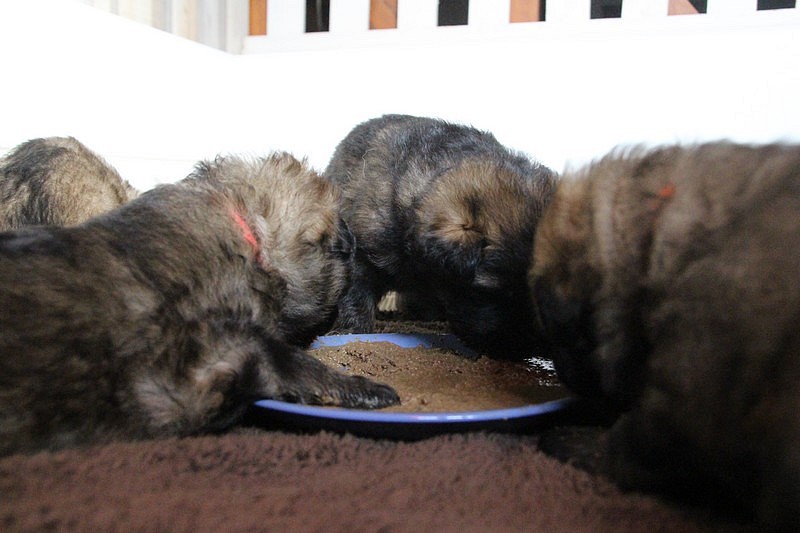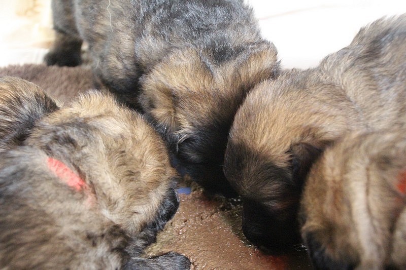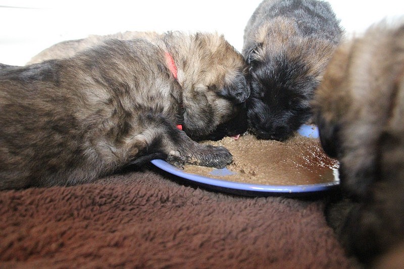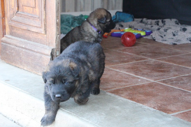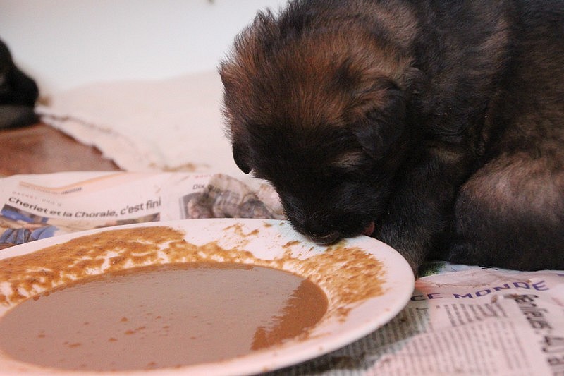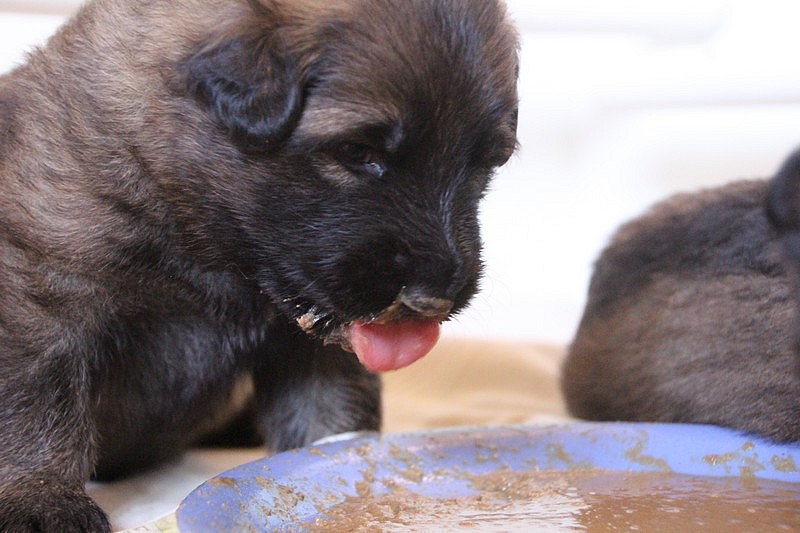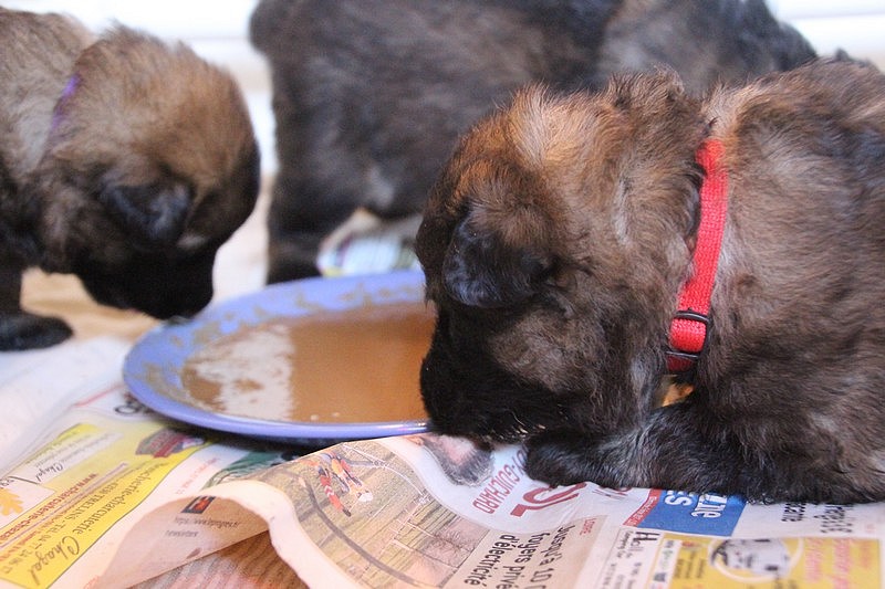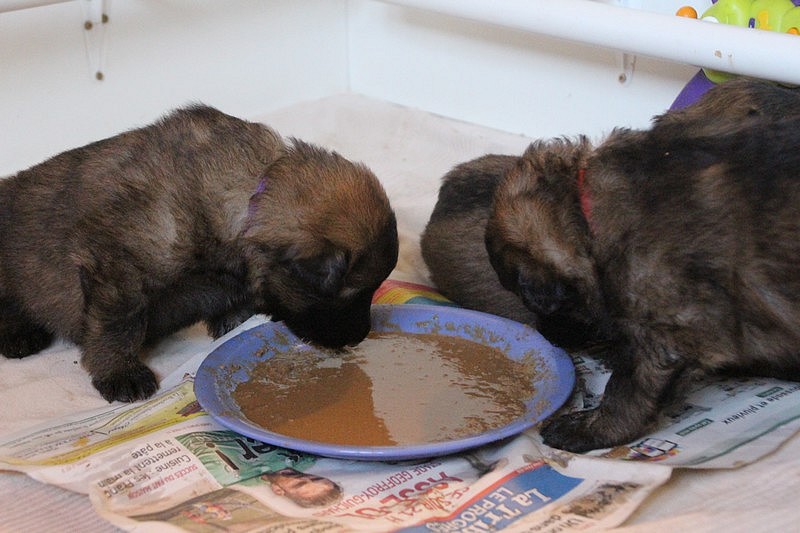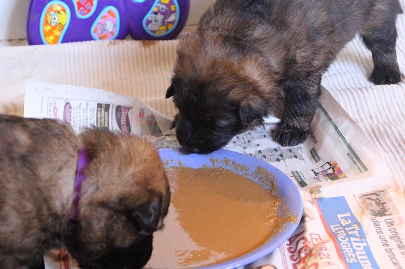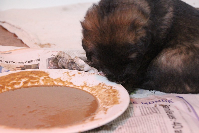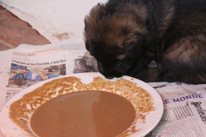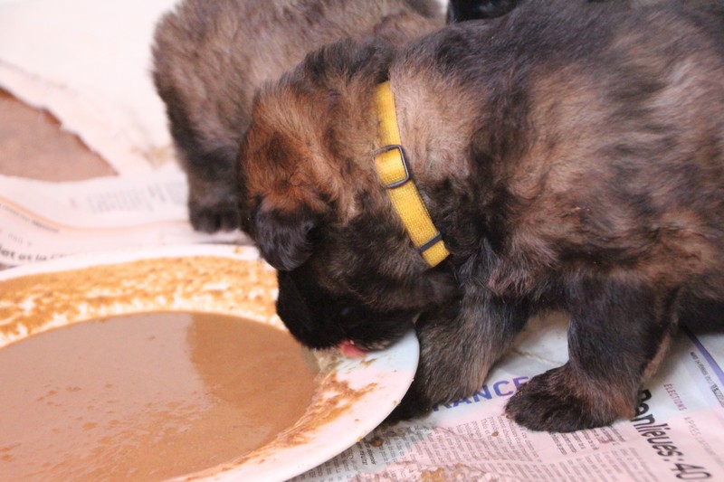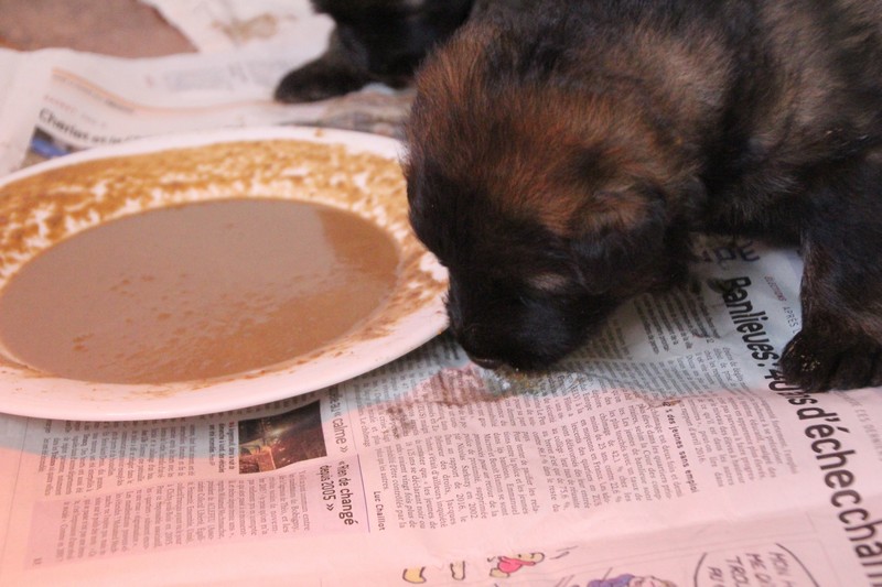 Coucou tout le monde, nous revoilà pour vous donner des nouvelles!! la semaine a été remplie de découvertes, déjà la bouillie, c’est vraiment trop bon et ça glisse quand on marche dans l’assiette puis ça colle aux poils, ce qui nous fait des petites réserves de nourriture. Nous commençons à bien nous déplacer, il parait que cette semaine nous allons aller dehors pour continuer les découvertes ! Nous savons aussi aboyer, la voix déraille par moment mais nous avons quand même notre mot à dire et savons nous faire entendre…