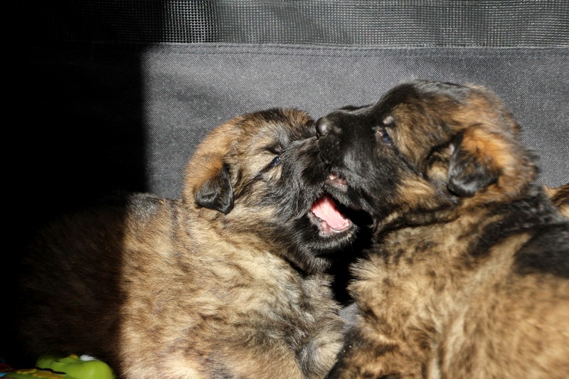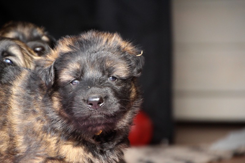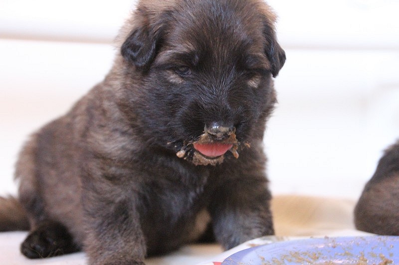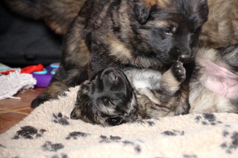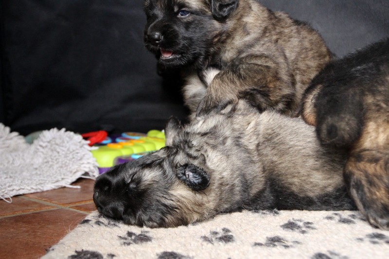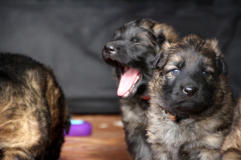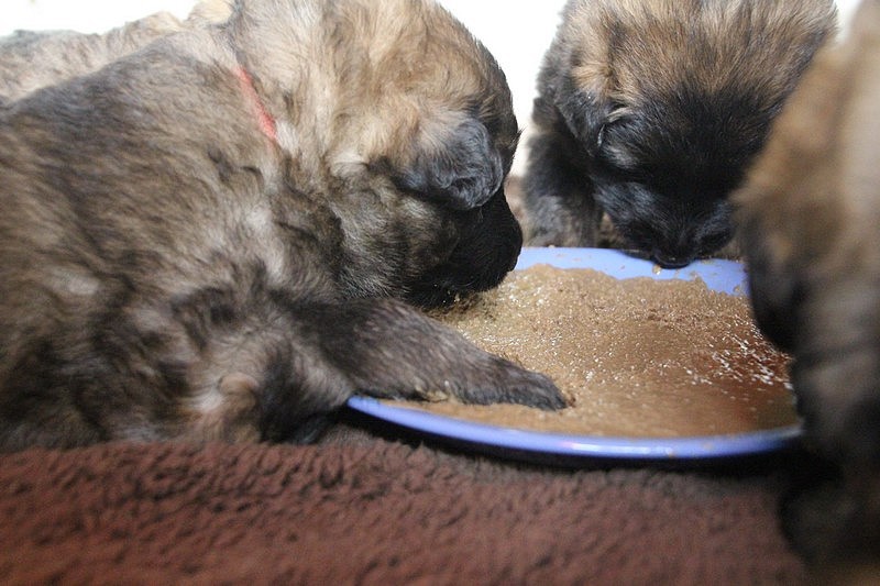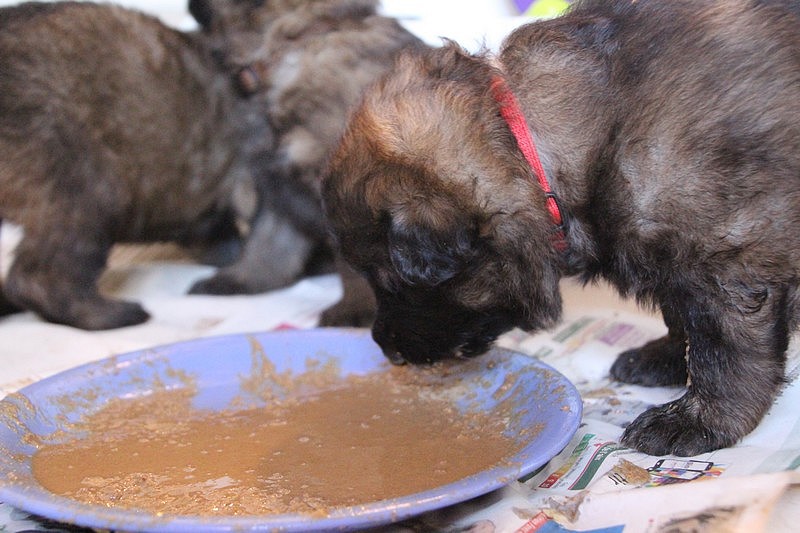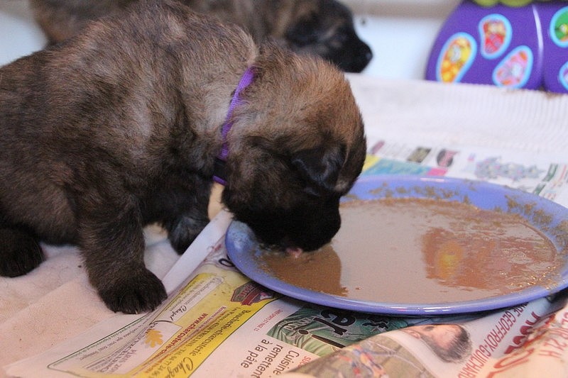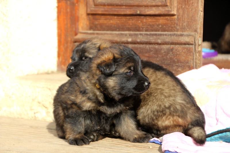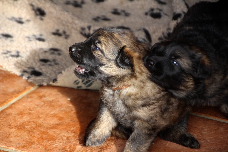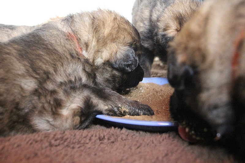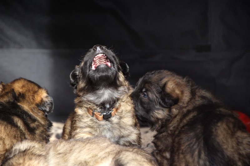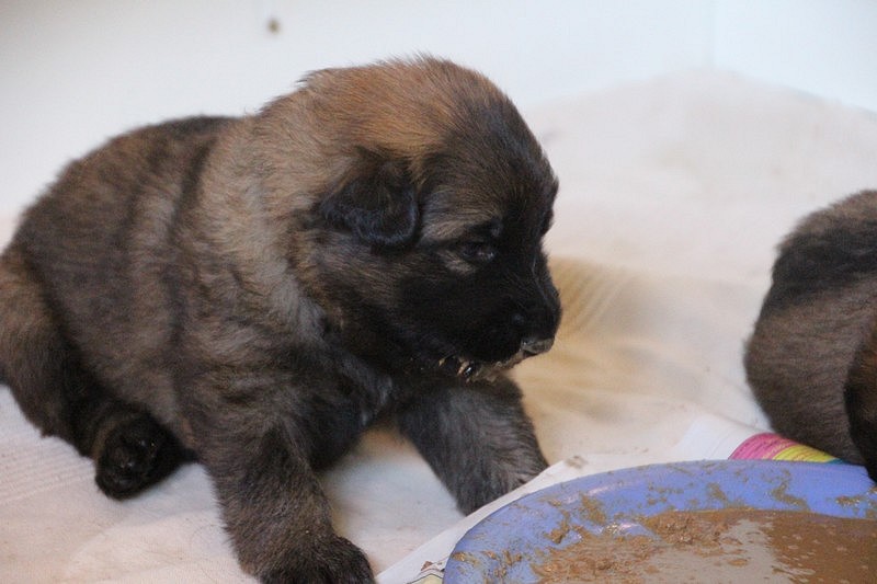 Coucou tout le monde, nous revoilà pour vous donner des nouvelles!! la semaine a été remplie de découvertes, déjà la bouillie, c’est vraiment trop bon et ça glisse quand on marche dans l’assiette puis ça colle aux poils, ce qui nous fait des petites réserves de nourriture. Nous commençons à bien nous déplacer, il parait que cette semaine nous allons aller dehors pour continuer les découvertes ! Nous savons aussi aboyer, la voix déraille par moment mais nous avons quand même notre mot à dire et savons nous faire entendre…