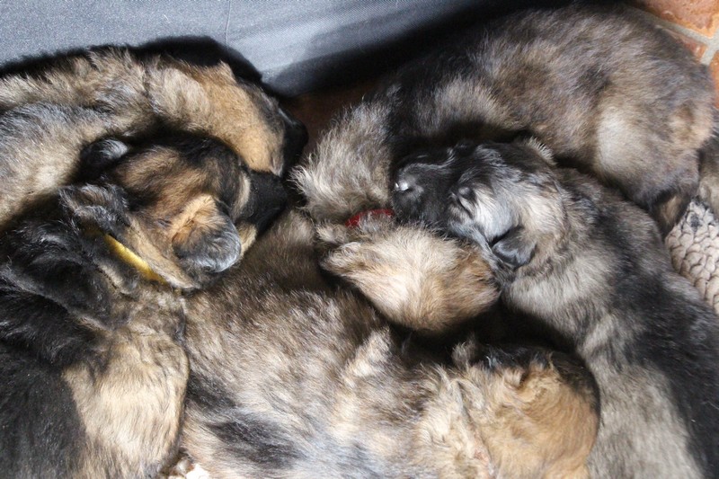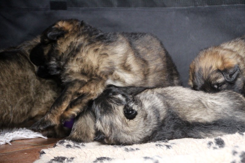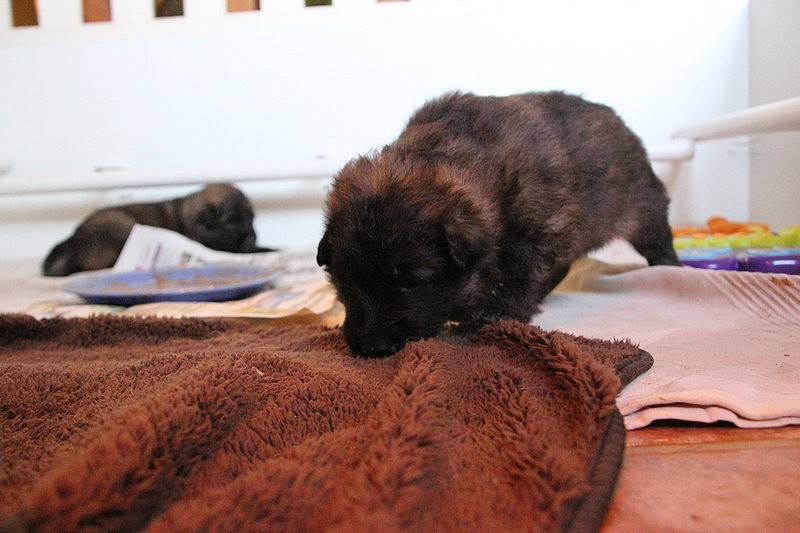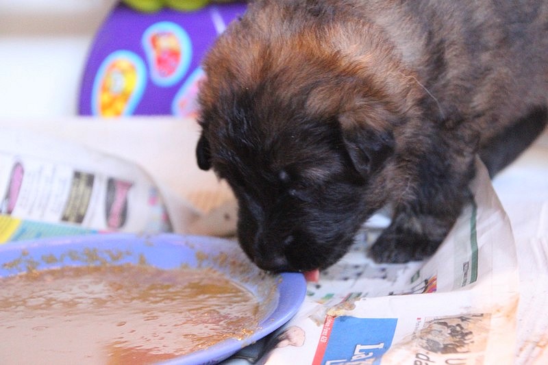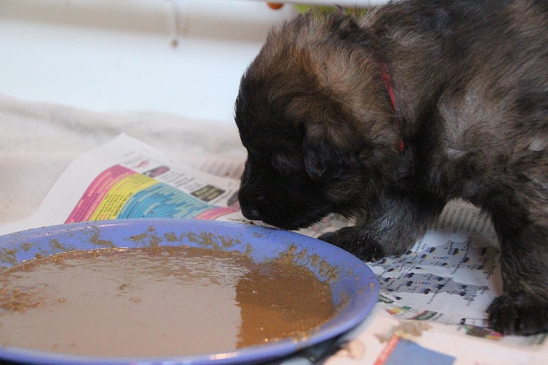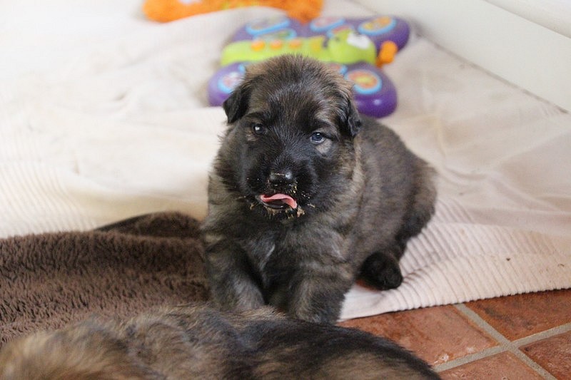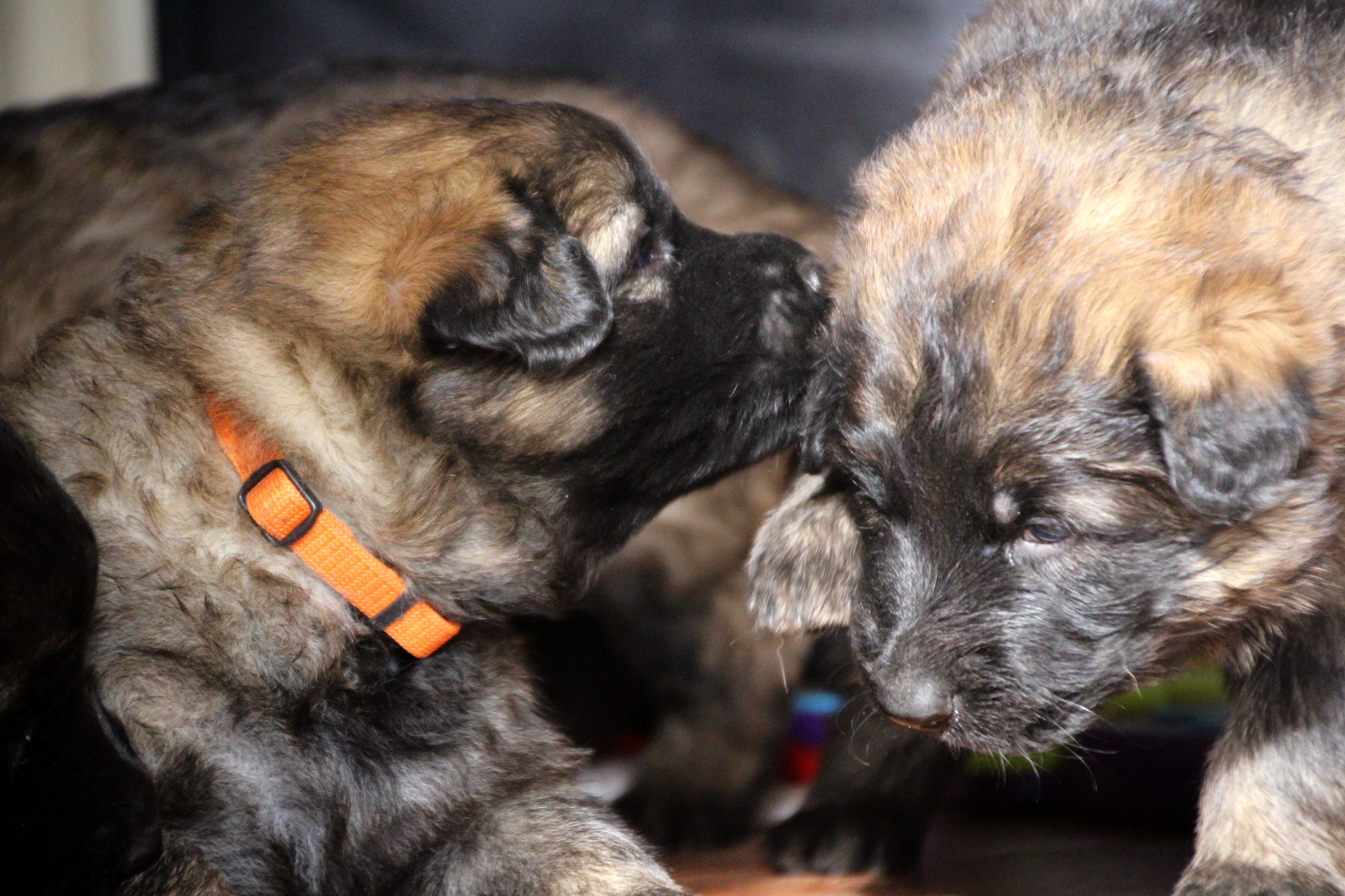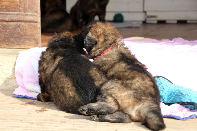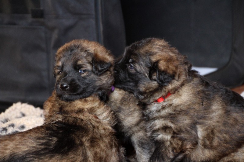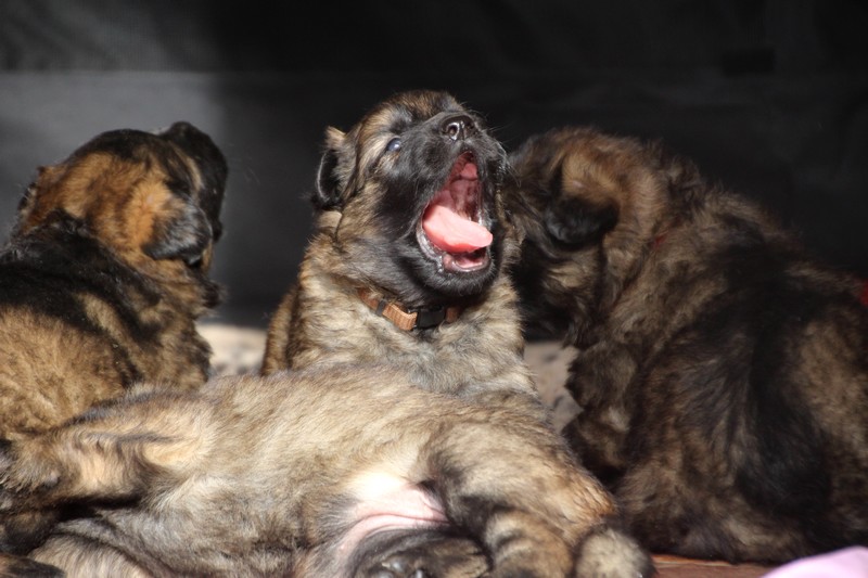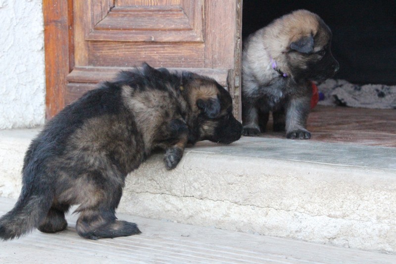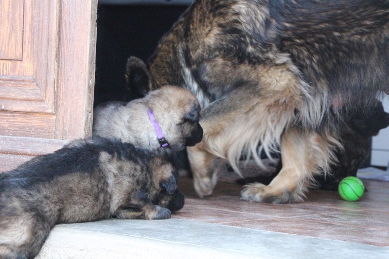 Coucou tout le monde, nous revoilà pour vous donner des nouvelles!! la semaine a été remplie de découvertes, déjà la bouillie, c’est vraiment trop bon et ça glisse quand on marche dans l’assiette puis ça colle aux poils, ce qui nous fait des petites réserves de nourriture. Nous commençons à bien nous déplacer, il parait que cette semaine nous allons aller dehors pour continuer les découvertes ! Nous savons aussi aboyer, la voix déraille par moment mais nous avons quand même notre mot à dire et savons nous faire entendre…