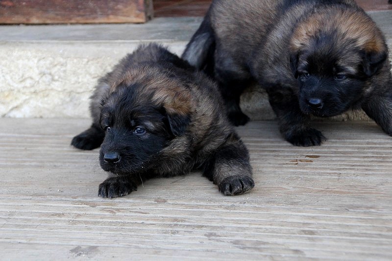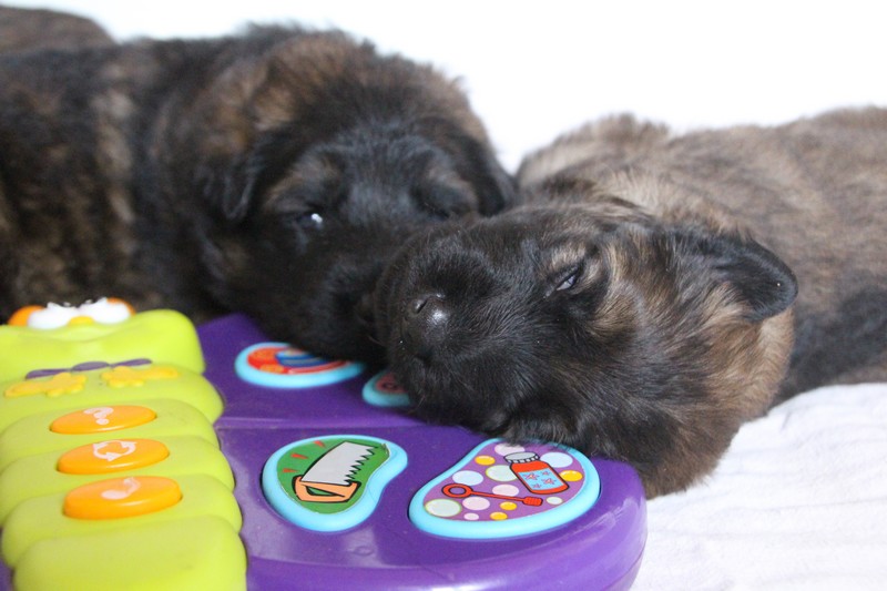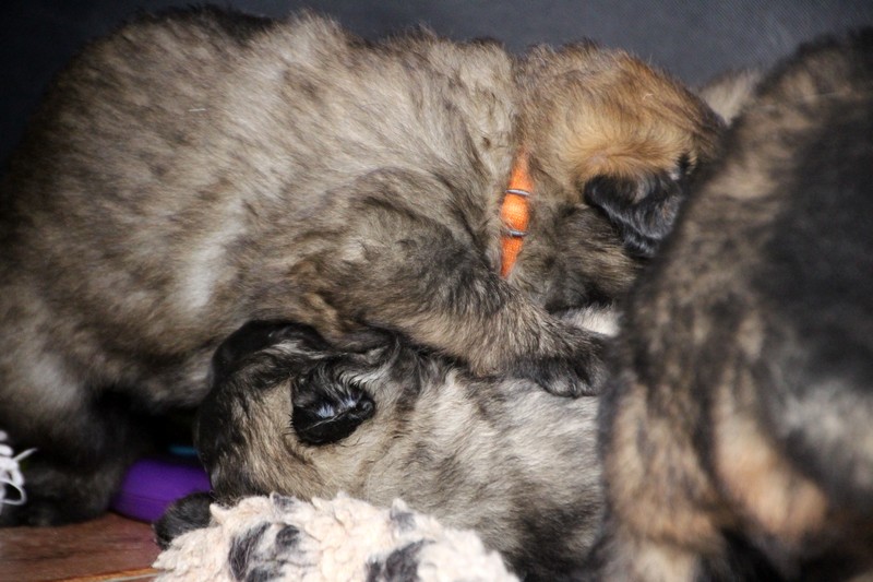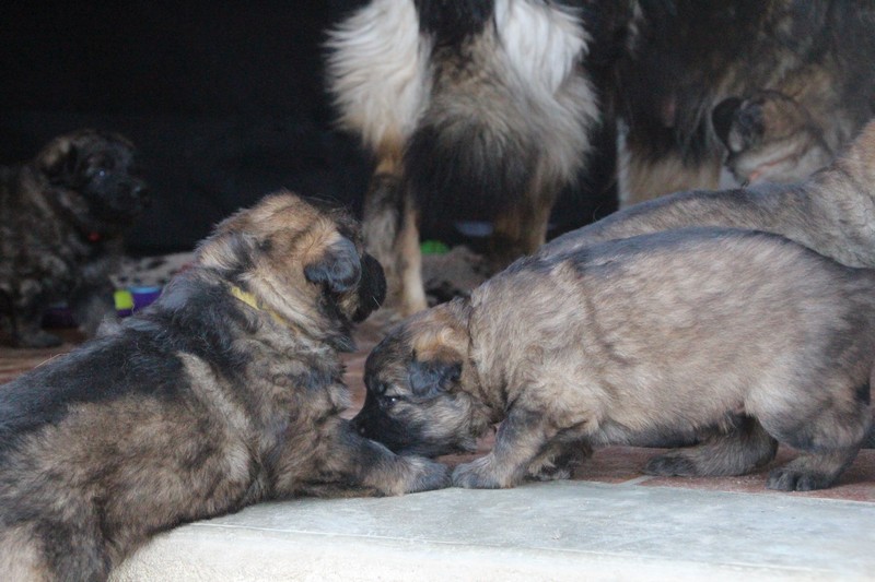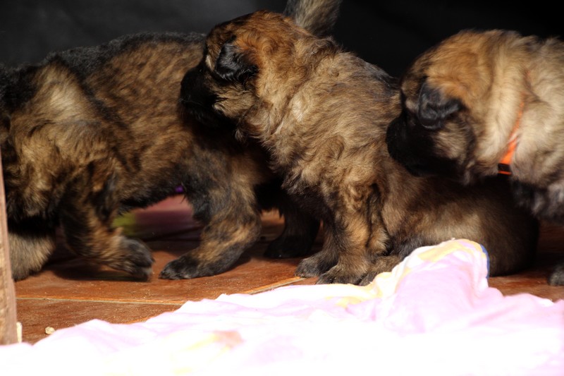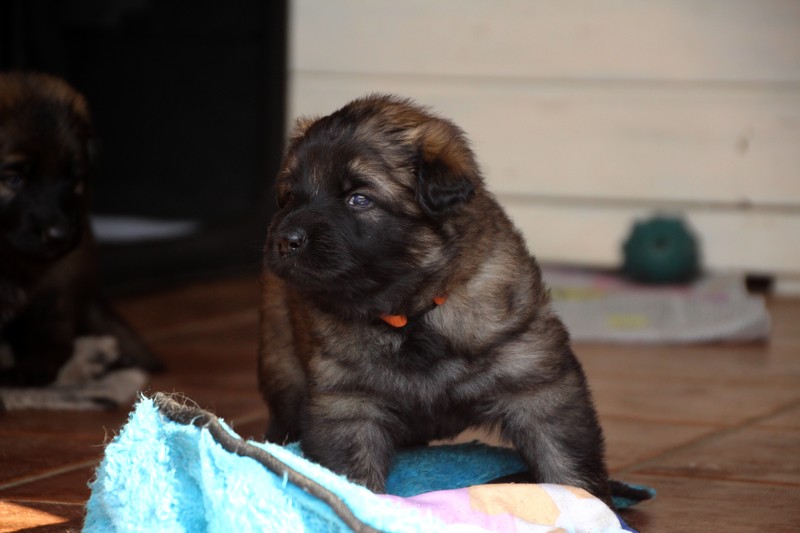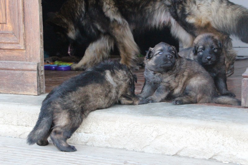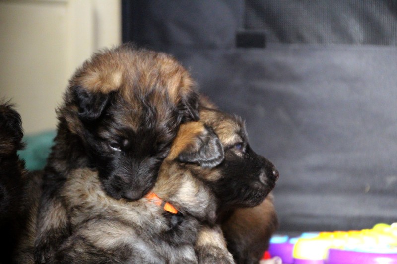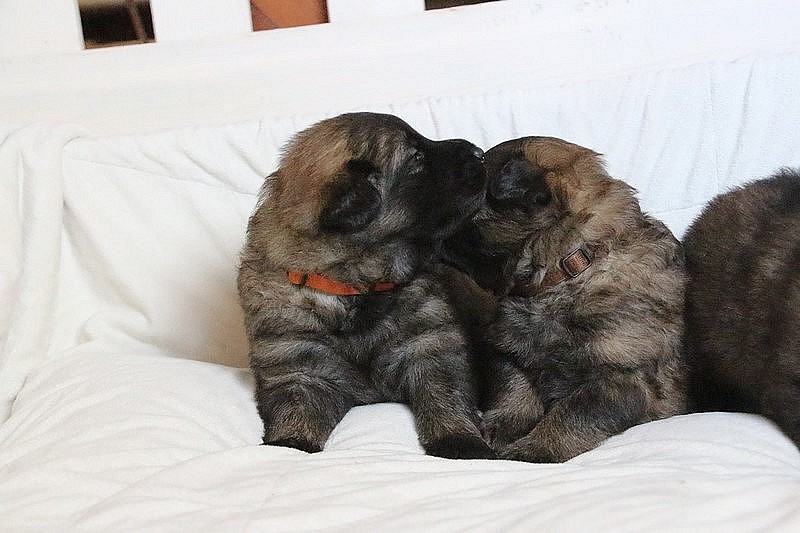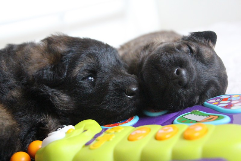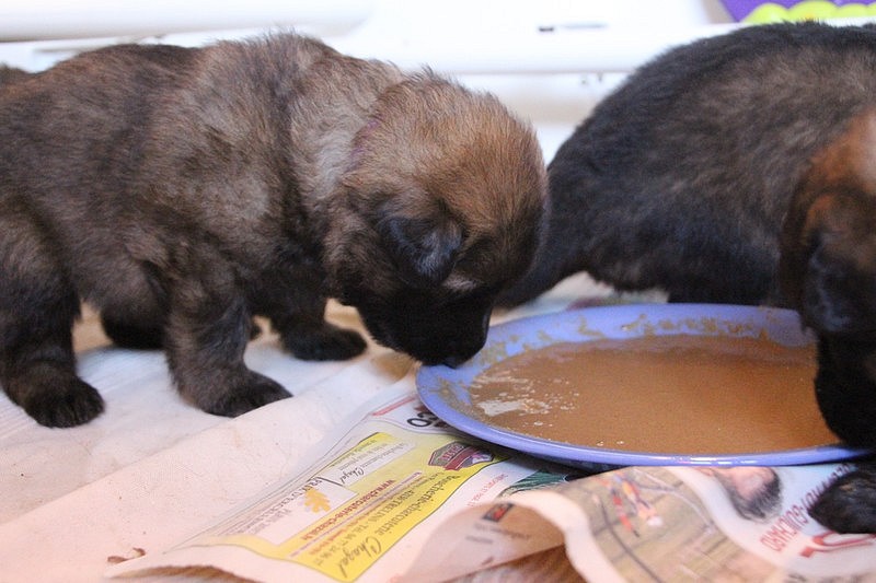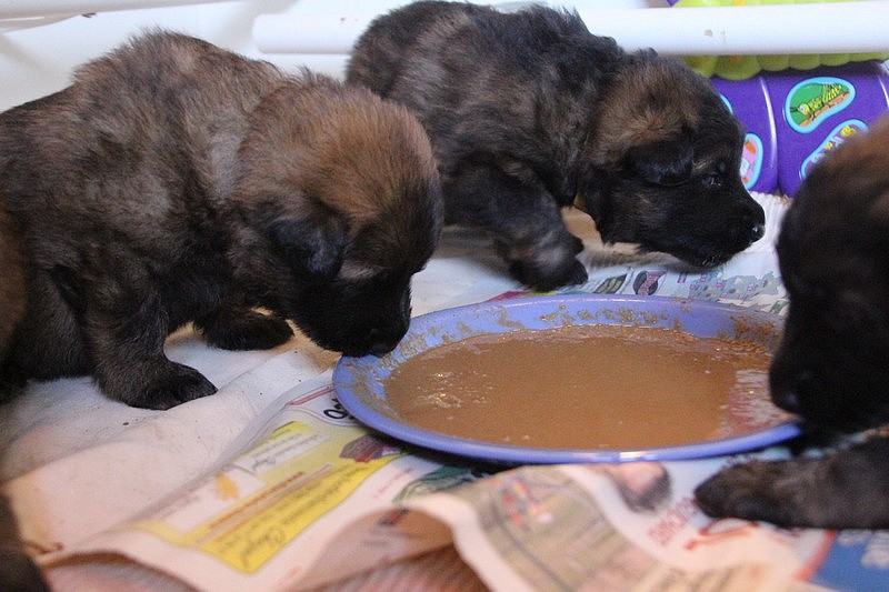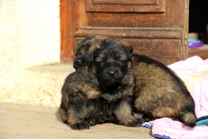 Coucou tout le monde, nous revoilà pour vous donner des nouvelles!! la semaine a été remplie de découvertes, déjà la bouillie, c’est vraiment trop bon et ça glisse quand on marche dans l’assiette puis ça colle aux poils, ce qui nous fait des petites réserves de nourriture. Nous commençons à bien nous déplacer, il parait que cette semaine nous allons aller dehors pour continuer les découvertes ! Nous savons aussi aboyer, la voix déraille par moment mais nous avons quand même notre mot à dire et savons nous faire entendre…