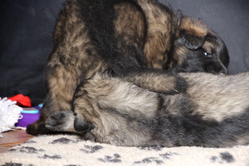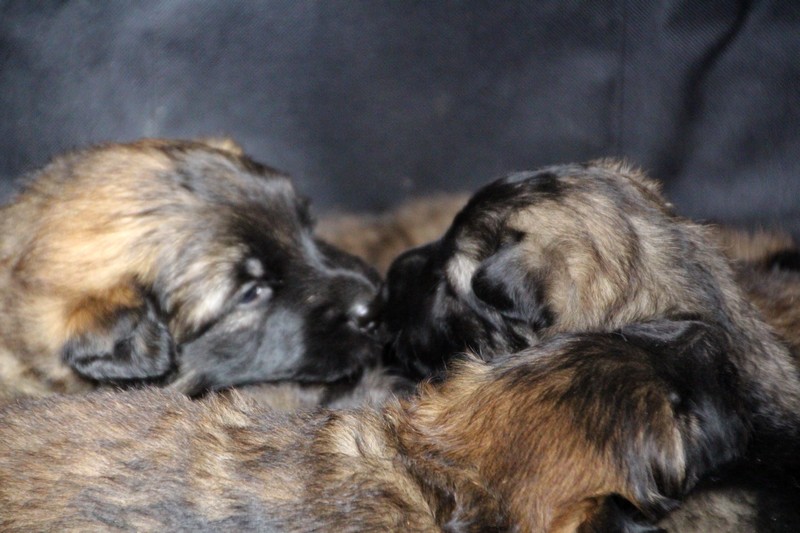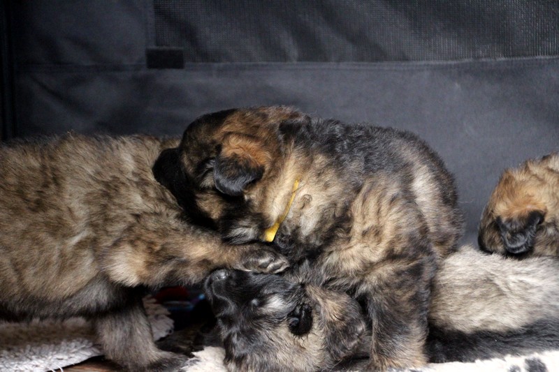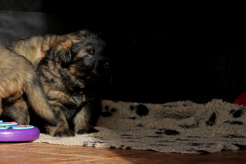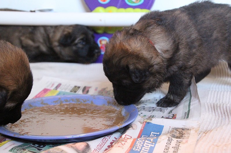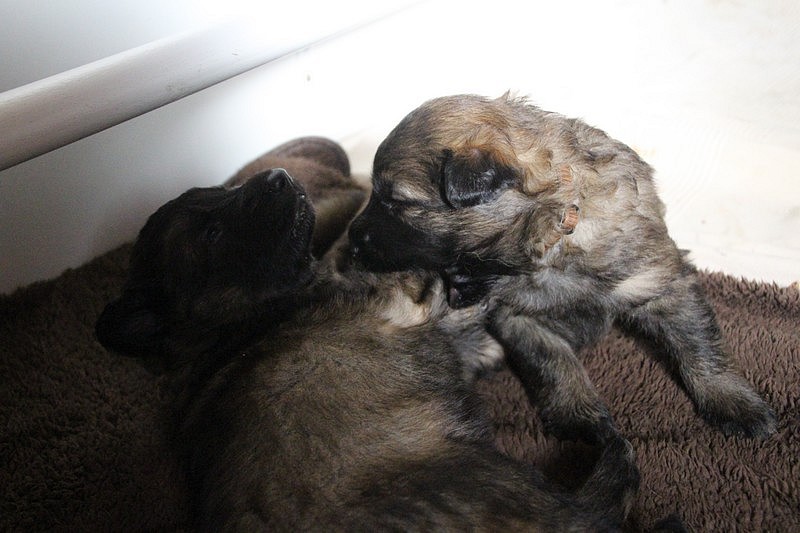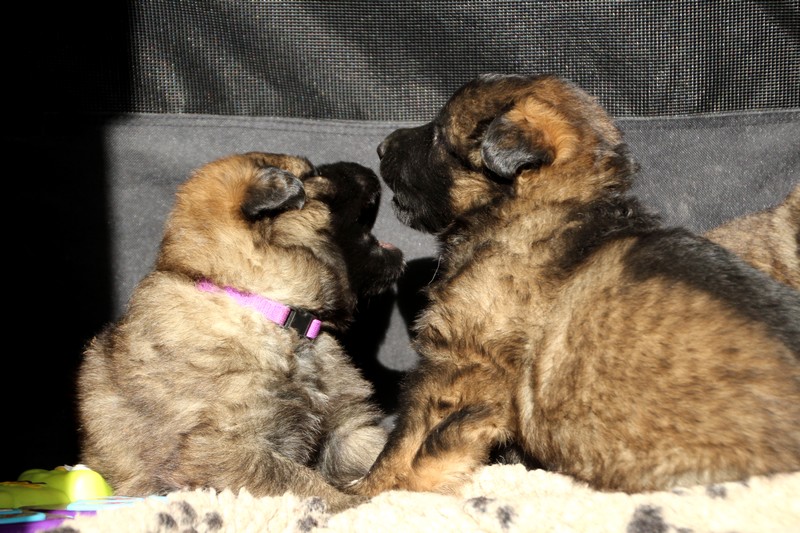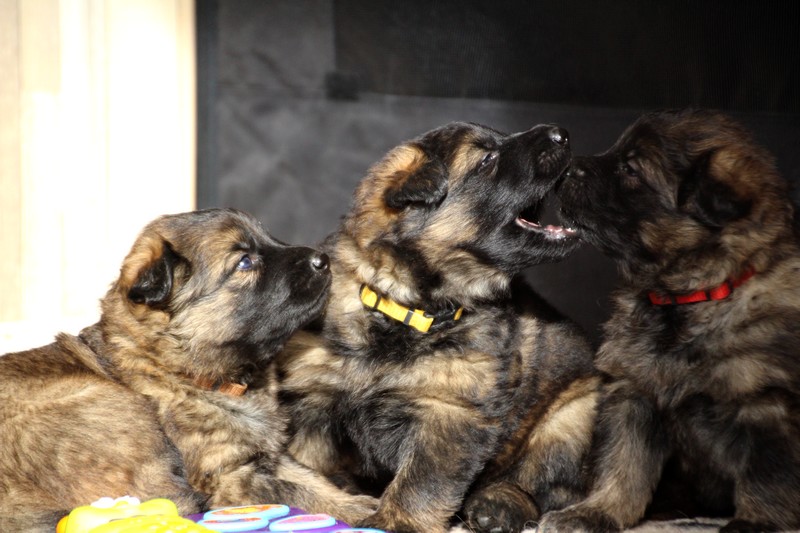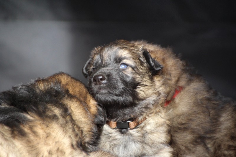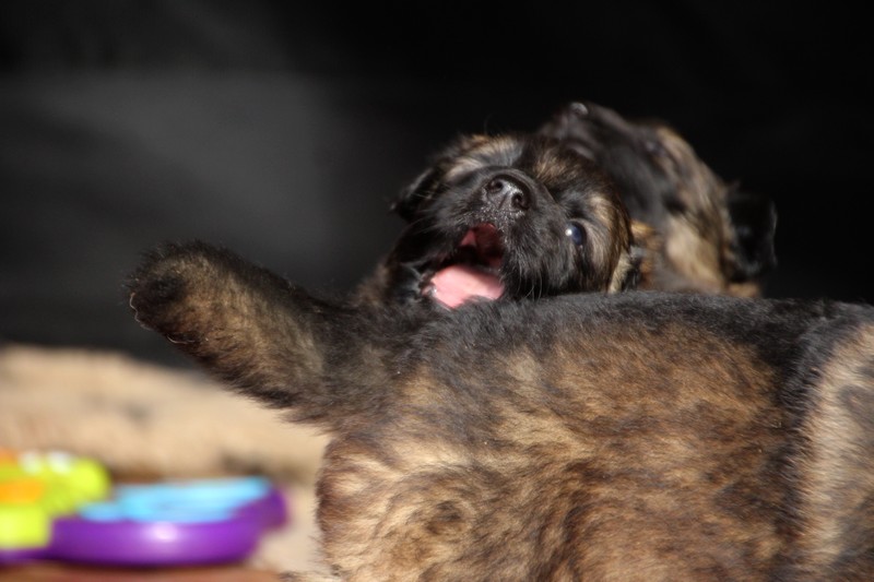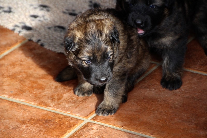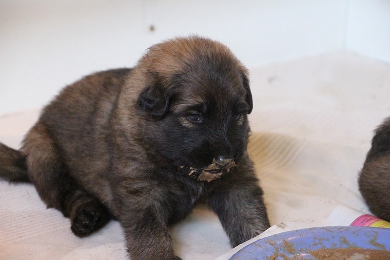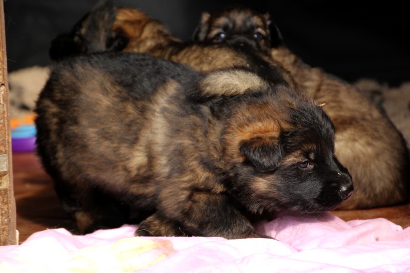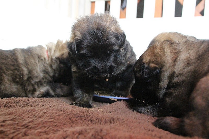 Coucou tout le monde, nous revoilà pour vous donner des nouvelles!! la semaine a été remplie de découvertes, déjà la bouillie, c’est vraiment trop bon et ça glisse quand on marche dans l’assiette puis ça colle aux poils, ce qui nous fait des petites réserves de nourriture. Nous commençons à bien nous déplacer, il parait que cette semaine nous allons aller dehors pour continuer les découvertes ! Nous savons aussi aboyer, la voix déraille par moment mais nous avons quand même notre mot à dire et savons nous faire entendre…