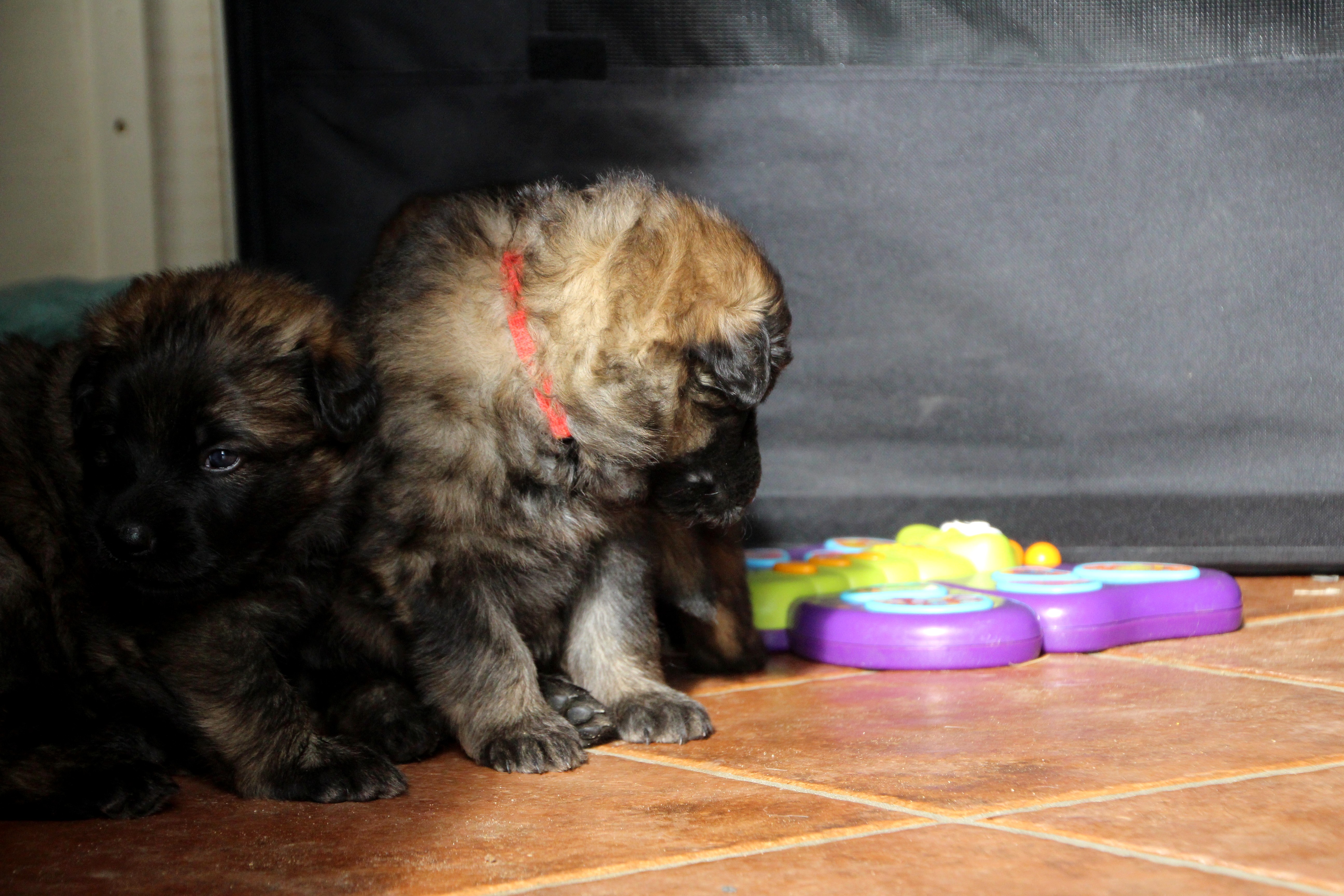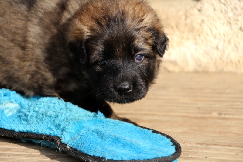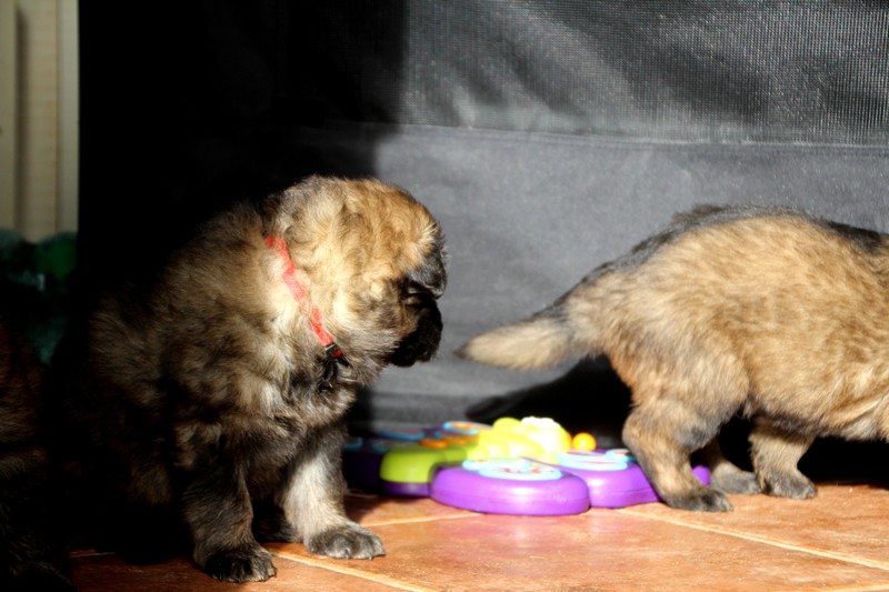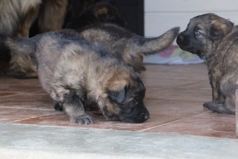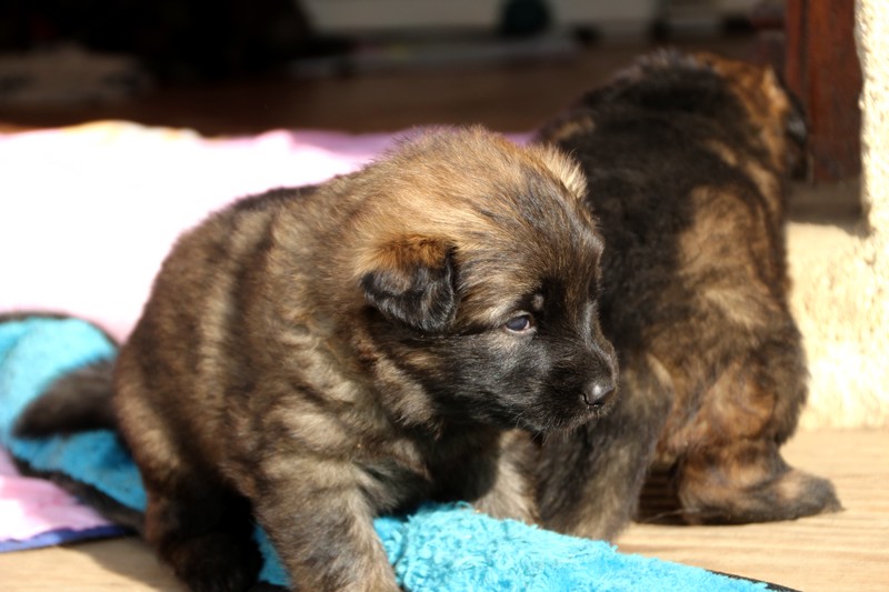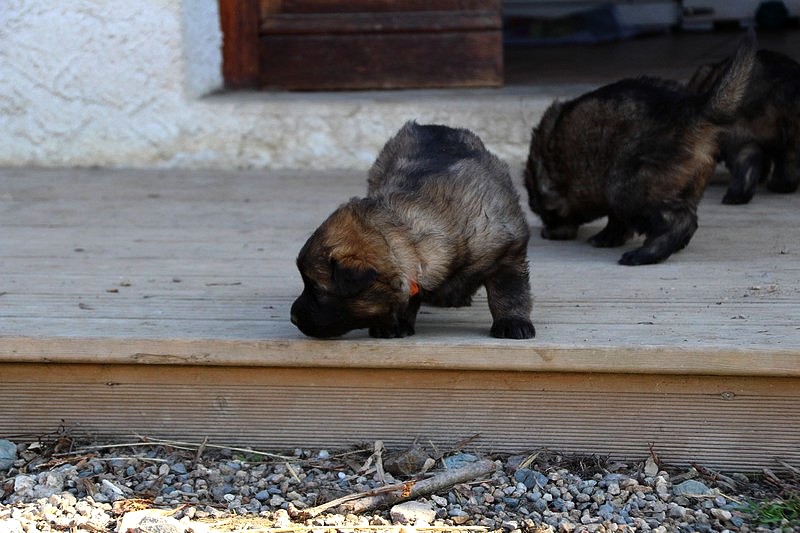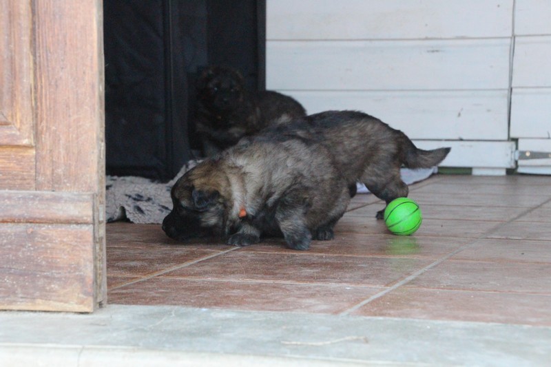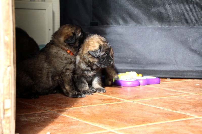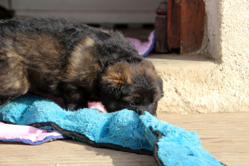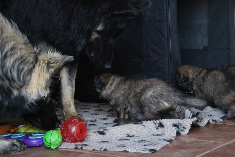 Aujourd’hui était un grand jour, nous avons quitté la nurserie et oui nous sommes des petits grands maintenant! Nous venons de rentrer au jardin des chiots, fini la caisse blanche, nous avons le droit de nous déplacer dans toute la pièce et nous sommes même sortis dehors, enfin pour les plus courageux… c’est maman qui nous a montré le chemin. Les autres grands de la meute viennent aussi nous voir et nous avons des nouveaux jeux. Assez papoter lla suite de cette belle découverte en photo.