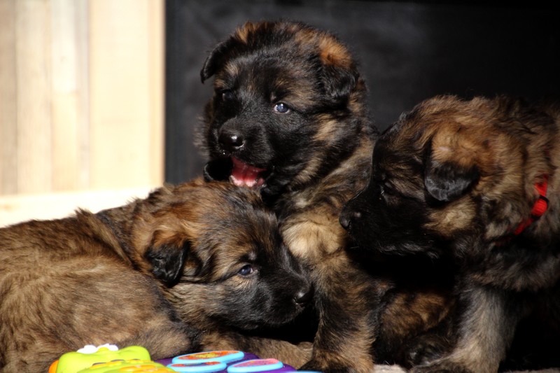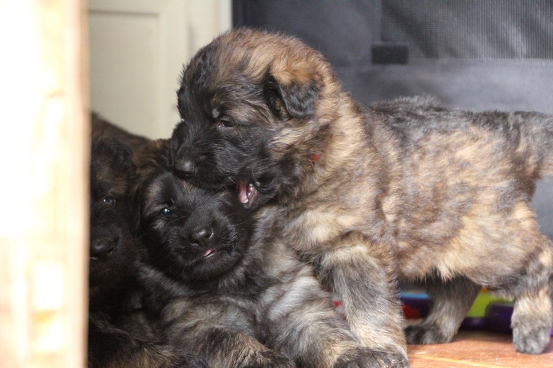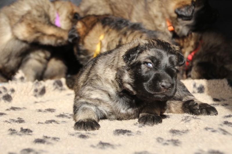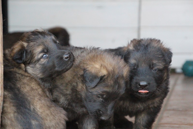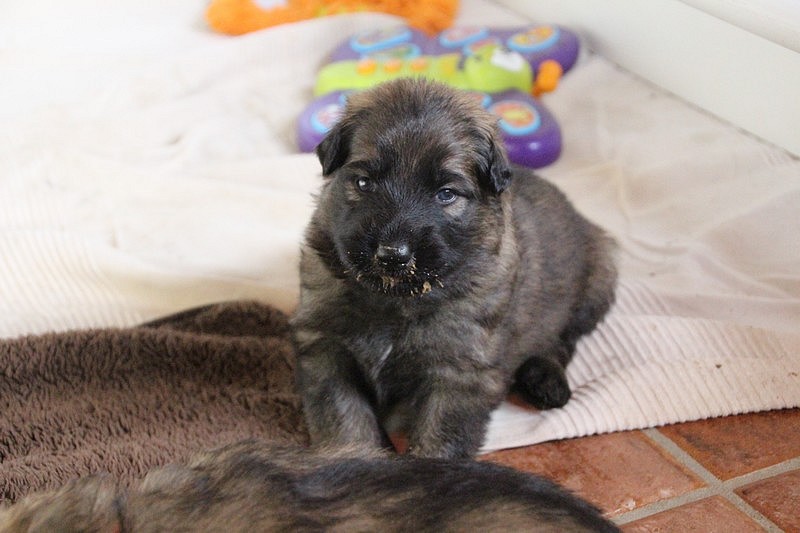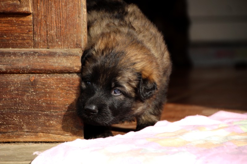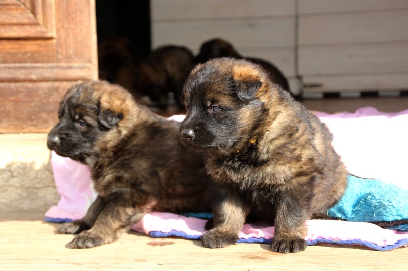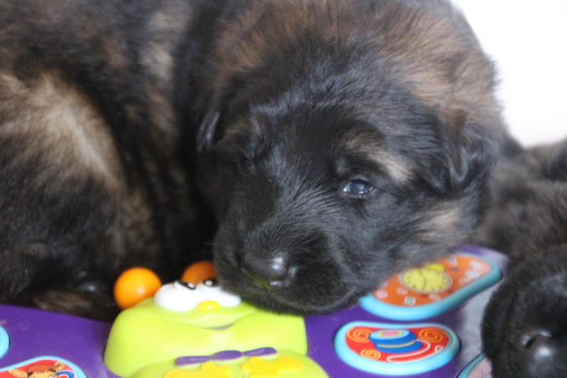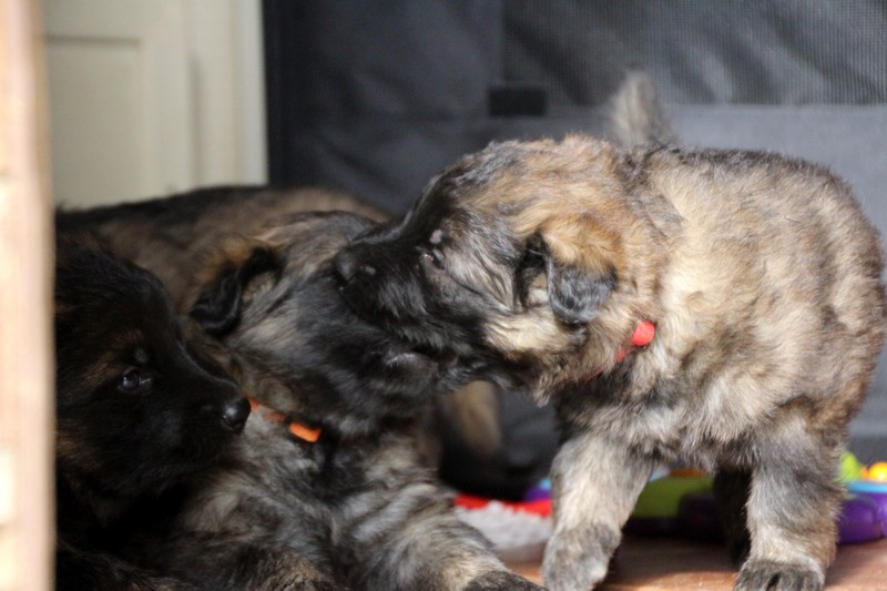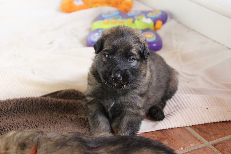 Aujourd’hui était un grand jour, nous avons quitté la nurserie et oui nous sommes des petits grands maintenant! Nous venons de rentrer au jardin des chiots, fini la caisse blanche, nous avons le droit de nous déplacer dans toute la pièce et nous sommes même sortis dehors, enfin pour les plus courageux… c’est maman qui nous a montré le chemin. Les autres grands de la meute viennent aussi nous voir et nous avons des nouveaux jeux. Assez papoter lla suite de cette belle découverte en photo.