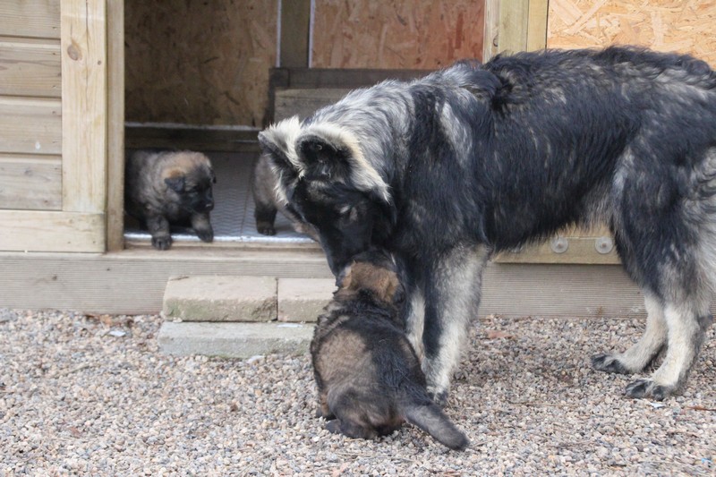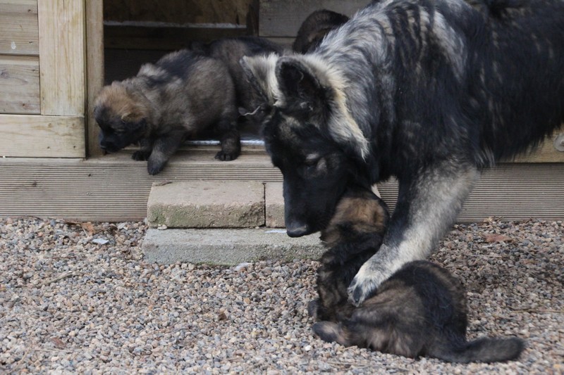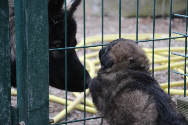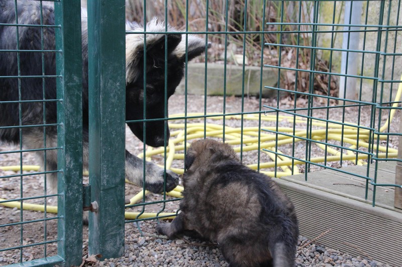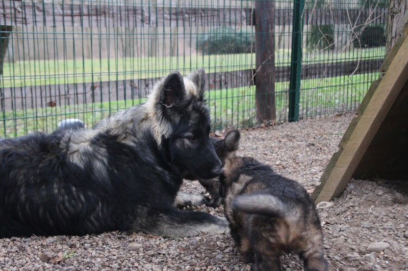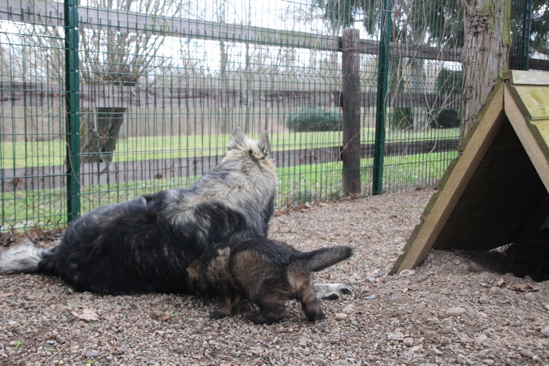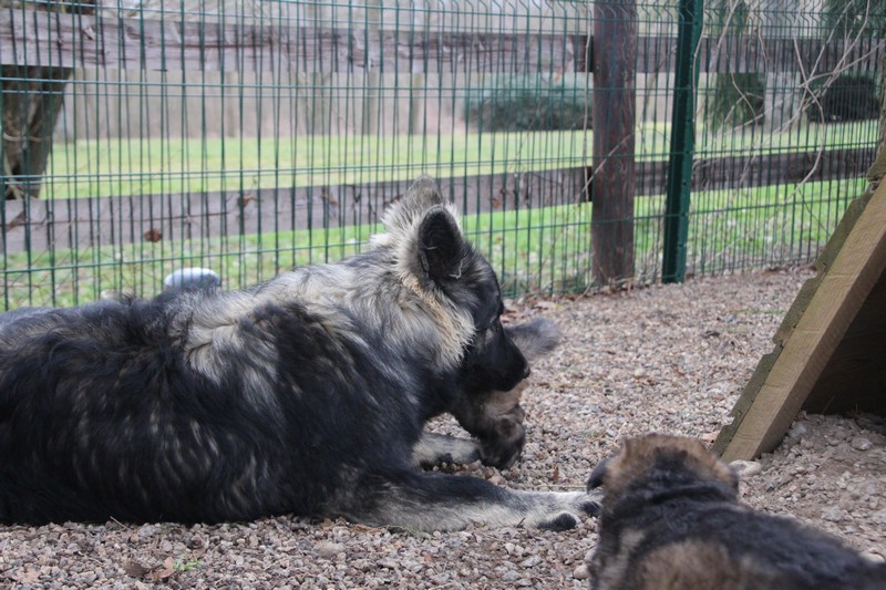 Maman est venue nous voir dans notre parc, mais aussi le reste de la meute, on s’amuse beaucoup avec les grands, surtout avec Sioux et Perle, nous adorons leur courir derrière….