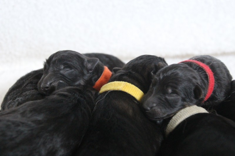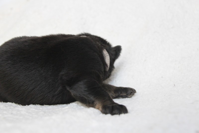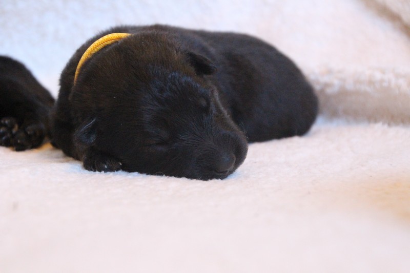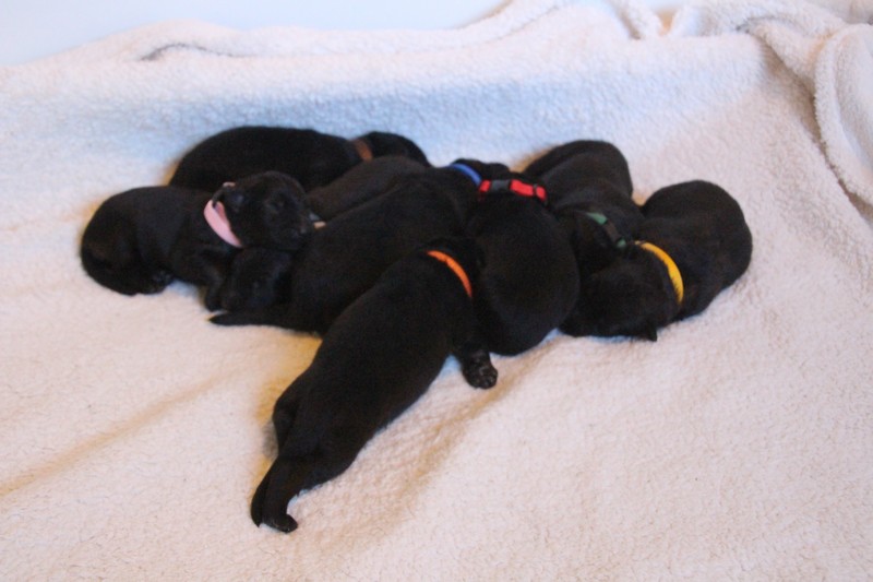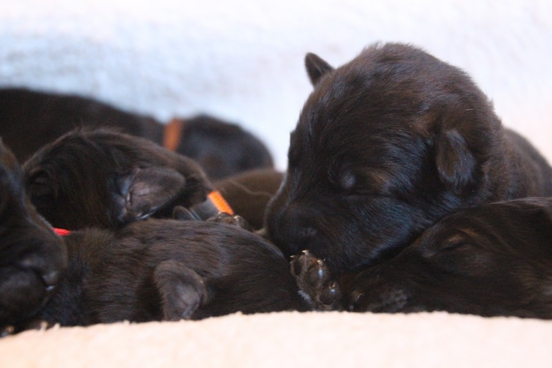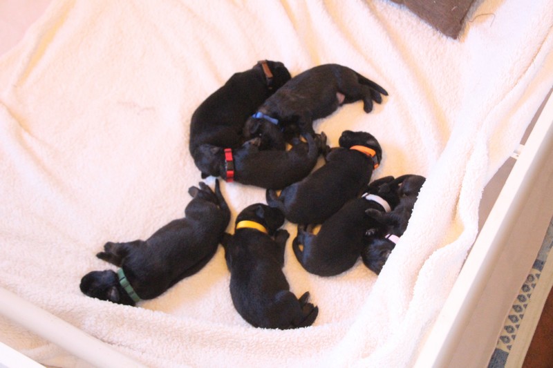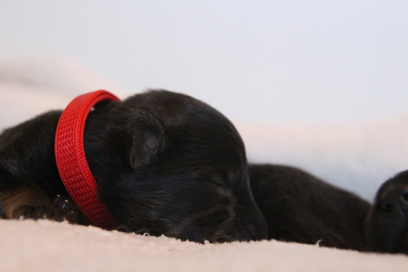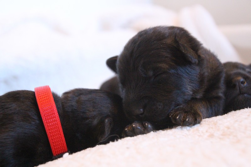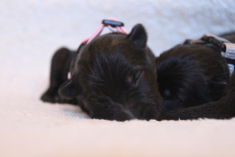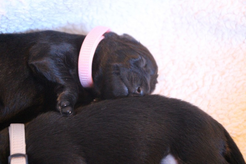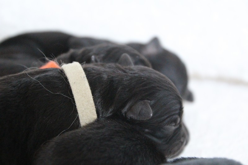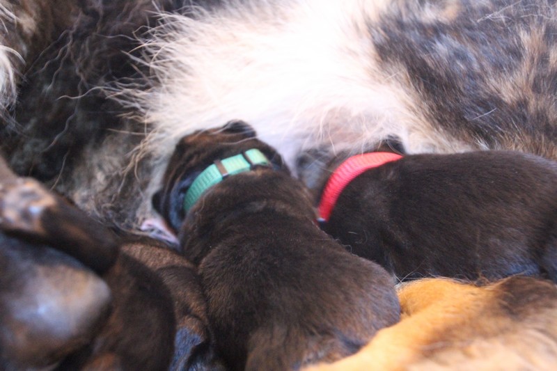 Quant à nous, nous grossissons bien, enfin presque bien… Quand les lourdauds, dont je ne citerais pas les couleurs, ne viennent pas me bousculer et voler la tétine à laquelle je m’accroche de toutes mes forces (c’est collier rouge au clavier). Au moment de la tétée, c’est vraiment l’anarchie. Heureusement, je suis un peu privilégiée et les plus goinfres sont mis dans une panière le temps du premier service. Moi j’ai même l’autorisation de manger aussi au deuxième… si petite et je suis pourtant au centre de toutes les attentions. En même temps, c’est logique que j’aie le droit à deux tournées, je fais la moitié du poids de certains. Mais je compte bien rattraper tout le monde, parce que si je suis peut-être petite, je suis surtout une vraie battante.