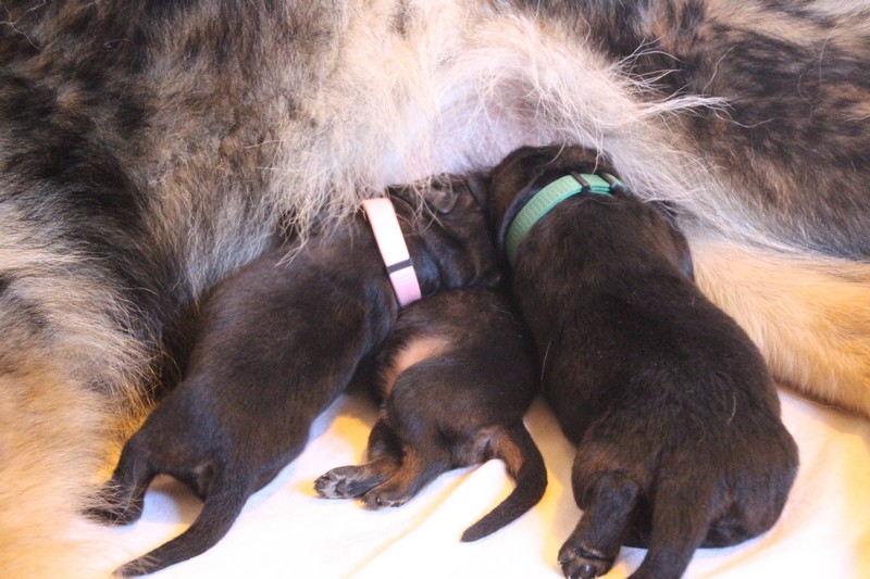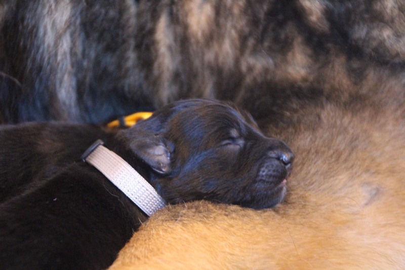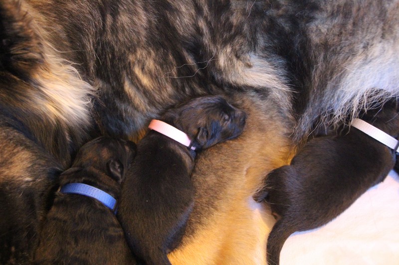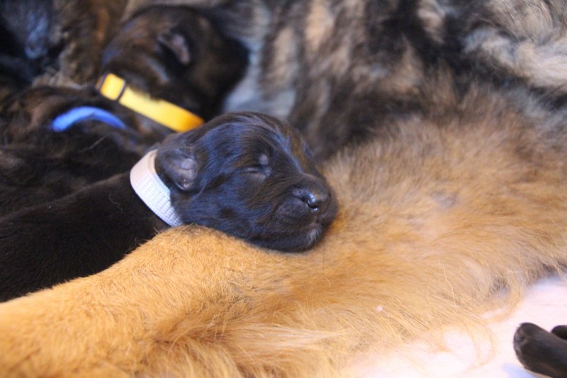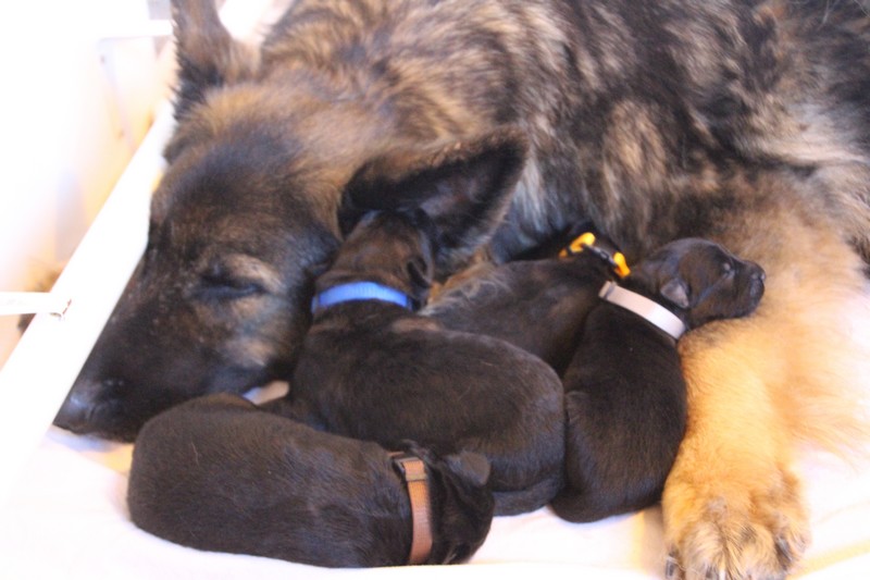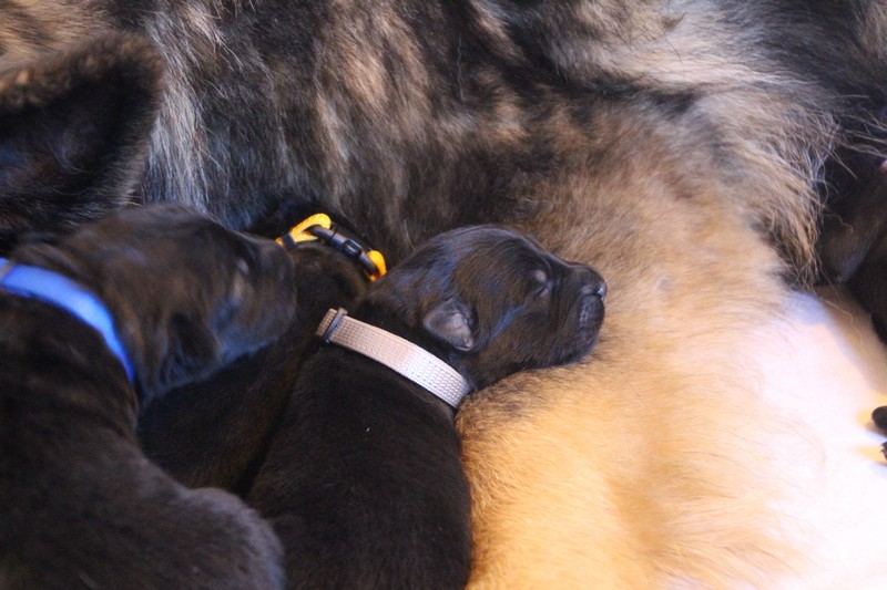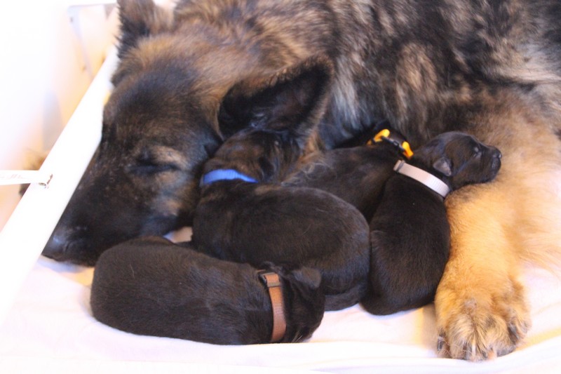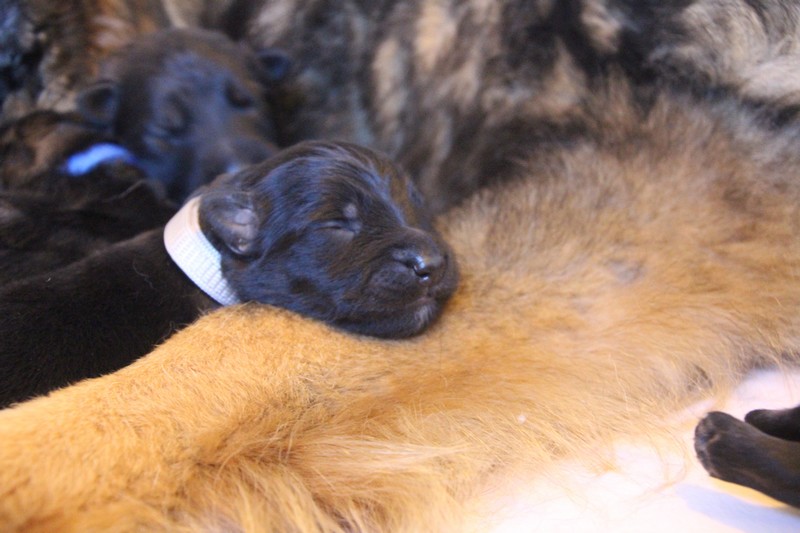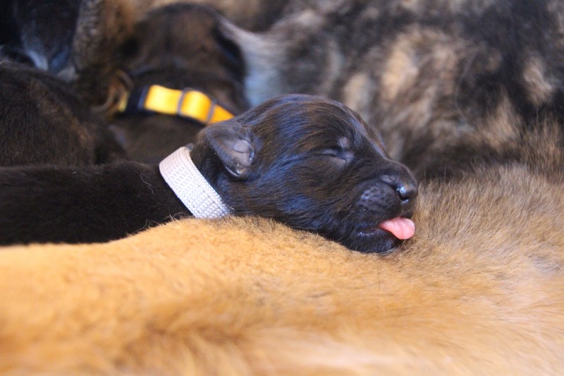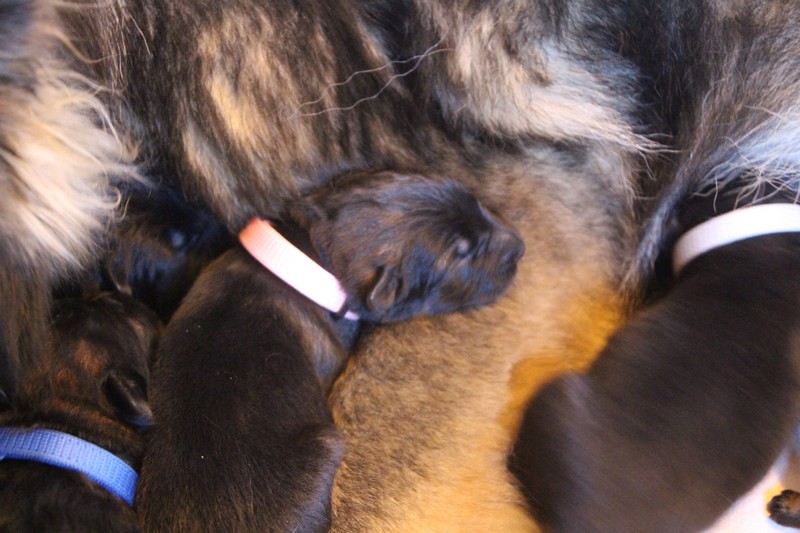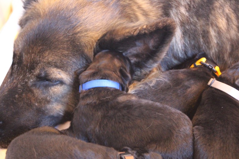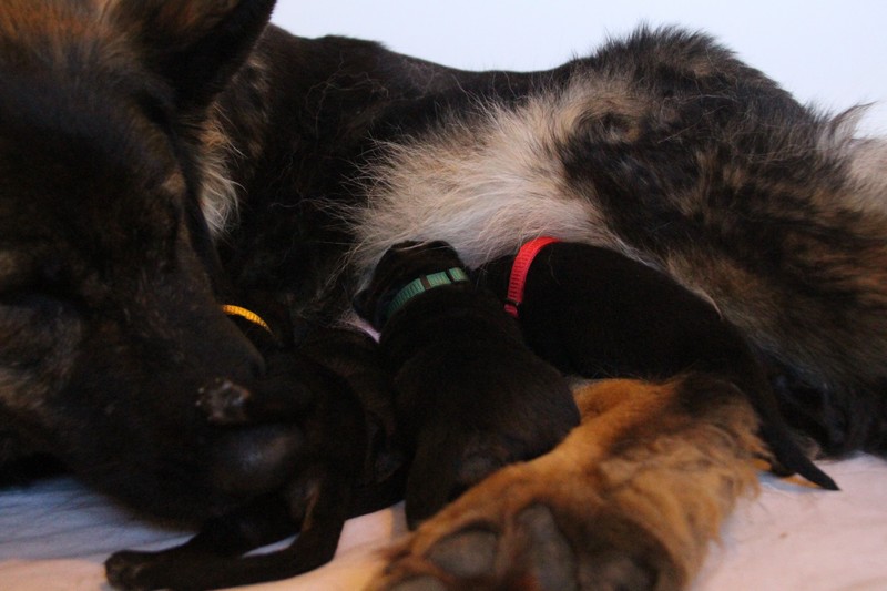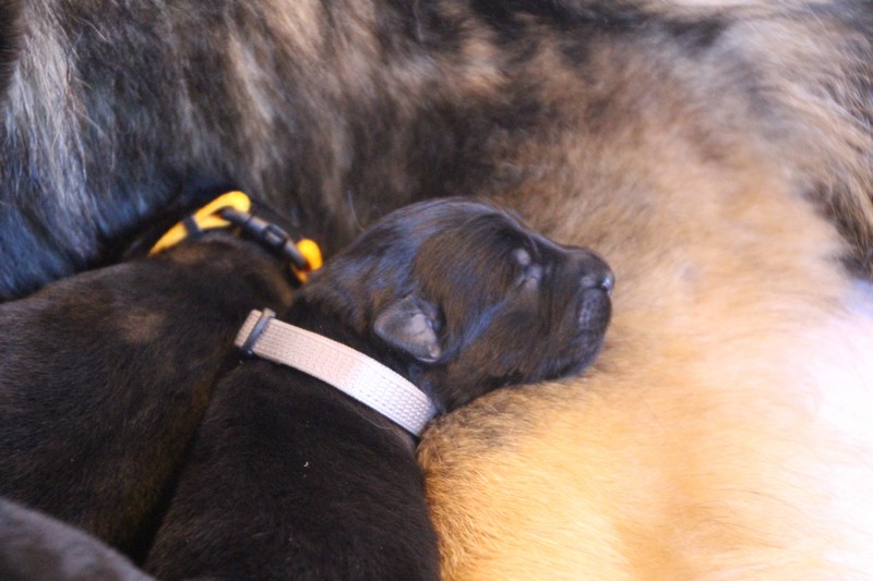 Nous avons malheureusement perdu notre petite sœur, la collier violet. Elle a été écrasée par maman dans la nuit de mercredi à jeudi. En prime, maman n’était pas en forme samedi matin. Elle a fait une mammite avec une montée de température. Heureusement, le super docteur l’a remise sur pattes, en deux temps, trois mouvements. Elle va beaucoup mieux et l’on espère que, maintenant, ce seront que de bonnes nouvelles qui suivront pour les 7 semaines à venir…