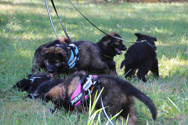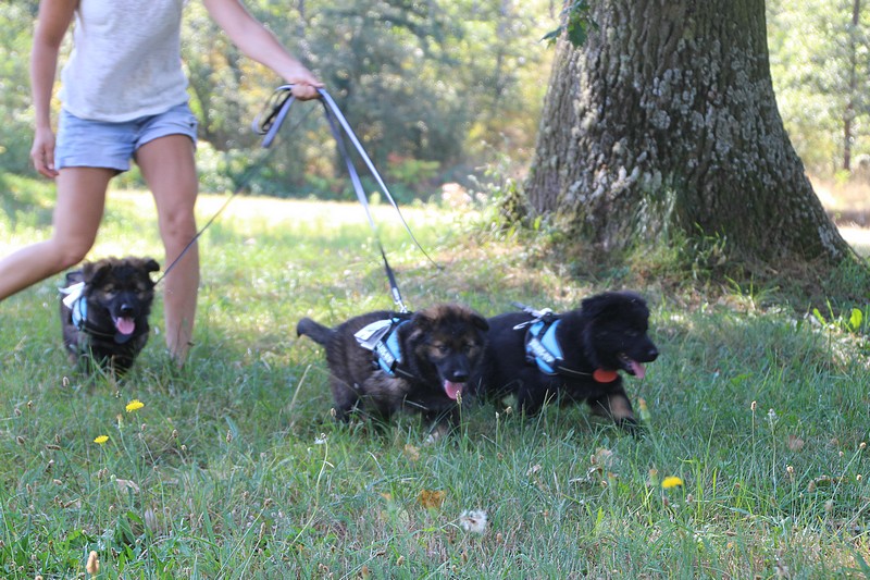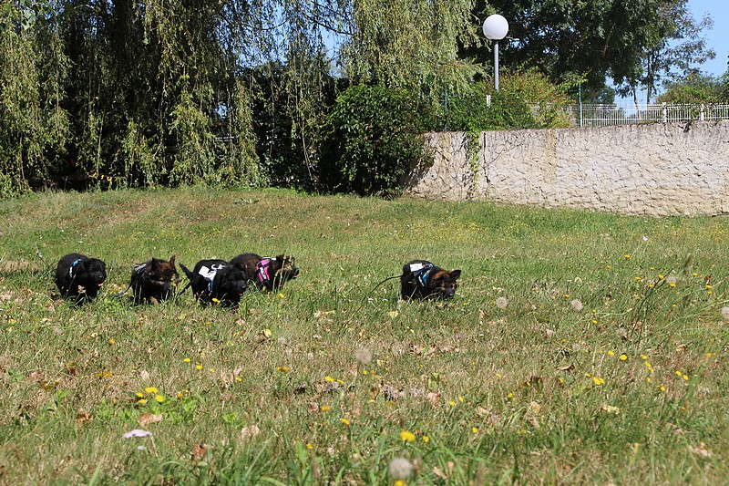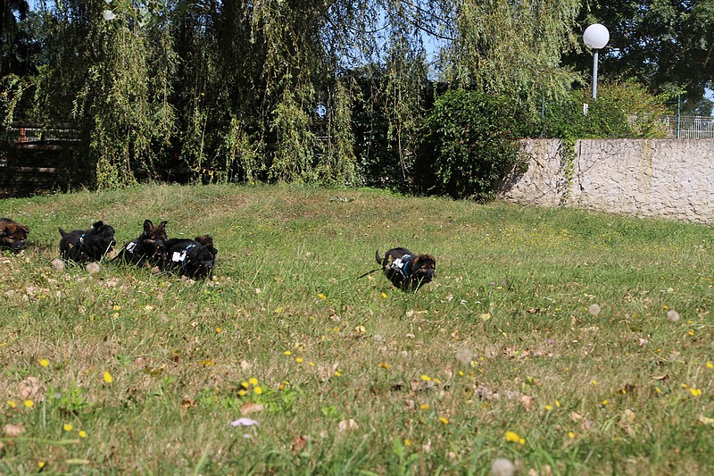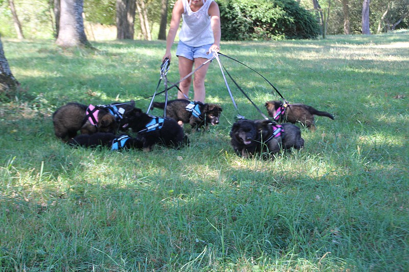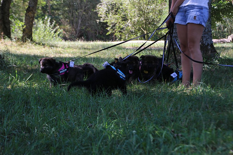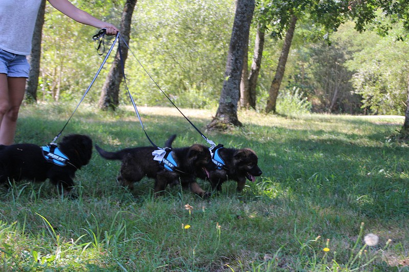 Nous avons reçu nos petits harnais et nos laisses, c’est ce qui va nous permettre de pouvoir nous promener en toute sécurité dans les endroits à risque, car nous n’avons pas besoins d’être attaché pour être lié à l’humain, nous sommes de vrais petites pots de colle et les premiers essais de marche en laisse ont été bien drôles!