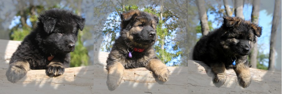 Nous sommes trois petits chiots avec un caractère opposé, il y’a le gros calme patachon, collier marron, qui reste là où il a été posé. Le petit entreprenant, collier violet, qui passe son temps à tout explorer. Et la petite collier bleu qui aimerait bien, mais ne sait pas trop comment faire et qui va chercher appui sur les autres pour oser…