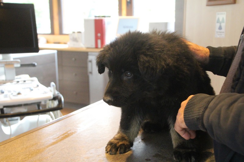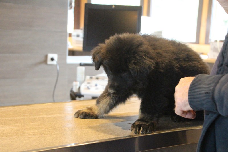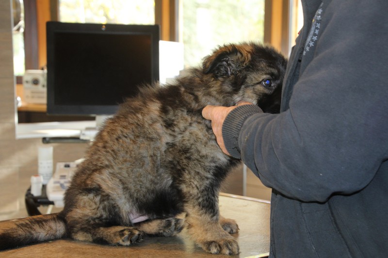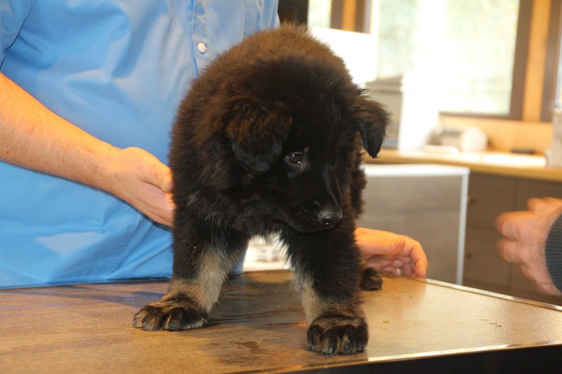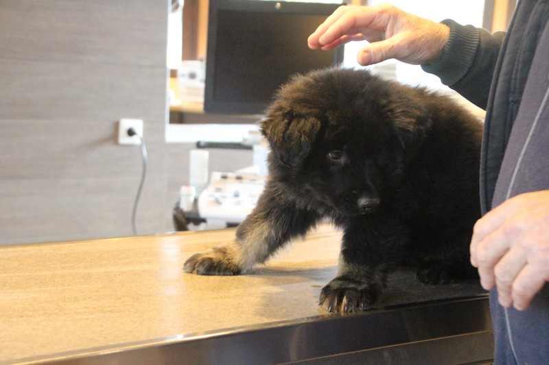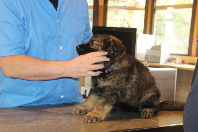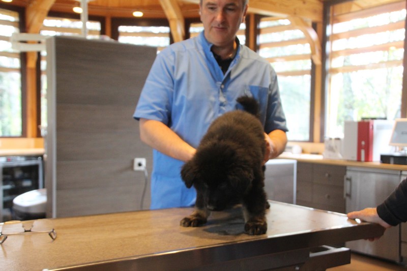 Lundi, nous avons eu notre visite chez le vétérinaire, qui nous a bien regardés de partout, mis une puce et fait des piqures et il a dit: « ils sont parfaits ces petits loups ». Nous avons été très sages, on n’a même pas couiné.