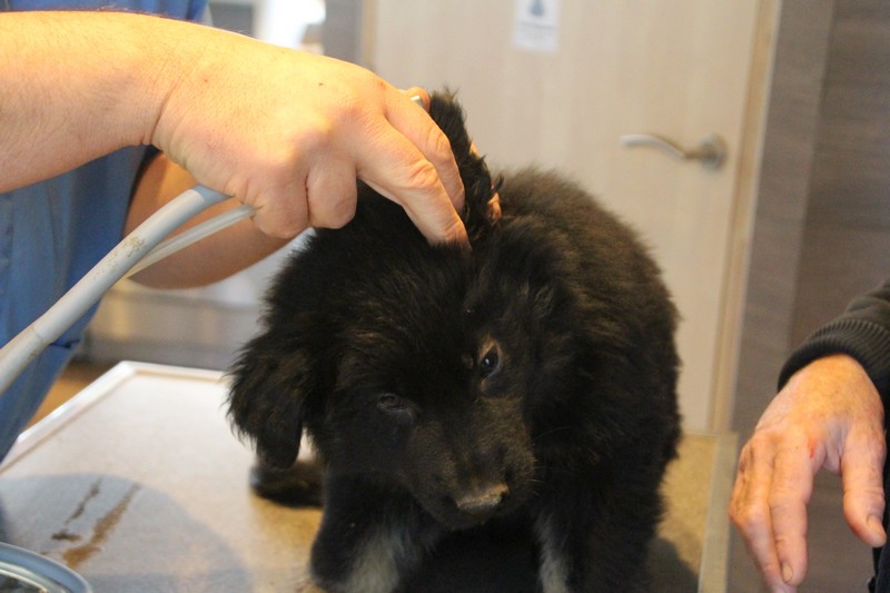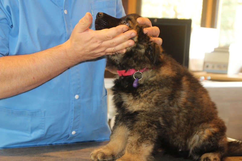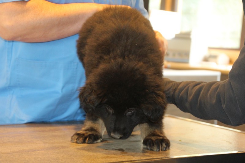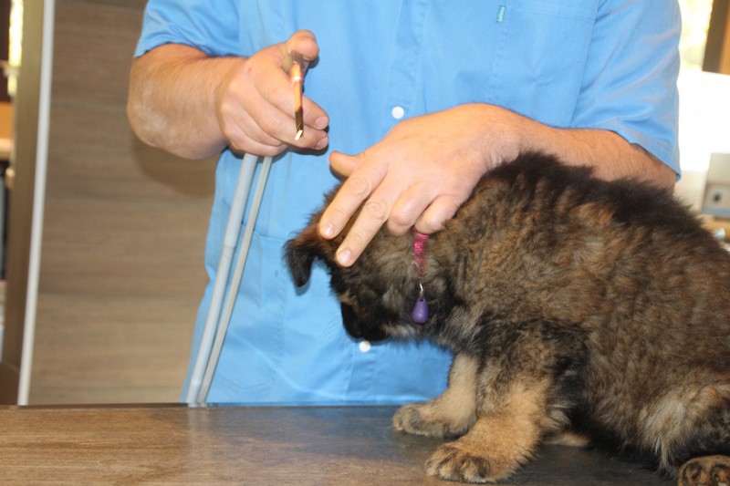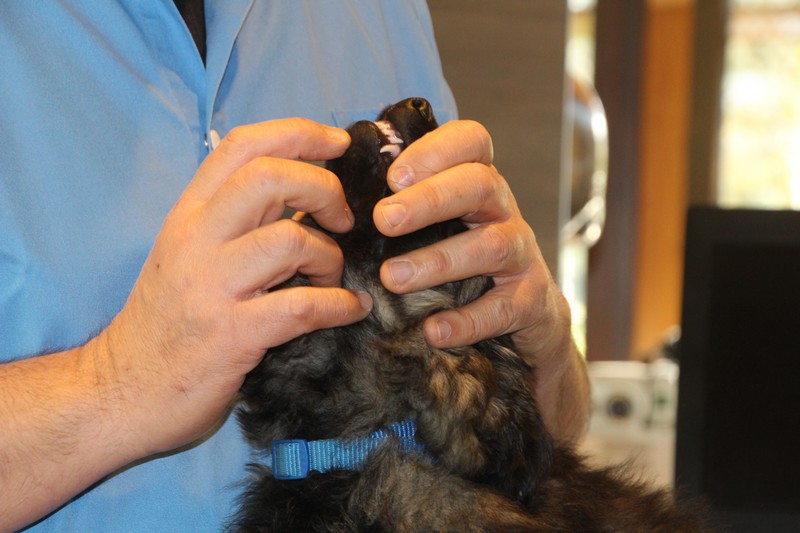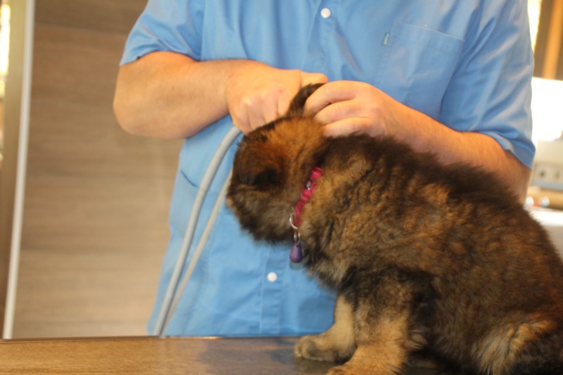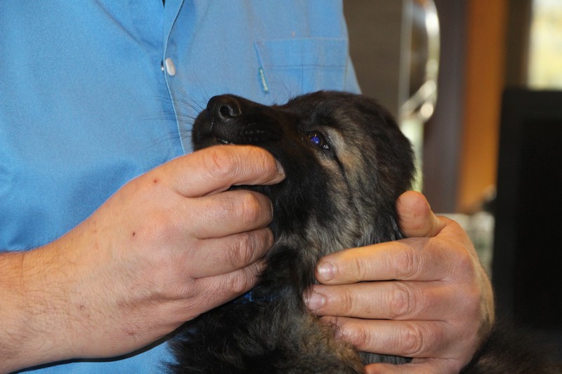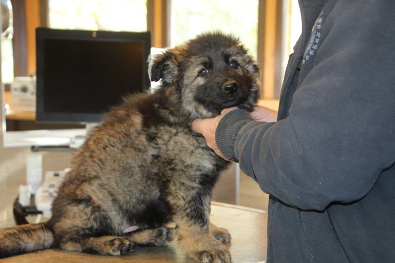 Lundi, nous avons eu notre visite chez le vétérinaire, qui nous a bien regardés de partout, mis une puce et fait des piqures et il a dit: « ils sont parfaits ces petits loups ». Nous avons été très sages, on n’a même pas couiné.
