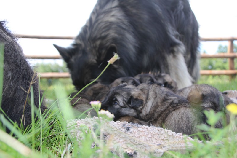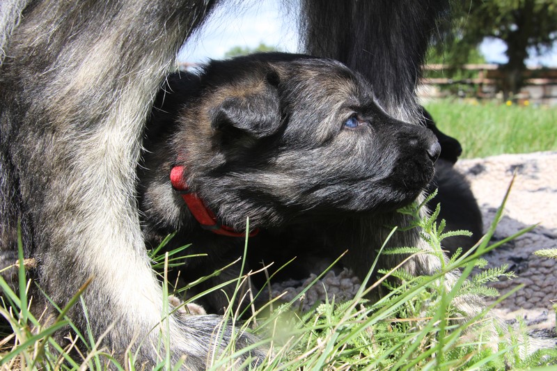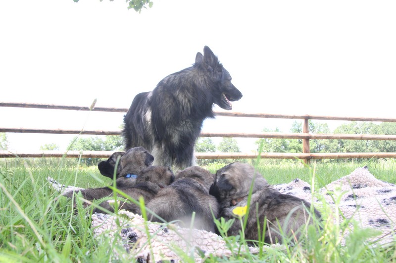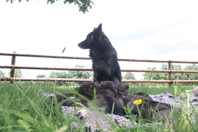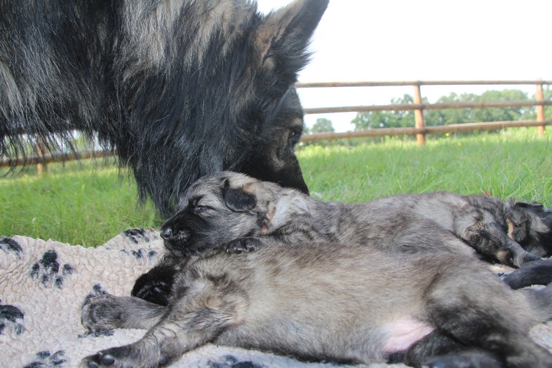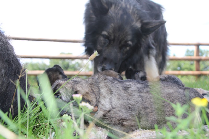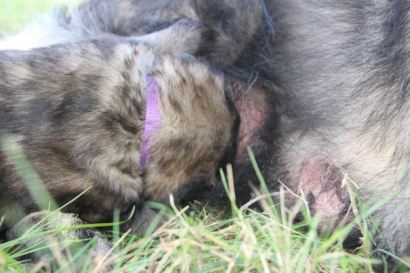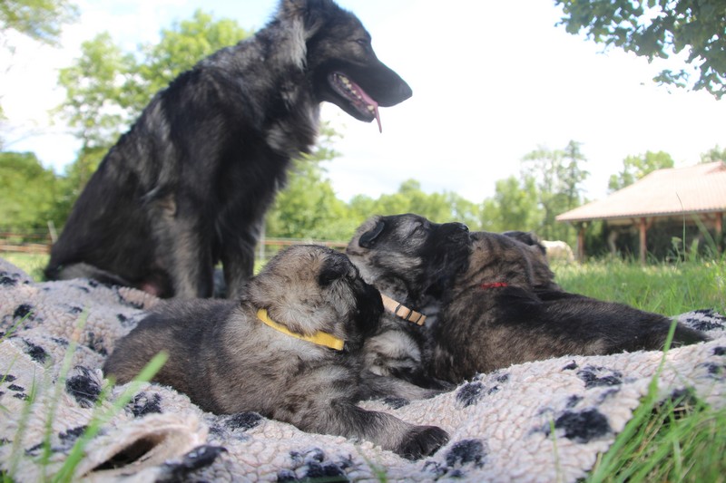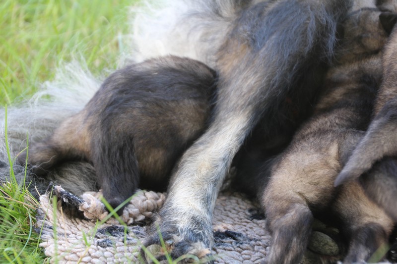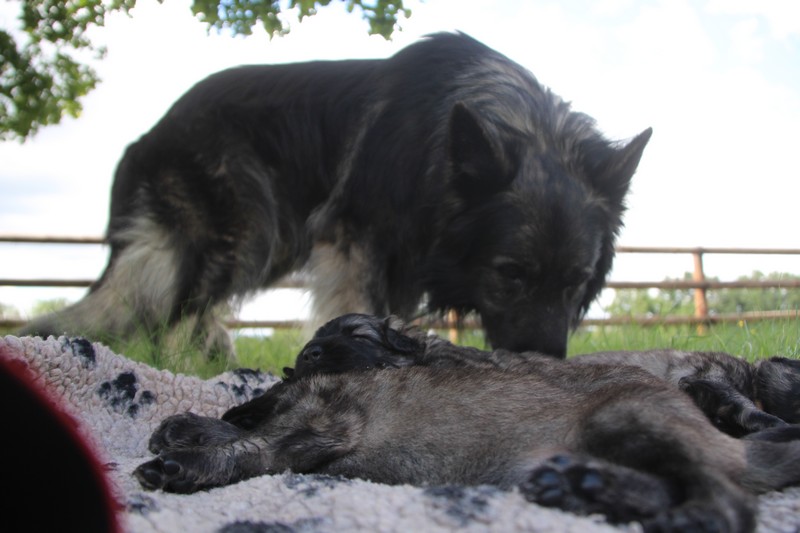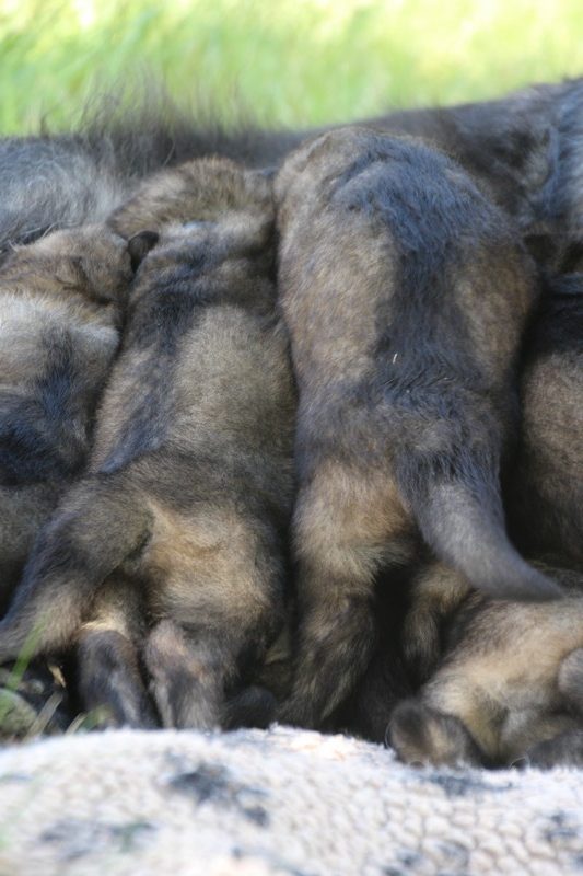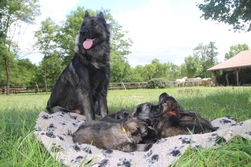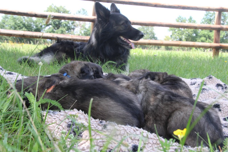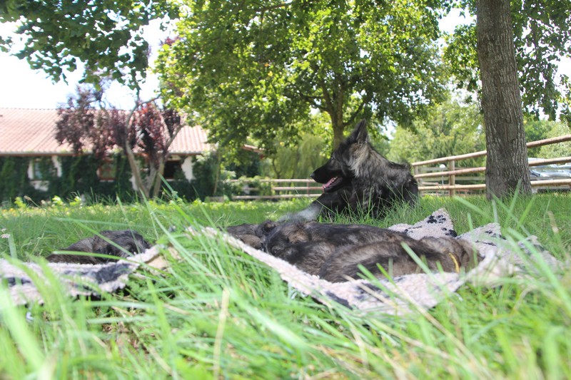 Cela fait 21 jours que nous sommes sortis du ventre de maman et tous nos sens commencent à être en éveils, pour la vue ce n’est pas encore tout à fait cela, mais nous compensons largement avec notre nez. Nous commençons à être déplacés d’un endroit à un autre afin de nous habituer peu à peu à divers environnements, maman est toujours avec nous pour les premières découvertes, c’est bien plus rassurant pour nous. Quelques copains de la meute sont aussi venus nous voir, mais ce n’est pas très drôle, nous avons eu beau chercher, aucun d’entre eux n’ont de lait…