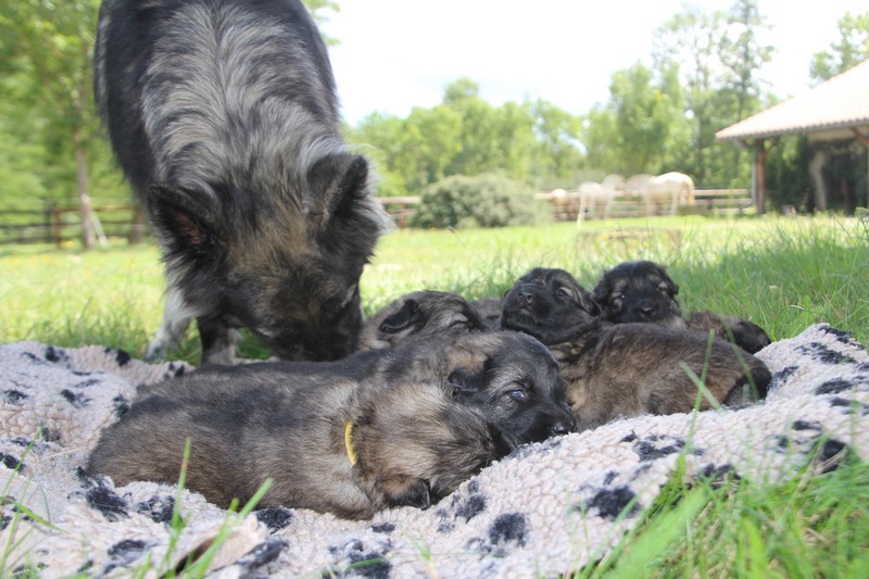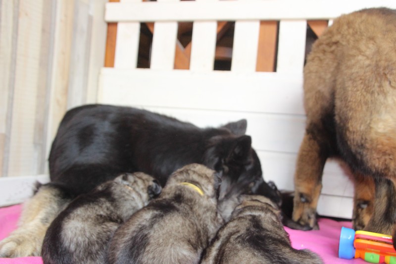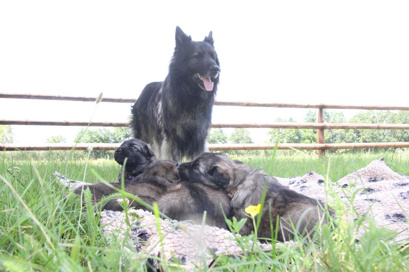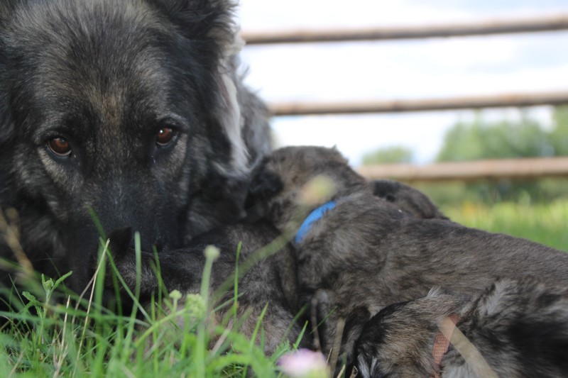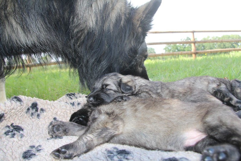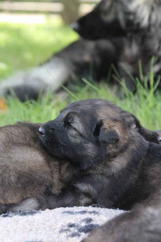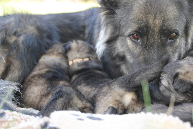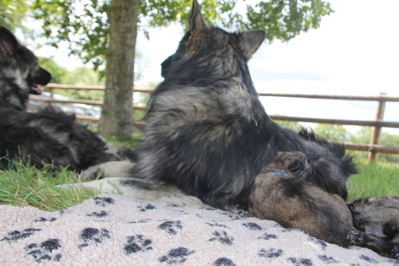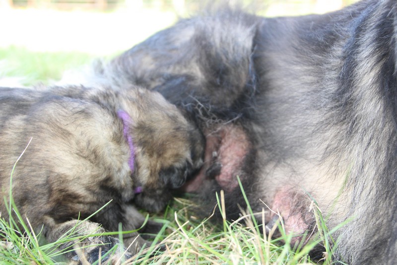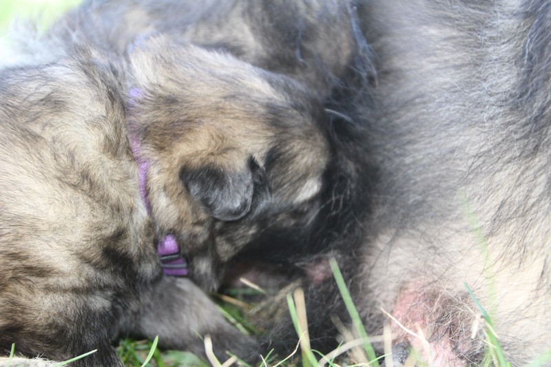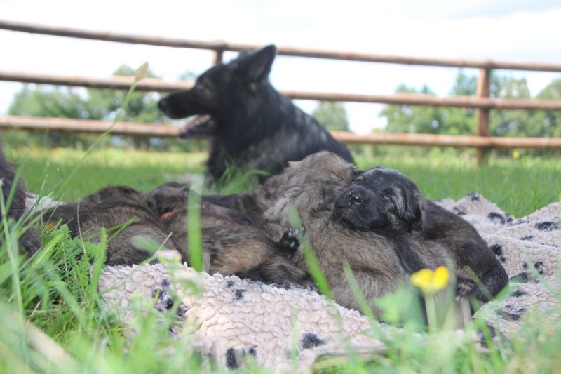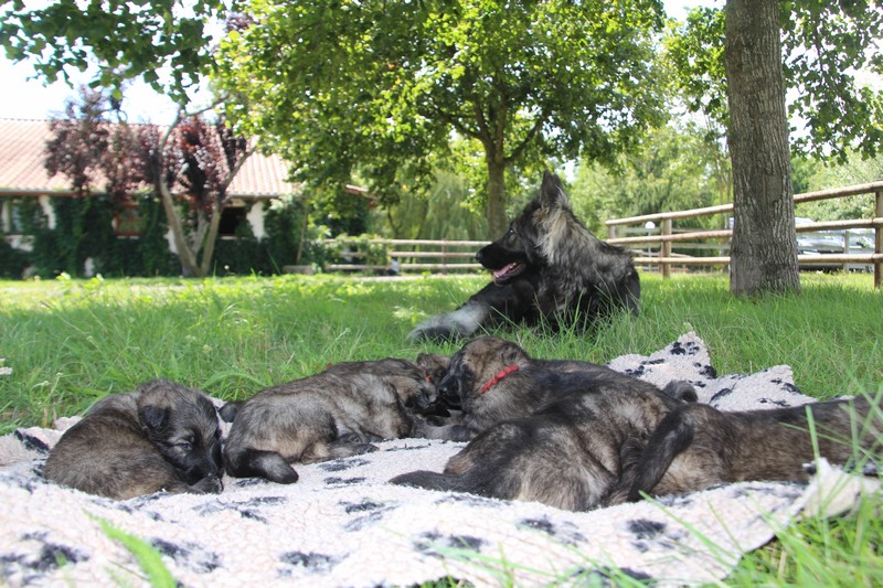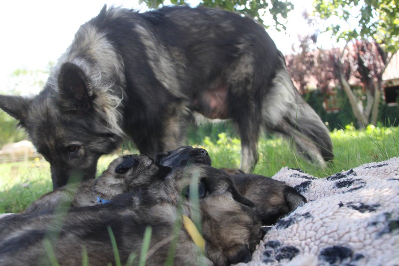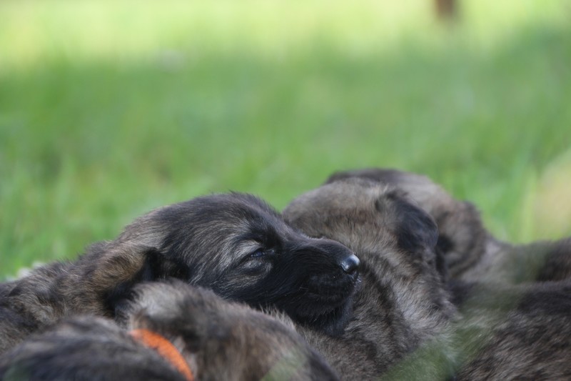 Cela fait 21 jours que nous sommes sortis du ventre de maman et tous nos sens commencent à être en éveils, pour la vue ce n’est pas encore tout à fait cela, mais nous compensons largement avec notre nez. Nous commençons à être déplacés d’un endroit à un autre afin de nous habituer peu à peu à divers environnements, maman est toujours avec nous pour les premières découvertes, c’est bien plus rassurant pour nous. Quelques copains de la meute sont aussi venus nous voir, mais ce n’est pas très drôle, nous avons eu beau chercher, aucun d’entre eux n’ont de lait…