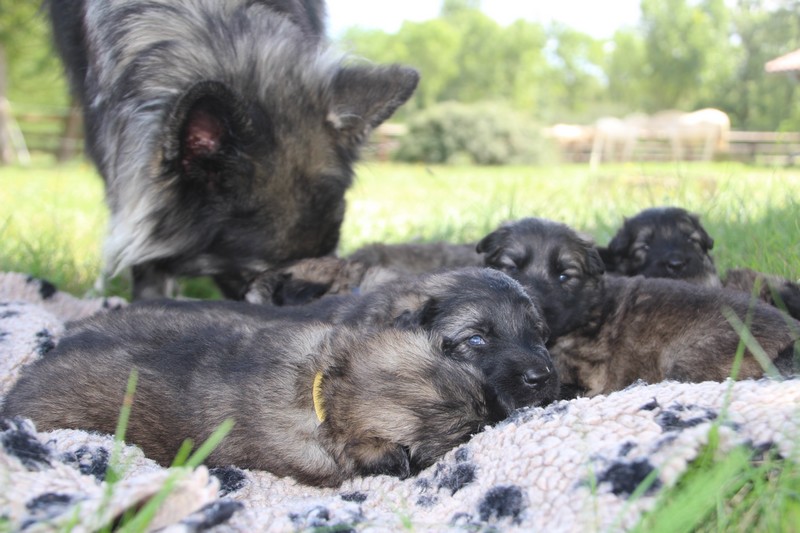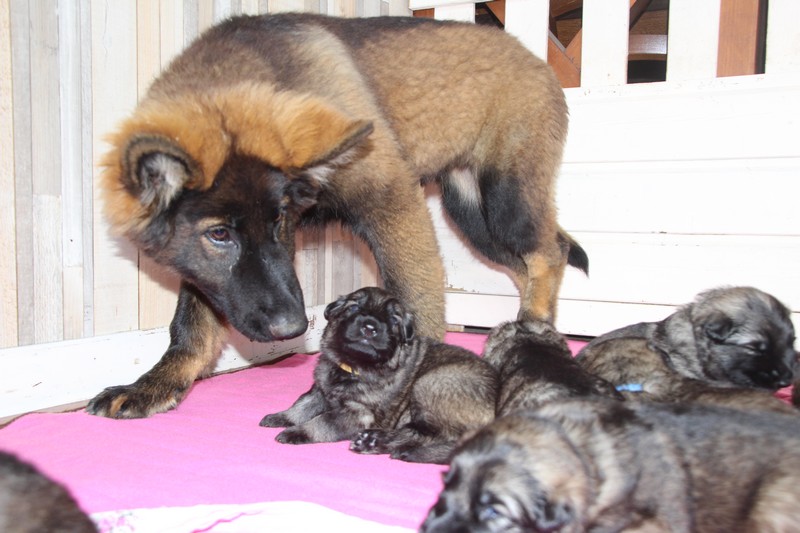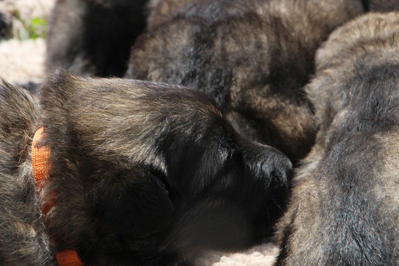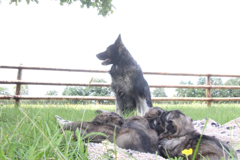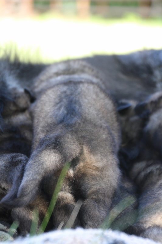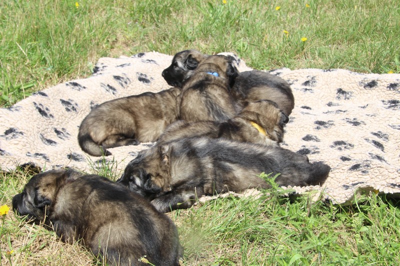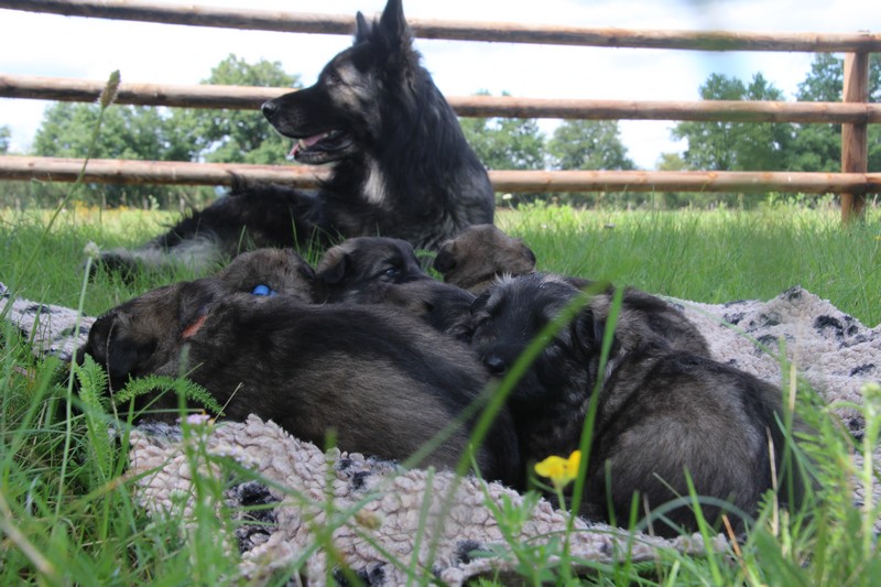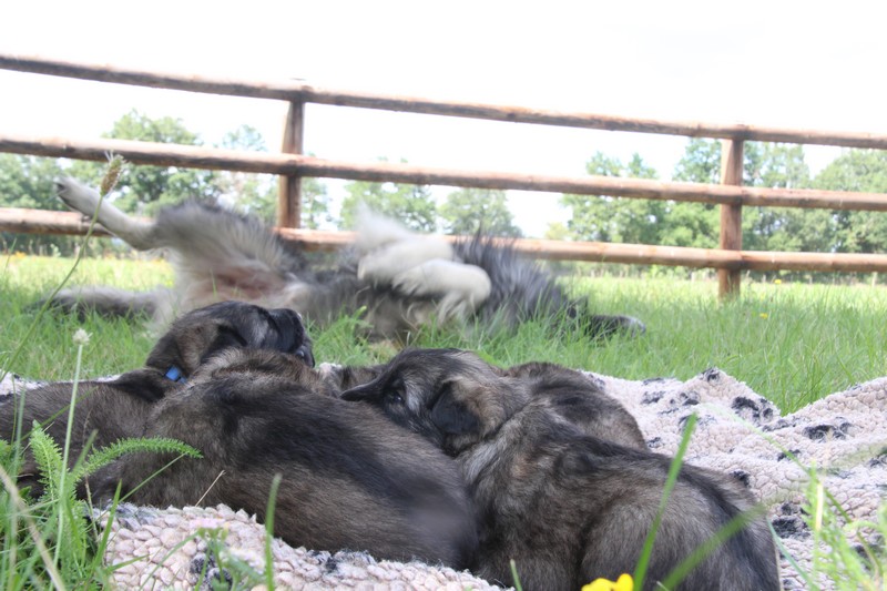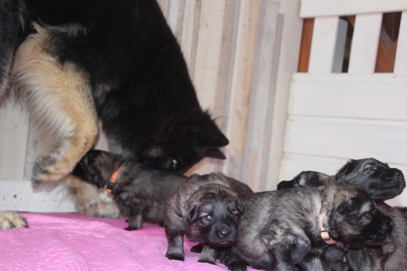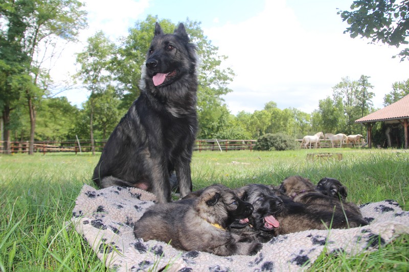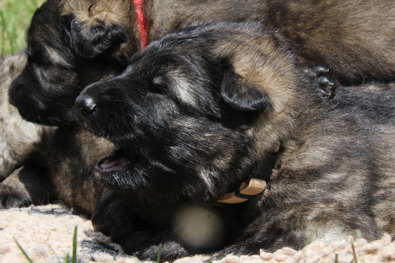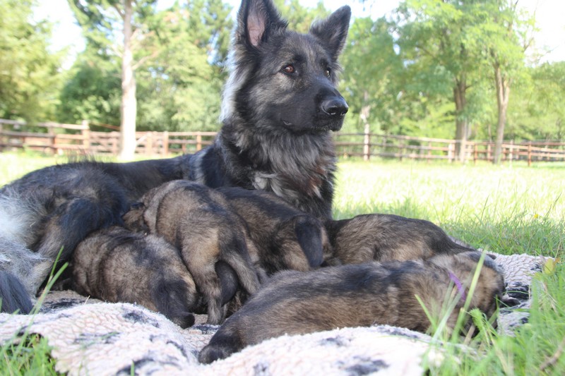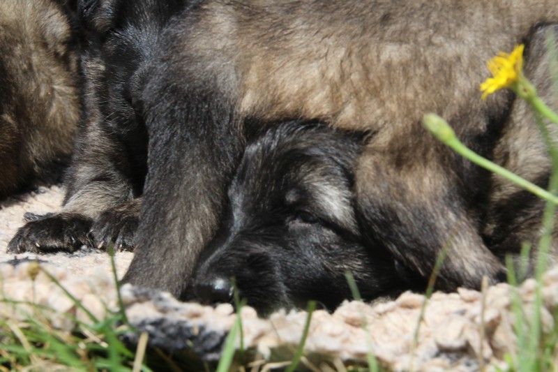 Cela fait 21 jours que nous sommes sortis du ventre de maman et tous nos sens commencent à être en éveils, pour la vue ce n’est pas encore tout à fait cela, mais nous compensons largement avec notre nez. Nous commençons à être déplacés d’un endroit à un autre afin de nous habituer peu à peu à divers environnements, maman est toujours avec nous pour les premières découvertes, c’est bien plus rassurant pour nous. Quelques copains de la meute sont aussi venus nous voir, mais ce n’est pas très drôle, nous avons eu beau chercher, aucun d’entre eux n’ont de lait…