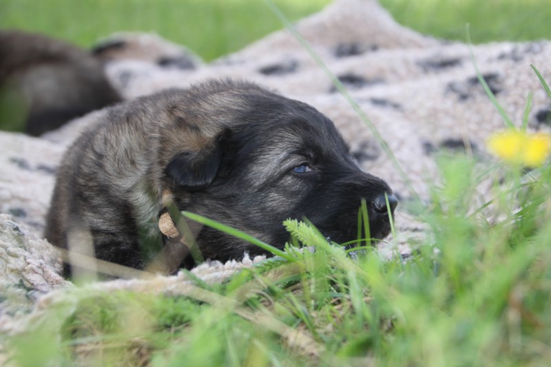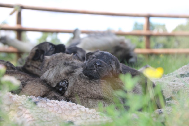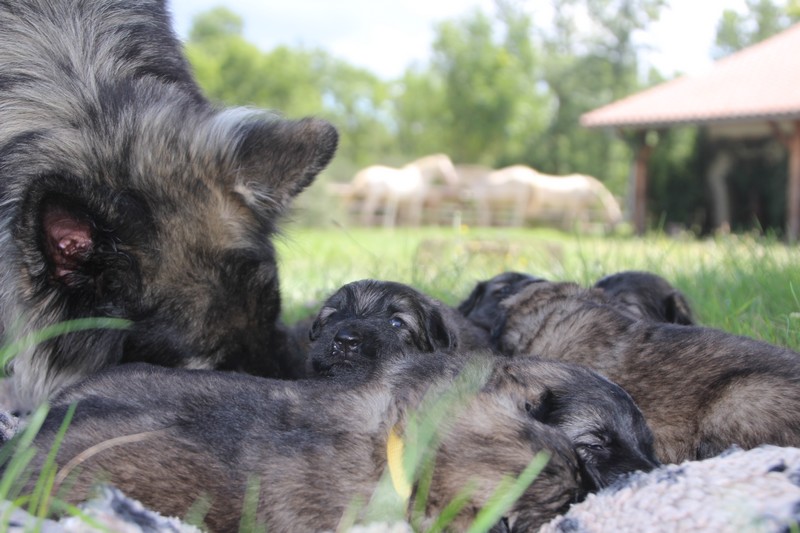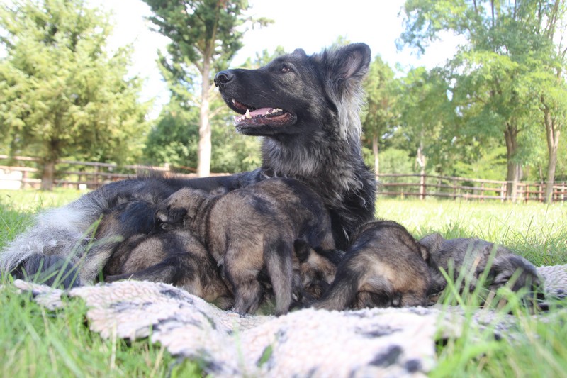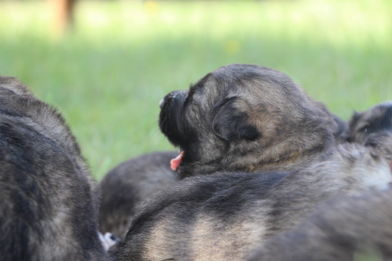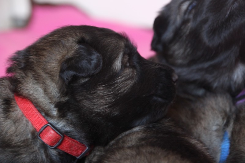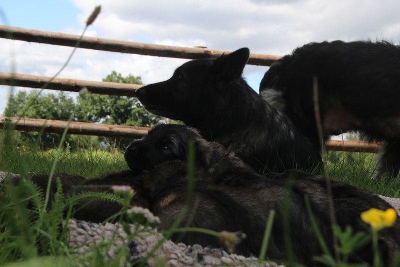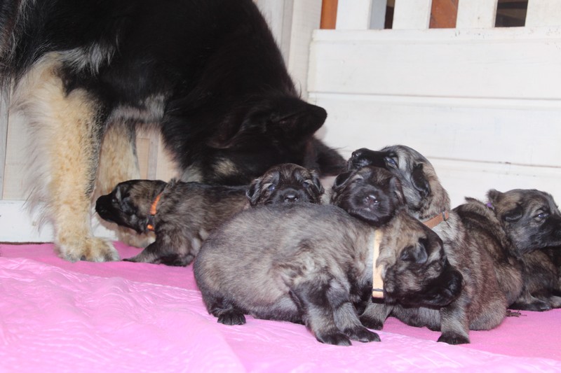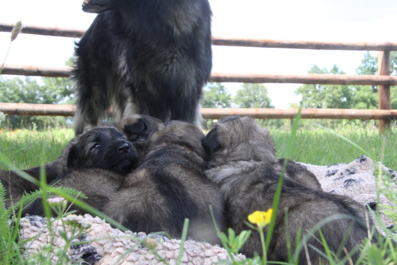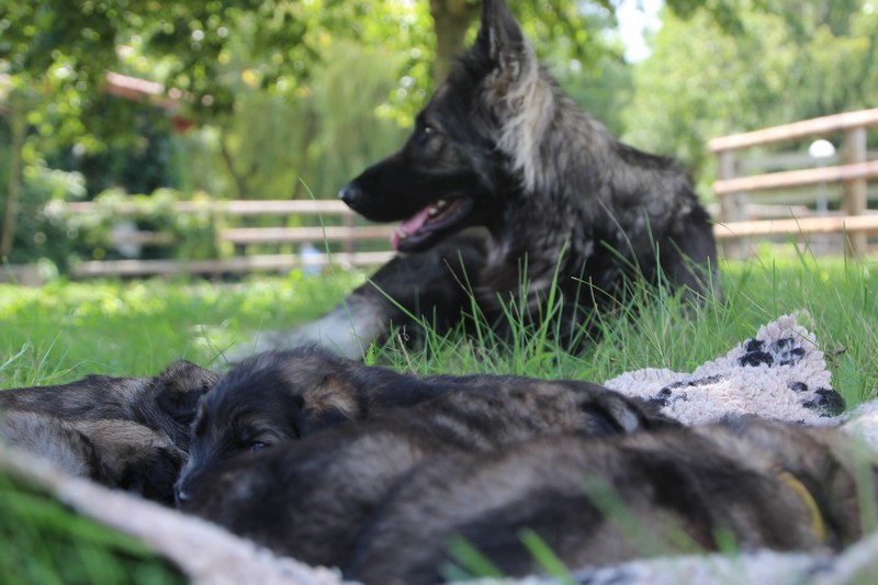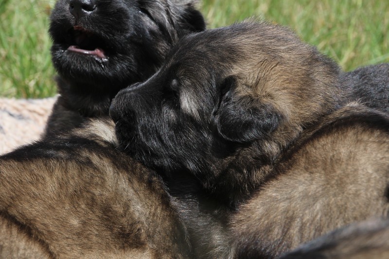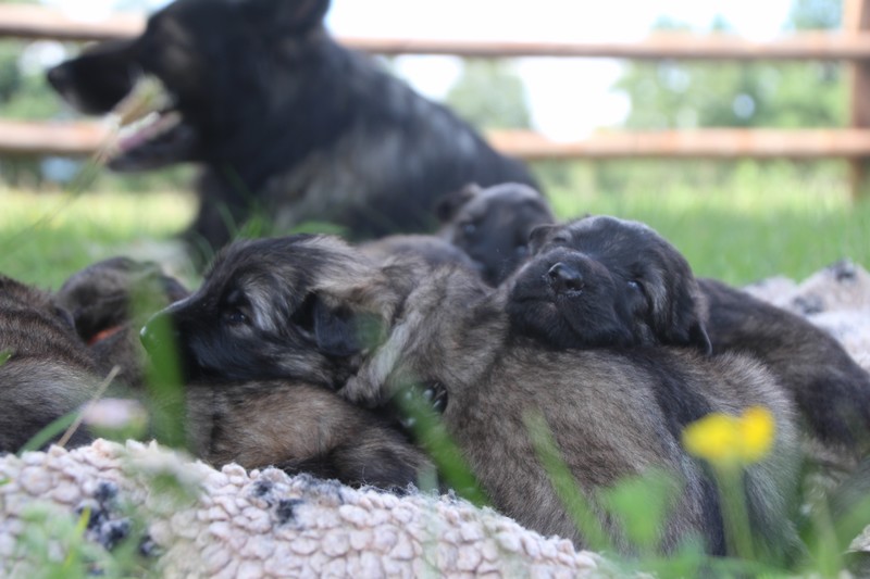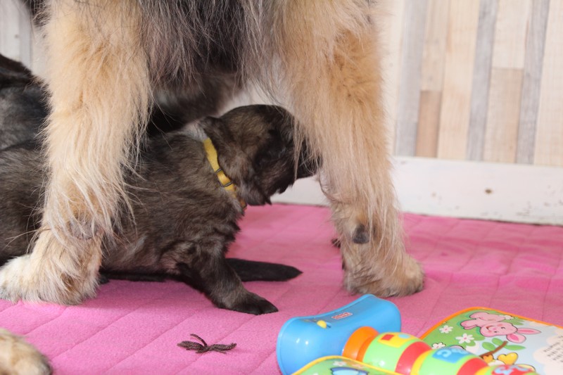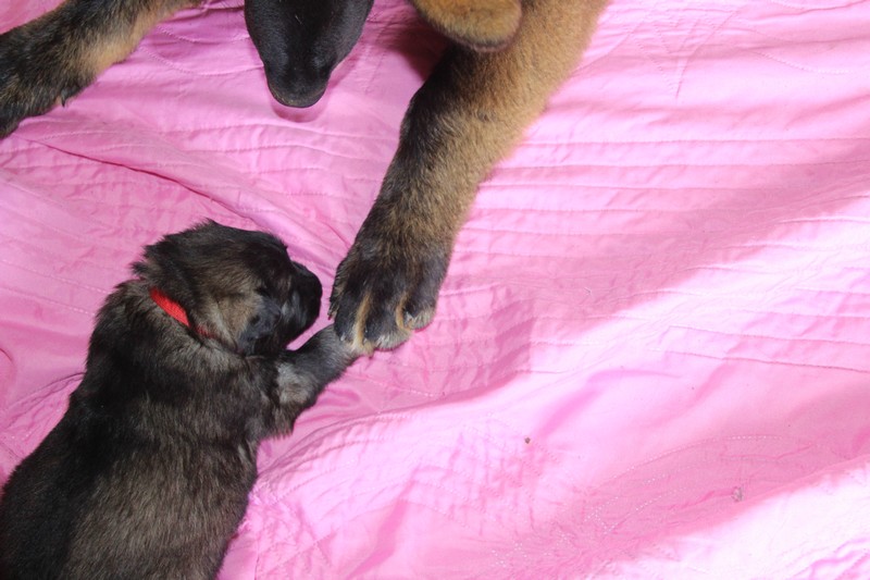 Cela fait 21 jours que nous sommes sortis du ventre de maman et tous nos sens commencent à être en éveils, pour la vue ce n’est pas encore tout à fait cela, mais nous compensons largement avec notre nez. Nous commençons à être déplacés d’un endroit à un autre afin de nous habituer peu à peu à divers environnements, maman est toujours avec nous pour les premières découvertes, c’est bien plus rassurant pour nous. Quelques copains de la meute sont aussi venus nous voir, mais ce n’est pas très drôle, nous avons eu beau chercher, aucun d’entre eux n’ont de lait…