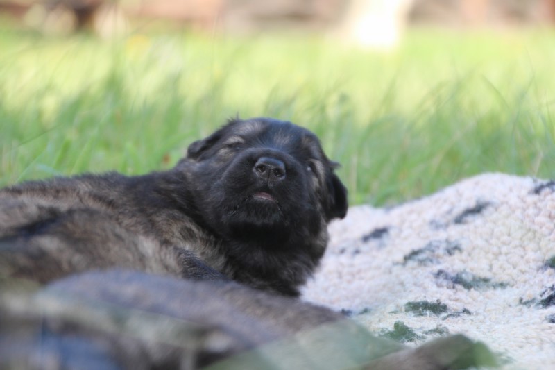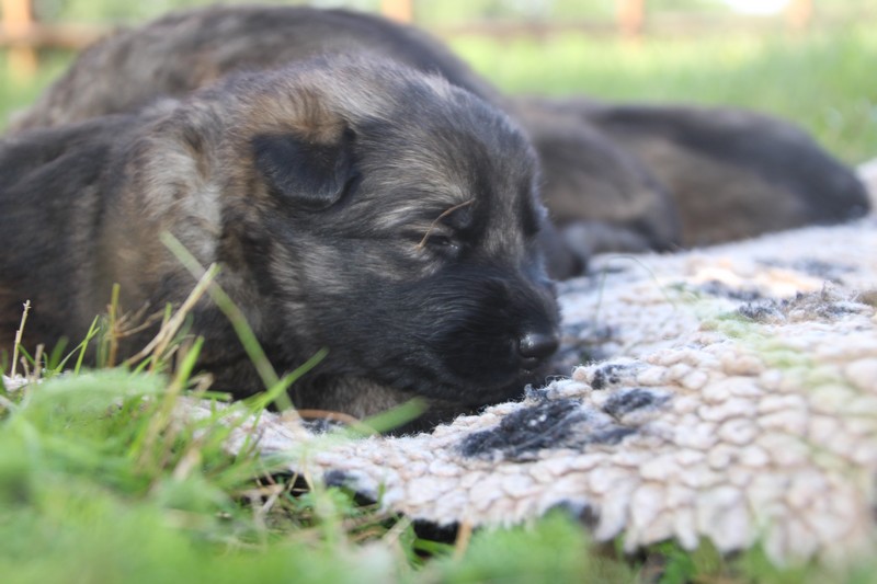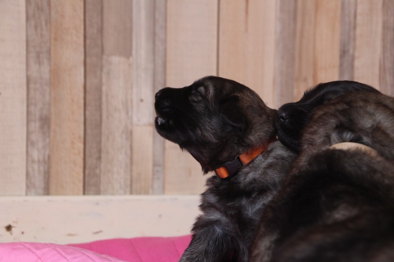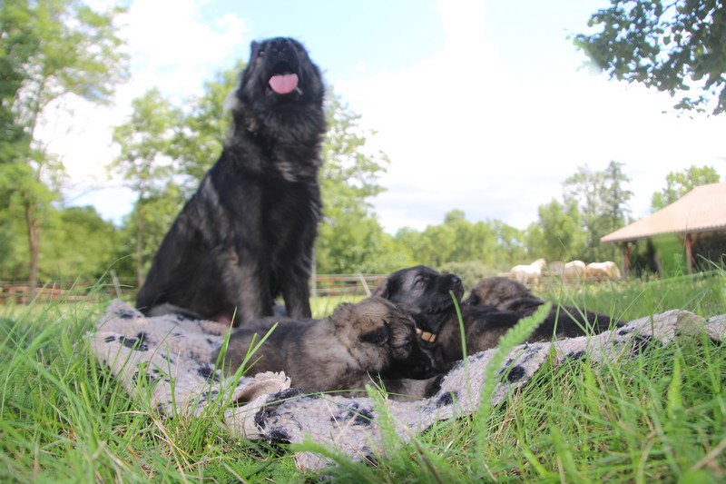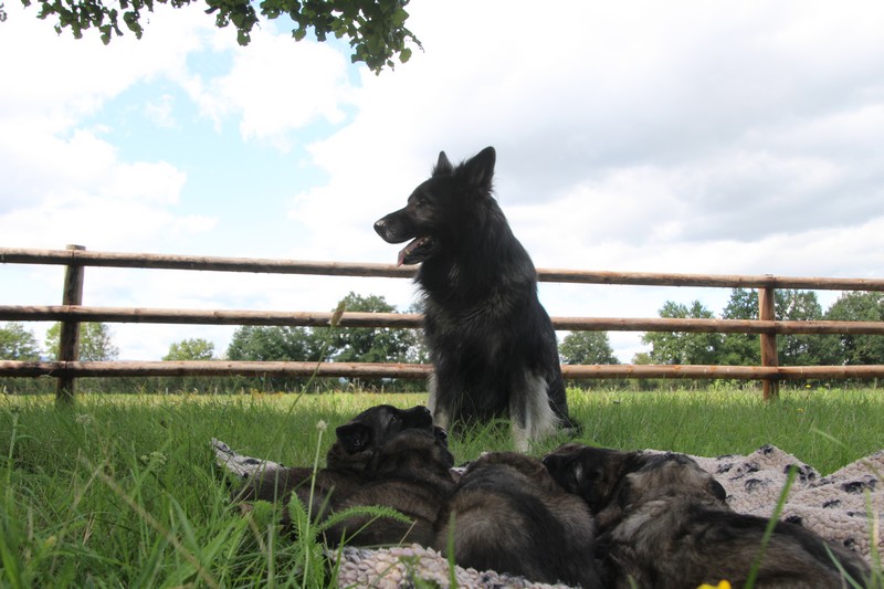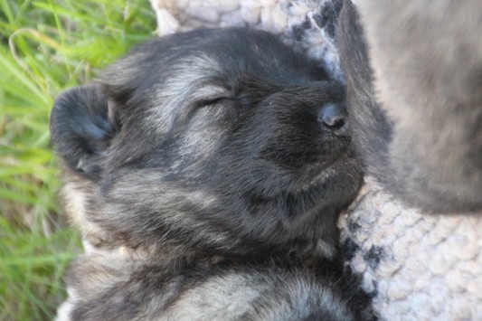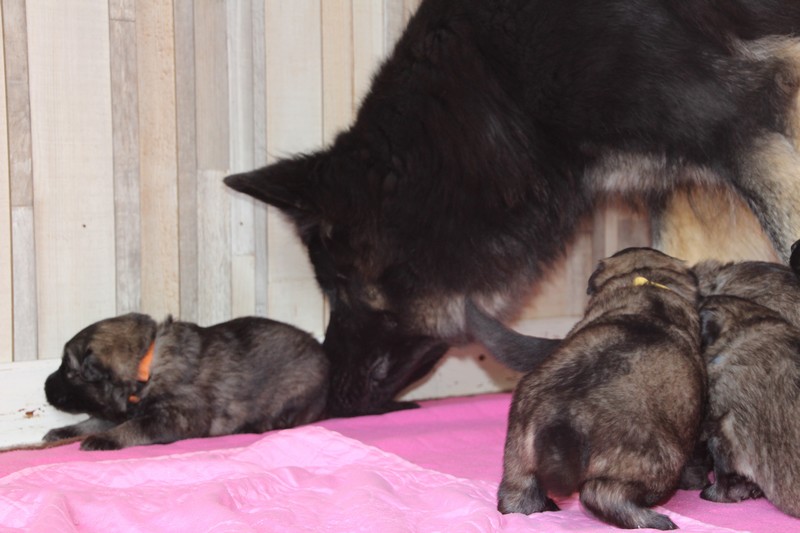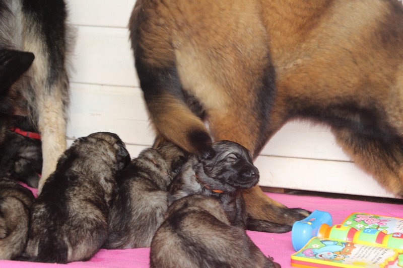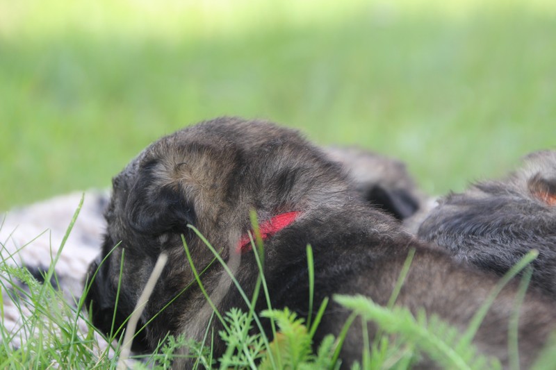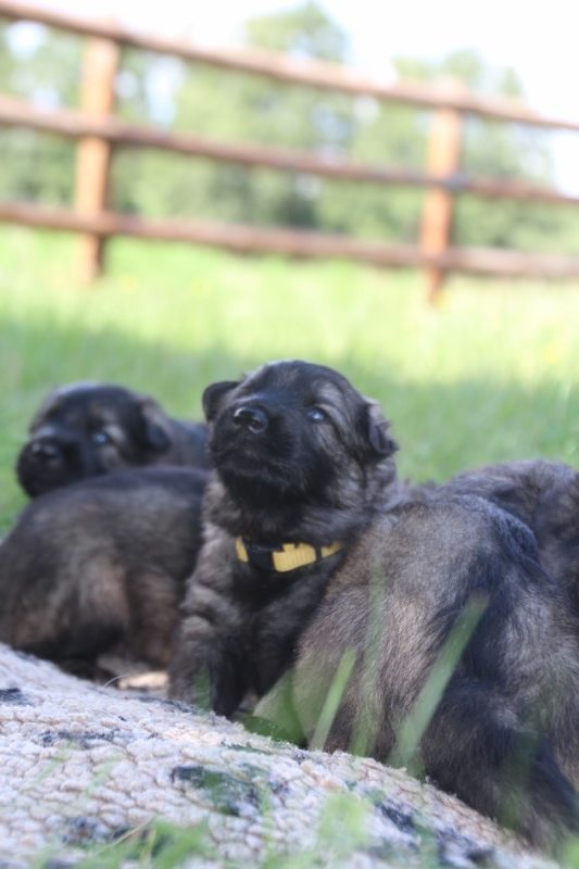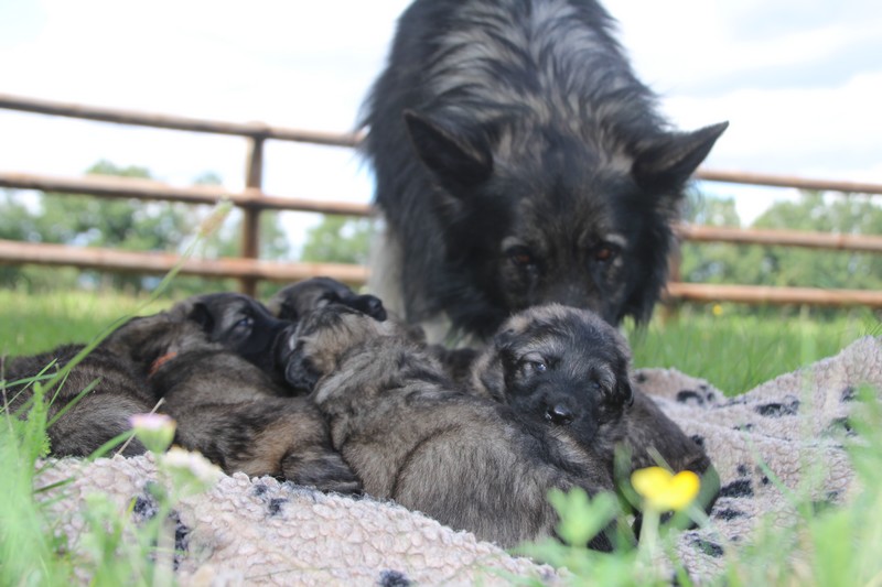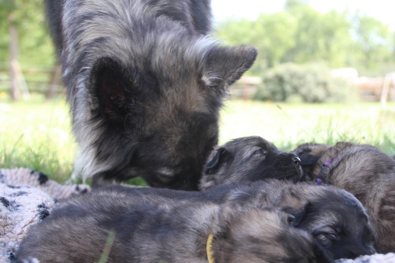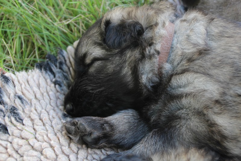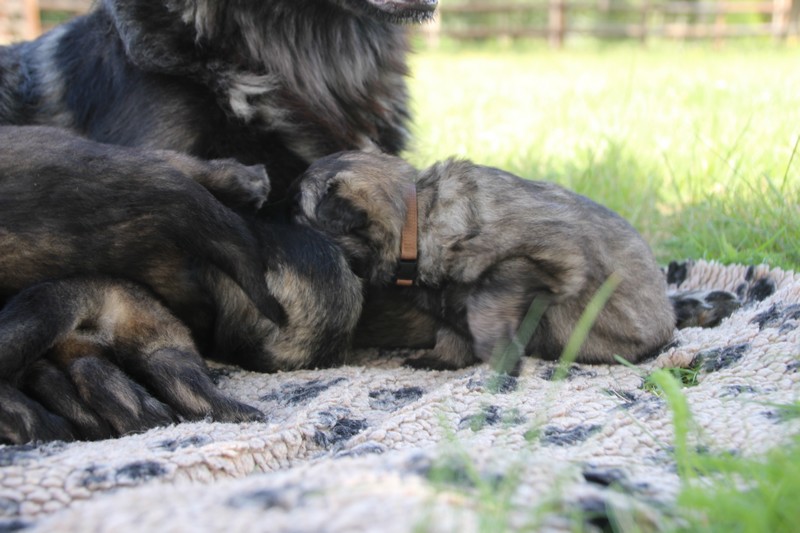 Cela fait 21 jours que nous sommes sortis du ventre de maman et tous nos sens commencent à être en éveils, pour la vue ce n’est pas encore tout à fait cela, mais nous compensons largement avec notre nez. Nous commençons à être déplacés d’un endroit à un autre afin de nous habituer peu à peu à divers environnements, maman est toujours avec nous pour les premières découvertes, c’est bien plus rassurant pour nous. Quelques copains de la meute sont aussi venus nous voir, mais ce n’est pas très drôle, nous avons eu beau chercher, aucun d’entre eux n’ont de lait…