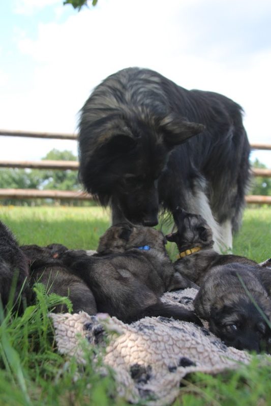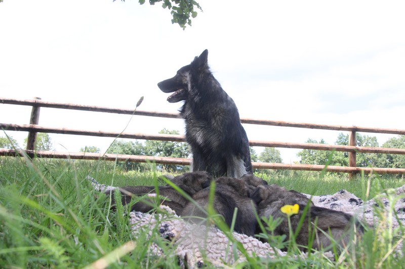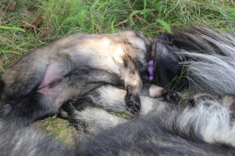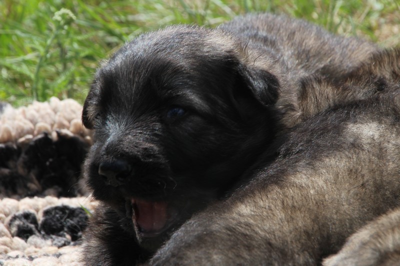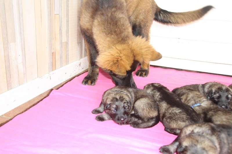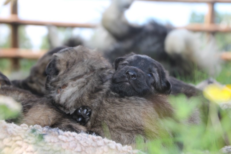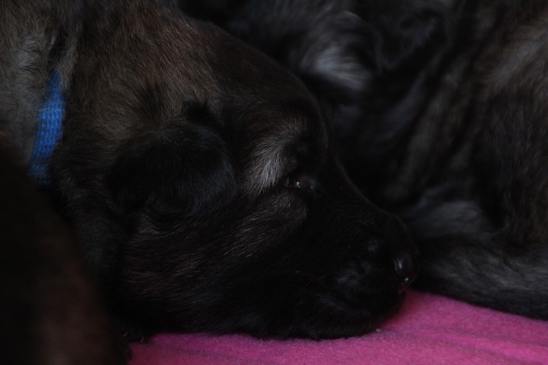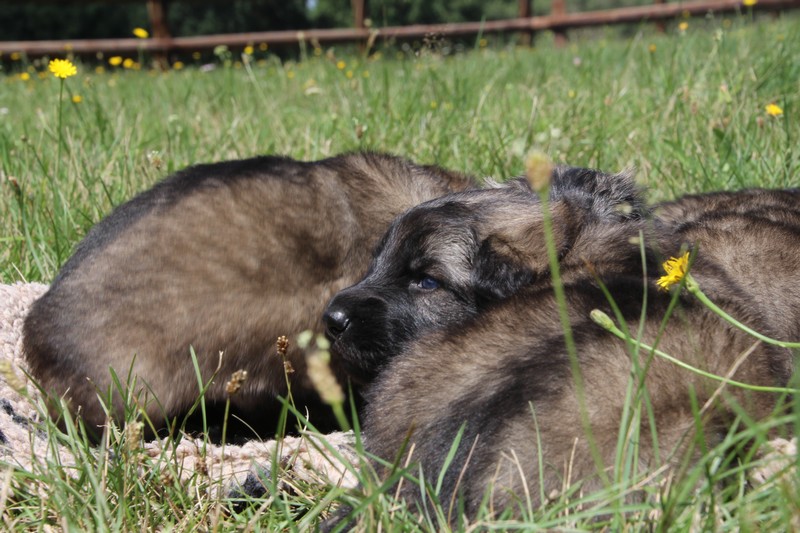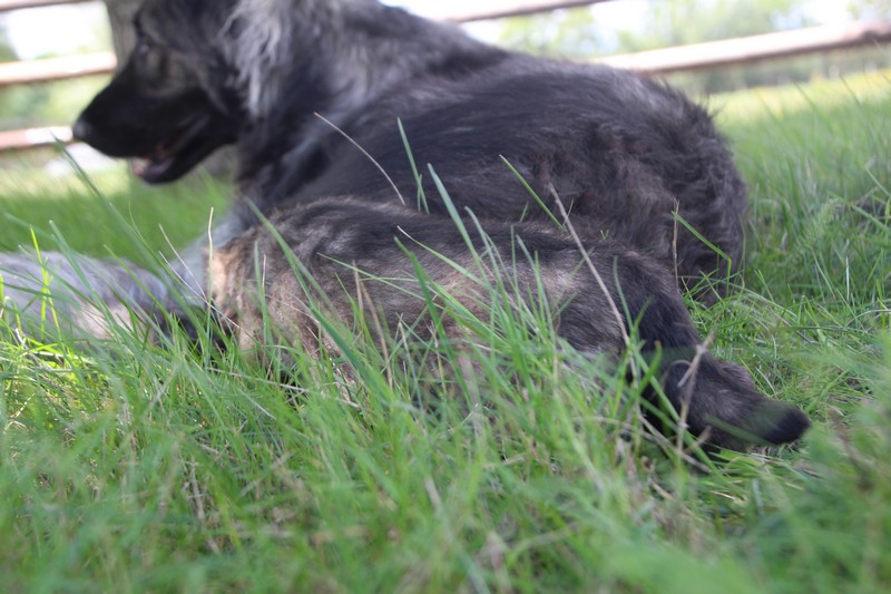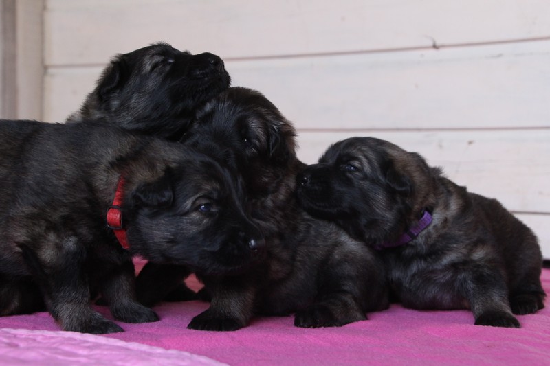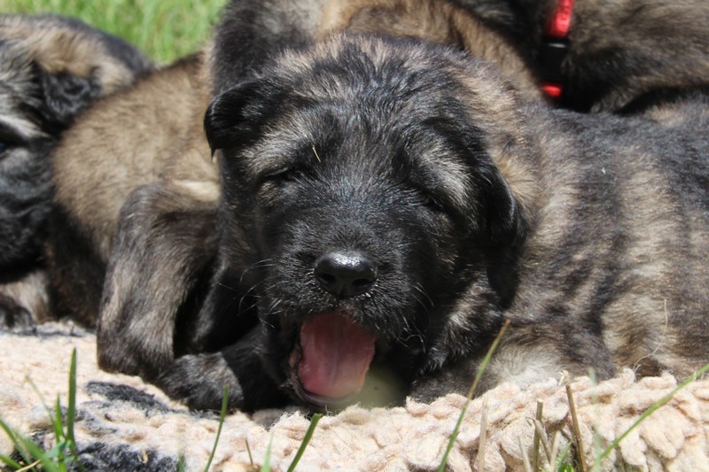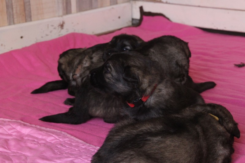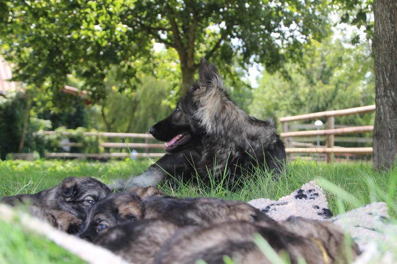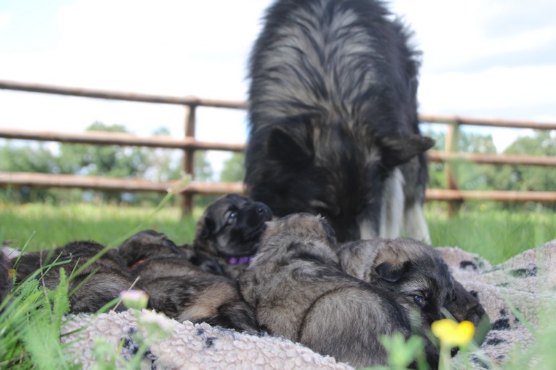 Cela fait 21 jours que nous sommes sortis du ventre de maman et tous nos sens commencent à être en éveils, pour la vue ce n’est pas encore tout à fait cela, mais nous compensons largement avec notre nez. Nous commençons à être déplacés d’un endroit à un autre afin de nous habituer peu à peu à divers environnements, maman est toujours avec nous pour les premières découvertes, c’est bien plus rassurant pour nous. Quelques copains de la meute sont aussi venus nous voir, mais ce n’est pas très drôle, nous avons eu beau chercher, aucun d’entre eux n’ont de lait…