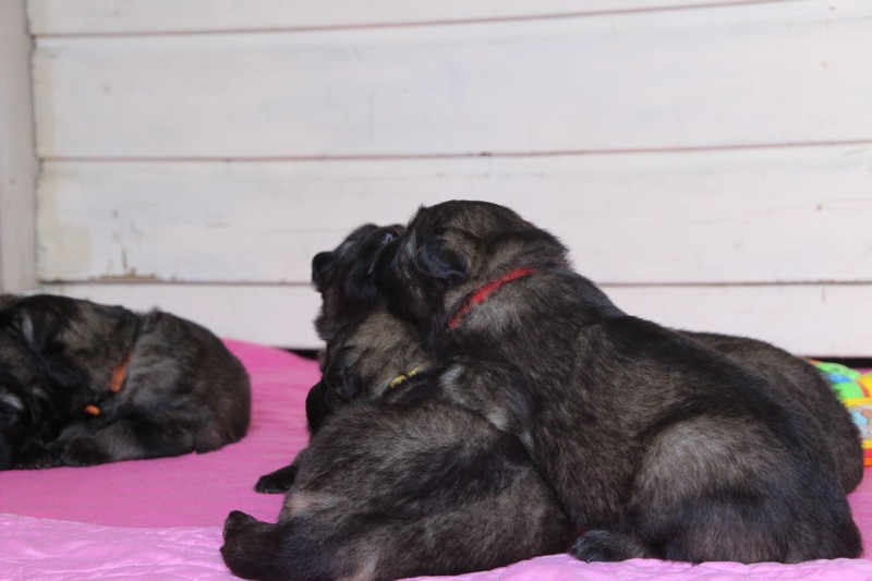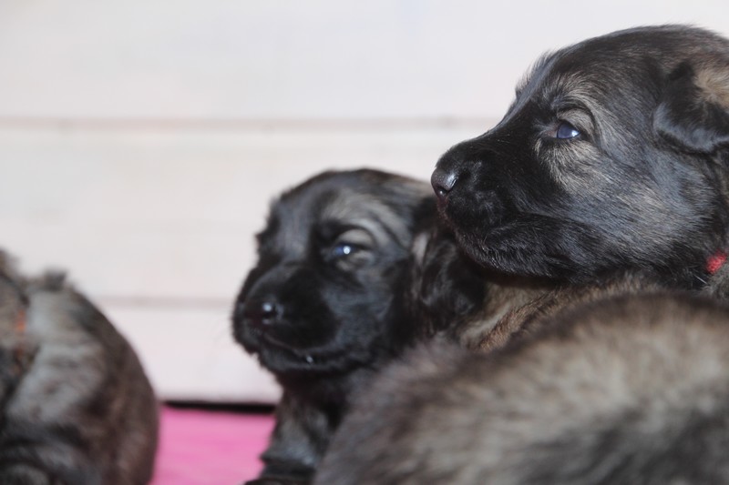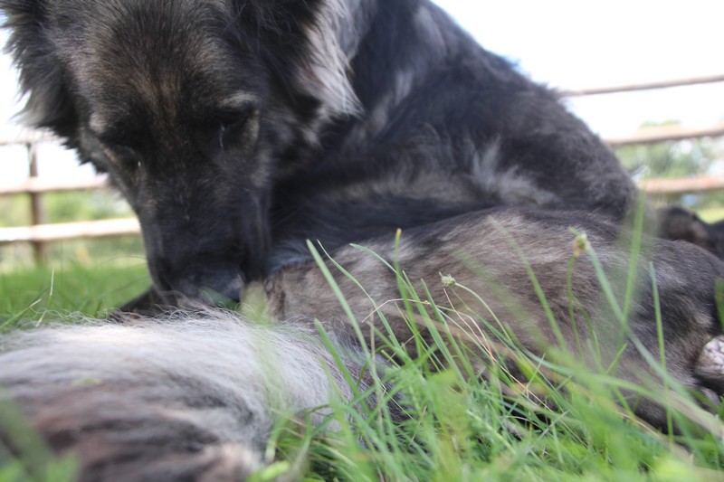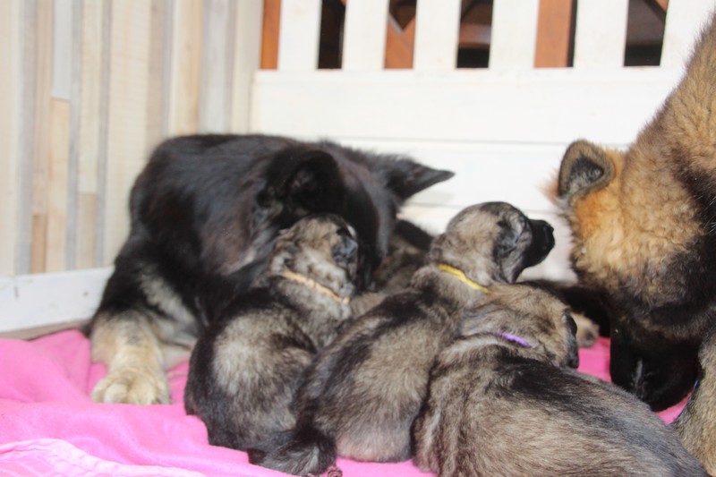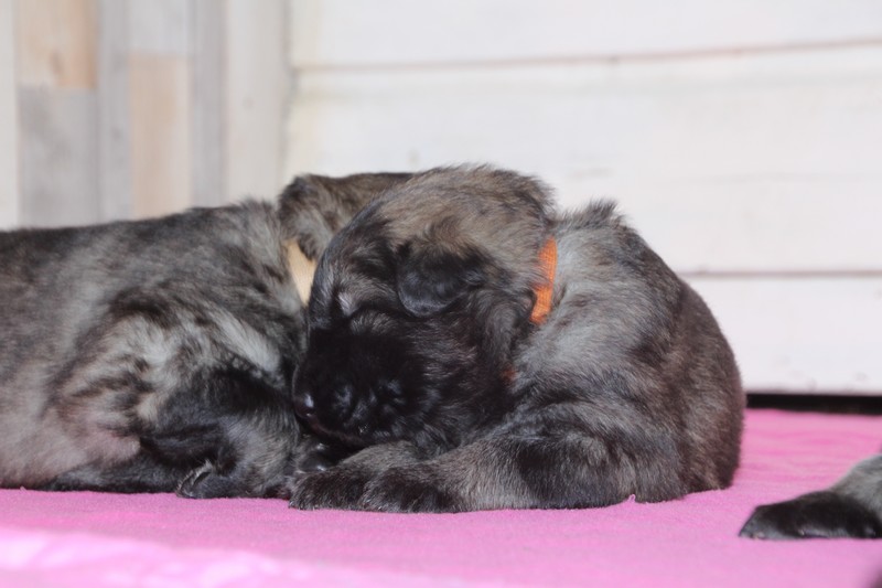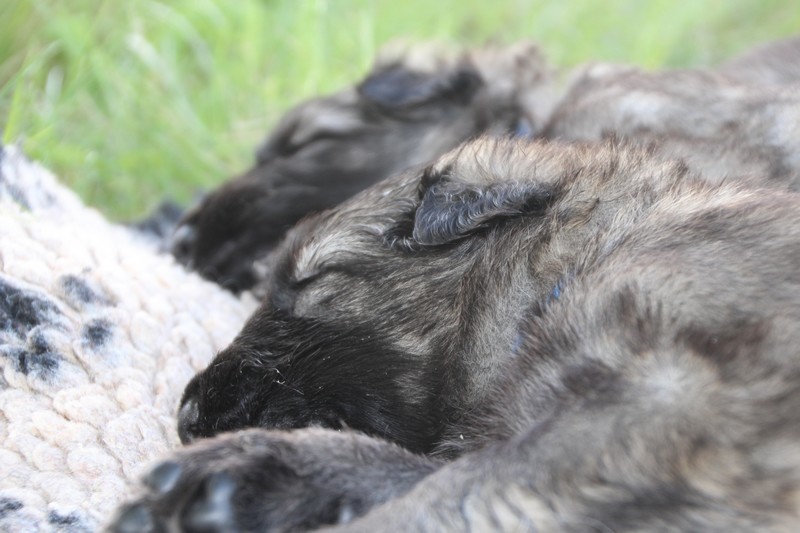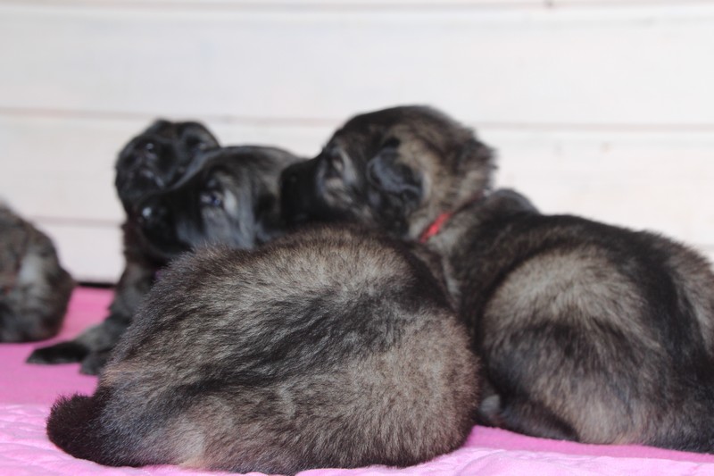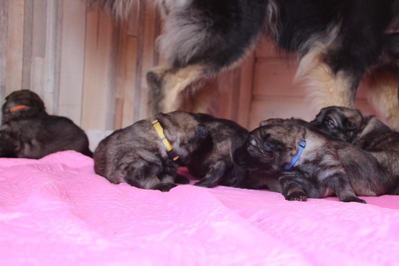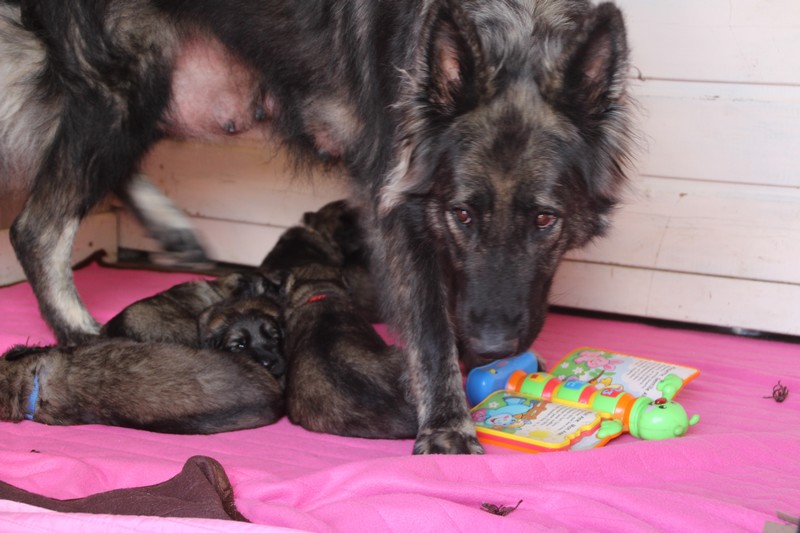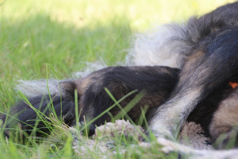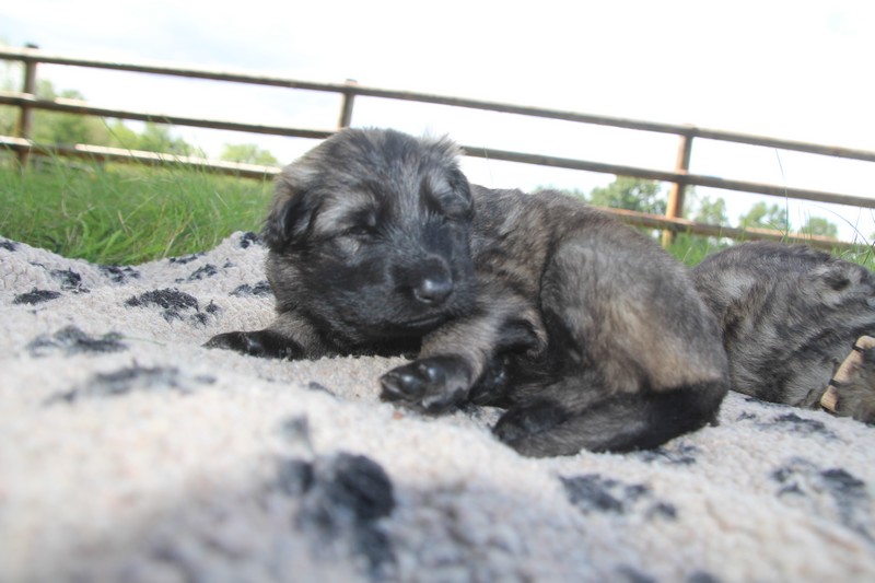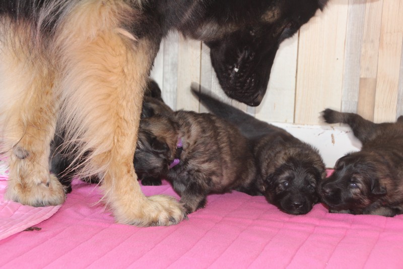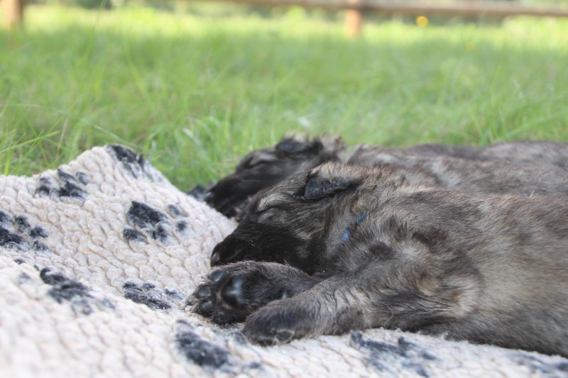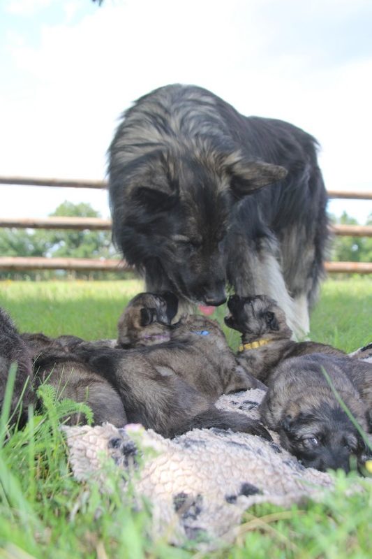 Cela fait 21 jours que nous sommes sortis du ventre de maman et tous nos sens commencent à être en éveils, pour la vue ce n’est pas encore tout à fait cela, mais nous compensons largement avec notre nez. Nous commençons à être déplacés d’un endroit à un autre afin de nous habituer peu à peu à divers environnements, maman est toujours avec nous pour les premières découvertes, c’est bien plus rassurant pour nous. Quelques copains de la meute sont aussi venus nous voir, mais ce n’est pas très drôle, nous avons eu beau chercher, aucun d’entre eux n’ont de lait…