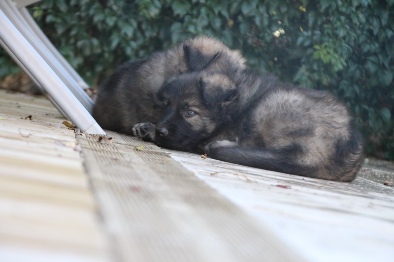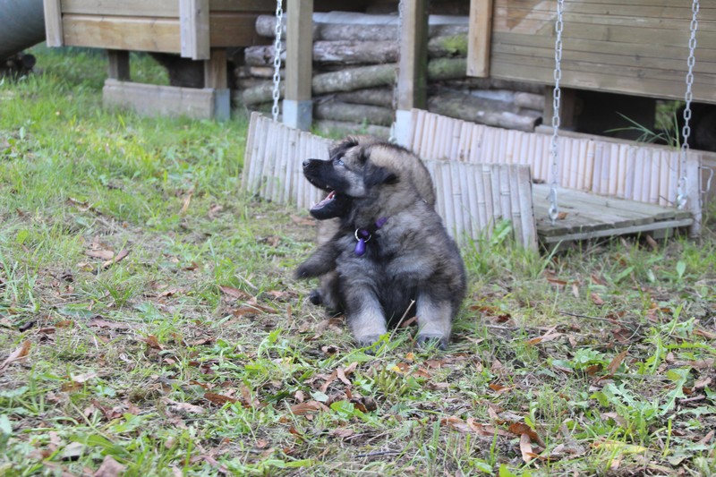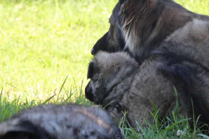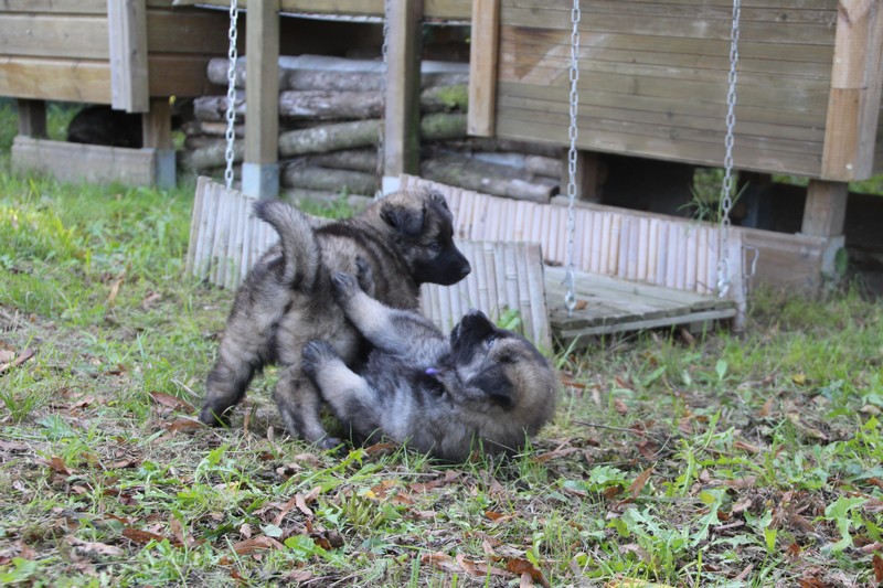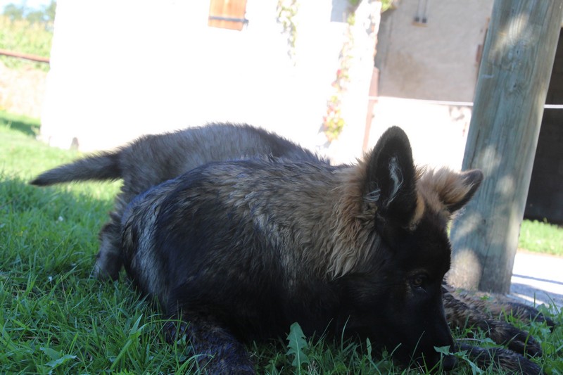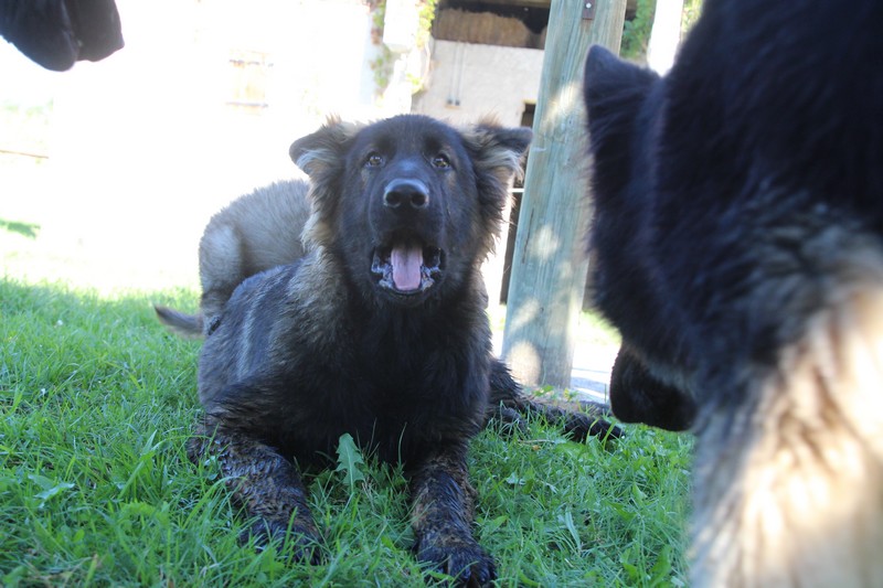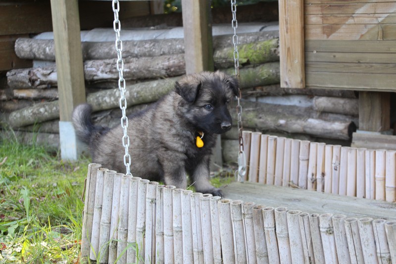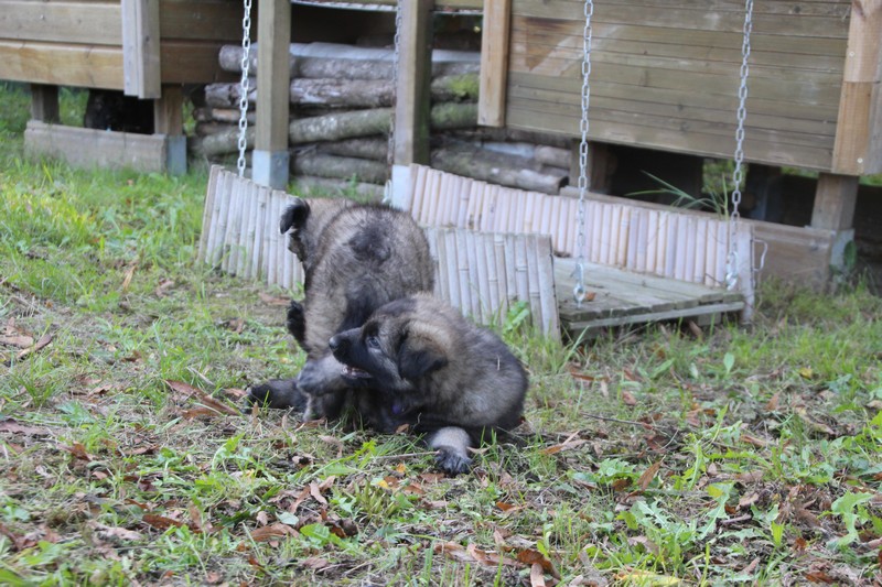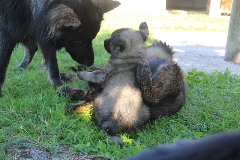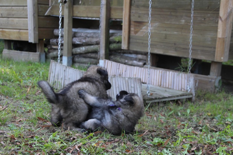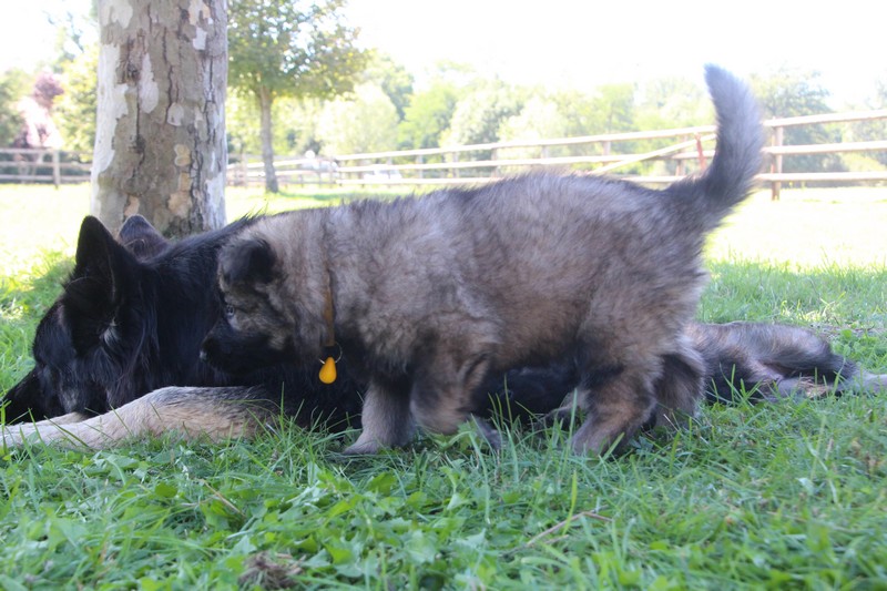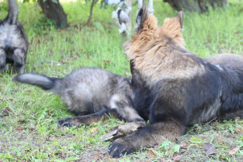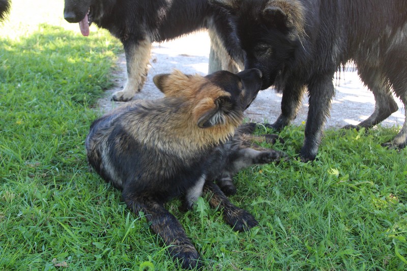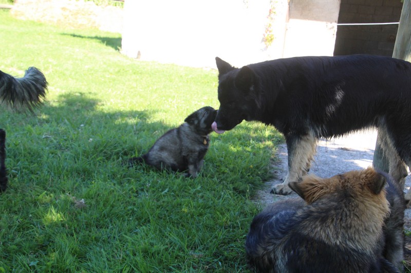 Maman nous a appris à creuser et l’on a vite compris le principe, nous avons eu également la visite de Kwando, un chien qui ne fait pas partie de la meute, un vieux copain de papa. Nous avons testé les divers agrès, mais notre coin préféré reste le tunnel ou nous nous entassons bien au chaud pour dormir.