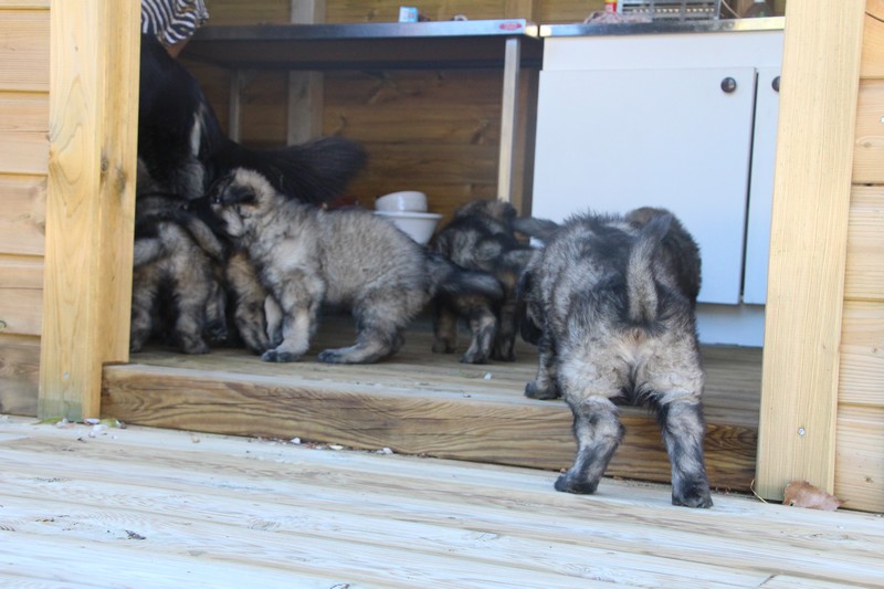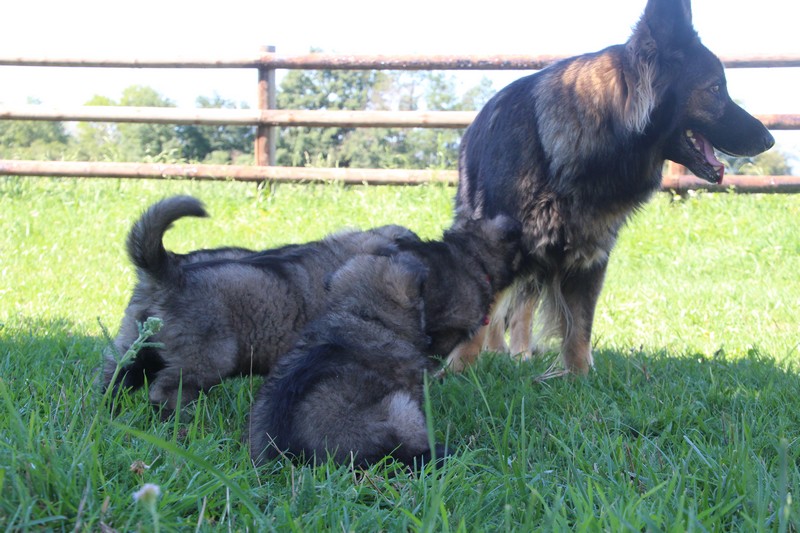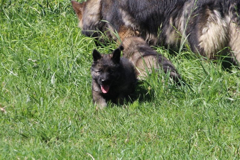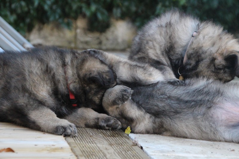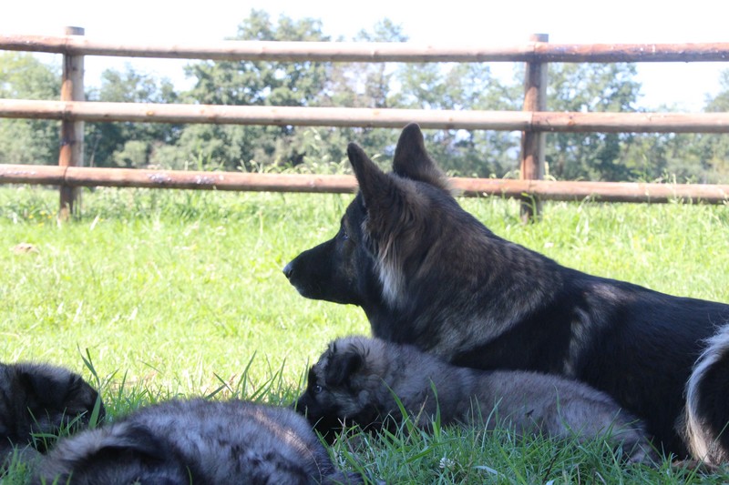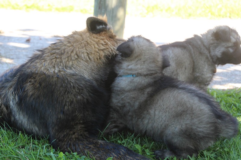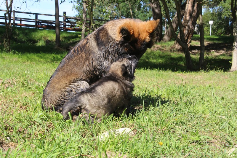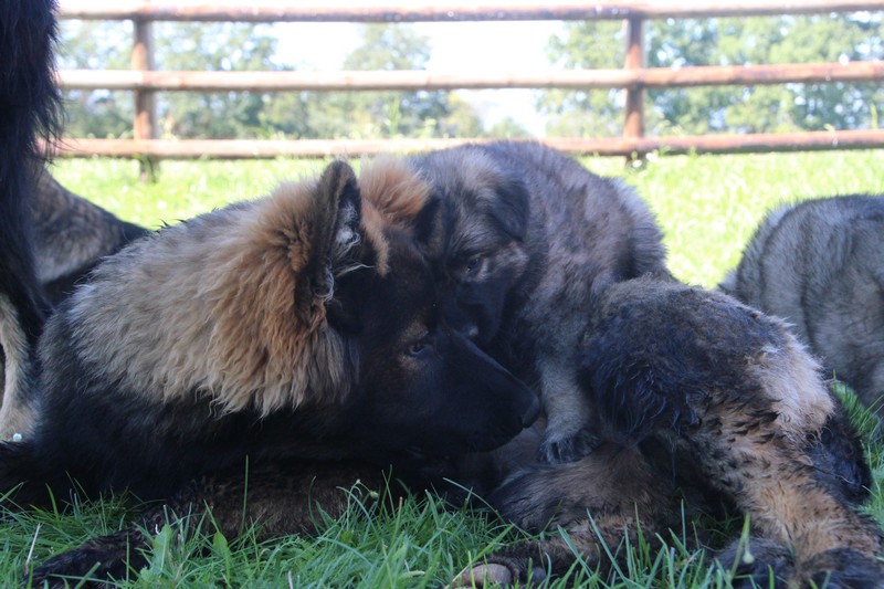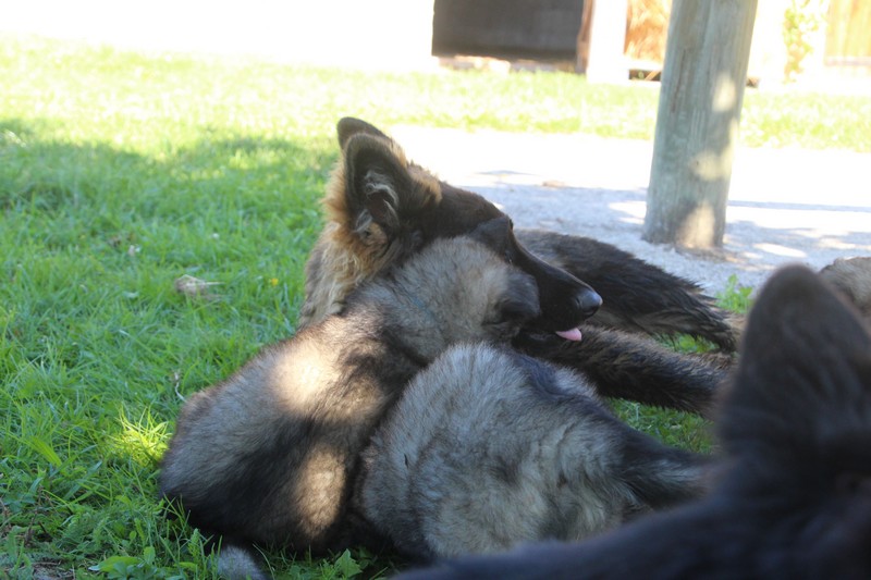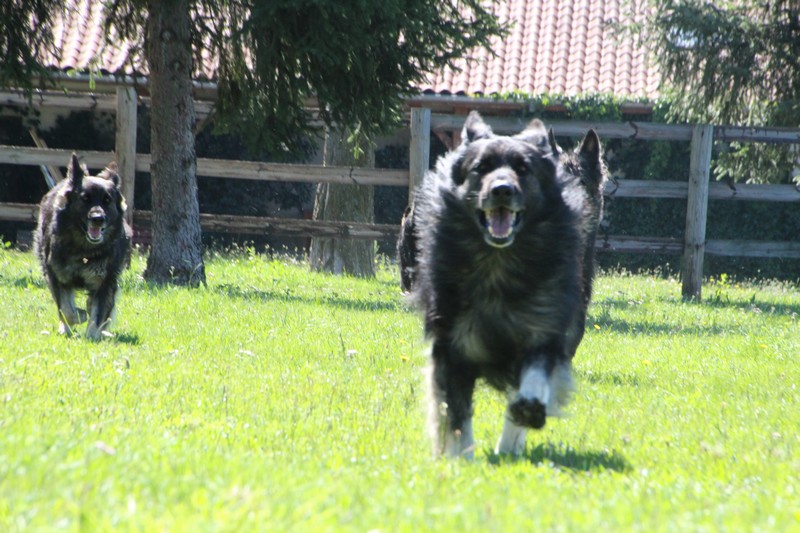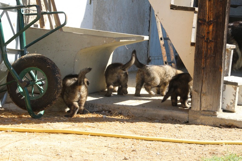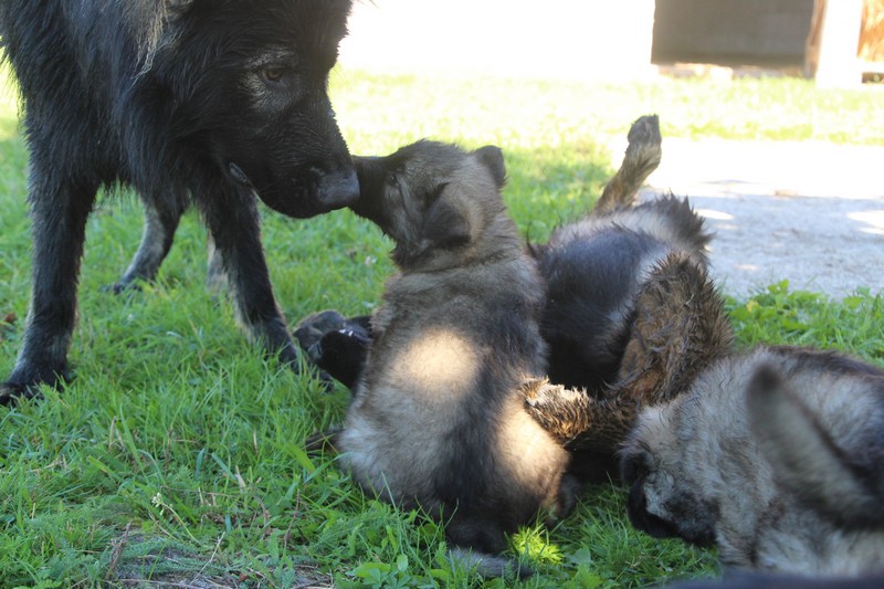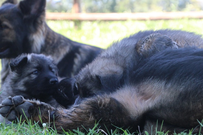 Maman nous a appris à creuser et l’on a vite compris le principe, nous avons eu également la visite de Kwando, un chien qui ne fait pas partie de la meute, un vieux copain de papa. Nous avons testé les divers agrès, mais notre coin préféré reste le tunnel ou nous nous entassons bien au chaud pour dormir.