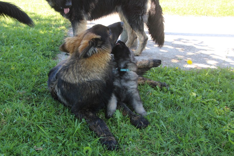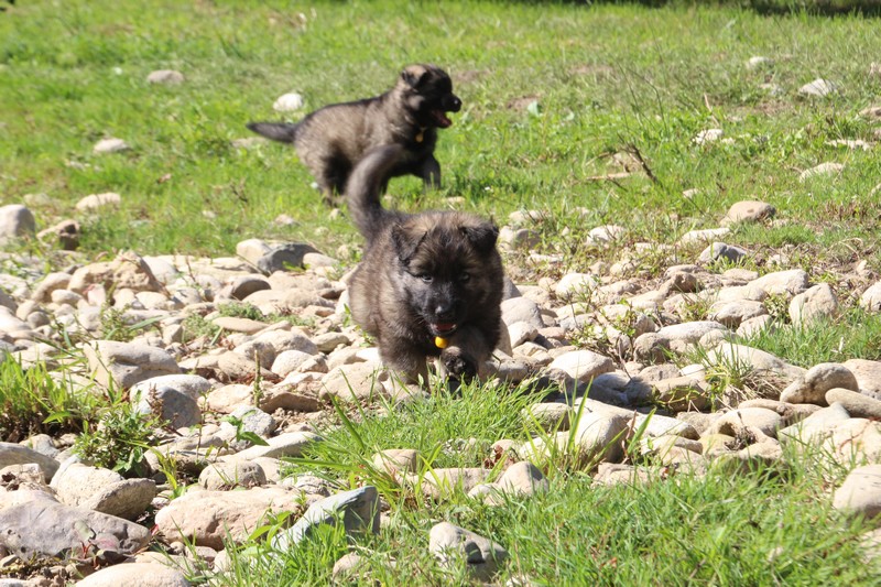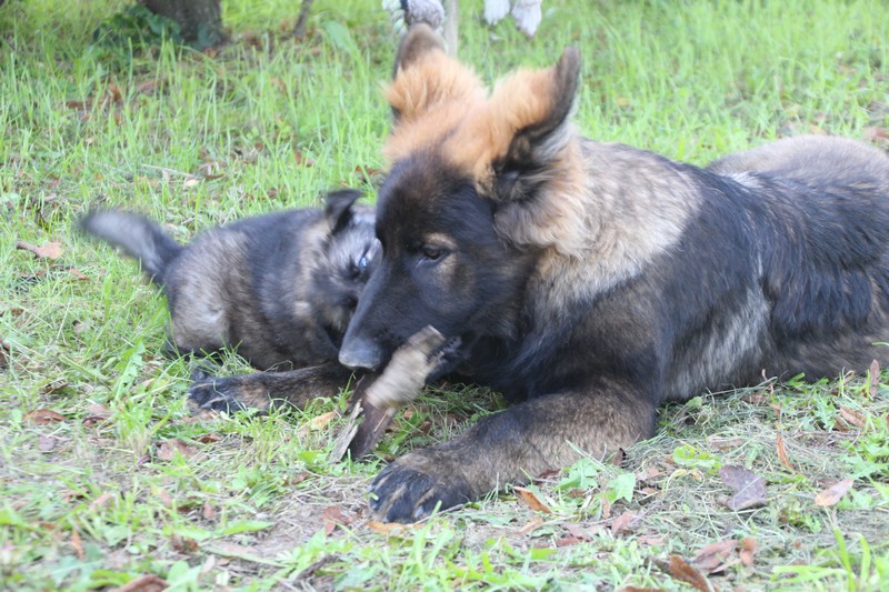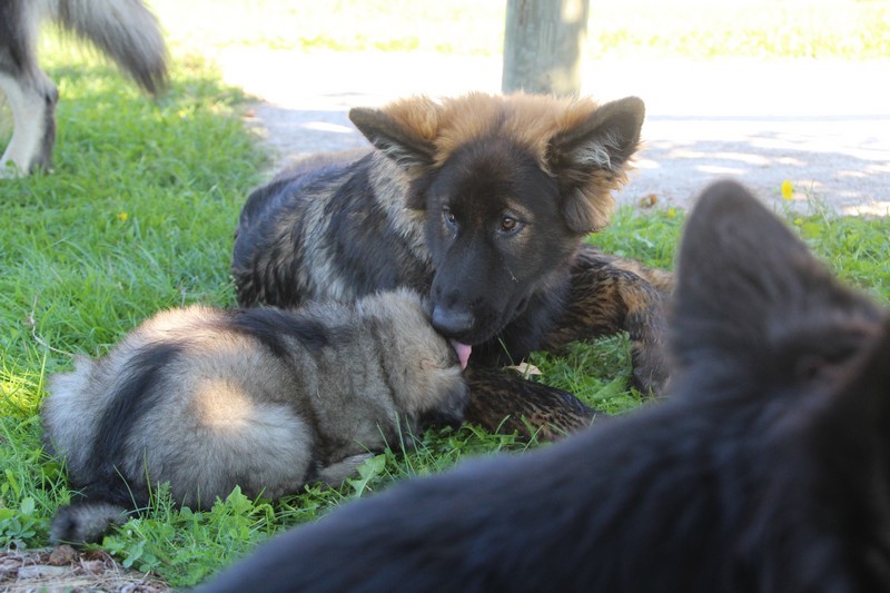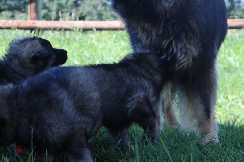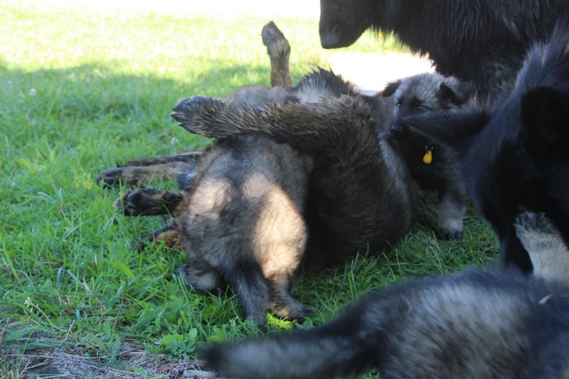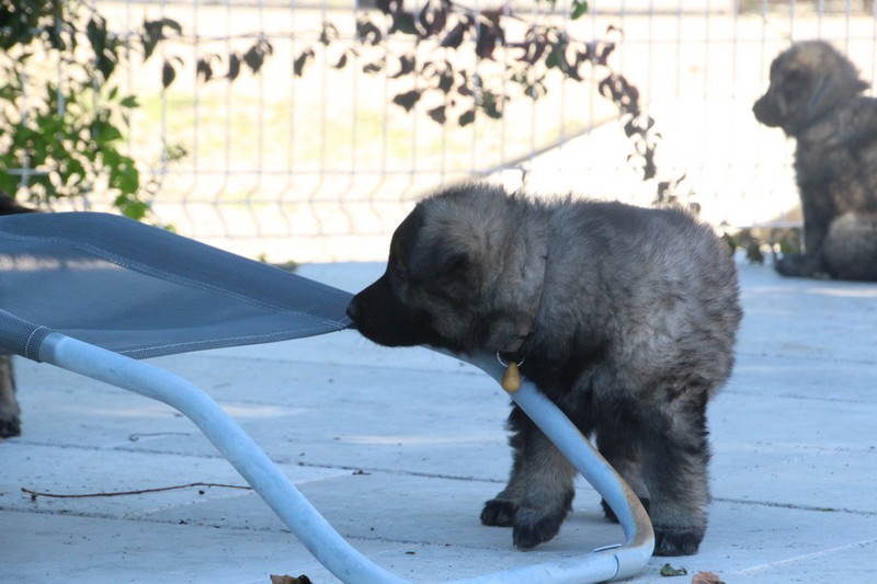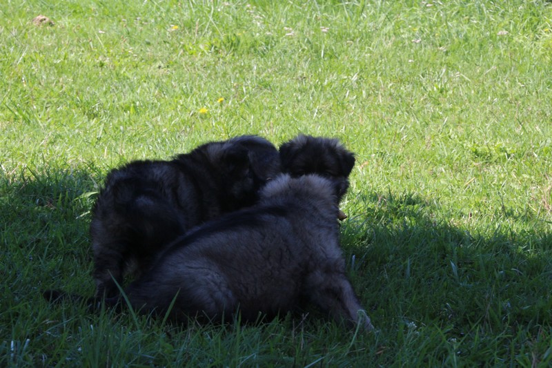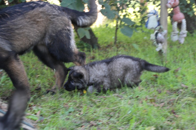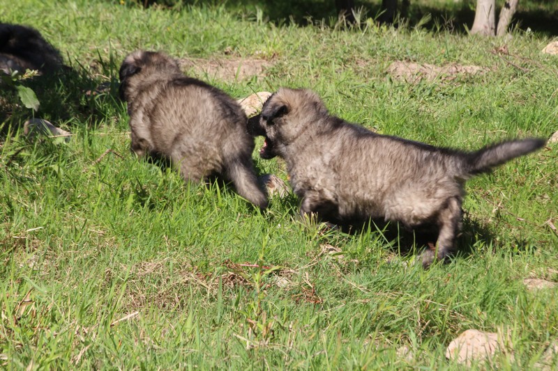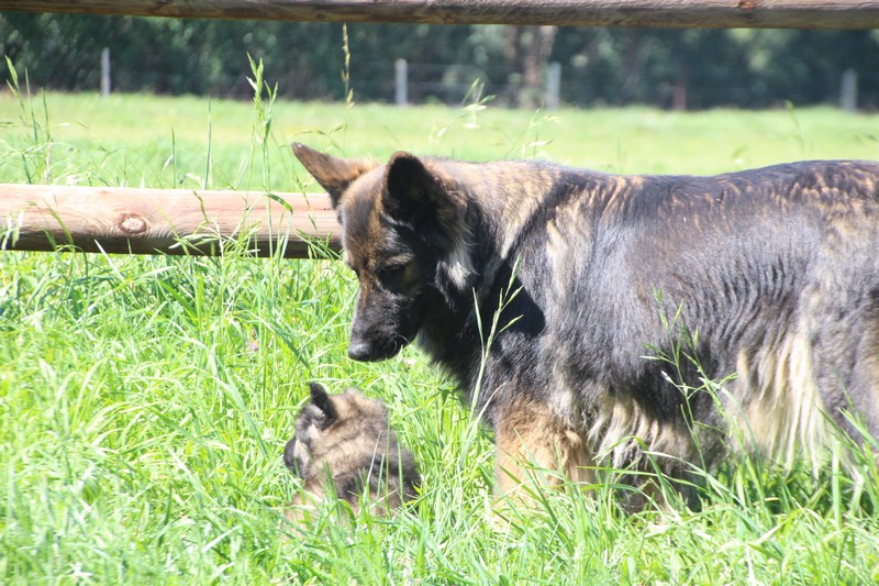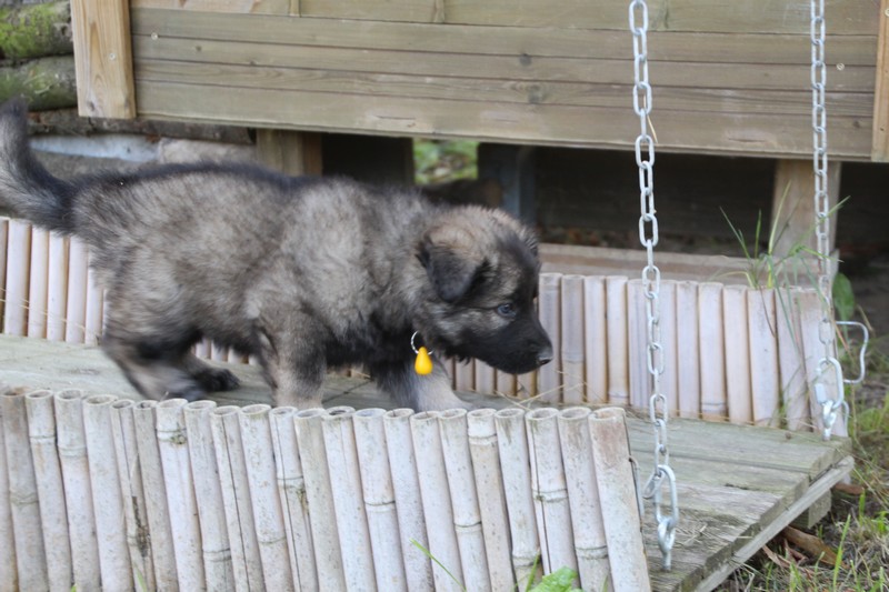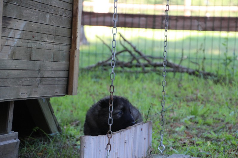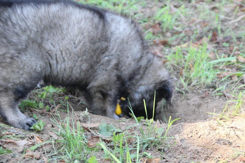 Maman nous a appris à creuser et l’on a vite compris le principe, nous avons eu également la visite de Kwando, un chien qui ne fait pas partie de la meute, un vieux copain de papa. Nous avons testé les divers agrès, mais notre coin préféré reste le tunnel ou nous nous entassons bien au chaud pour dormir.