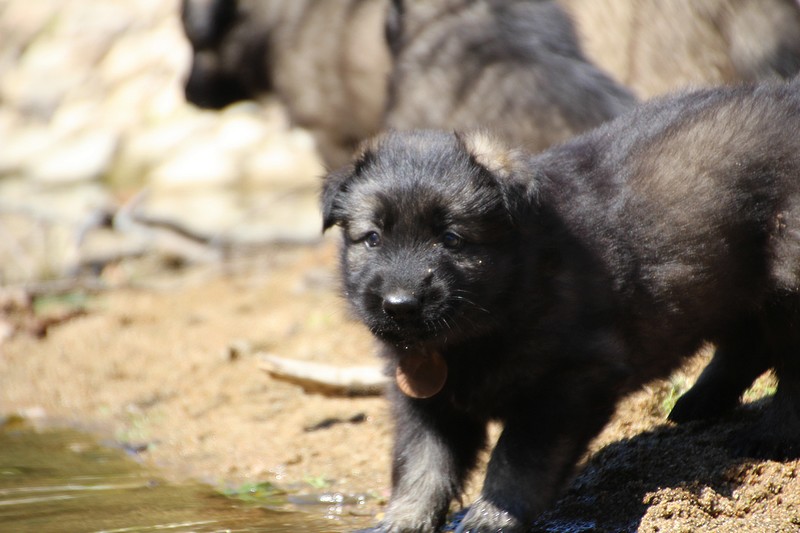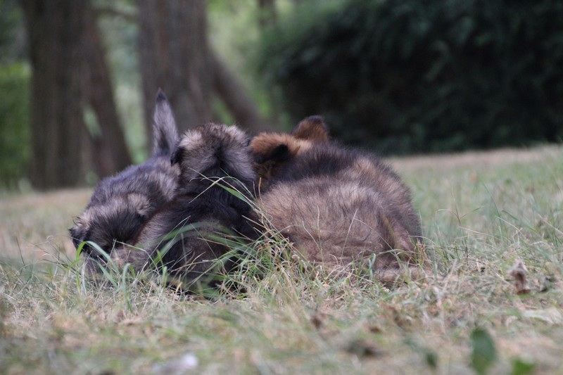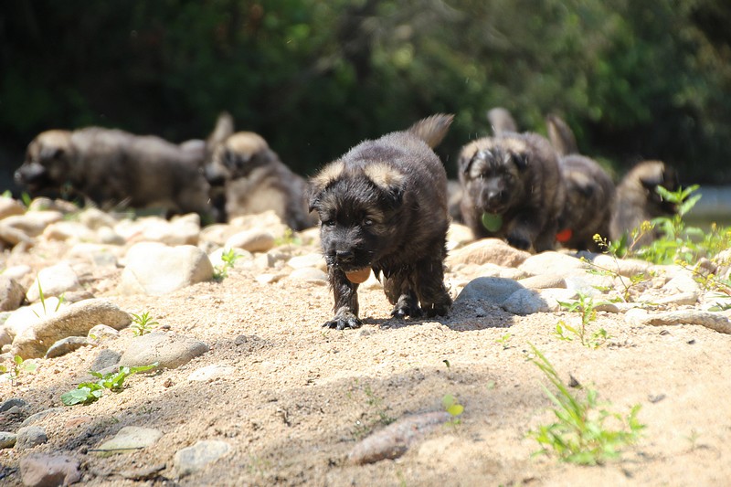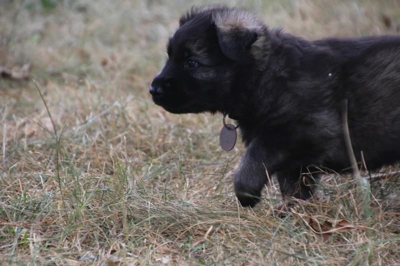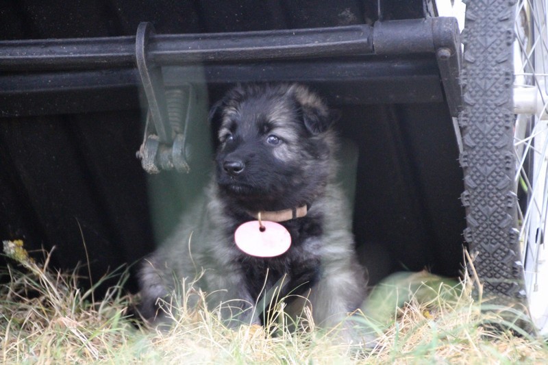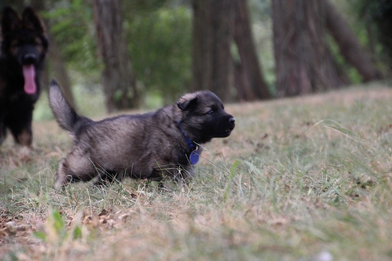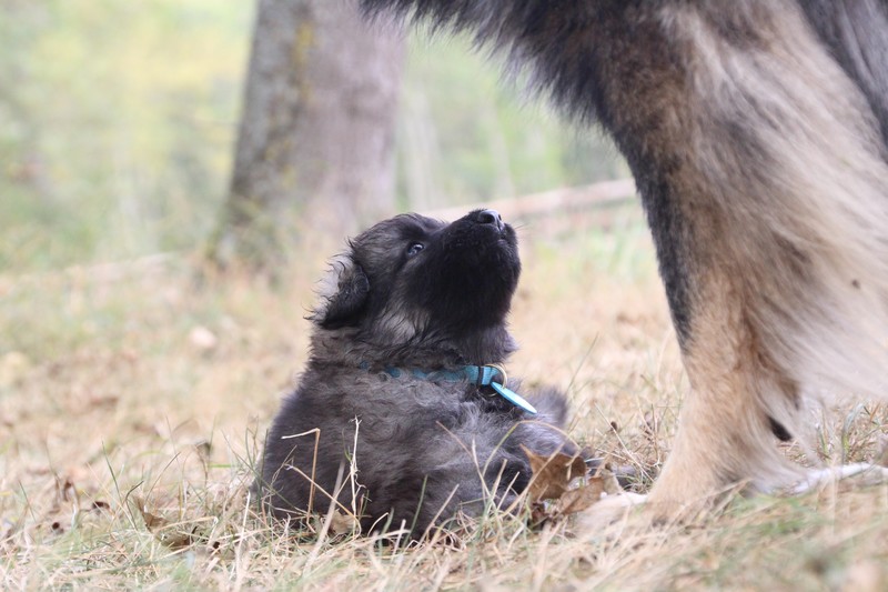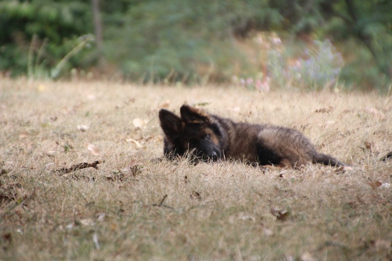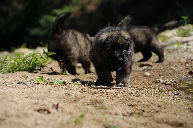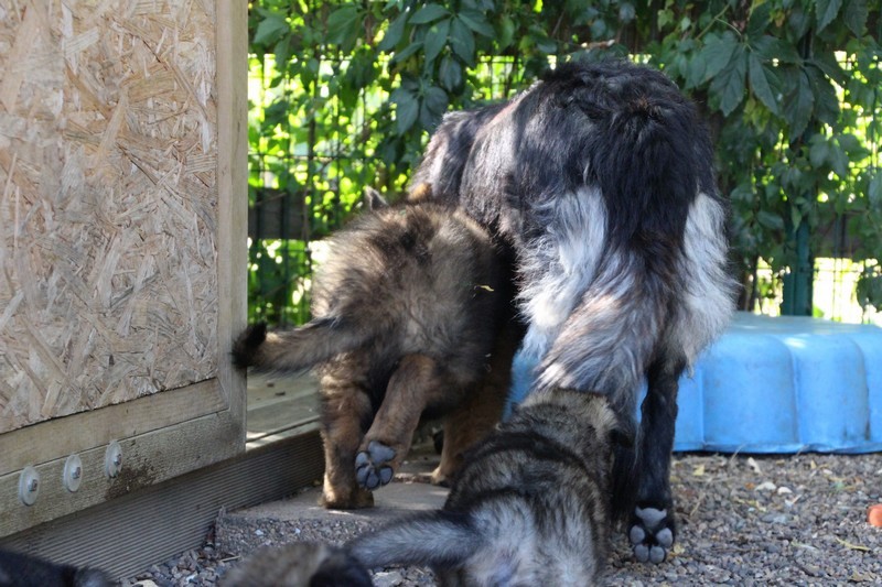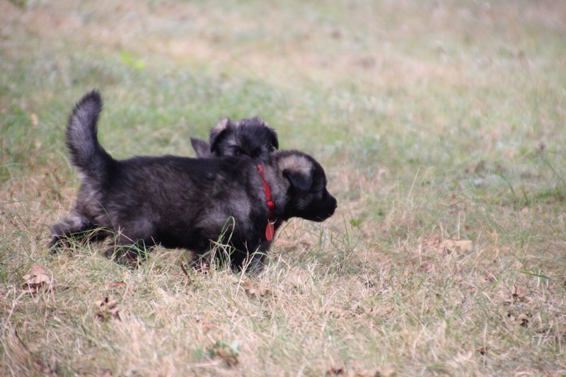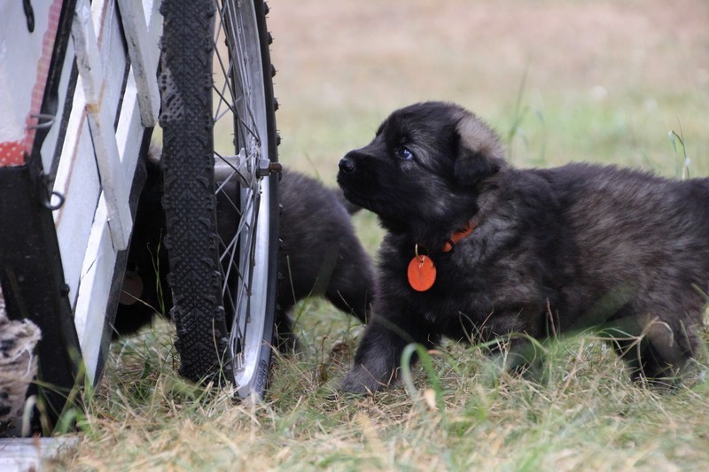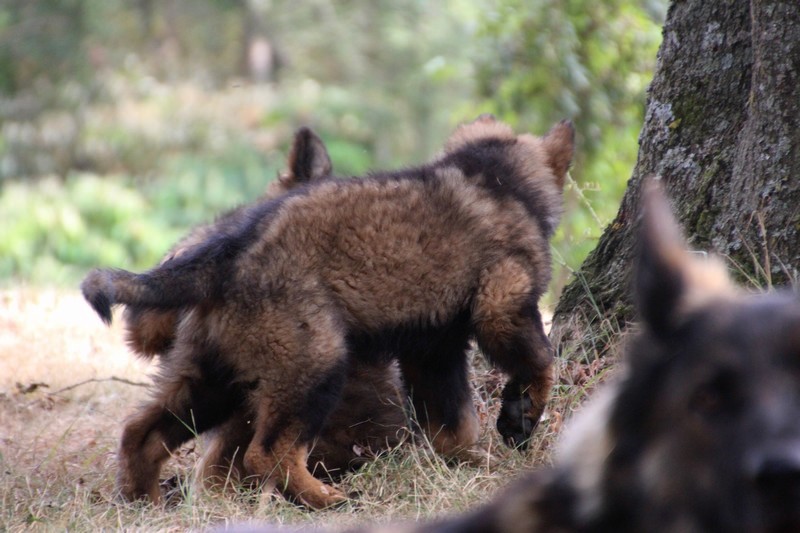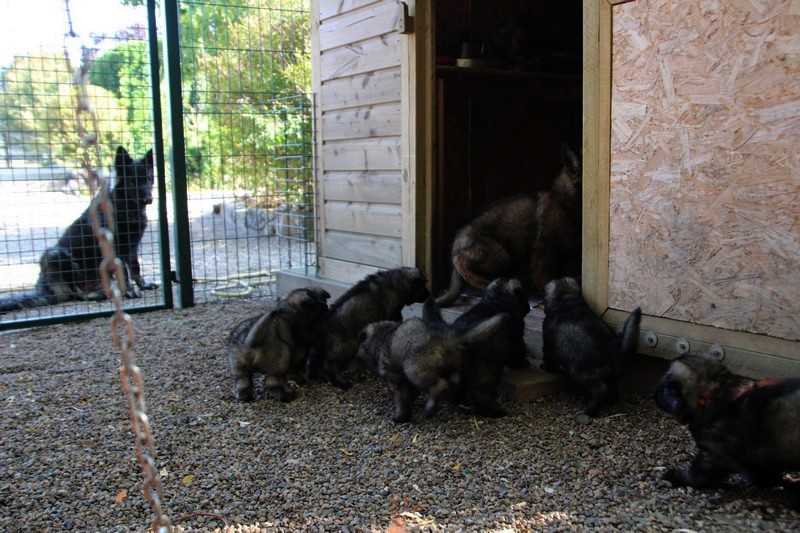 C’est à peu prés notre hauteur, nous gambadons de plus en plus vite et maintenant le parc à chiot n’a plus de secret pour nous. Nous sortons également du parc et apprenons à nous repérer dans les grands espaces et c’est toujours accompagné de maman et du restant de la meute que nous grandissons sereinement.