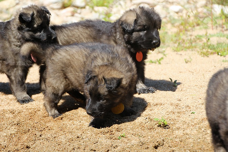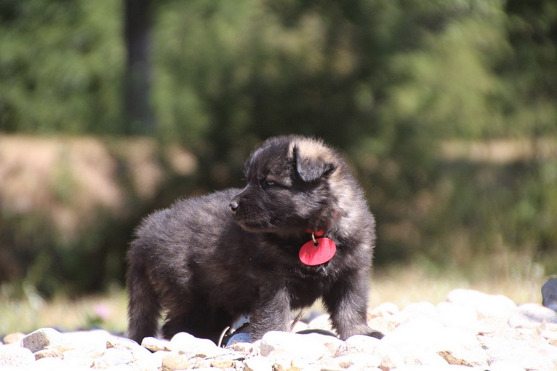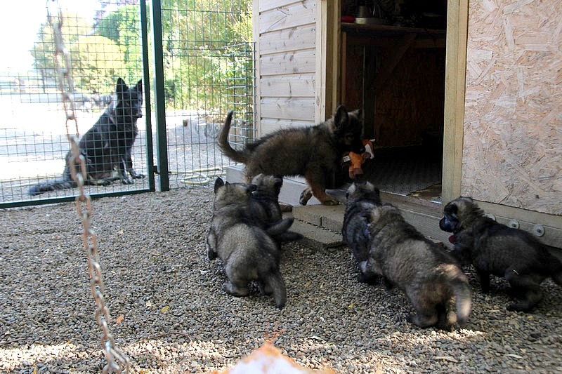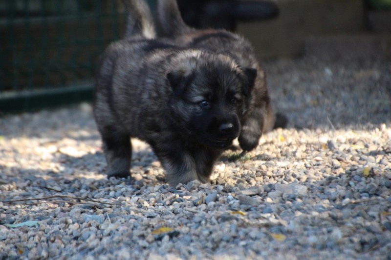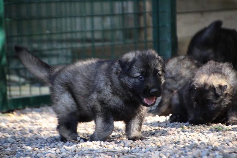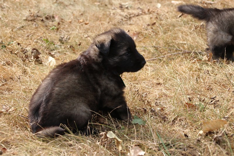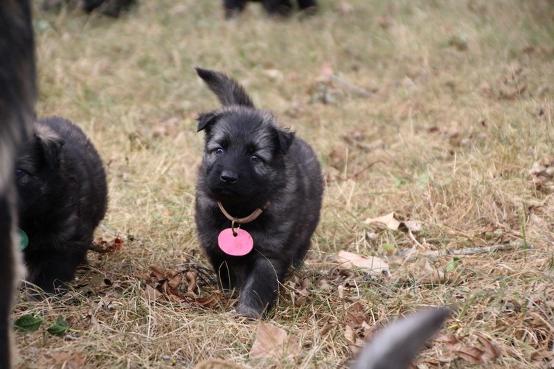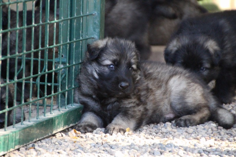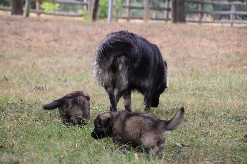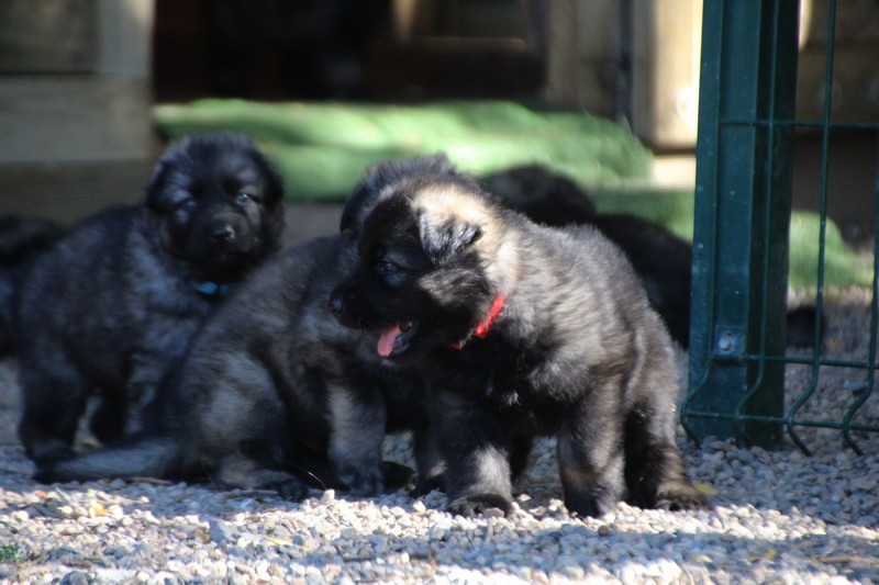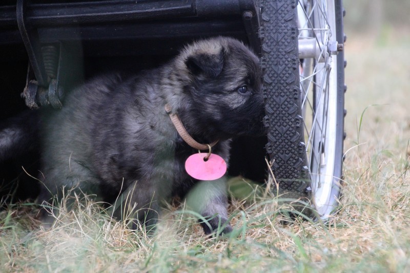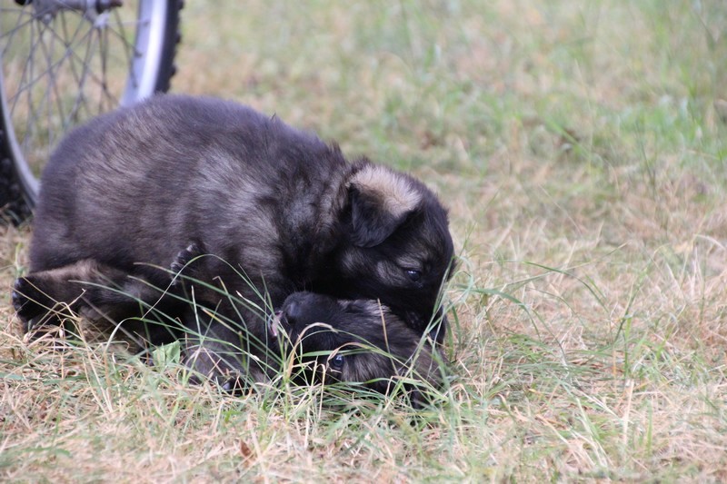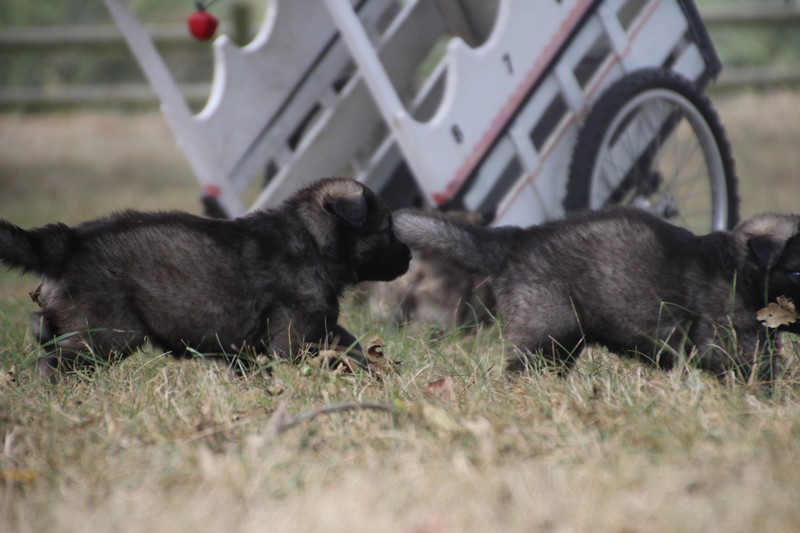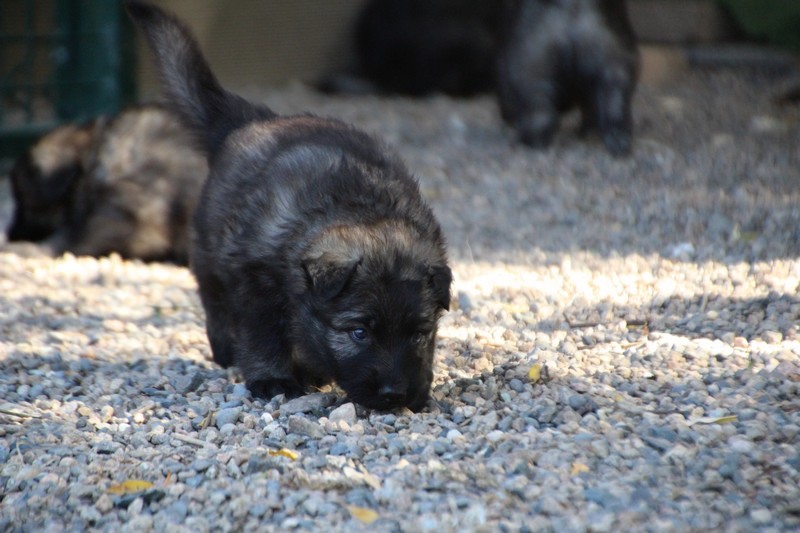 C’est à peu prés notre hauteur, nous gambadons de plus en plus vite et maintenant le parc à chiot n’a plus de secret pour nous. Nous sortons également du parc et apprenons à nous repérer dans les grands espaces et c’est toujours accompagné de maman et du restant de la meute que nous grandissons sereinement.