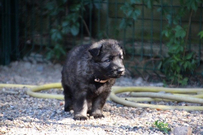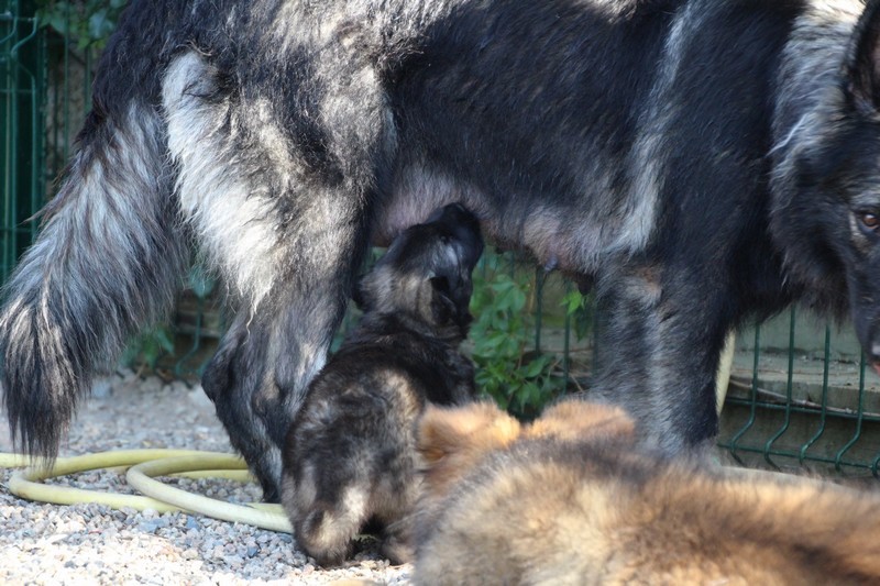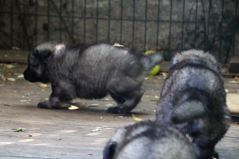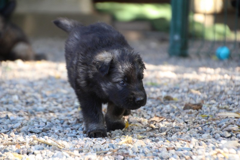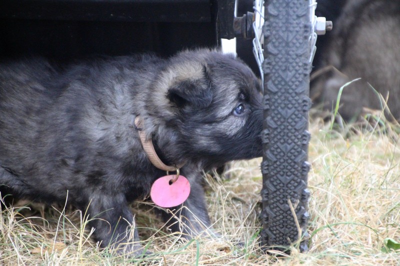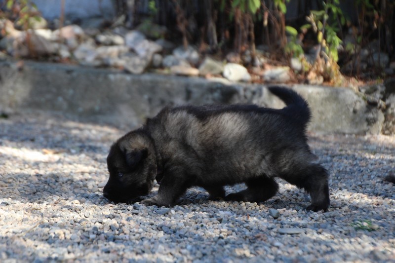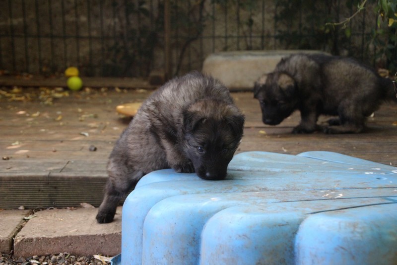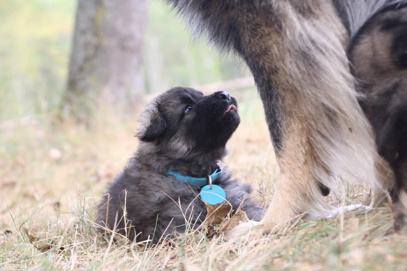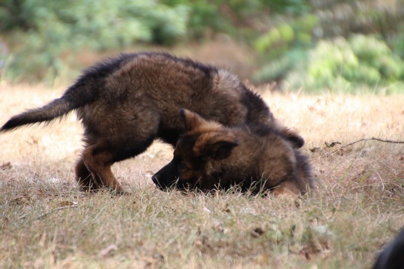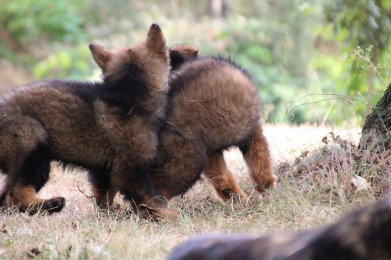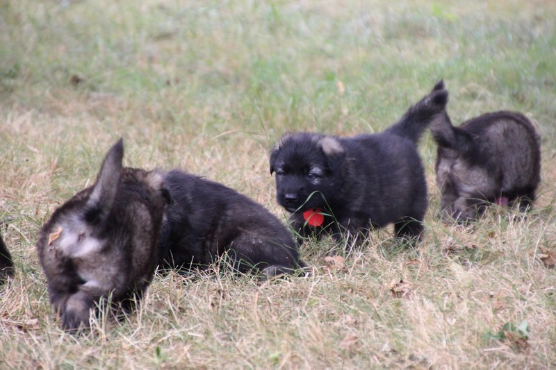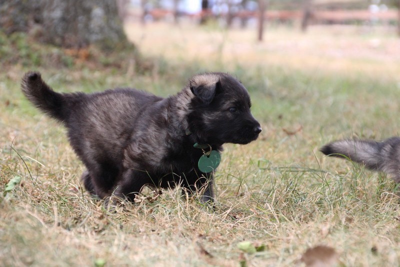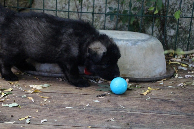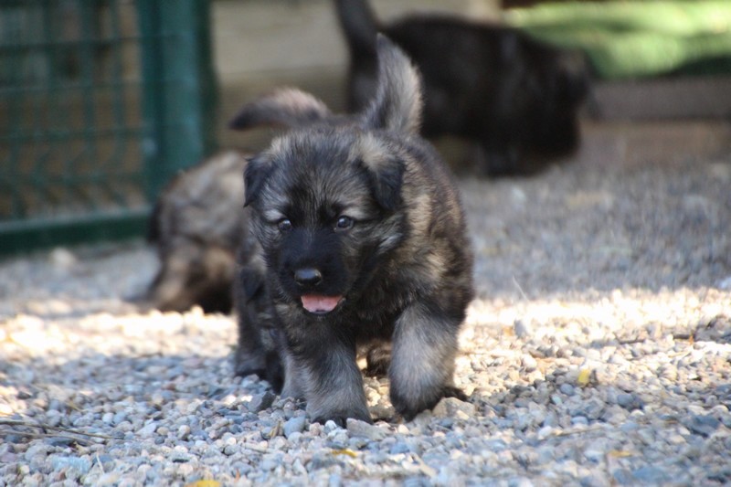 C’est à peu prés notre hauteur, nous gambadons de plus en plus vite et maintenant le parc à chiot n’a plus de secret pour nous. Nous sortons également du parc et apprenons à nous repérer dans les grands espaces et c’est toujours accompagné de maman et du restant de la meute que nous grandissons sereinement.