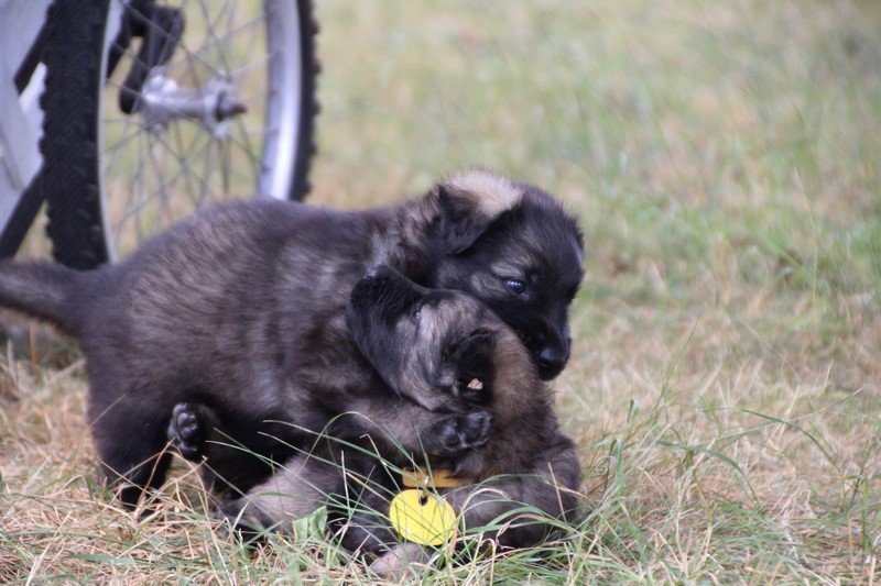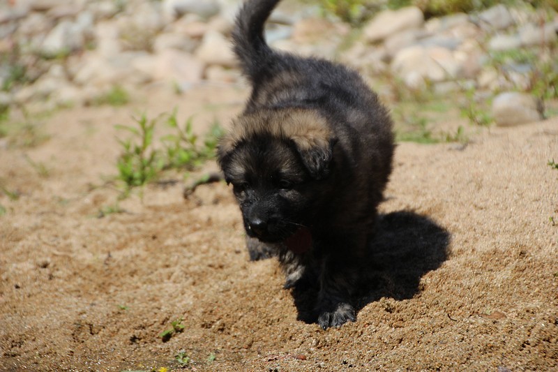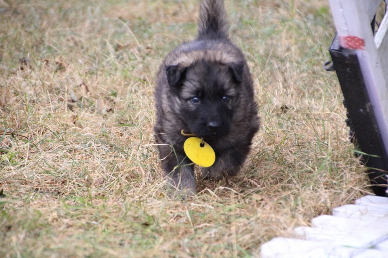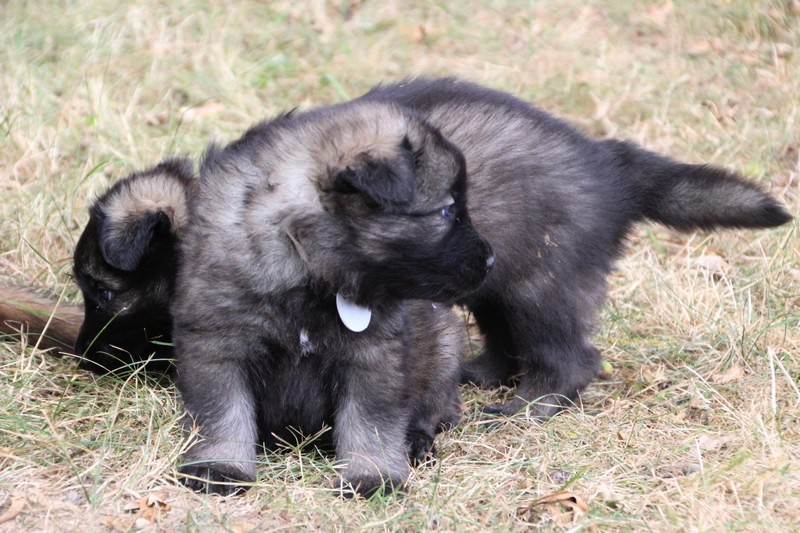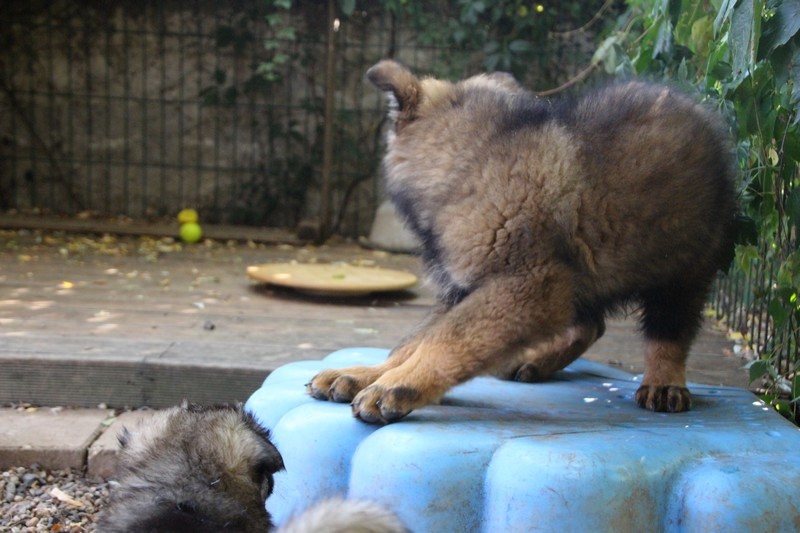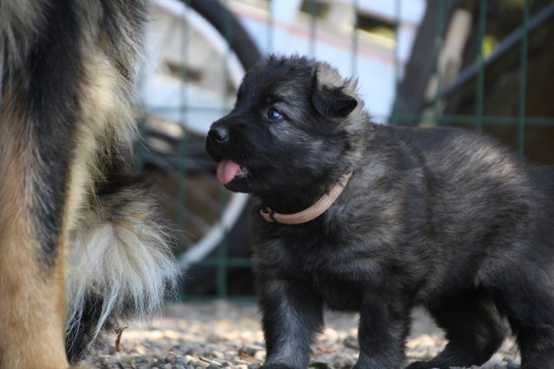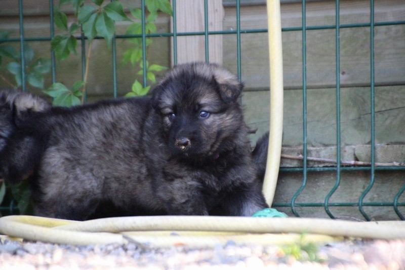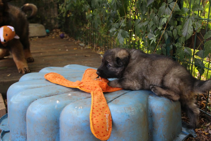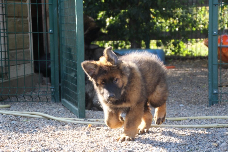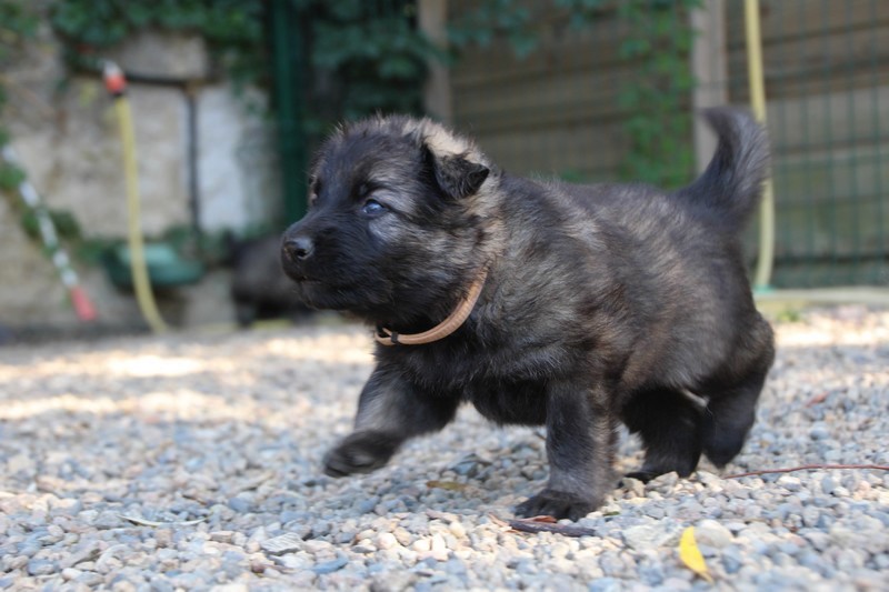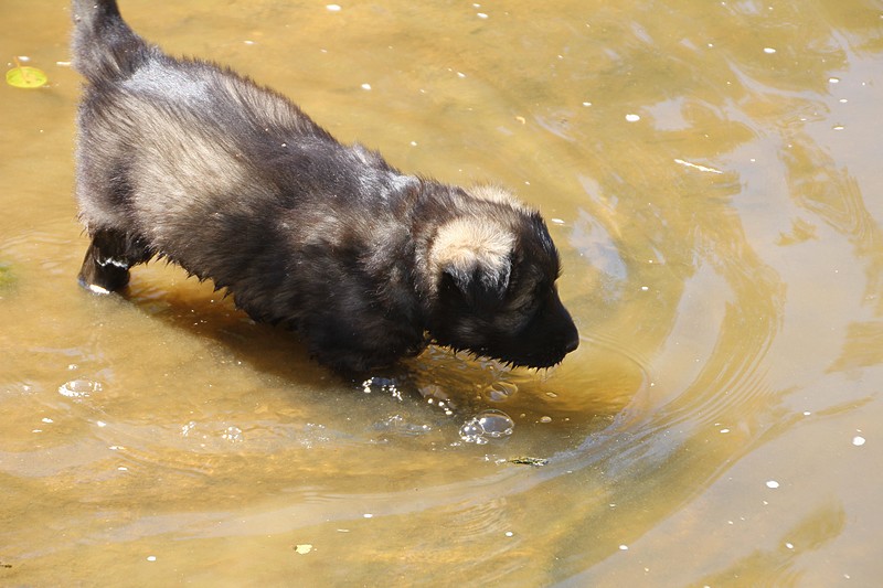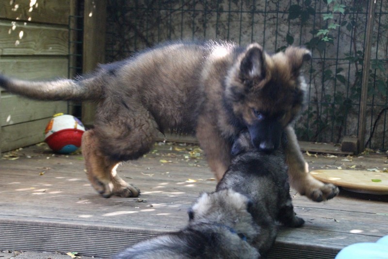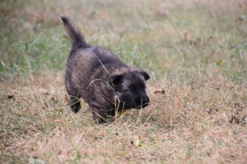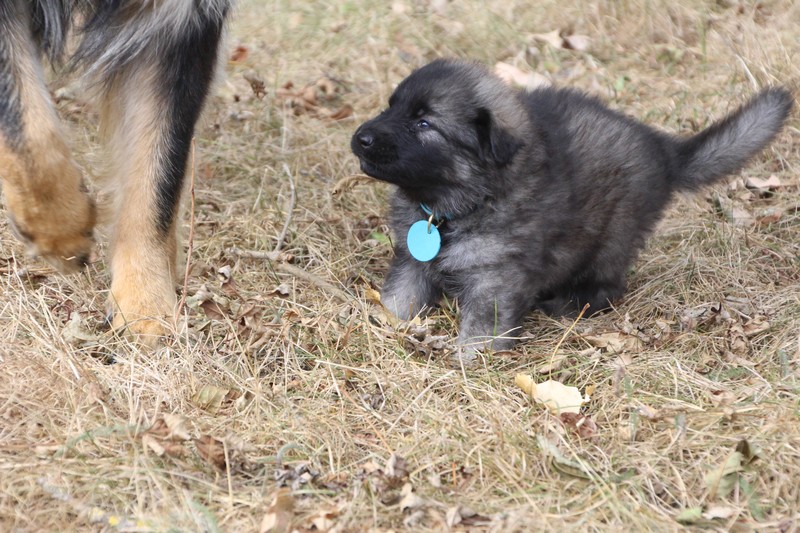 C’est à peu prés notre hauteur, nous gambadons de plus en plus vite et maintenant le parc à chiot n’a plus de secret pour nous. Nous sortons également du parc et apprenons à nous repérer dans les grands espaces et c’est toujours accompagné de maman et du restant de la meute que nous grandissons sereinement.