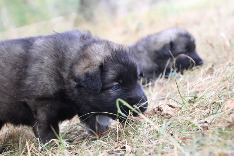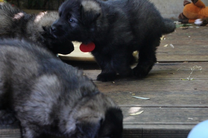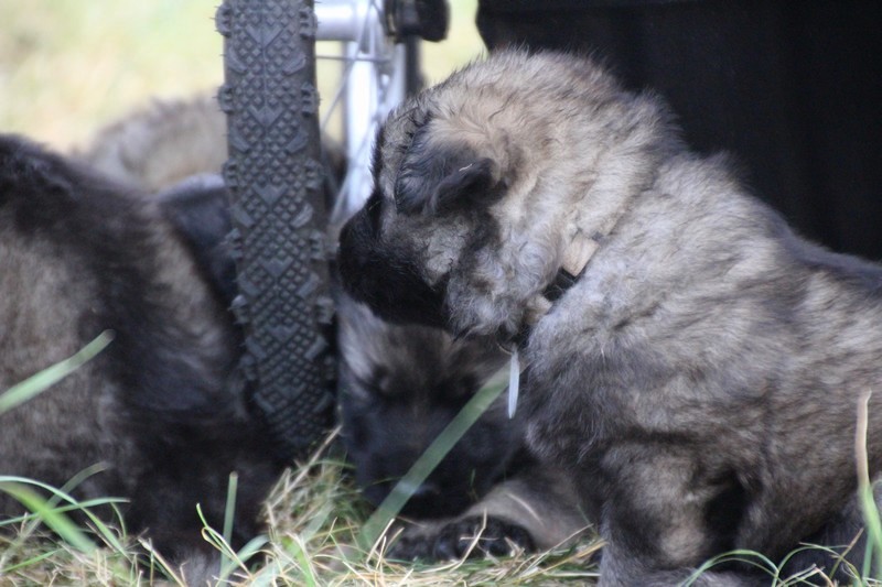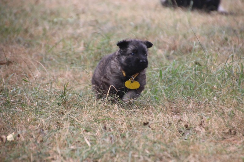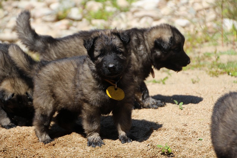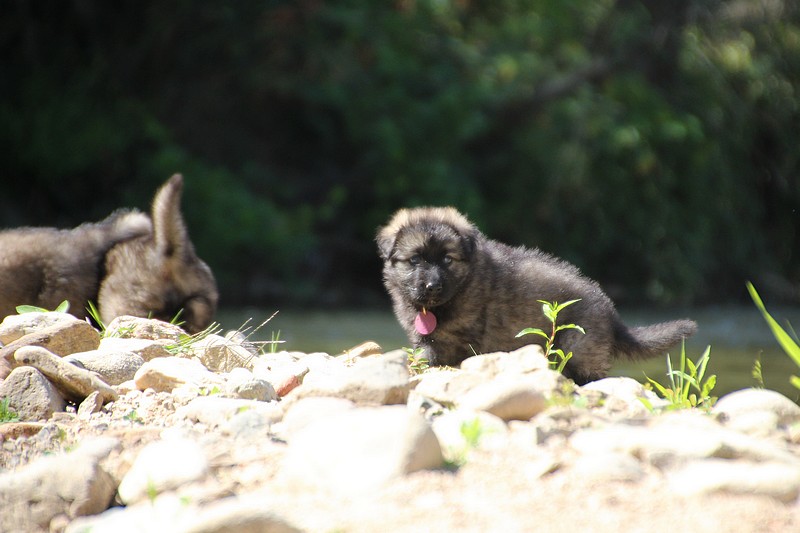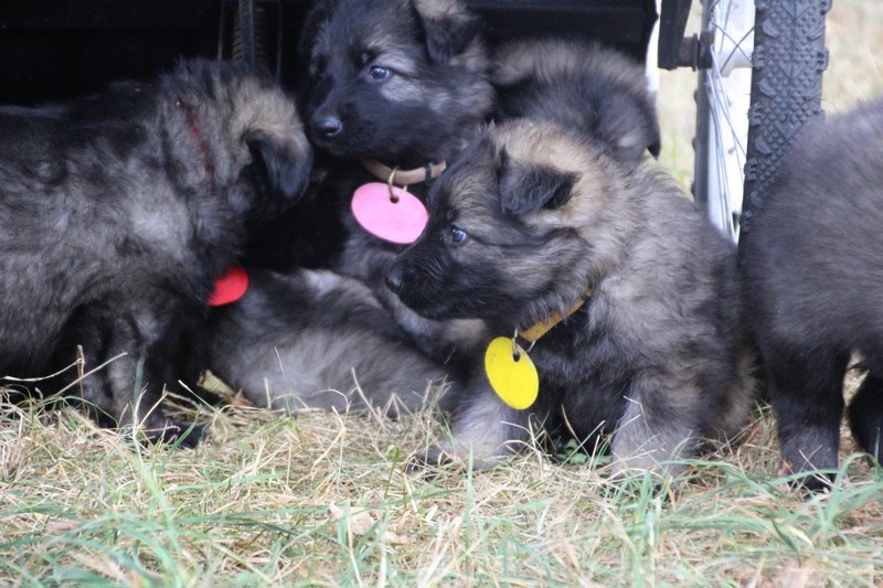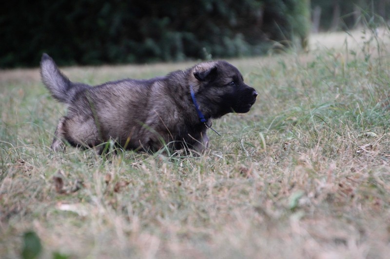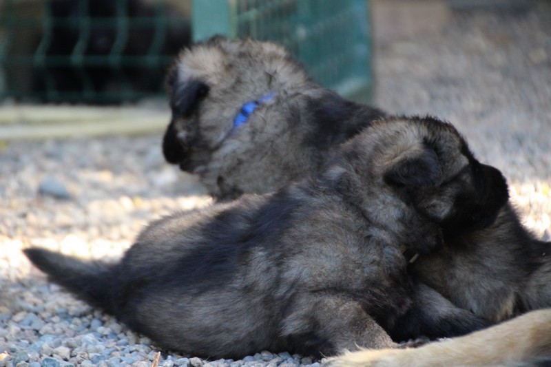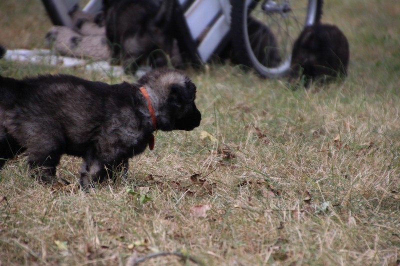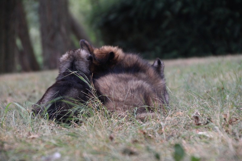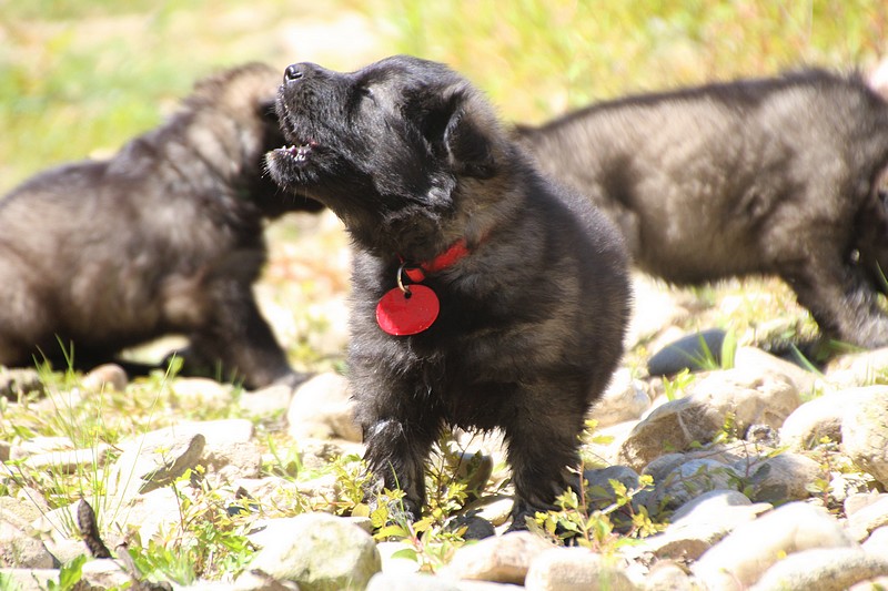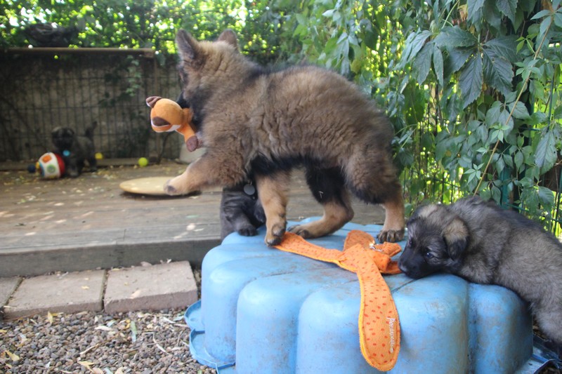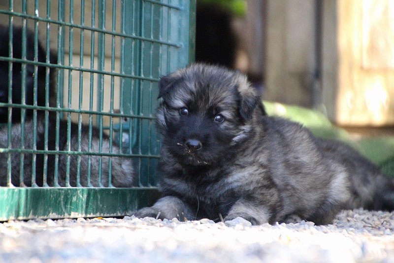 C’est à peu prés notre hauteur, nous gambadons de plus en plus vite et maintenant le parc à chiot n’a plus de secret pour nous. Nous sortons également du parc et apprenons à nous repérer dans les grands espaces et c’est toujours accompagné de maman et du restant de la meute que nous grandissons sereinement.