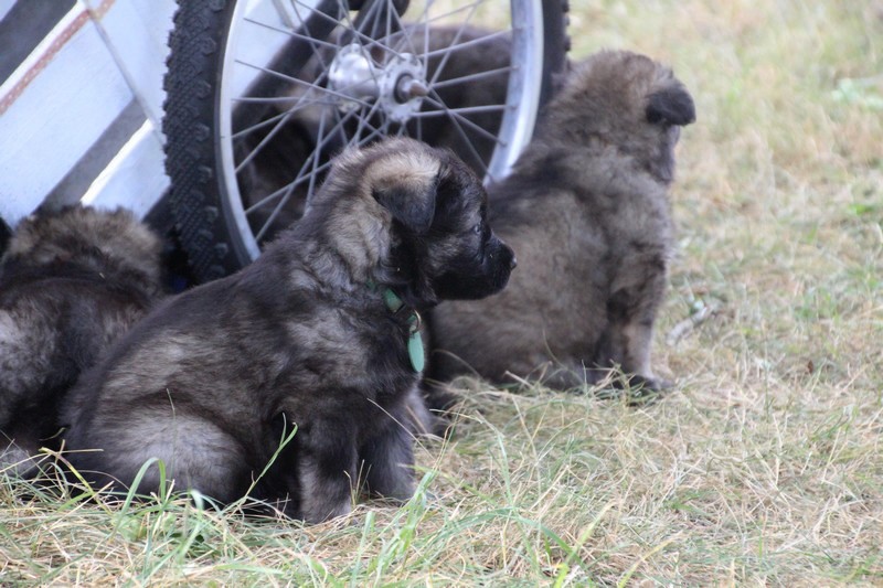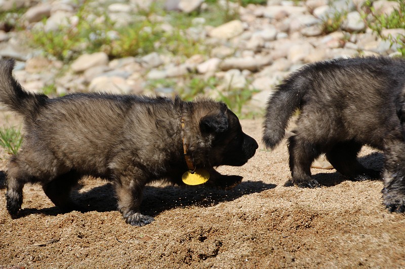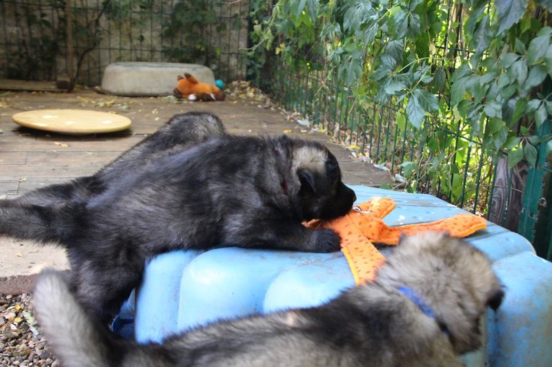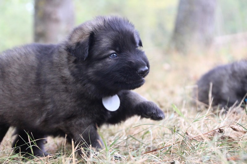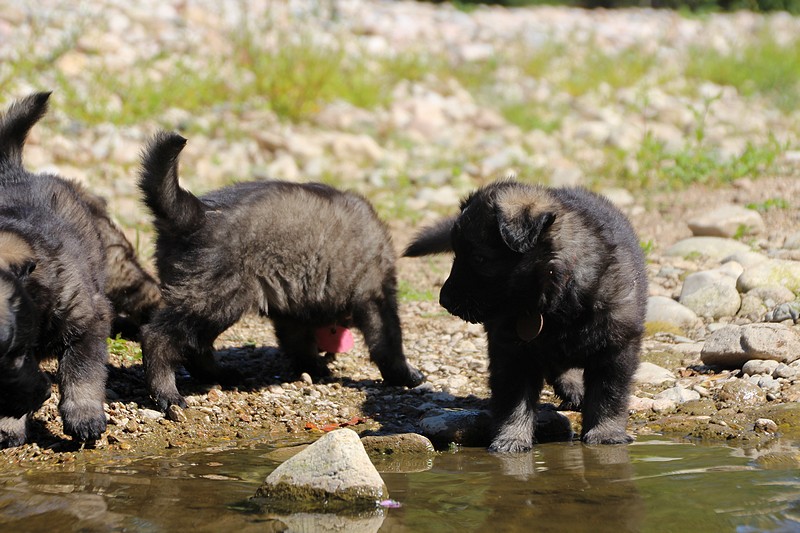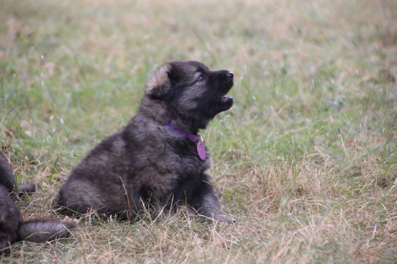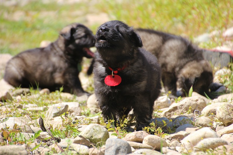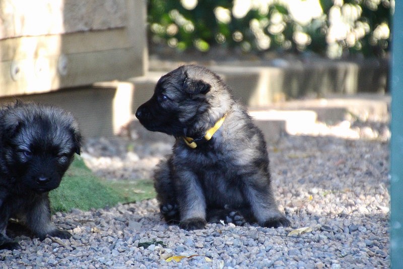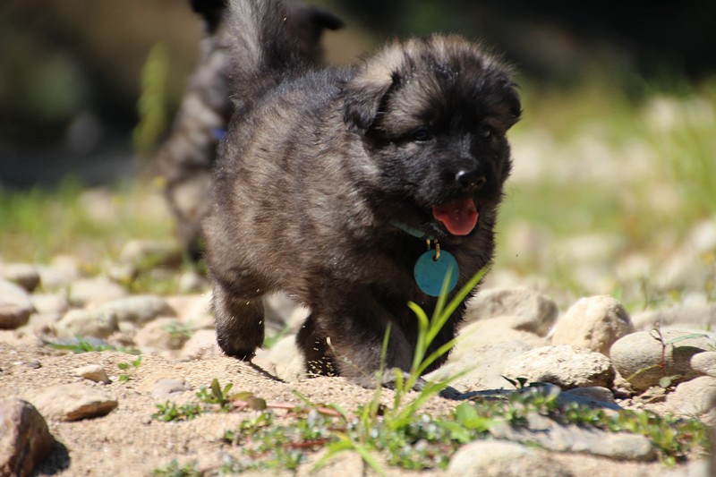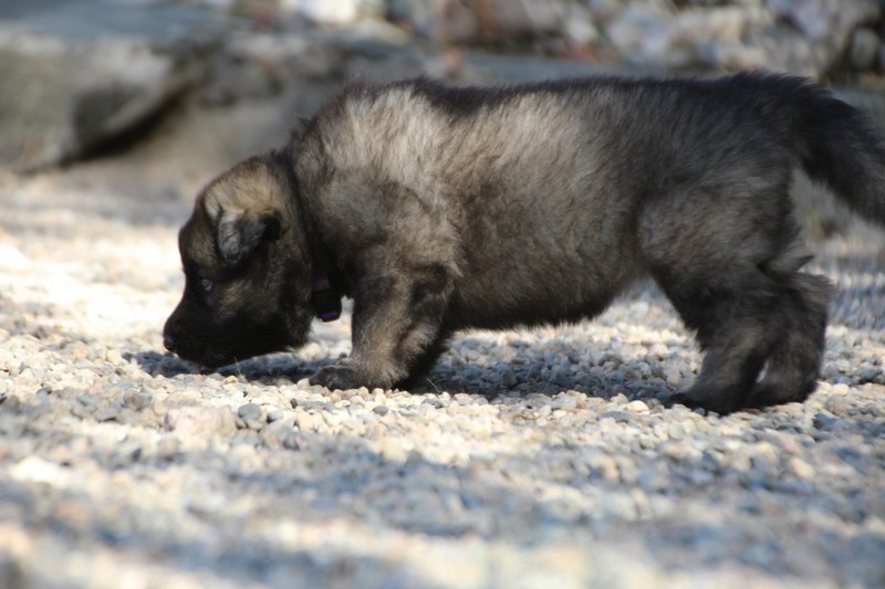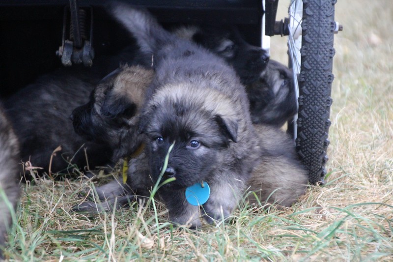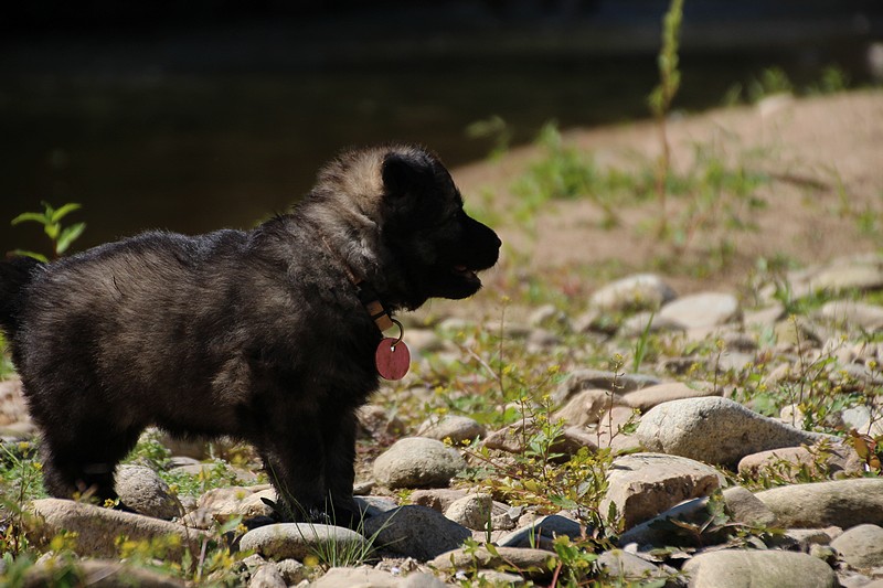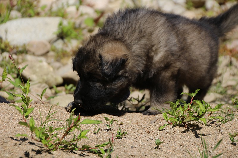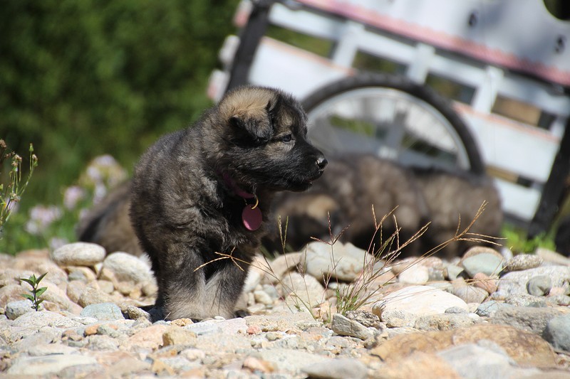 C’est à peu prés notre hauteur, nous gambadons de plus en plus vite et maintenant le parc à chiot n’a plus de secret pour nous. Nous sortons également du parc et apprenons à nous repérer dans les grands espaces et c’est toujours accompagné de maman et du restant de la meute que nous grandissons sereinement.