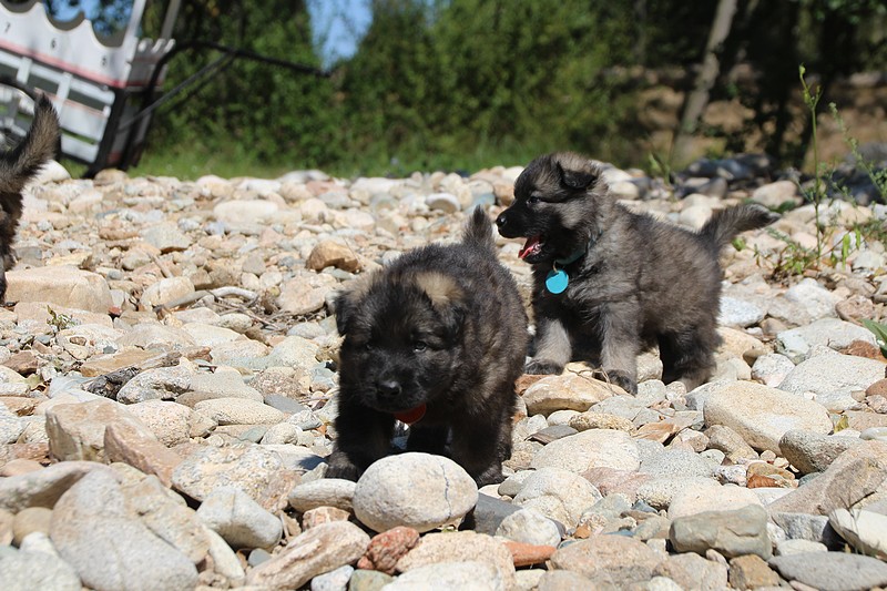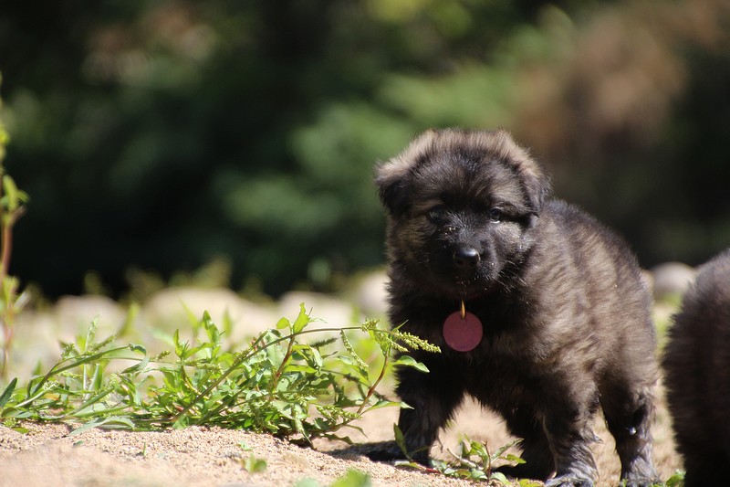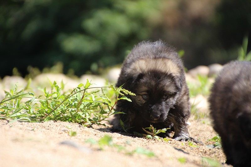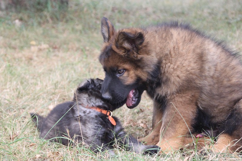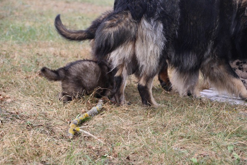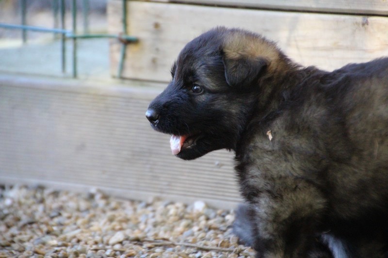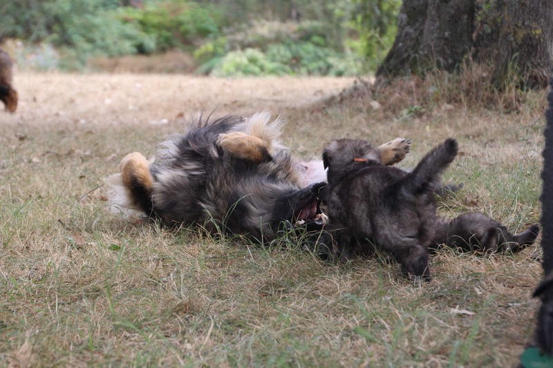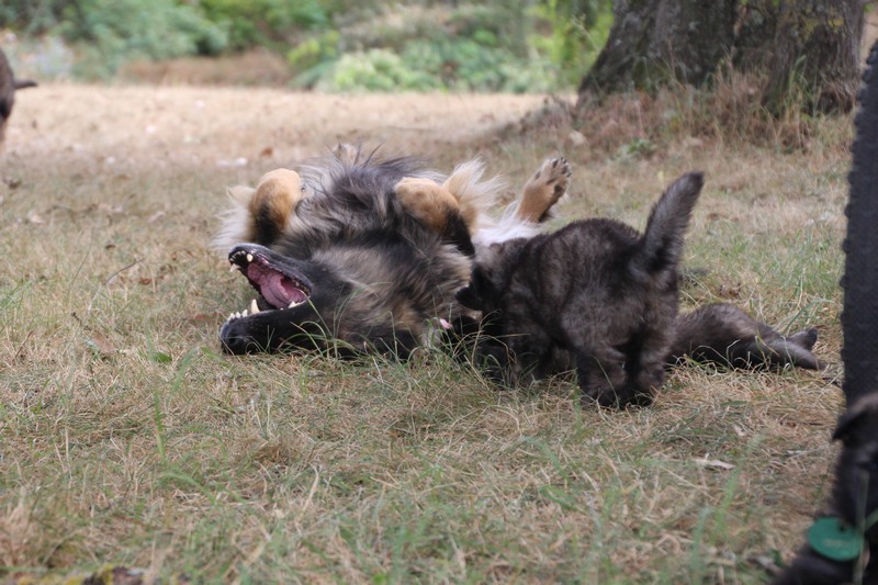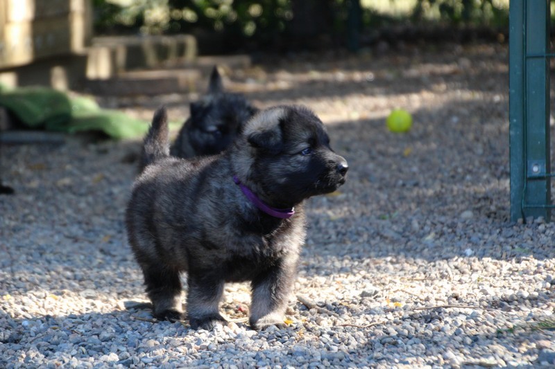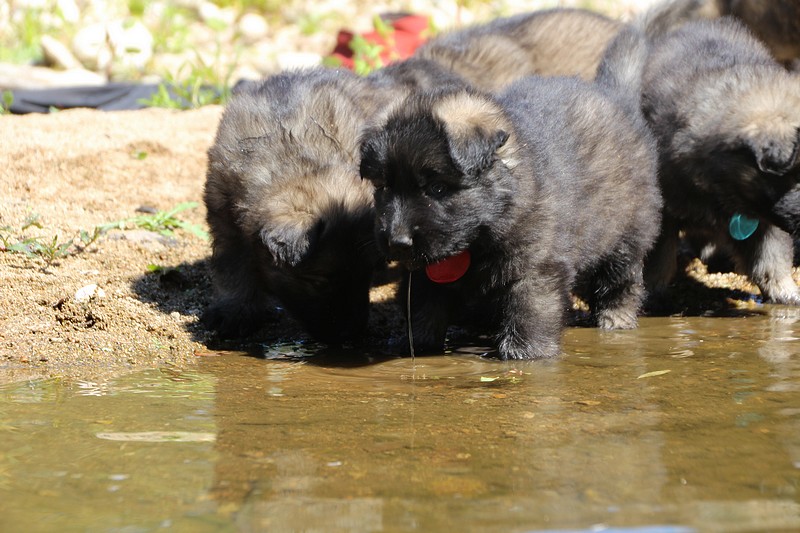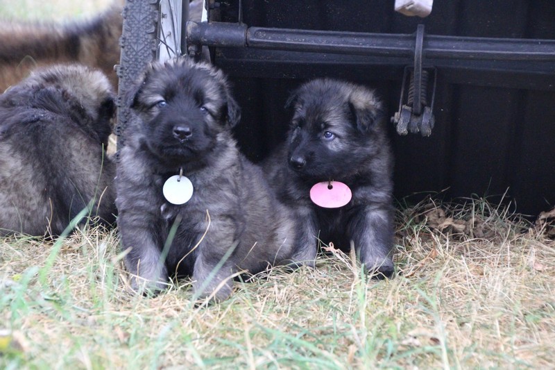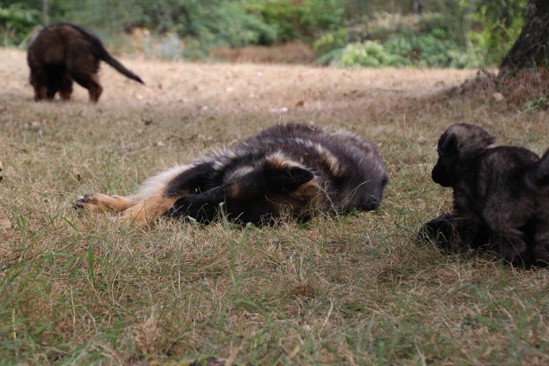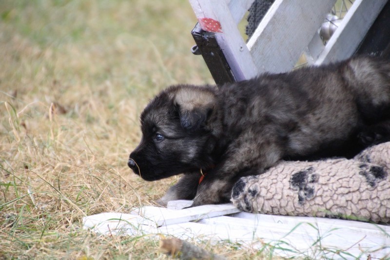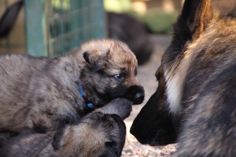 C’est à peu prés notre hauteur, nous gambadons de plus en plus vite et maintenant le parc à chiot n’a plus de secret pour nous. Nous sortons également du parc et apprenons à nous repérer dans les grands espaces et c’est toujours accompagné de maman et du restant de la meute que nous grandissons sereinement.