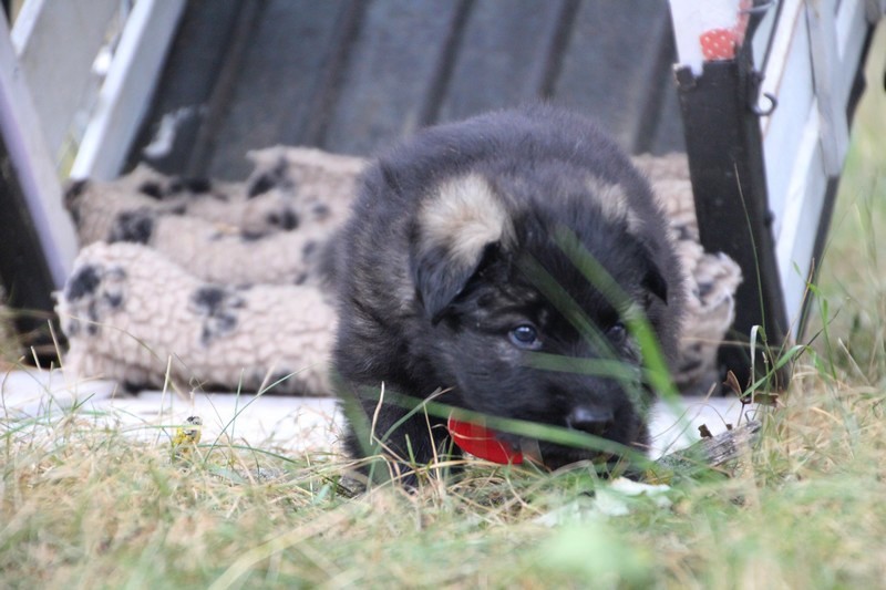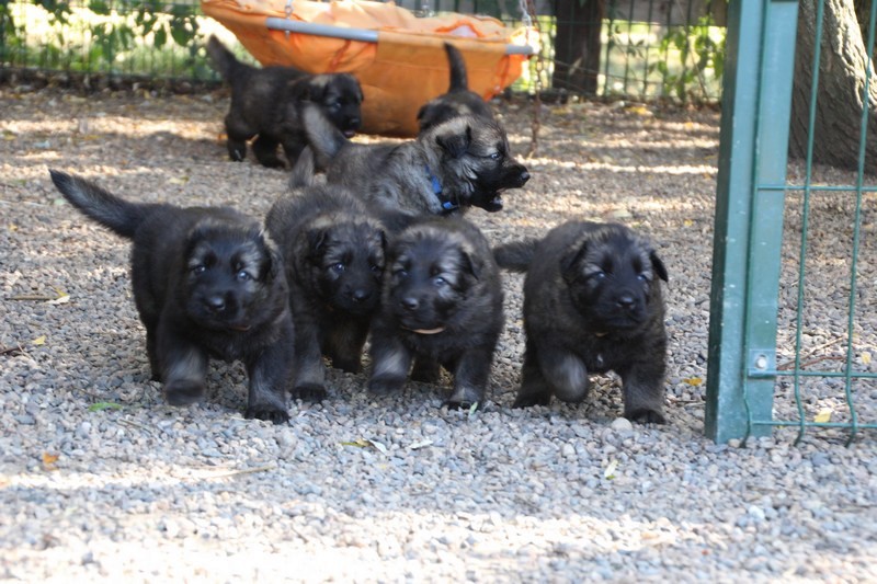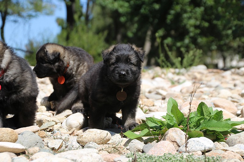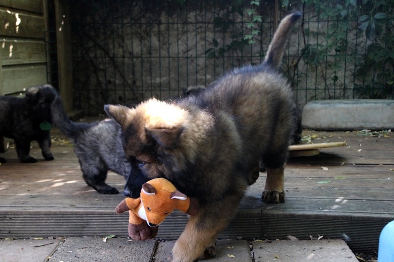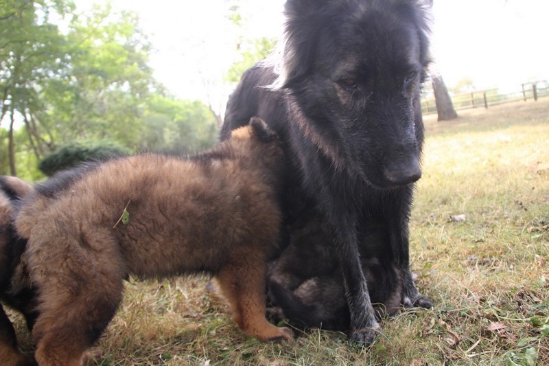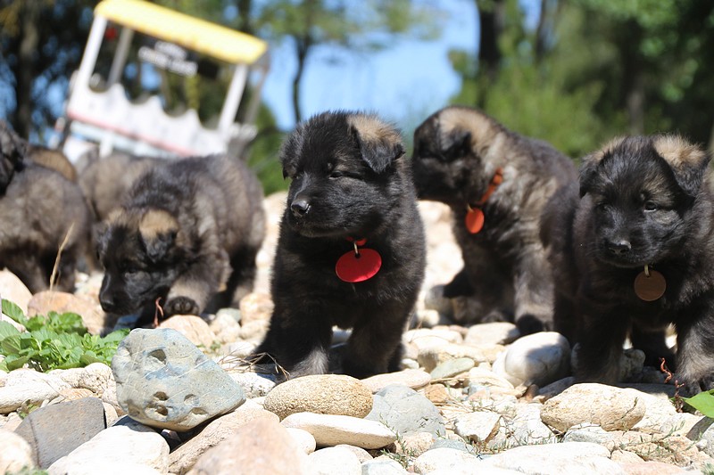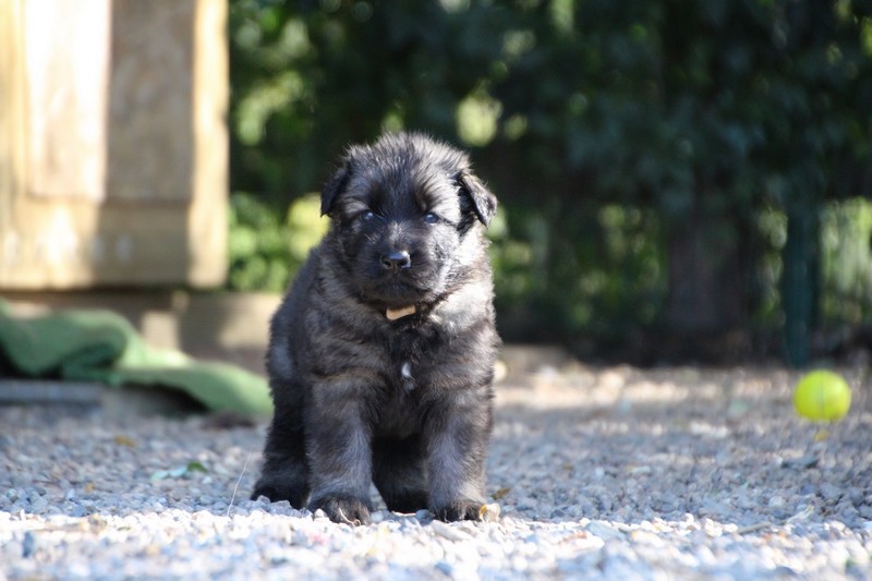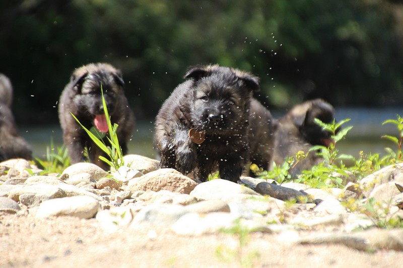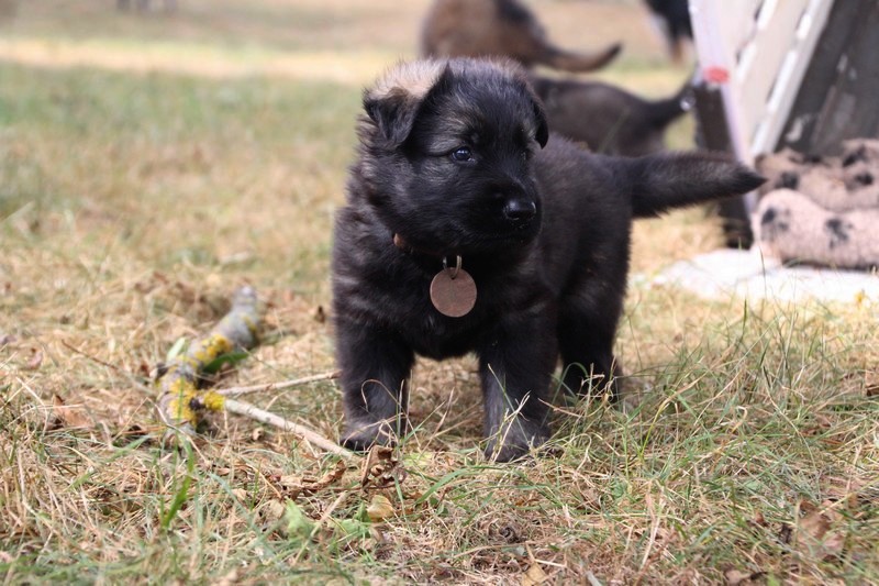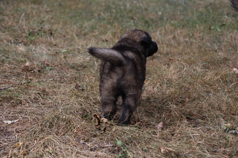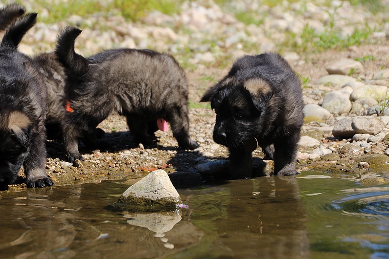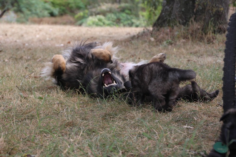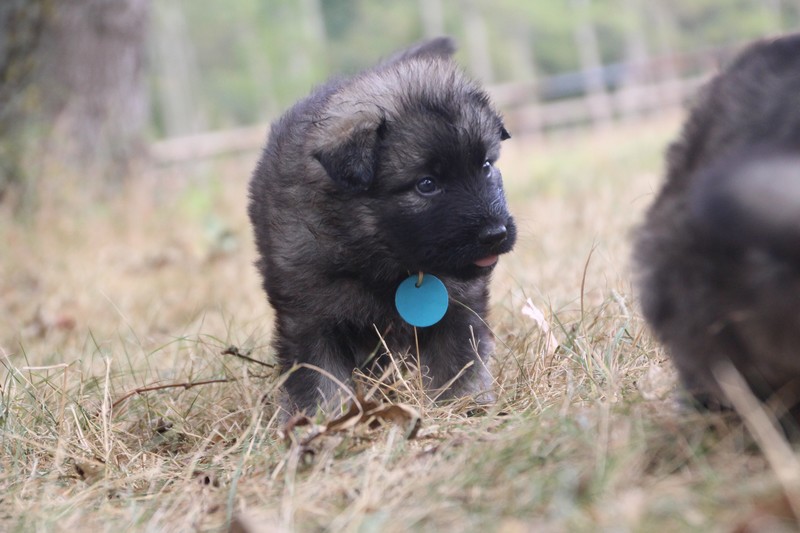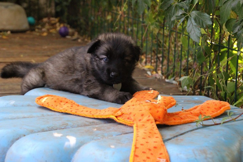 C’est à peu prés notre hauteur, nous gambadons de plus en plus vite et maintenant le parc à chiot n’a plus de secret pour nous. Nous sortons également du parc et apprenons à nous repérer dans les grands espaces et c’est toujours accompagné de maman et du restant de la meute que nous grandissons sereinement.