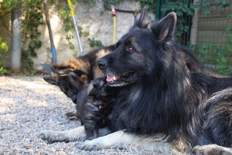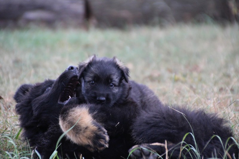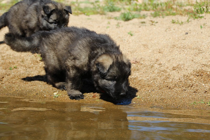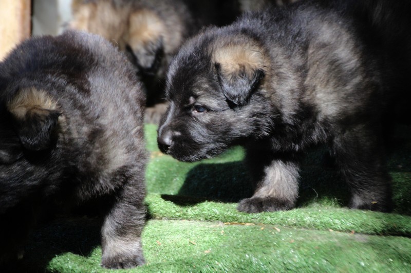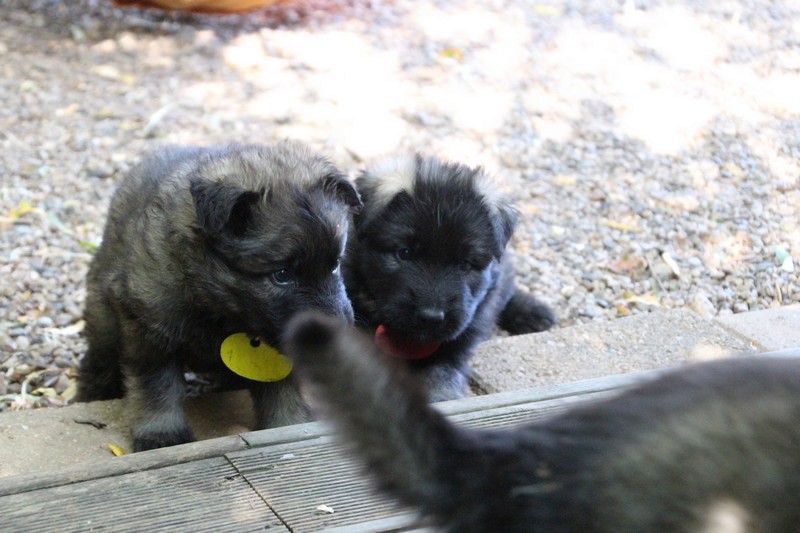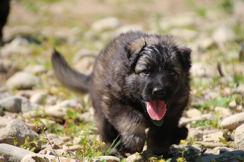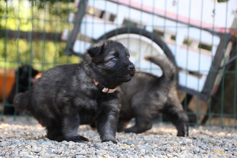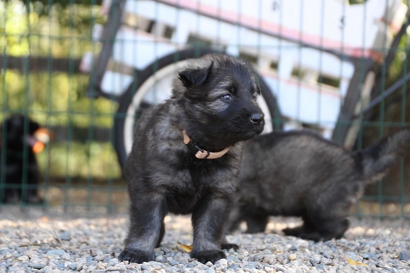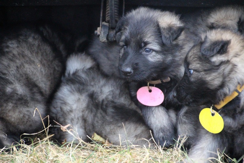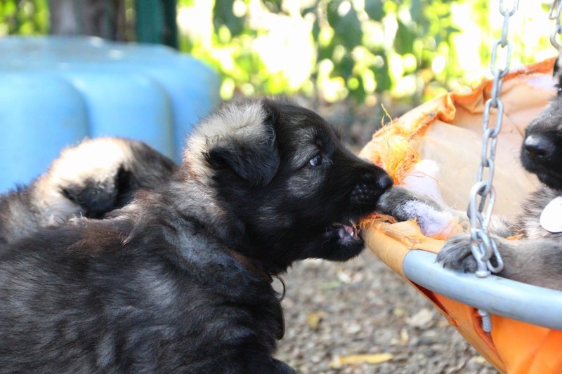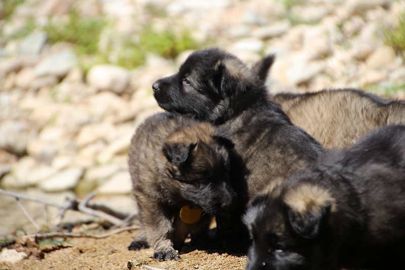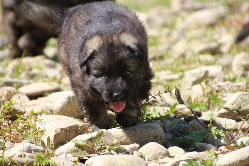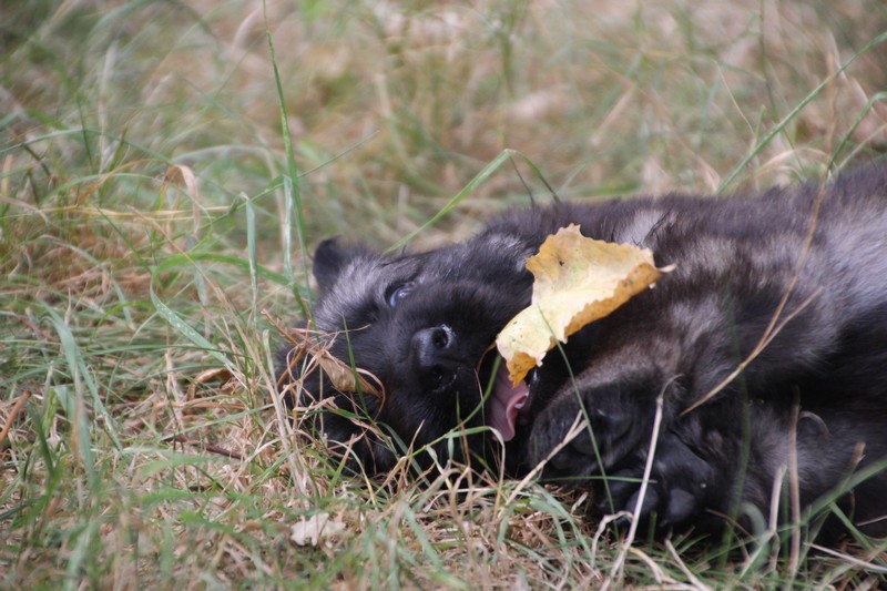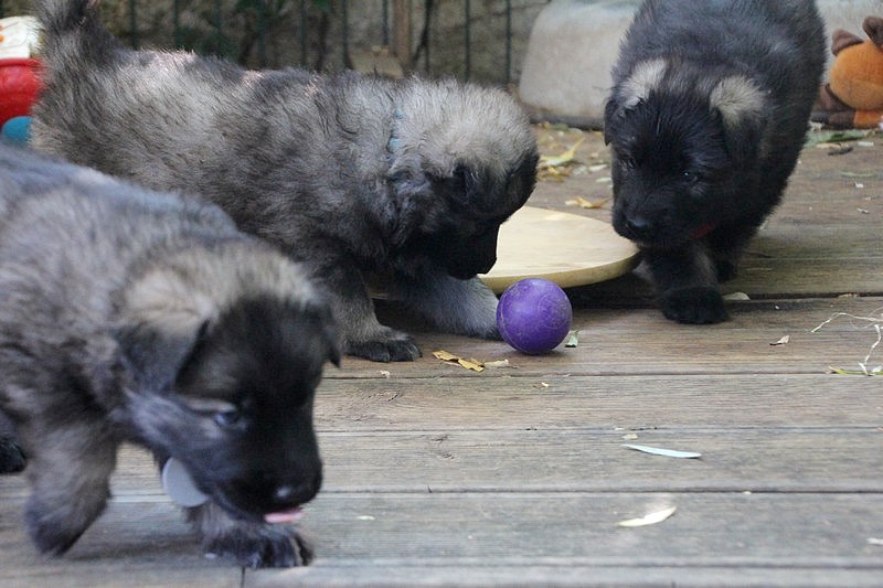 C’est à peu prés notre hauteur, nous gambadons de plus en plus vite et maintenant le parc à chiot n’a plus de secret pour nous. Nous sortons également du parc et apprenons à nous repérer dans les grands espaces et c’est toujours accompagné de maman et du restant de la meute que nous grandissons sereinement.