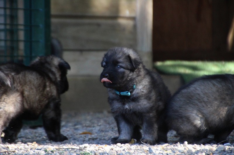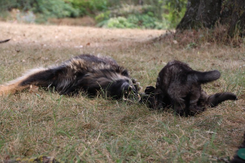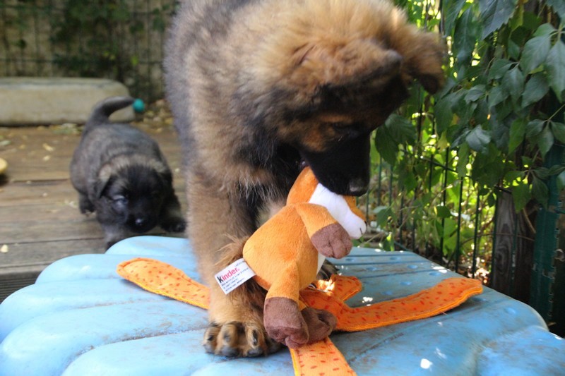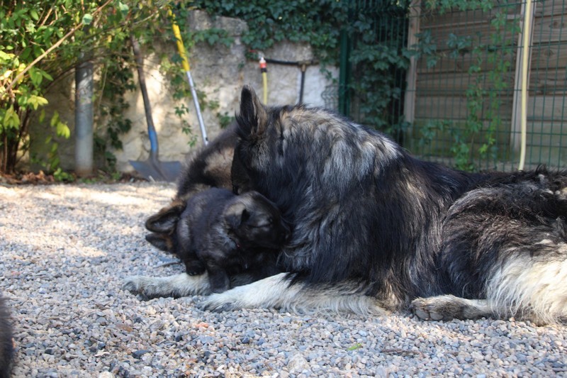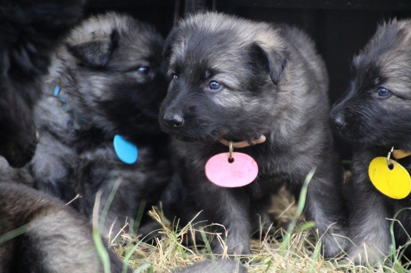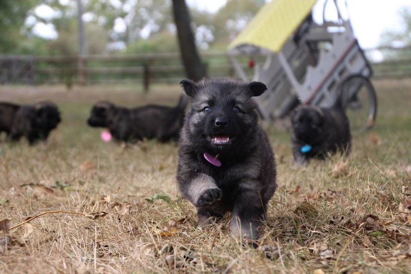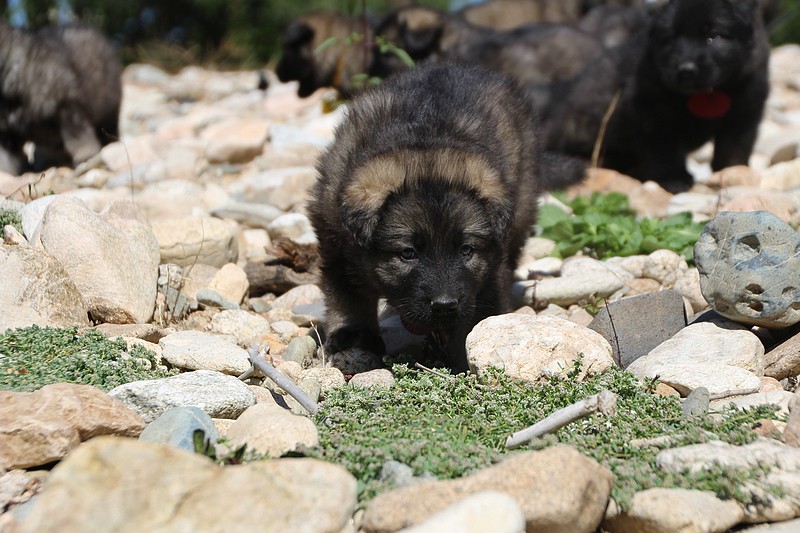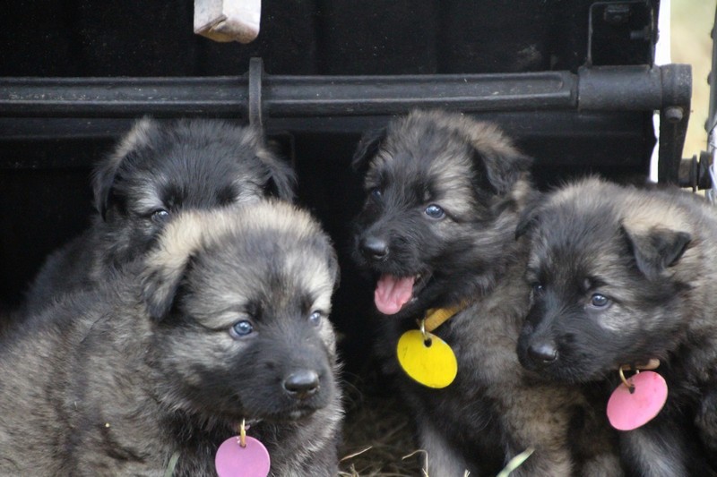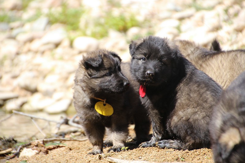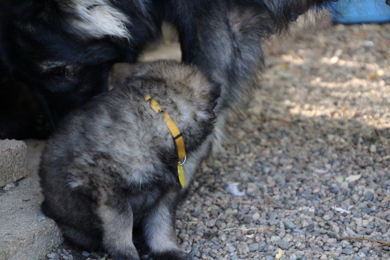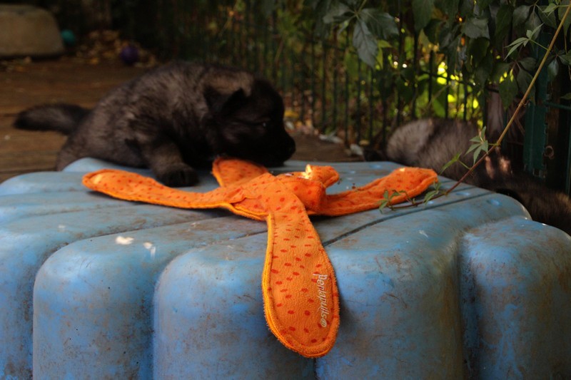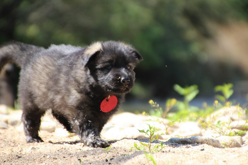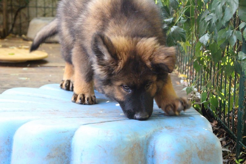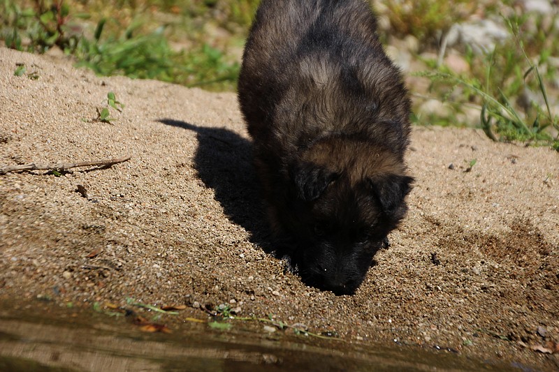 C’est à peu prés notre hauteur, nous gambadons de plus en plus vite et maintenant le parc à chiot n’a plus de secret pour nous. Nous sortons également du parc et apprenons à nous repérer dans les grands espaces et c’est toujours accompagné de maman et du restant de la meute que nous grandissons sereinement.