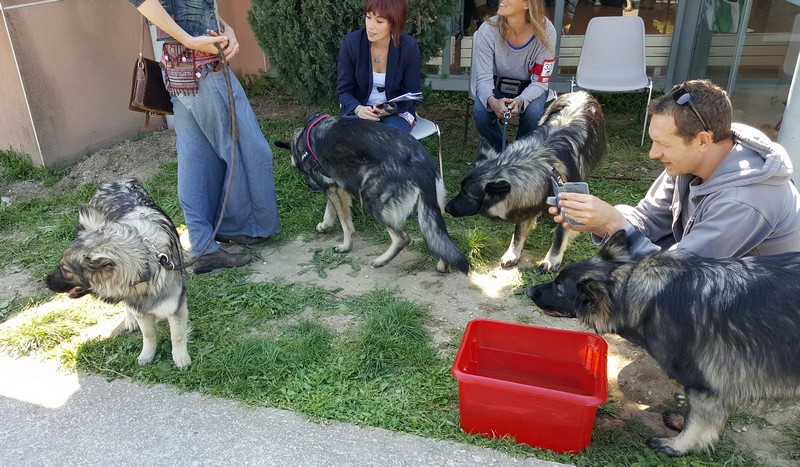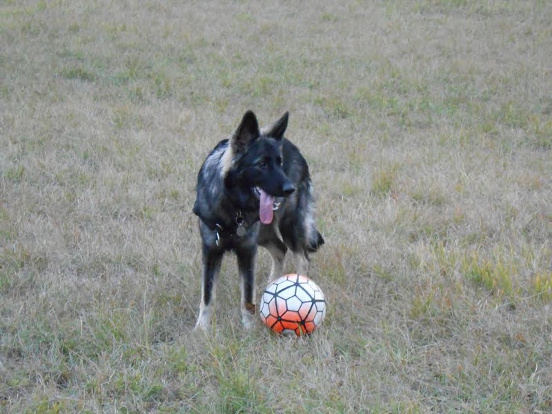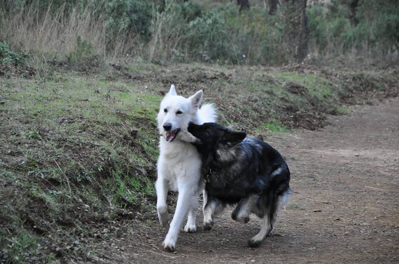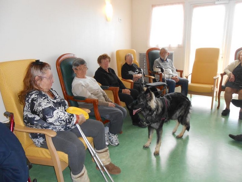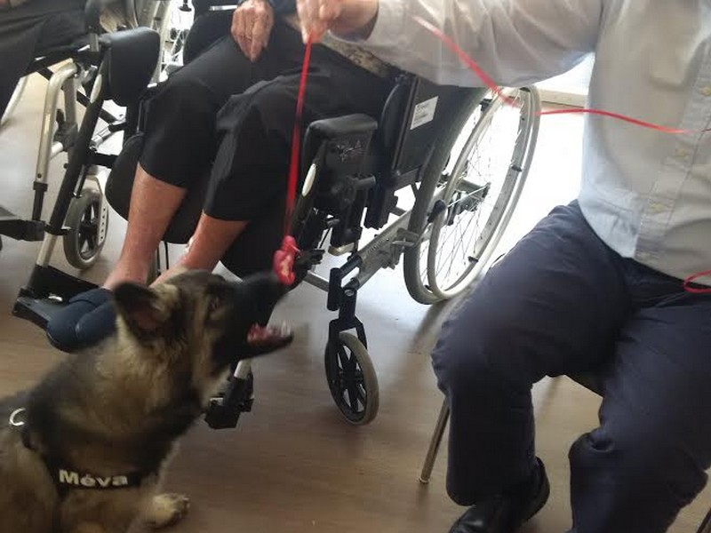 Collier orange: Méva, signifie Belle en malgache, et ça lui va très bien, elle est aussi belle à l’extérieur qu’à l’intérieur. C’est une chienne très gentille, et câline, toujours à l’écoute. Méva sait être calme quand il le faut et pleine d’énergie quand il s’agit d’embêter ses 2 frères poilus pour jouer. Elle aime tout le monde même si elle n’est pas toujours très délicate pour dire bonjour à ses congénères. En balade, elle ne s’éloigne jamais bien loin et revient au premier rappel, souvent avec un bâton dans la gueule. Depuis petite, elle a la manie de transporter tous les objets qui lui plaisent dans toute la maison. Nous avons renforcé cette habitude pour son travail mais à la maison, il a fallu lui faire comprendre qu’il n’y avait que les jouets pour chien qui étaient déplaçables. Au travail, car oui Méva a aussi une activité professionnelle, c’est un chien médiateur et d’assistance auprès de personnes âgées, handicapées, d’enfants autistes… lors de mes séances d’Activités Physiques Adaptées. Elle observe tout et comprend très vite tout ce qu’on lui demande. Elle a une très grande capacité d’adaptation, joueuse avec certains, calme avec d’autres. C’est un véritable plaisir de travailler avec elle, les résidents disent souvent que « la gym sans Méva ça ne serait vraiment pas pareil.. ». Elle apporte vraiment beaucoup à ces personnes, que se soit lorsqu’elle ramasse une canne tombée au sol ou lorsqu’elle dépose gentiment sa balle sur les genoux et fait une léchouille d’encouragement. De plus, elle n’a peur de rien, merci Corinne et Jean Pierre pour ce travail de sociabilisation!! Pour se défouler de sa semaine, Méva fait également ses débuts en agility et frisbee en club canin et participe à des cours d’éducation positive au clicker training. Nous sommes vraiment très heureux d’avoir accueillis Méva dans notre famille.