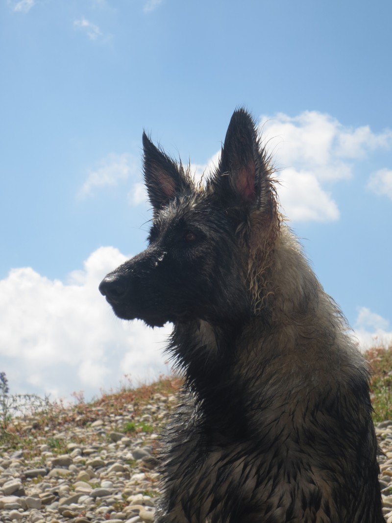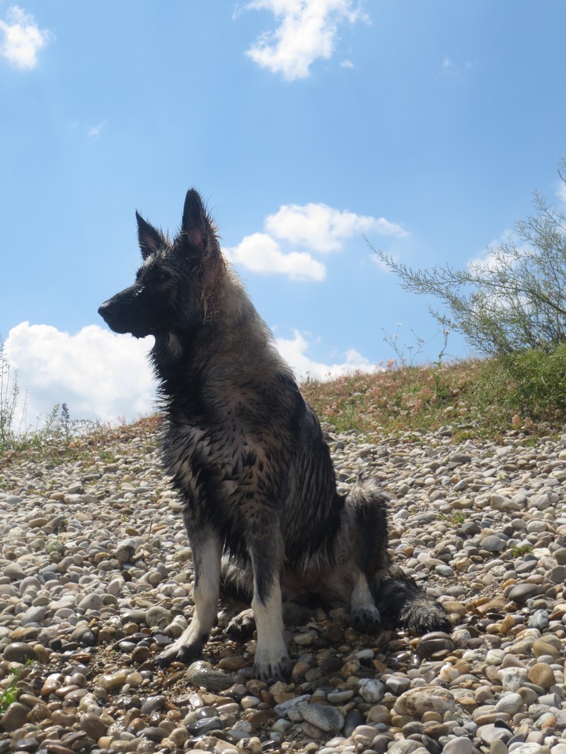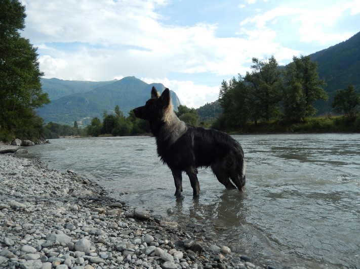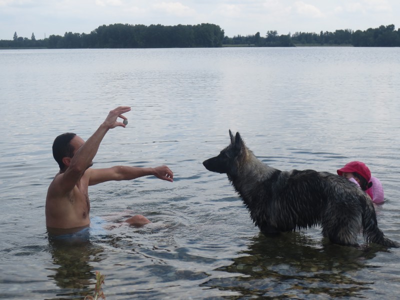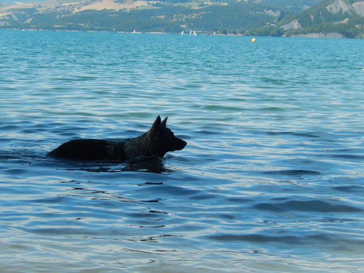 il a surtout « appris » à nager, il adore vraiement cette sensation, en rivière mais surtout au lac où il va au large, va et viens un vrai poisson, il met la tête dans l’eau pour chercher je ne sais pas trop quoi.. c’est très drôle.