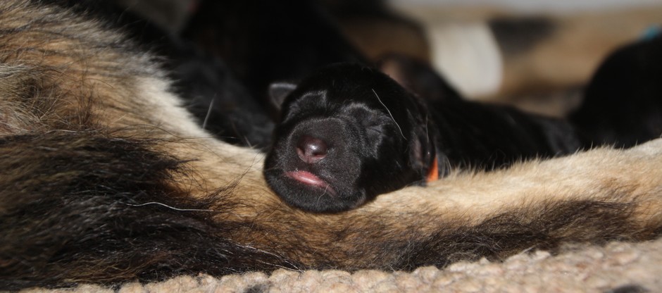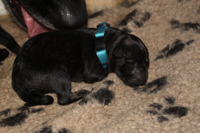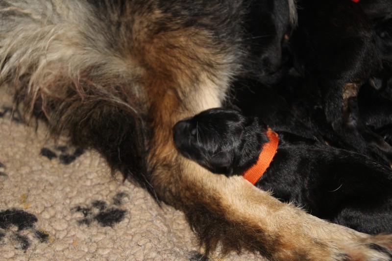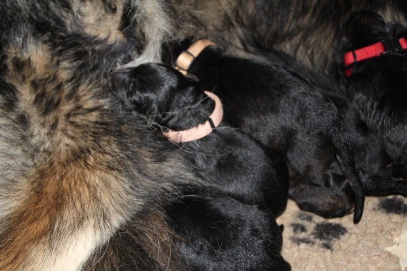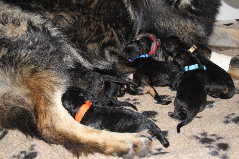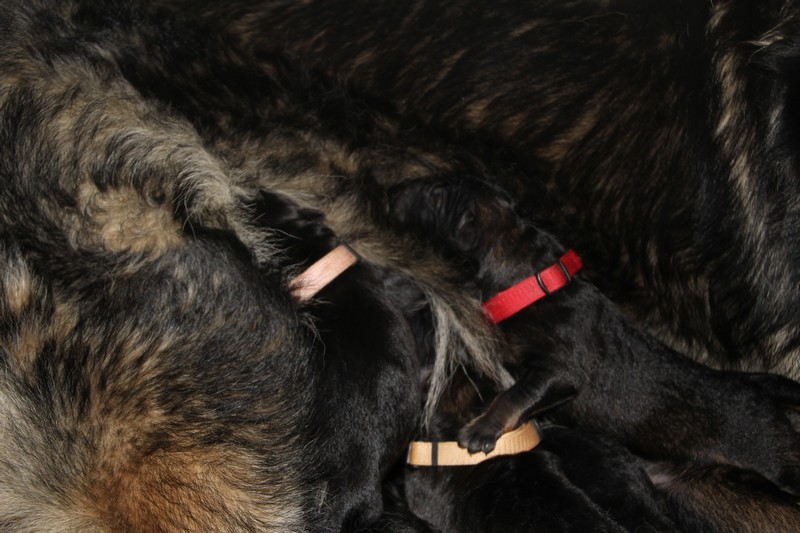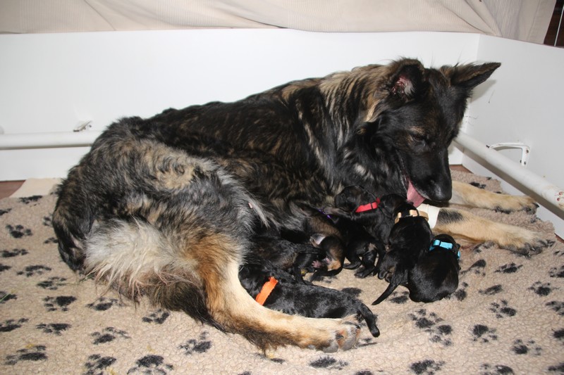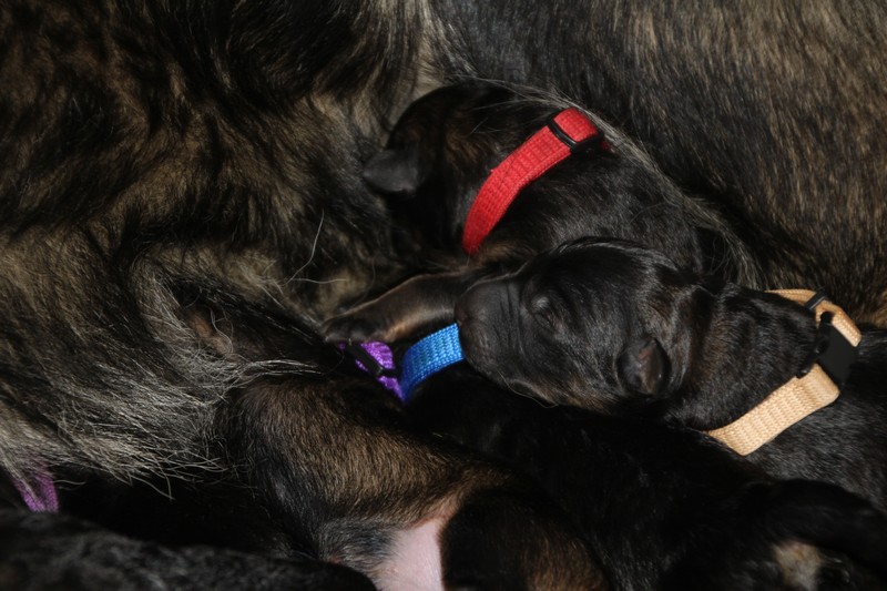 Ils sont venus au monde le 13 aout, non pas sans mal… les chiots étant gros, la maman a eu beaucoup de mal a faire les 4 premiers et pour ne faire prendre aucun risque aux 6 autres, nous avons décidé de l’emmener chez le vétérinaire, qui a pratiqué une césarienne pour la sécurité de tous.