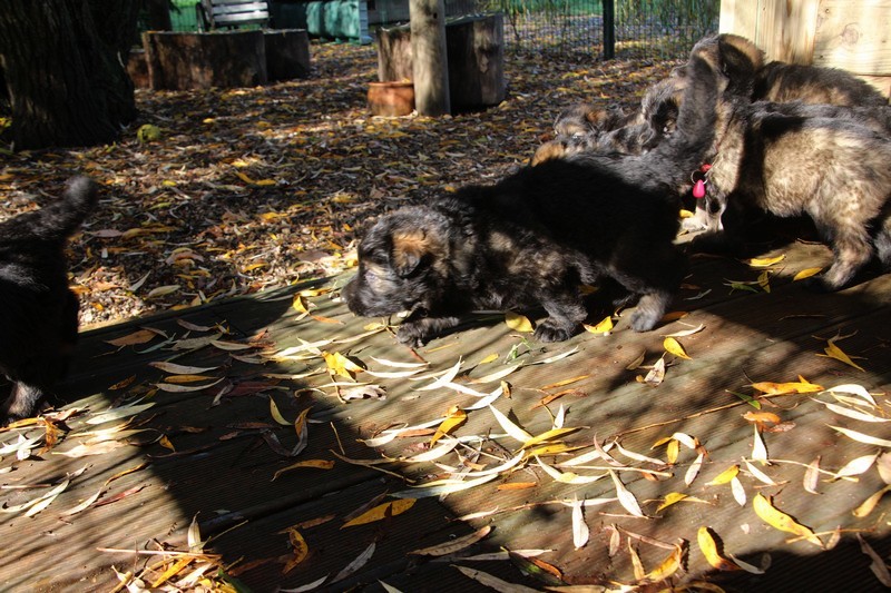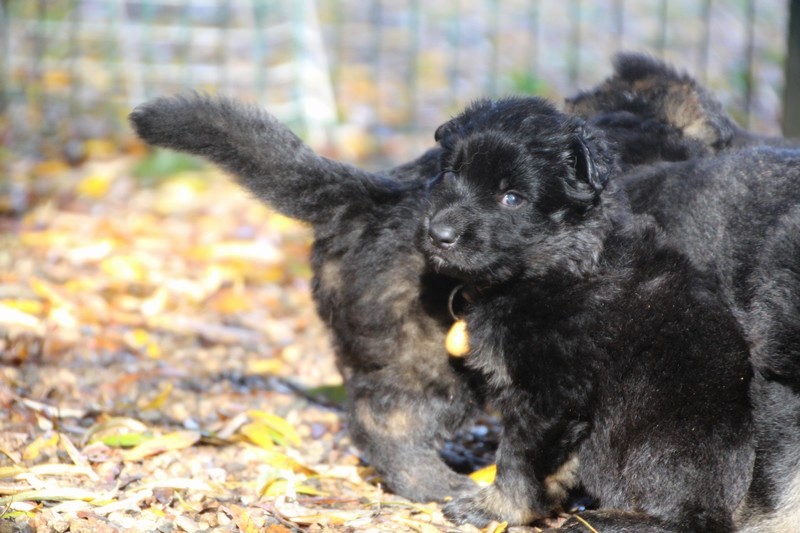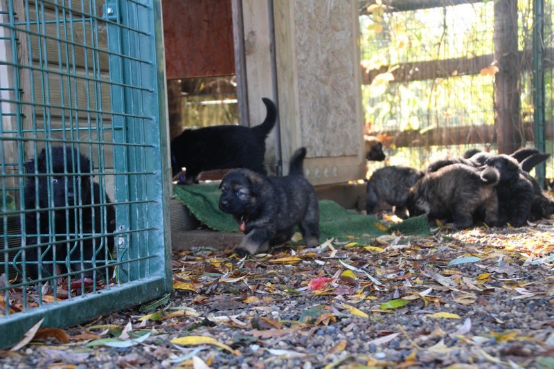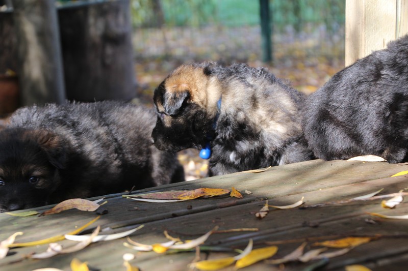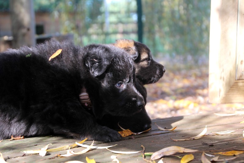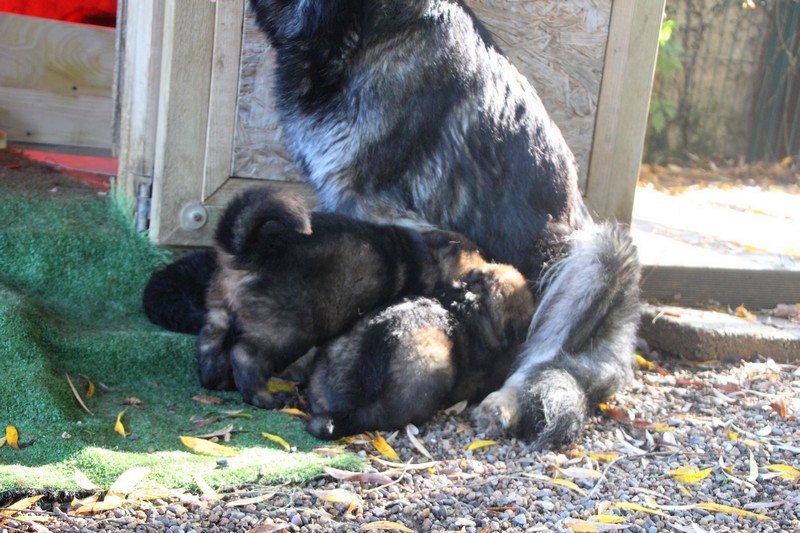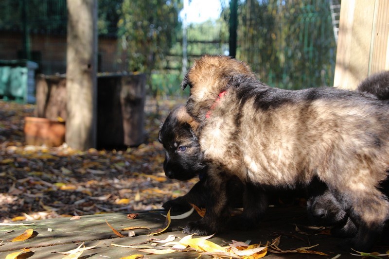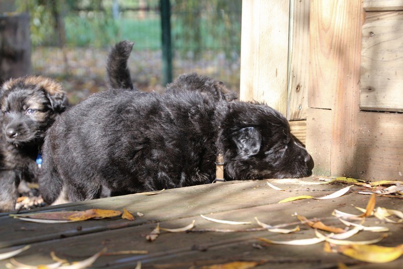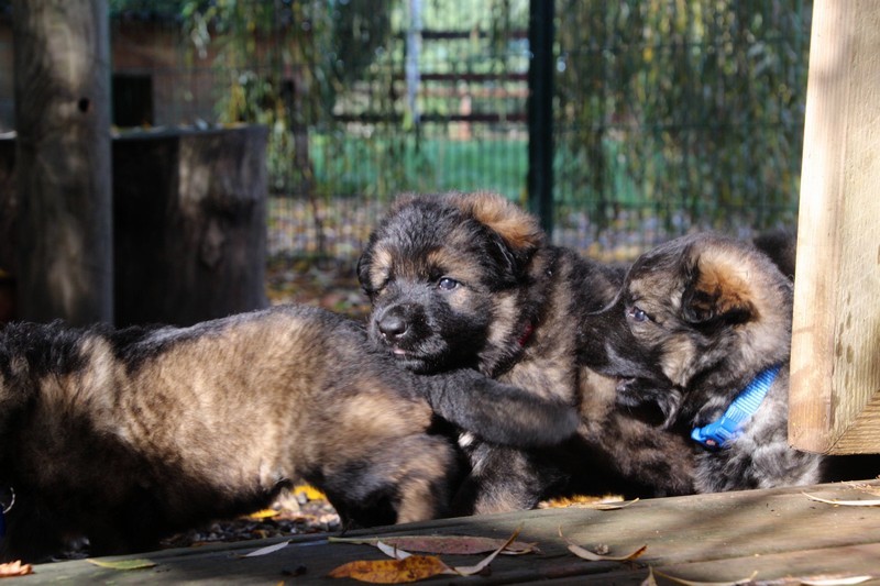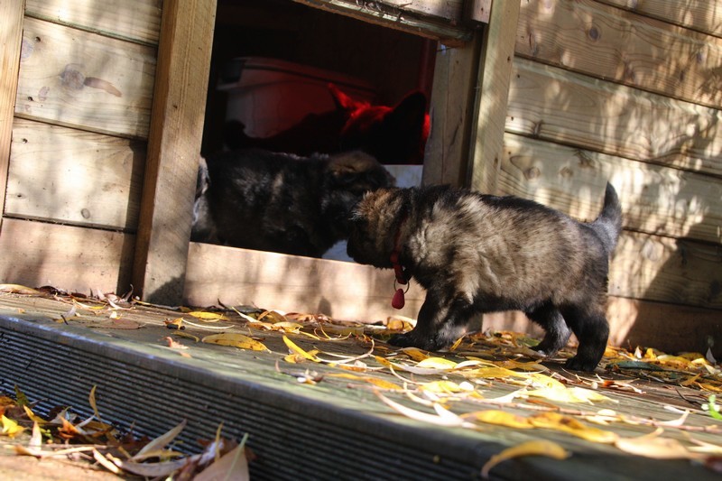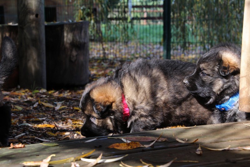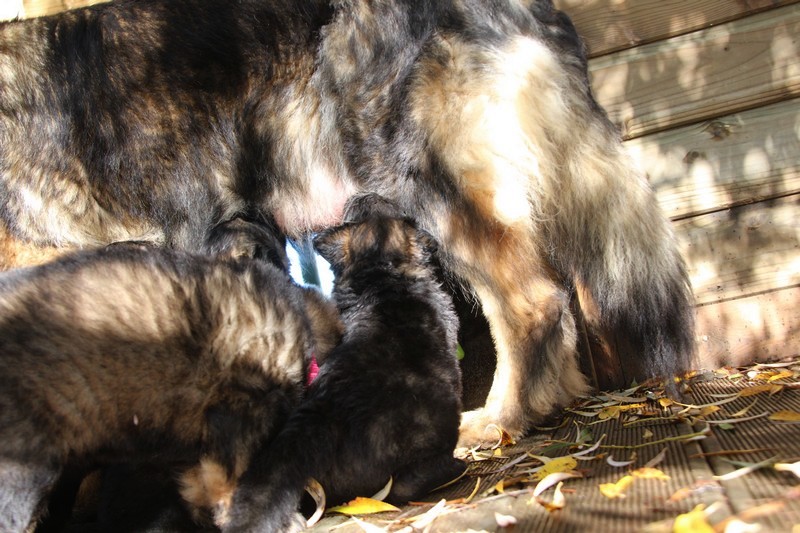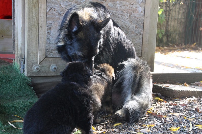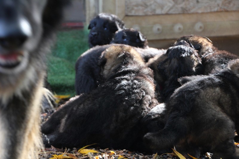 Notre première sortie s’est faite jeudi, dans le parc à chiots, sous un soleil automnale. Il semblerait que c’est là où nous allons apprendre à devenir autonomes et couper le cordon ombilical dans les futures semaines, cela ne nous inquiète pas trop, dès lors ou nous avons plus d’un cordon dans notre pelote… Hé oui ! tata Ice veut bien partager son lait avec nous et maman, elle donne aussi à manger à nos cousins. Si on rajoute à cela le restant de la meute qui nous materne, il va y avoir de quoi s’emmêler les cordons…