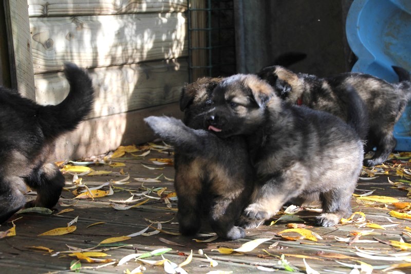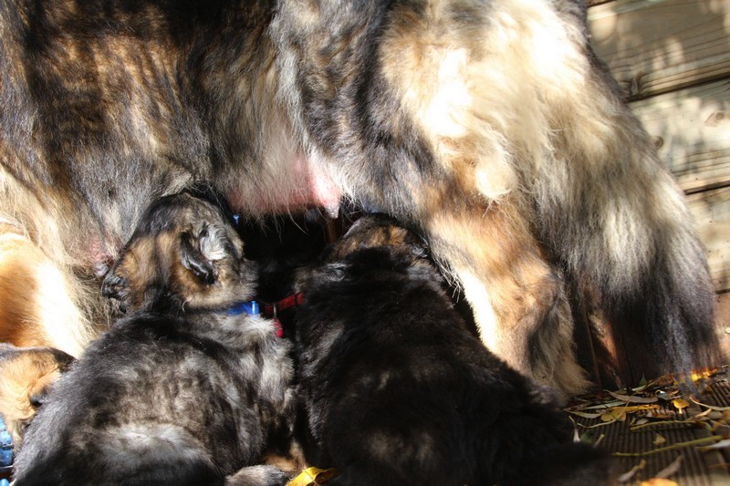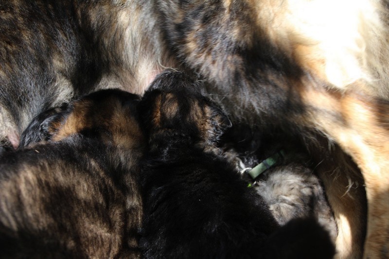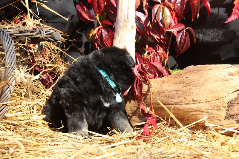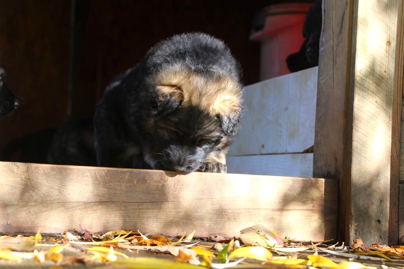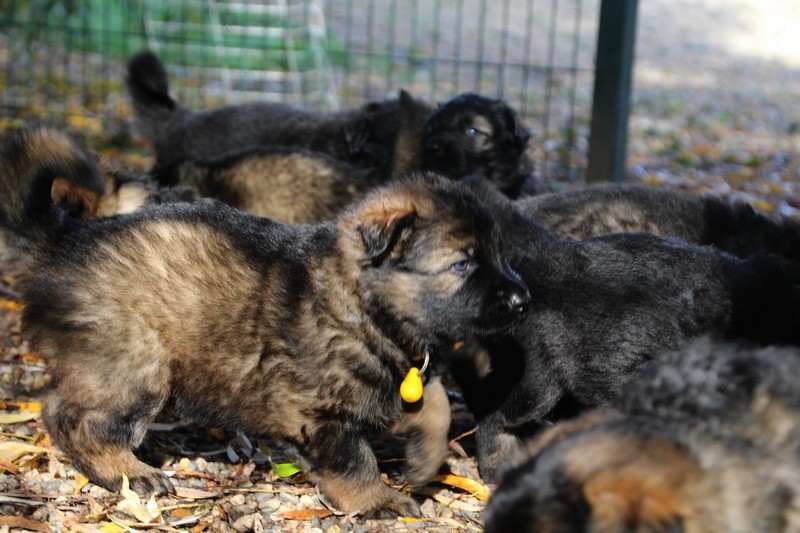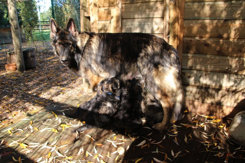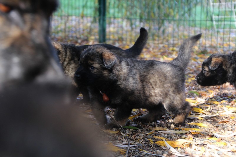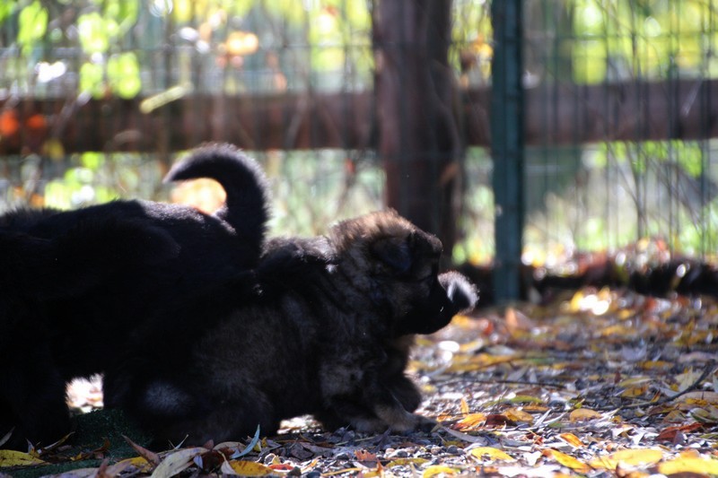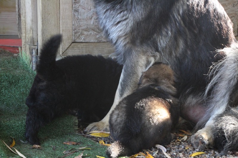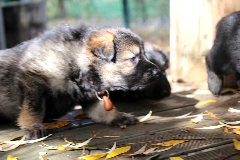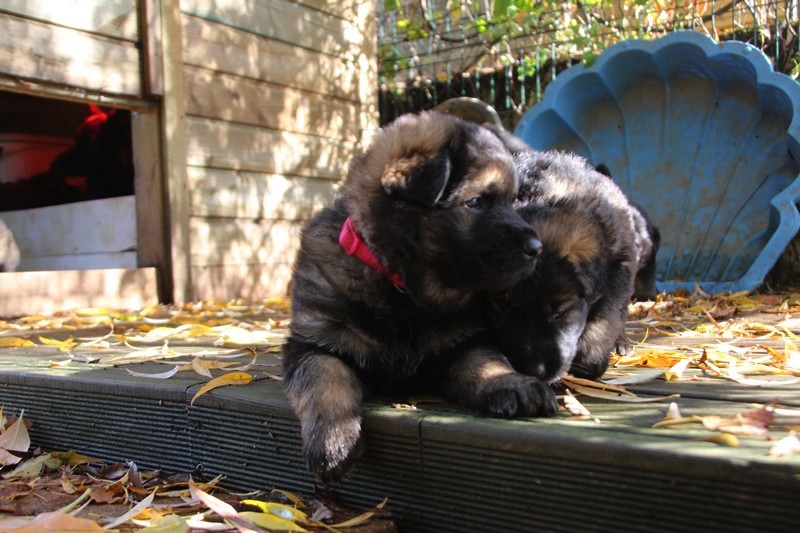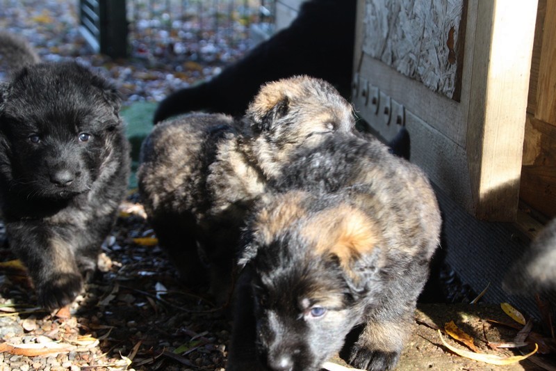 Notre première sortie s’est faite jeudi, dans le parc à chiots, sous un soleil automnale. Il semblerait que c’est là où nous allons apprendre à devenir autonomes et couper le cordon ombilical dans les futures semaines, cela ne nous inquiète pas trop, dès lors ou nous avons plus d’un cordon dans notre pelote… Hé oui ! tata Ice veut bien partager son lait avec nous et maman, elle donne aussi à manger à nos cousins. Si on rajoute à cela le restant de la meute qui nous materne, il va y avoir de quoi s’emmêler les cordons…