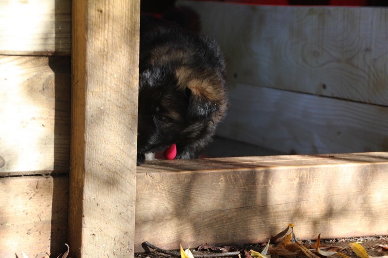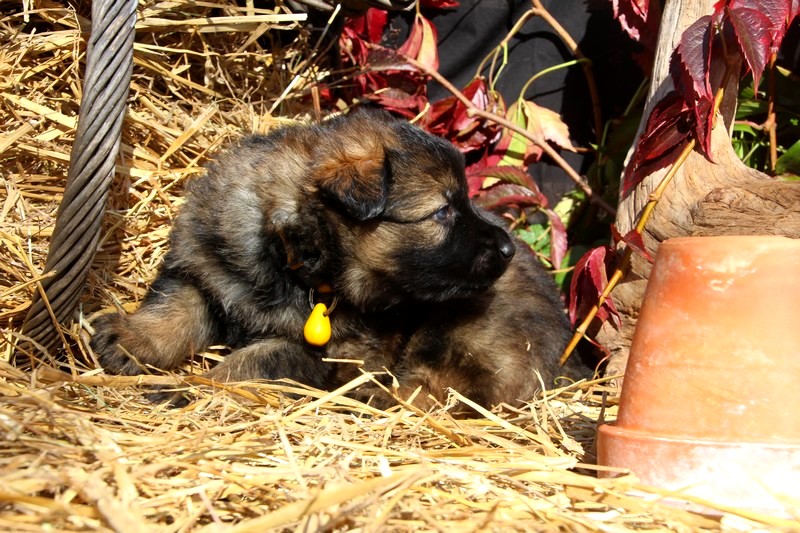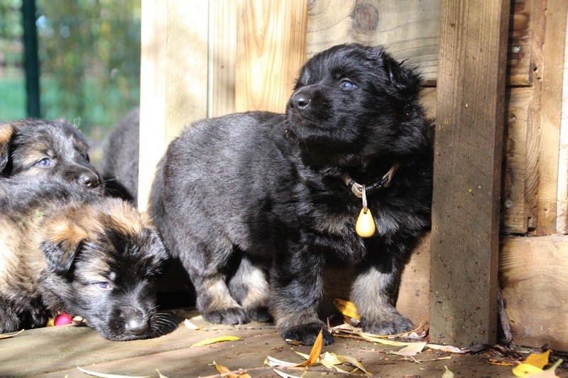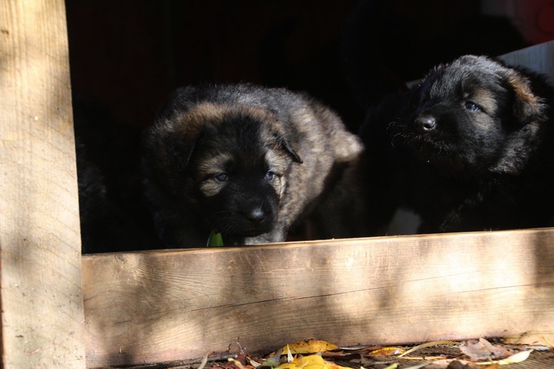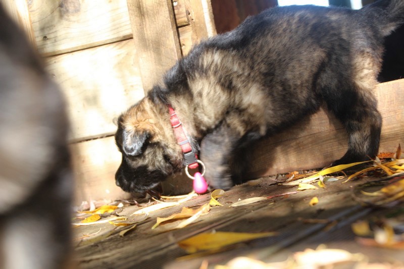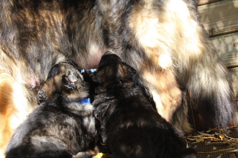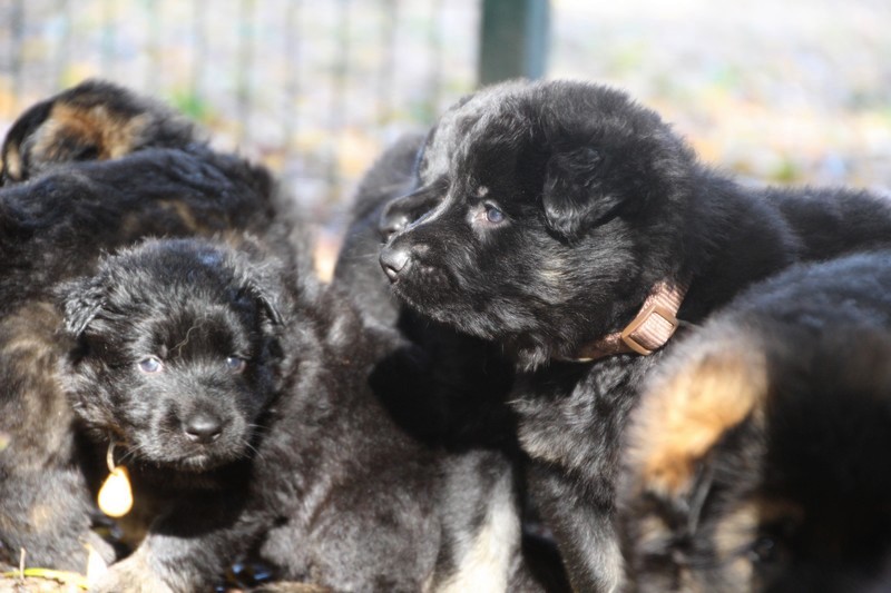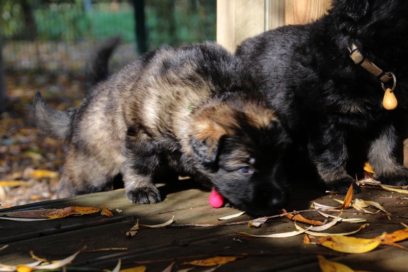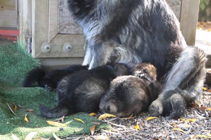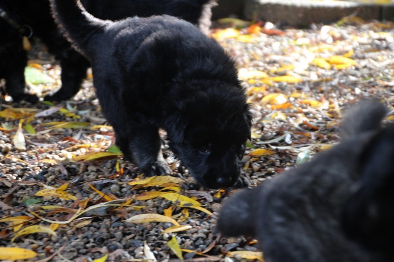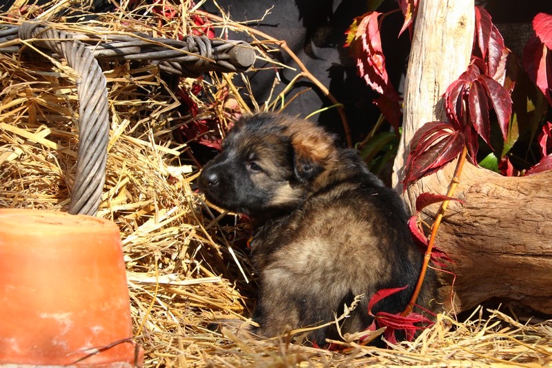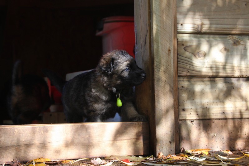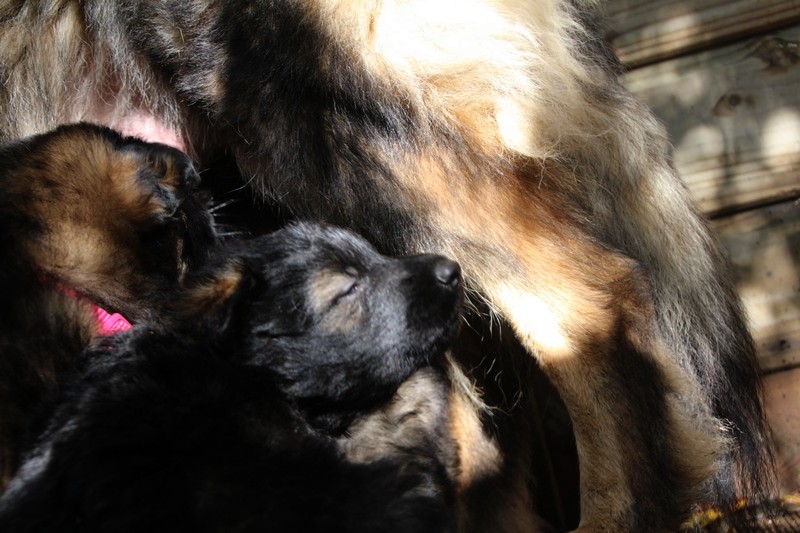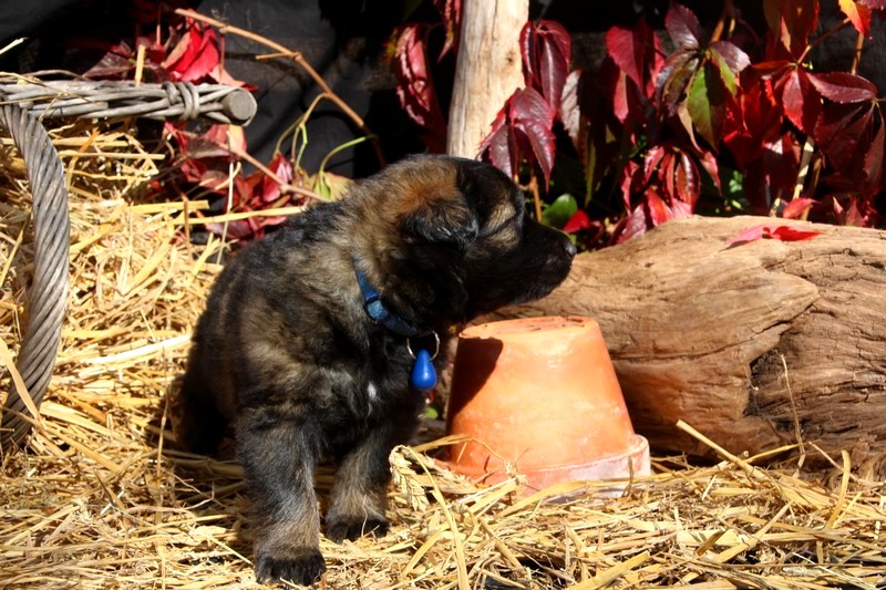Notre première sortie s’est faite jeudi, dans le parc à chiots, sous un soleil automnale. Il semblerait que c’est là où nous allons apprendre à devenir autonomes et couper le cordon ombilical dans les futures semaines, cela ne nous inquiète pas trop, dès lors ou nous avons plus d’un cordon dans notre pelote… Hé oui ! tata Ice veut bien partager son lait avec nous et maman, elle donne aussi à manger à nos cousins. Si on rajoute à cela le restant de la meute qui nous materne, il va y avoir de quoi s’emmêler les cordons…