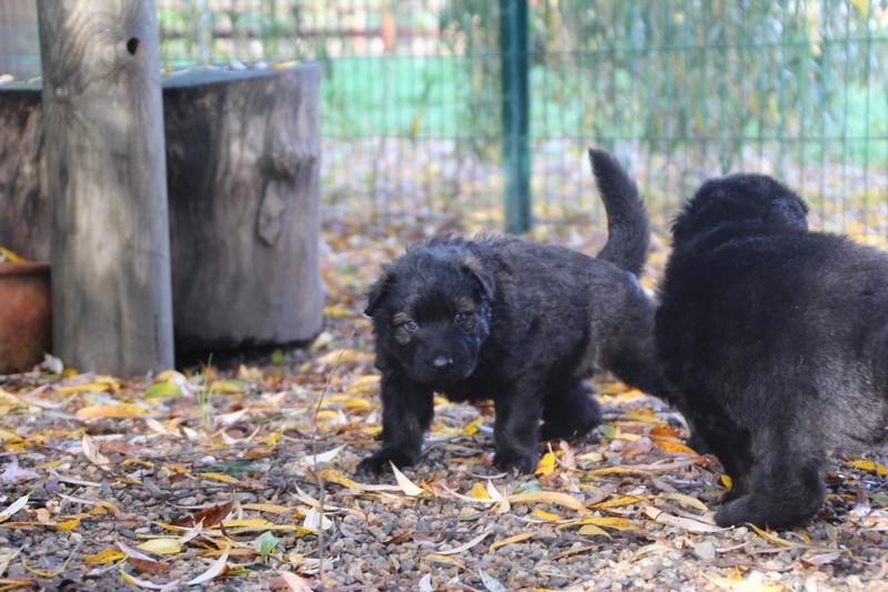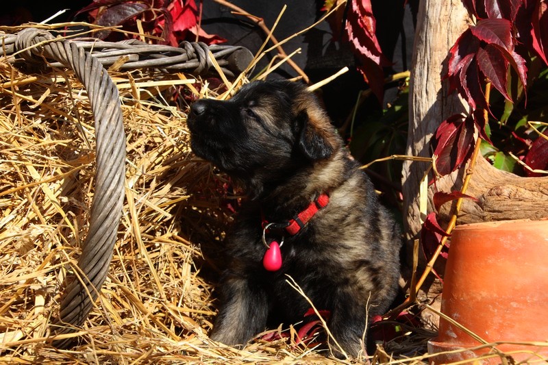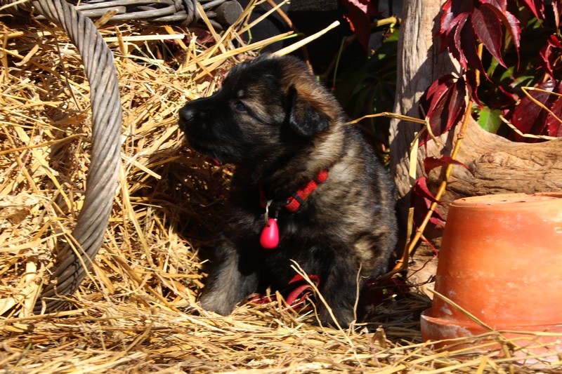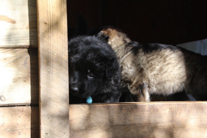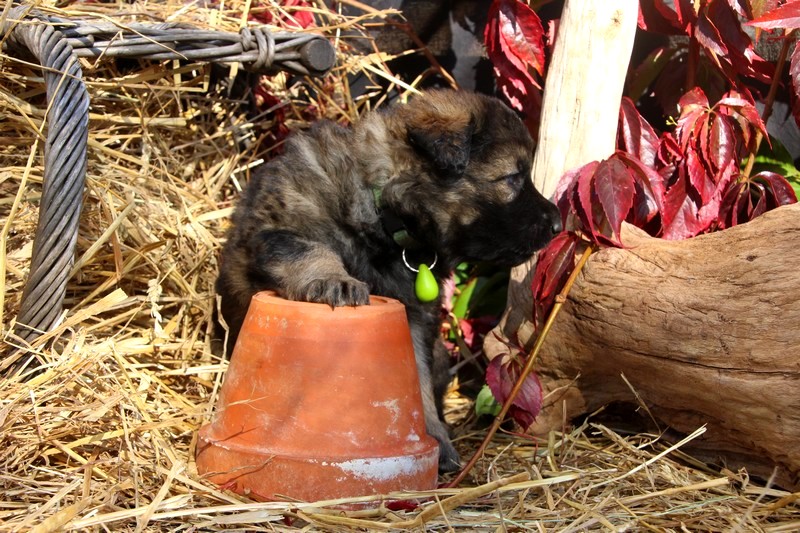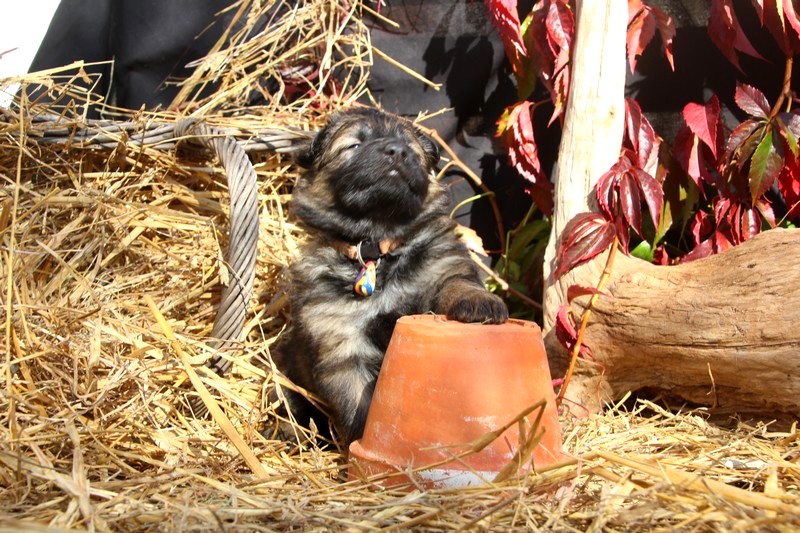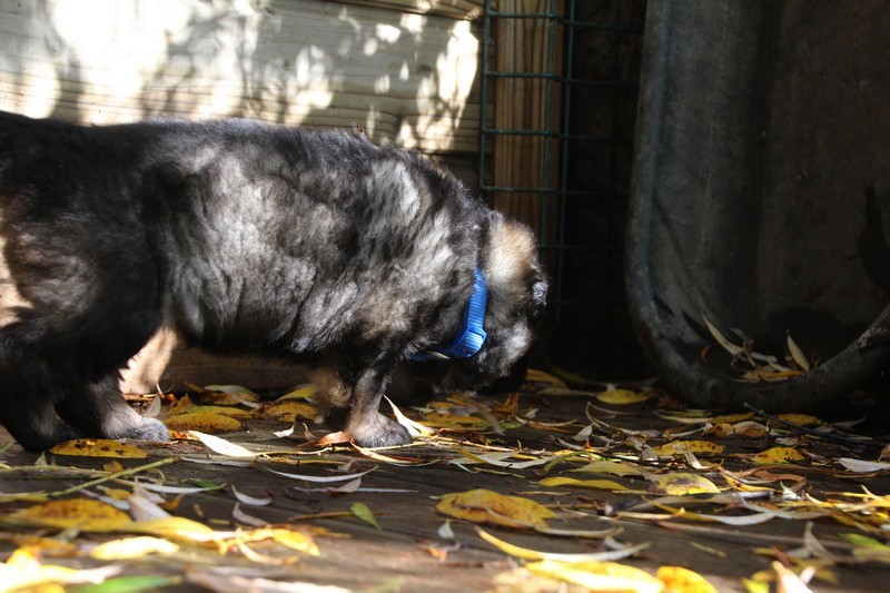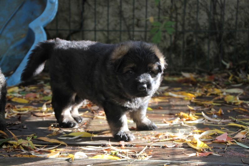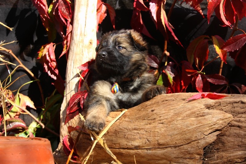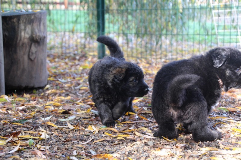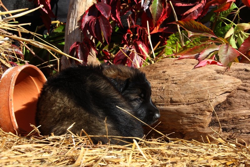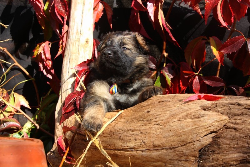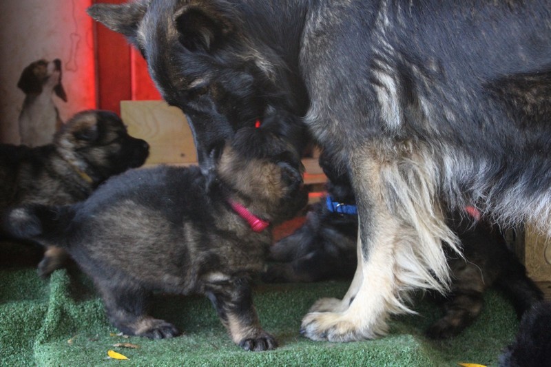 Notre première sortie s’est faite jeudi, dans le parc à chiots, sous un soleil automnale. Il semblerait que c’est là où nous allons apprendre à devenir autonomes et couper le cordon ombilical dans les futures semaines, cela ne nous inquiète pas trop, dès lors ou nous avons plus d’un cordon dans notre pelote… Hé oui ! tata Ice veut bien partager son lait avec nous et maman, elle donne aussi à manger à nos cousins. Si on rajoute à cela le restant de la meute qui nous materne, il va y avoir de quoi s’emmêler les cordons…