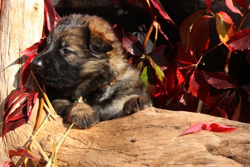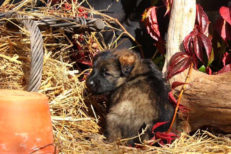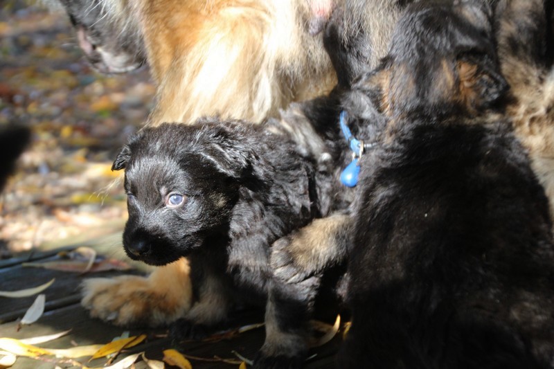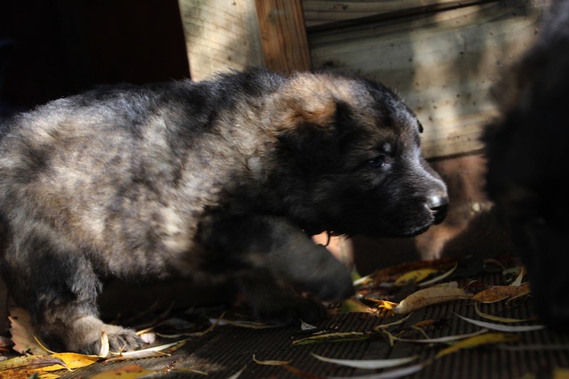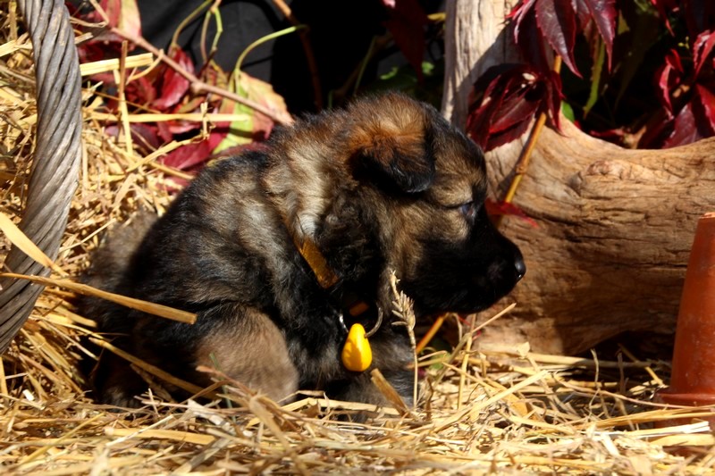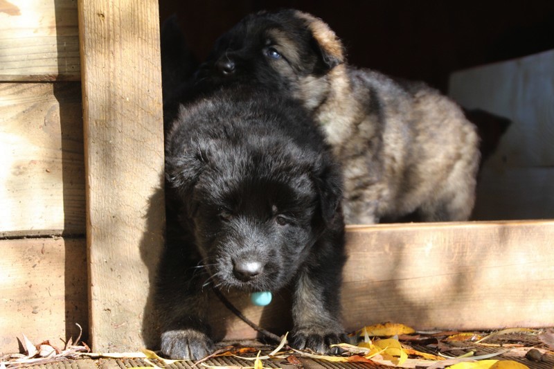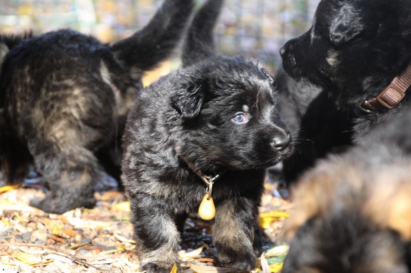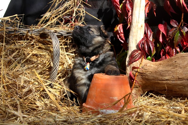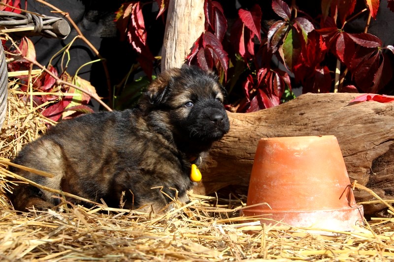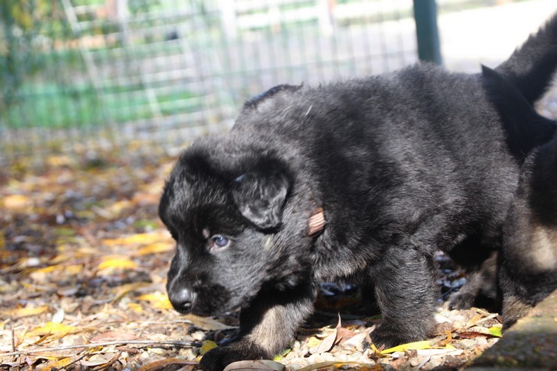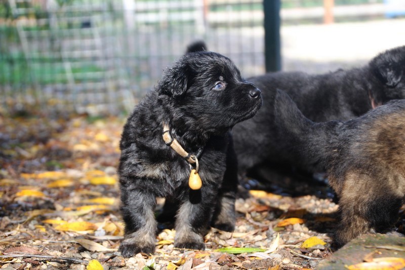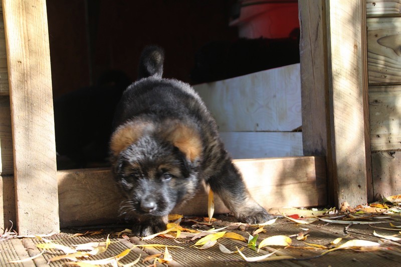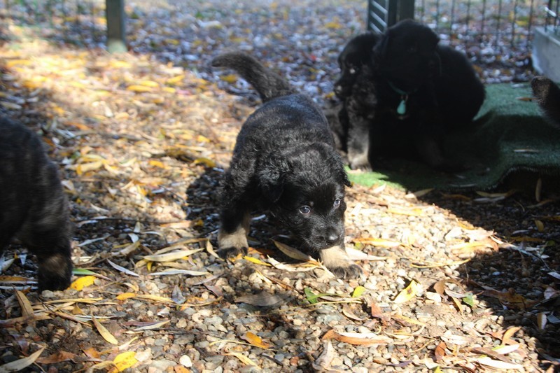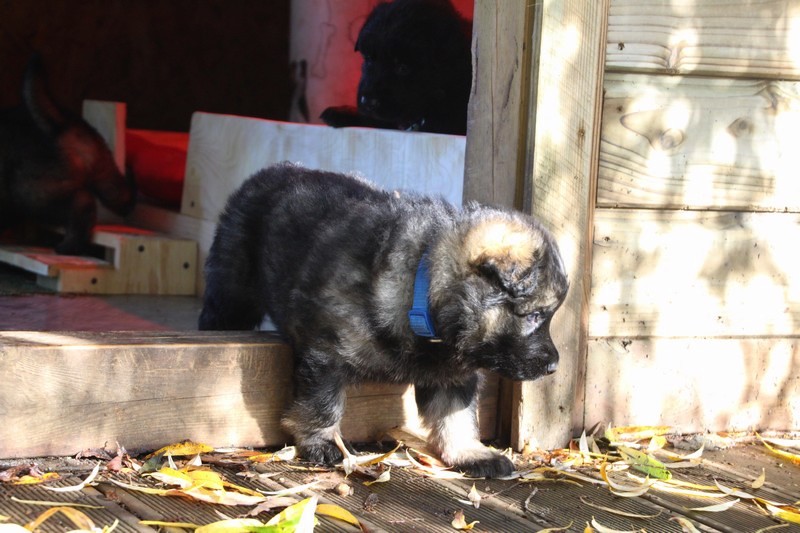 Notre première sortie s’est faite jeudi, dans le parc à chiots, sous un soleil automnale. Il semblerait que c’est là où nous allons apprendre à devenir autonomes et couper le cordon ombilical dans les futures semaines, cela ne nous inquiète pas trop, dès lors ou nous avons plus d’un cordon dans notre pelote… Hé oui ! tata Ice veut bien partager son lait avec nous et maman, elle donne aussi à manger à nos cousins. Si on rajoute à cela le restant de la meute qui nous materne, il va y avoir de quoi s’emmêler les cordons…
