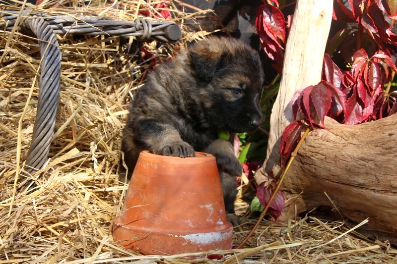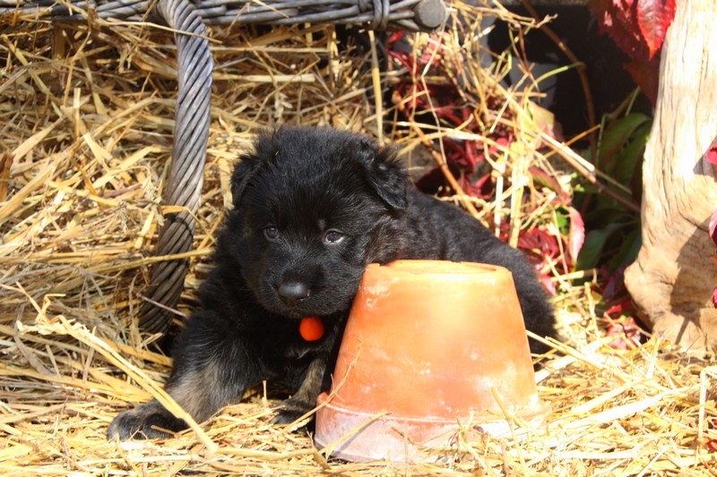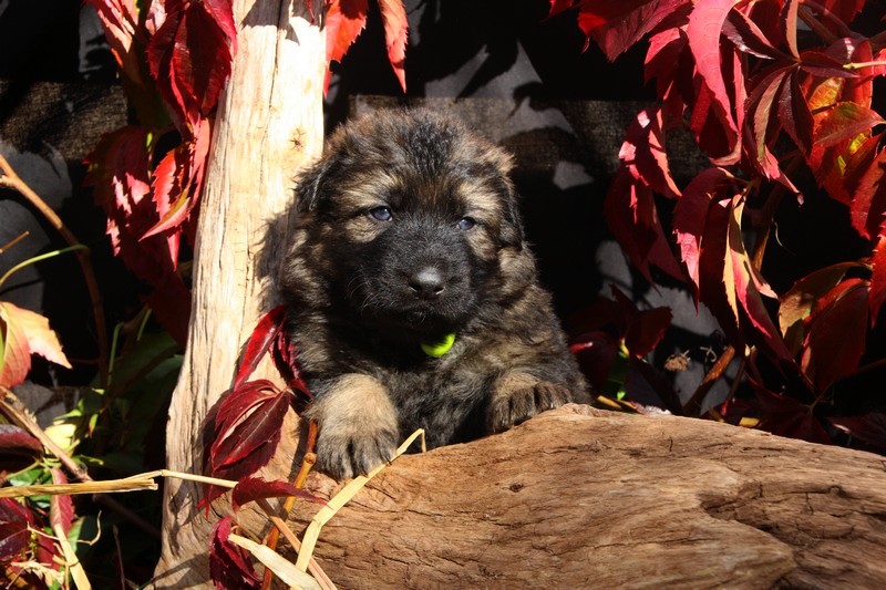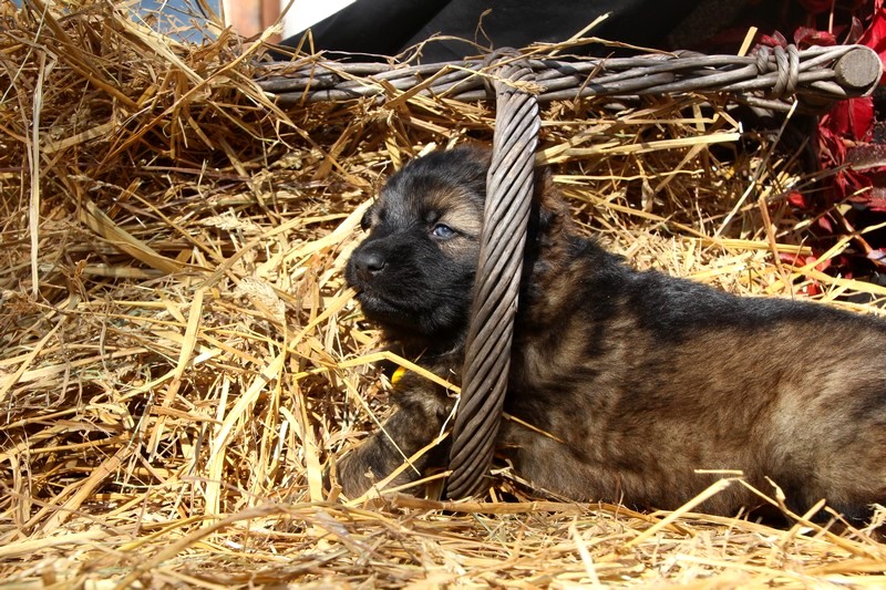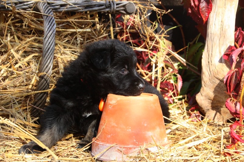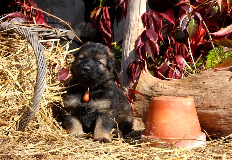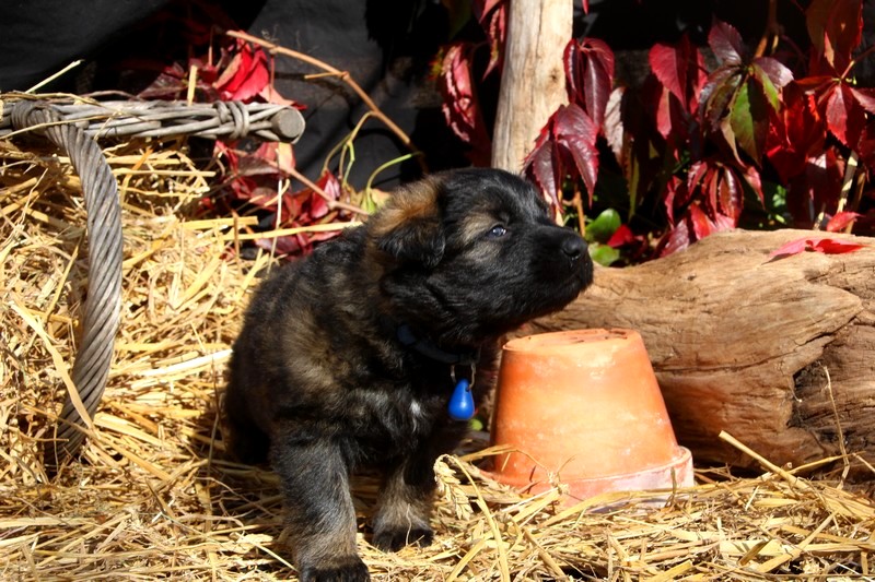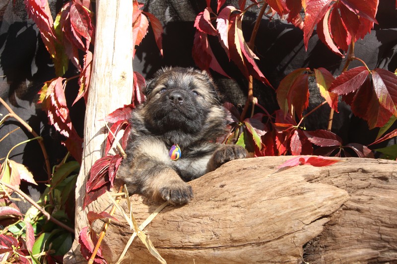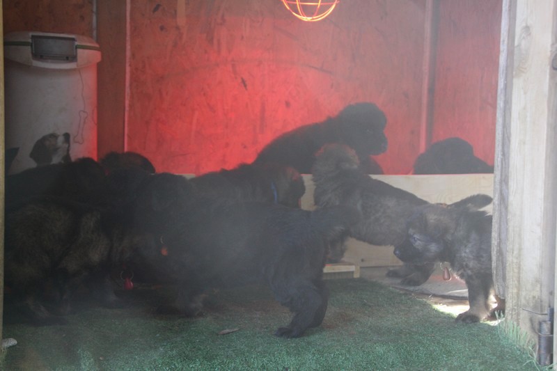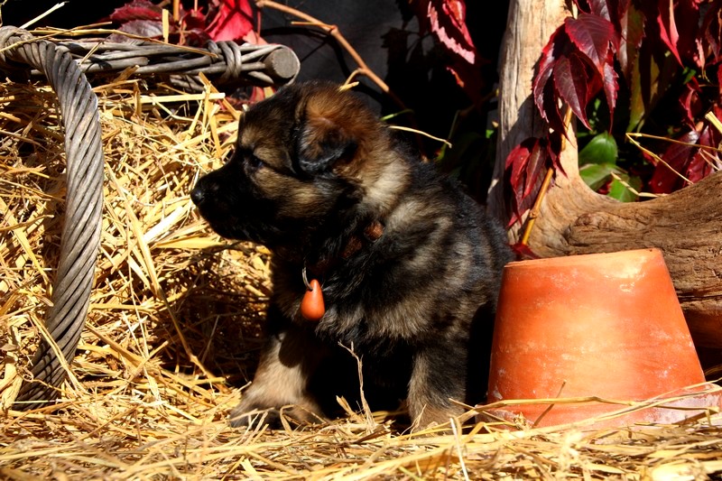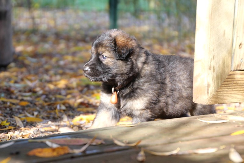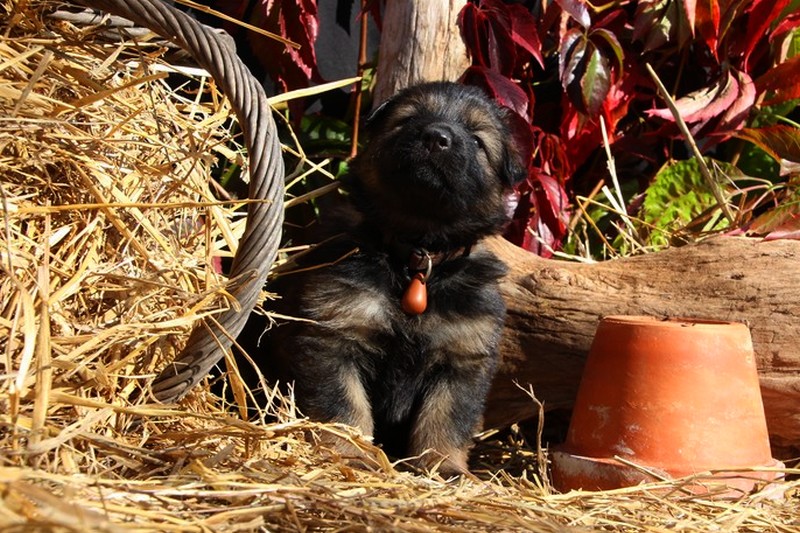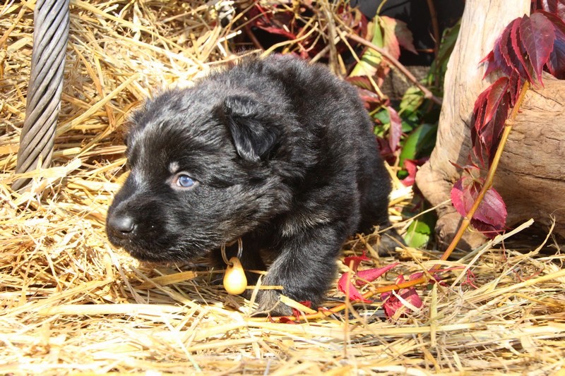 Notre première sortie s’est faite jeudi, dans le parc à chiots, sous un soleil automnale. Il semblerait que c’est là où nous allons apprendre à devenir autonomes et couper le cordon ombilical dans les futures semaines, cela ne nous inquiète pas trop, dès lors ou nous avons plus d’un cordon dans notre pelote… Hé oui ! tata Ice veut bien partager son lait avec nous et maman, elle donne aussi à manger à nos cousins. Si on rajoute à cela le restant de la meute qui nous materne, il va y avoir de quoi s’emmêler les cordons…
