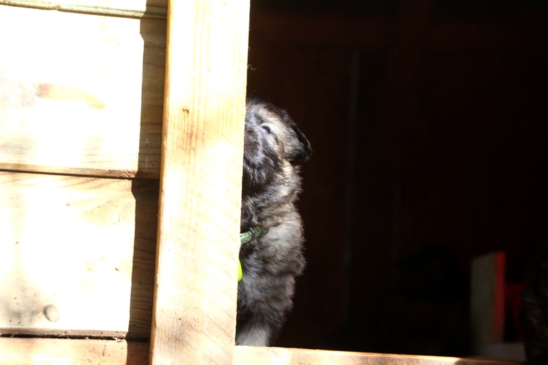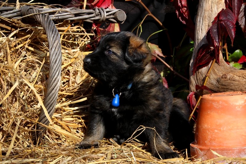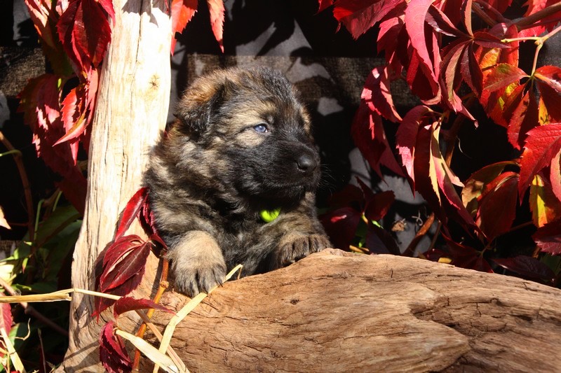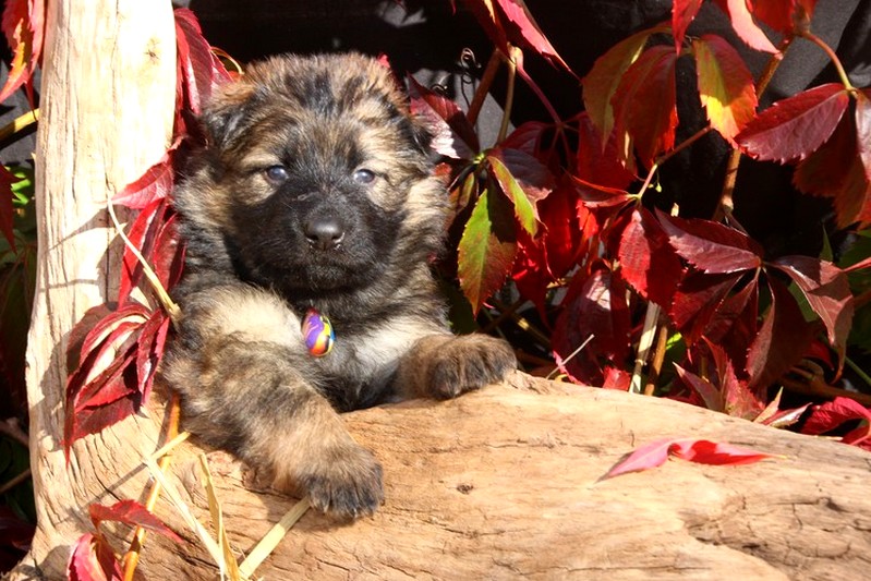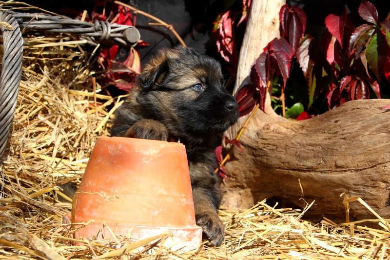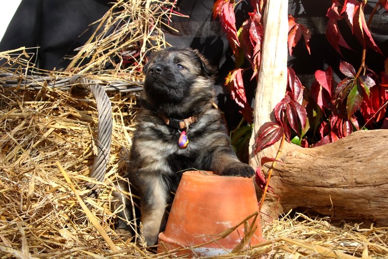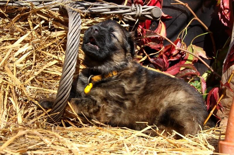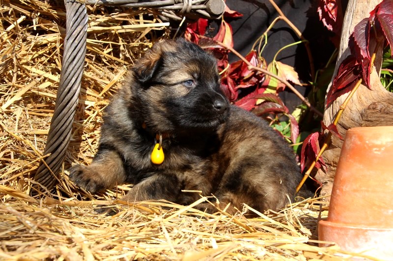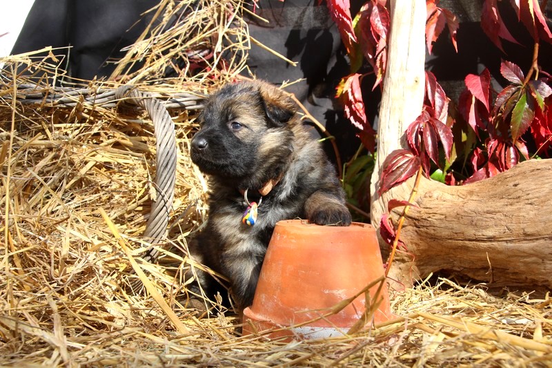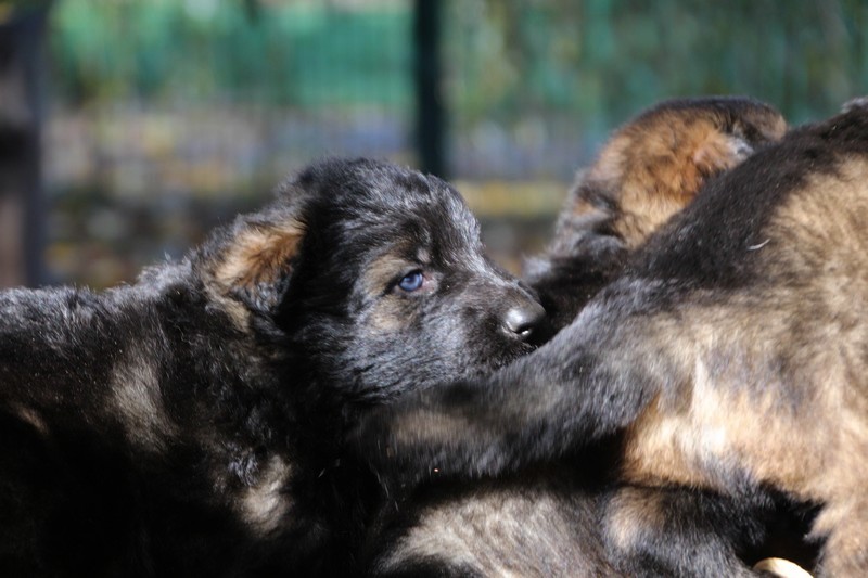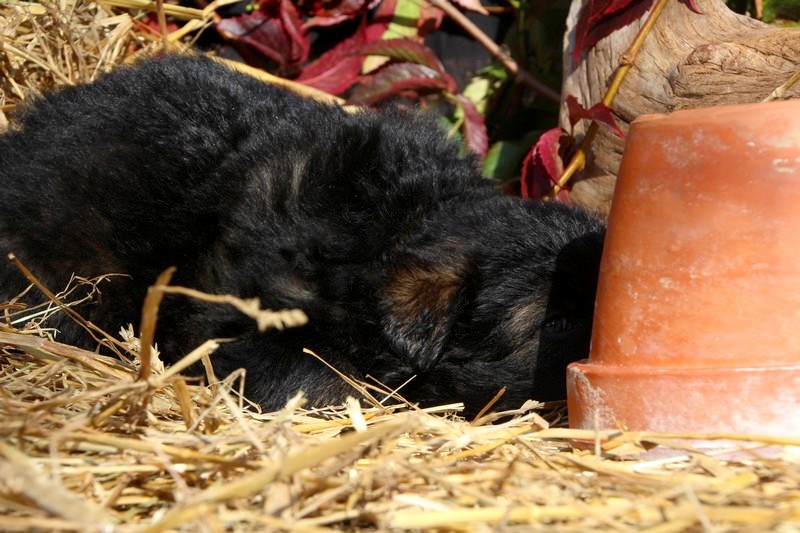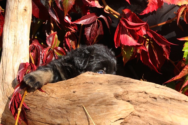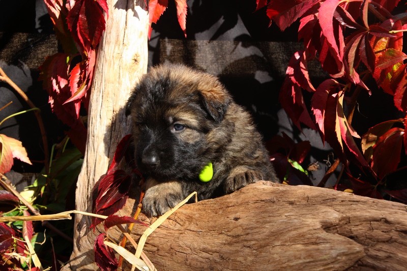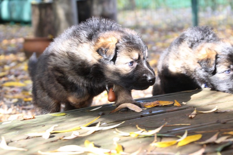 Notre première sortie s’est faite jeudi, dans le parc à chiots, sous un soleil automnale. Il semblerait que c’est là où nous allons apprendre à devenir autonomes et couper le cordon ombilical dans les futures semaines, cela ne nous inquiète pas trop, dès lors ou nous avons plus d’un cordon dans notre pelote… Hé oui ! tata Ice veut bien partager son lait avec nous et maman, elle donne aussi à manger à nos cousins. Si on rajoute à cela le restant de la meute qui nous materne, il va y avoir de quoi s’emmêler les cordons…